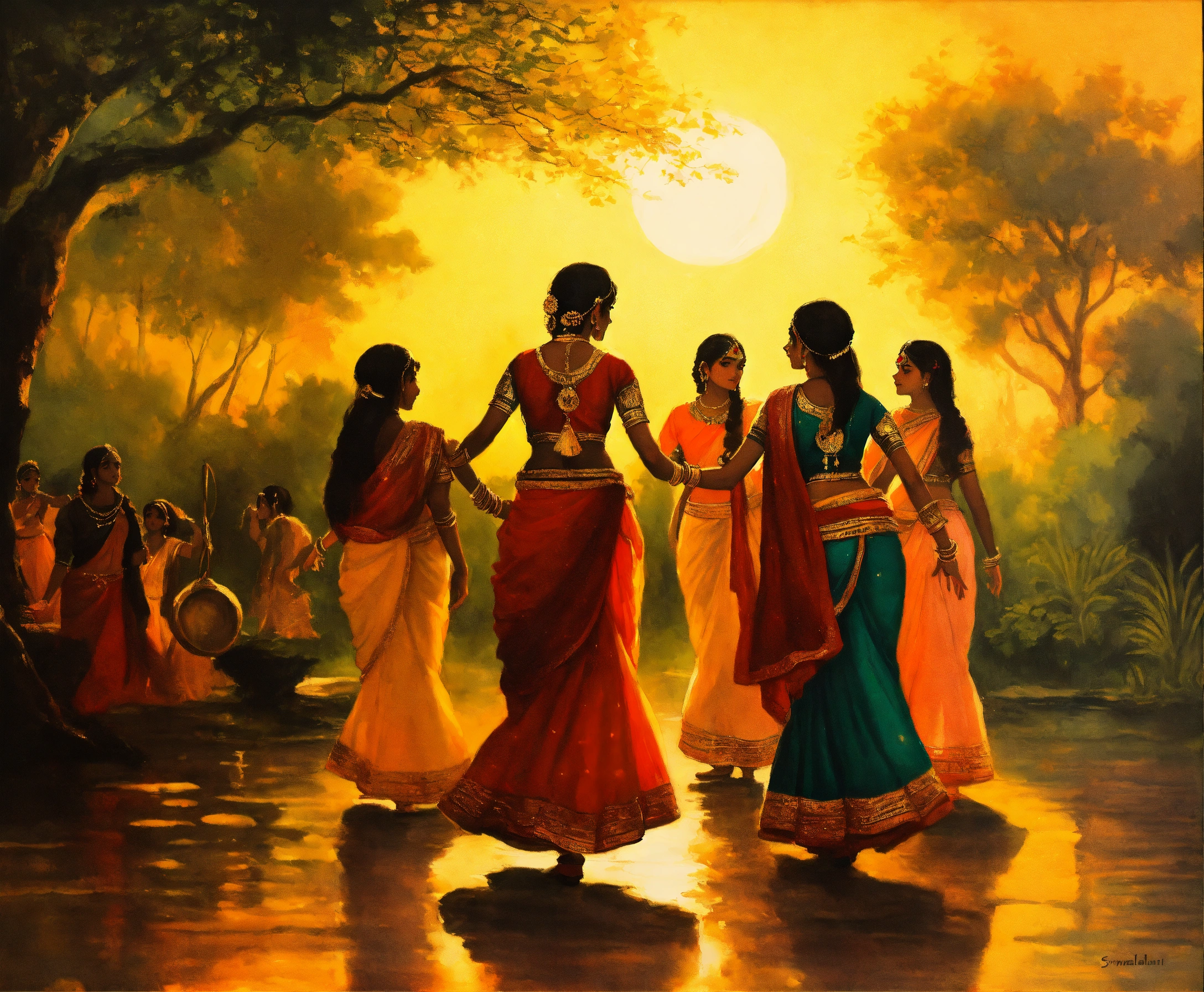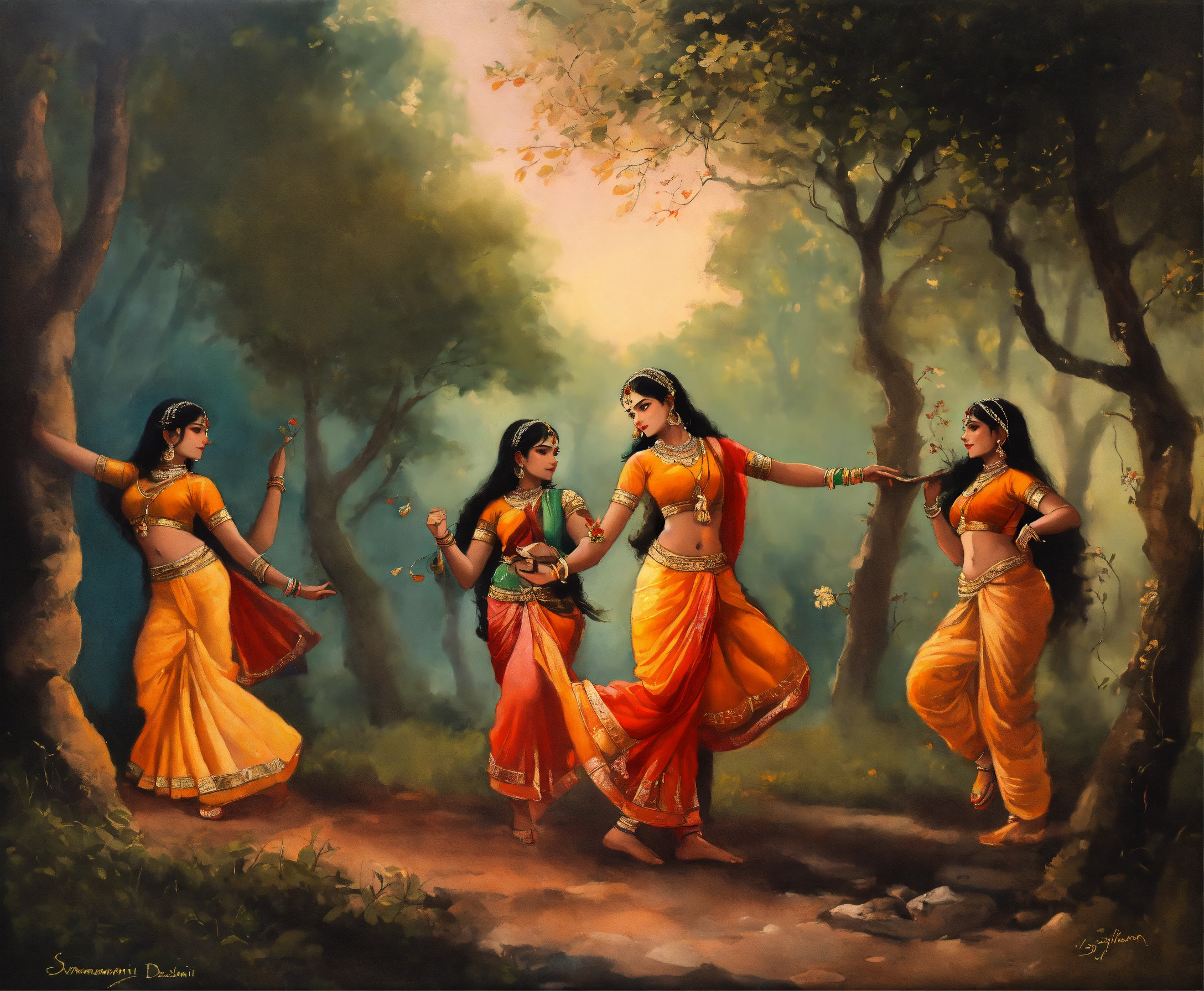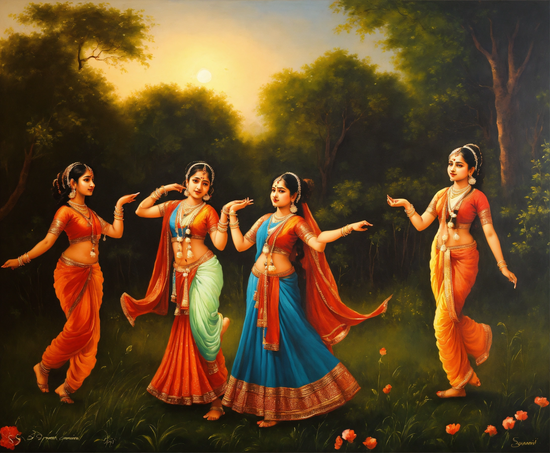Gopi, indian forest, beautiful girls, dusk, young indian girls, krishna and the gopis, rasalila, dancing, beautiful, art, realistic, painting, paintings by syamarani dasi, isckon painting, romanticism, rembrandt