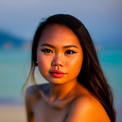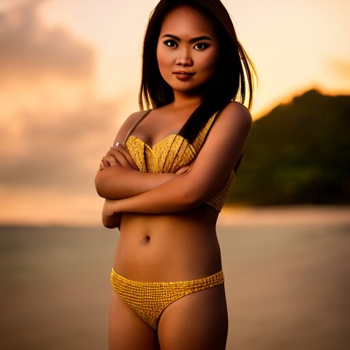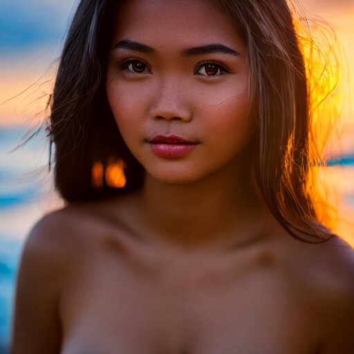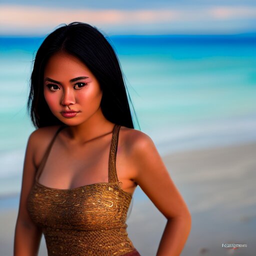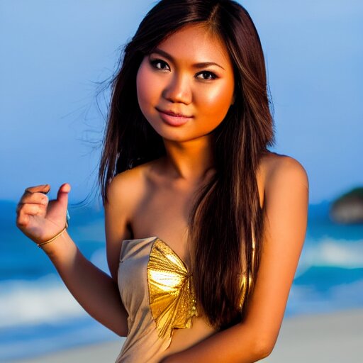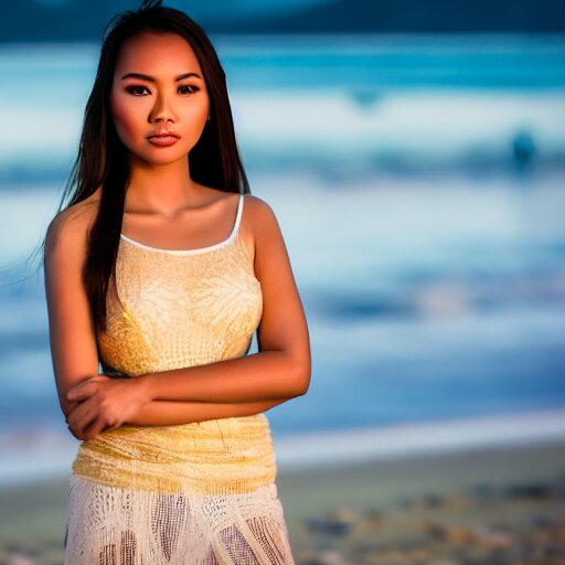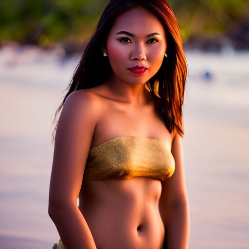 A beautiful full body portrait of a beautiful filipina girl, beautiful detailed eyes, golden hour, standing on a beach in boracay, outdoors, professional award winning portrait photography, zeiss 150mm f/ 2.8 hasselblad