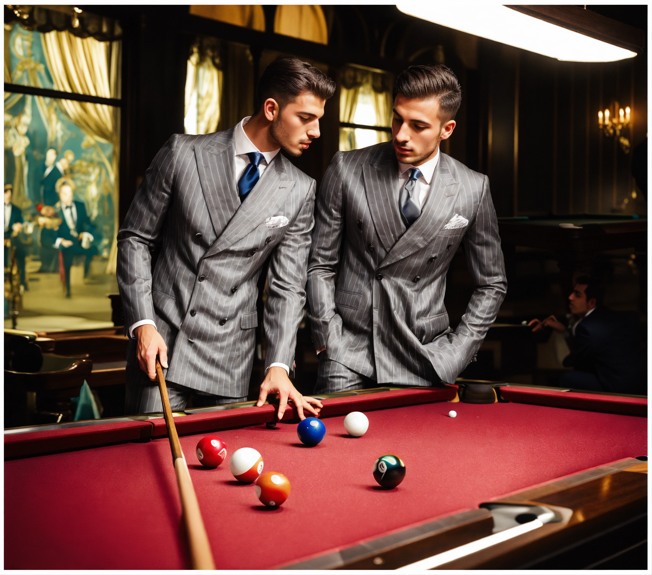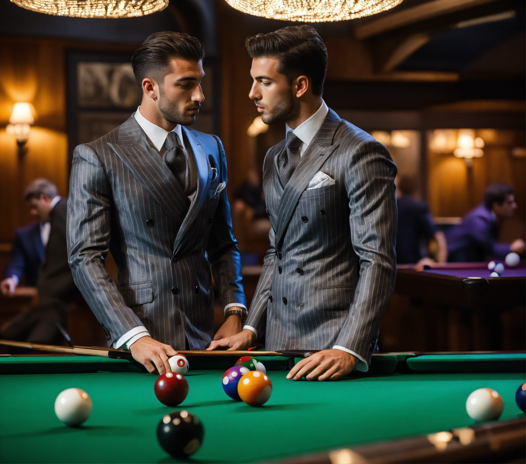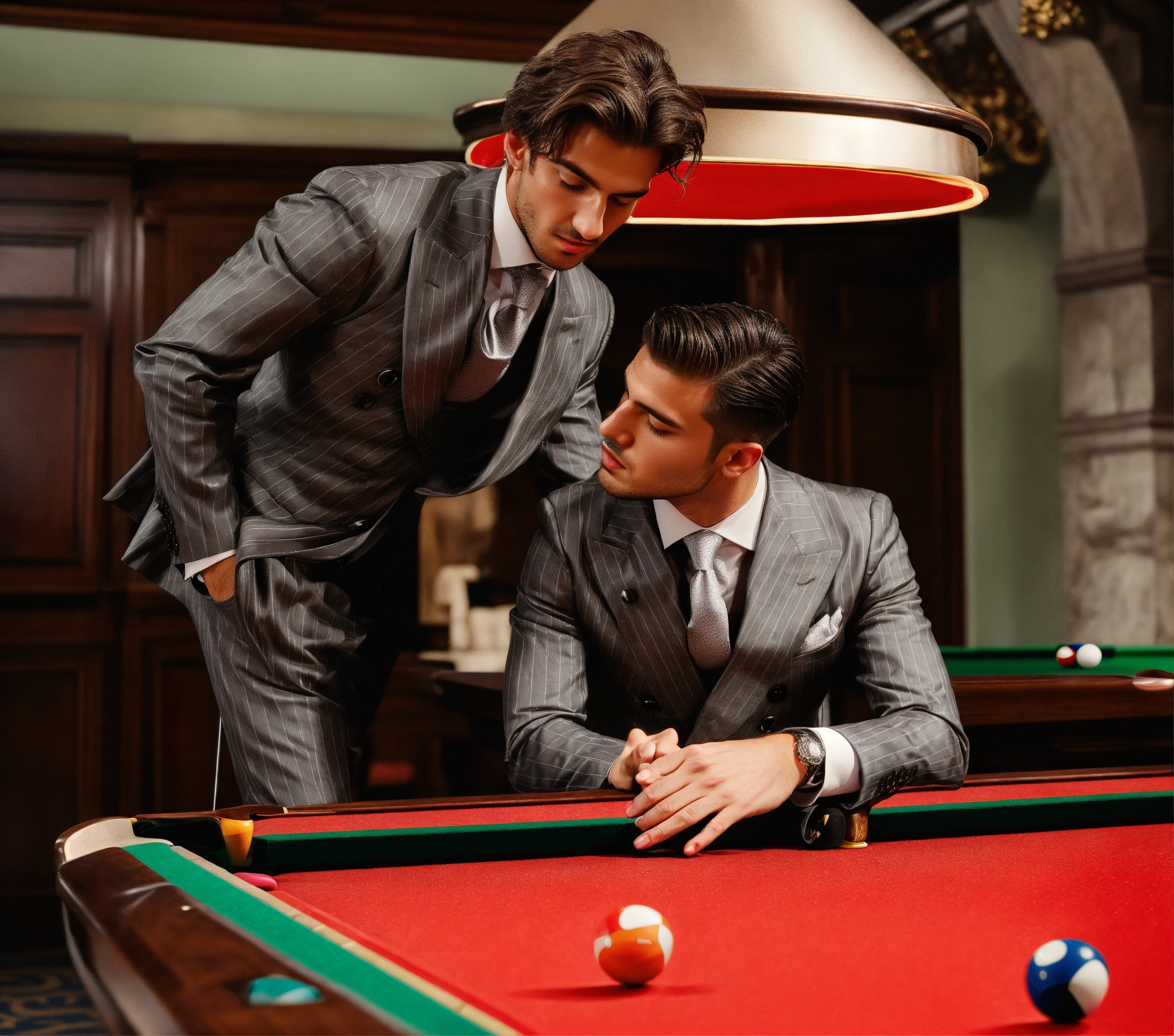 Two young italian male sportsmen in silk satin grey pinstripe double breasted suit, striped tie, kissing at a billiard table