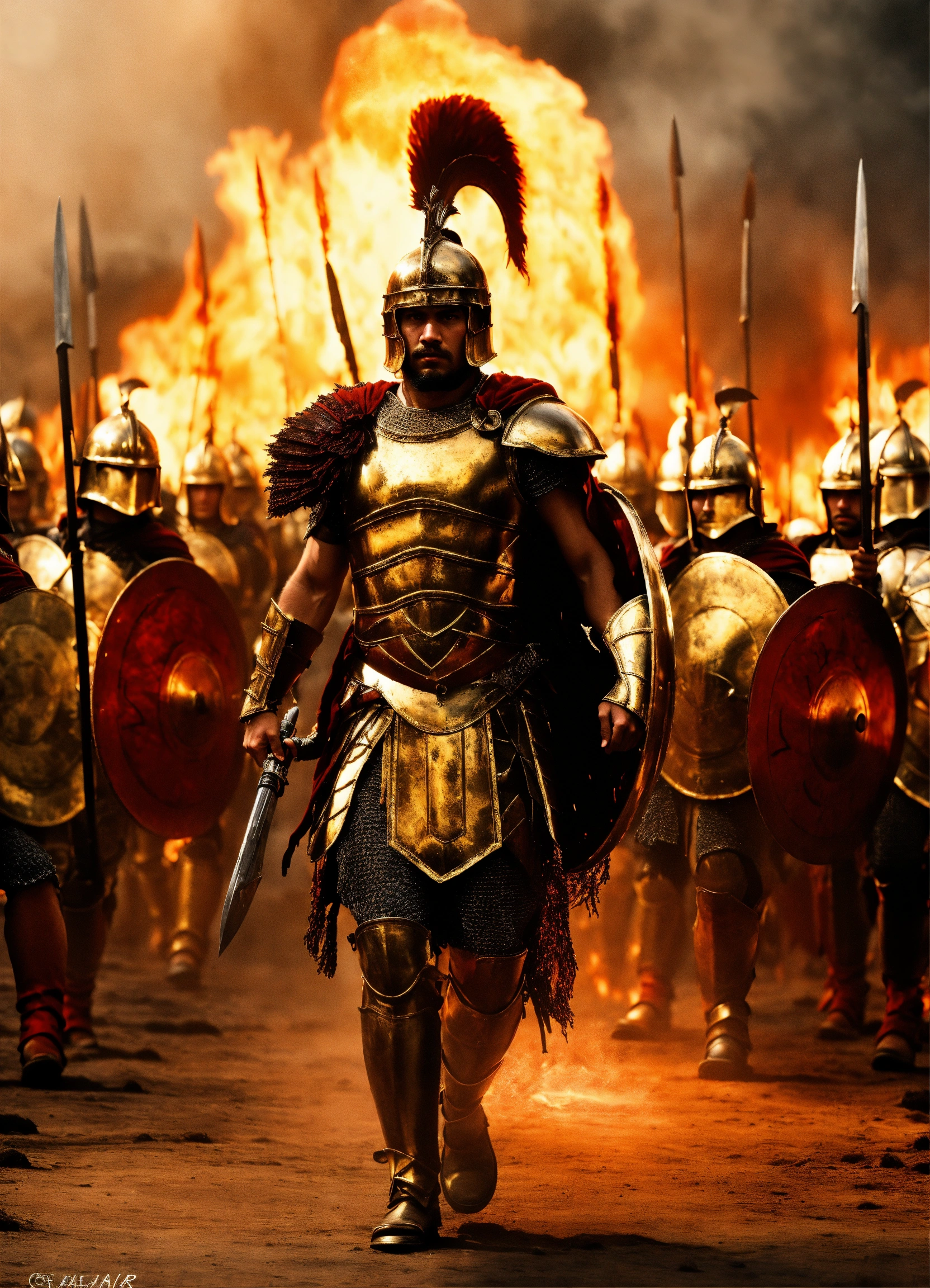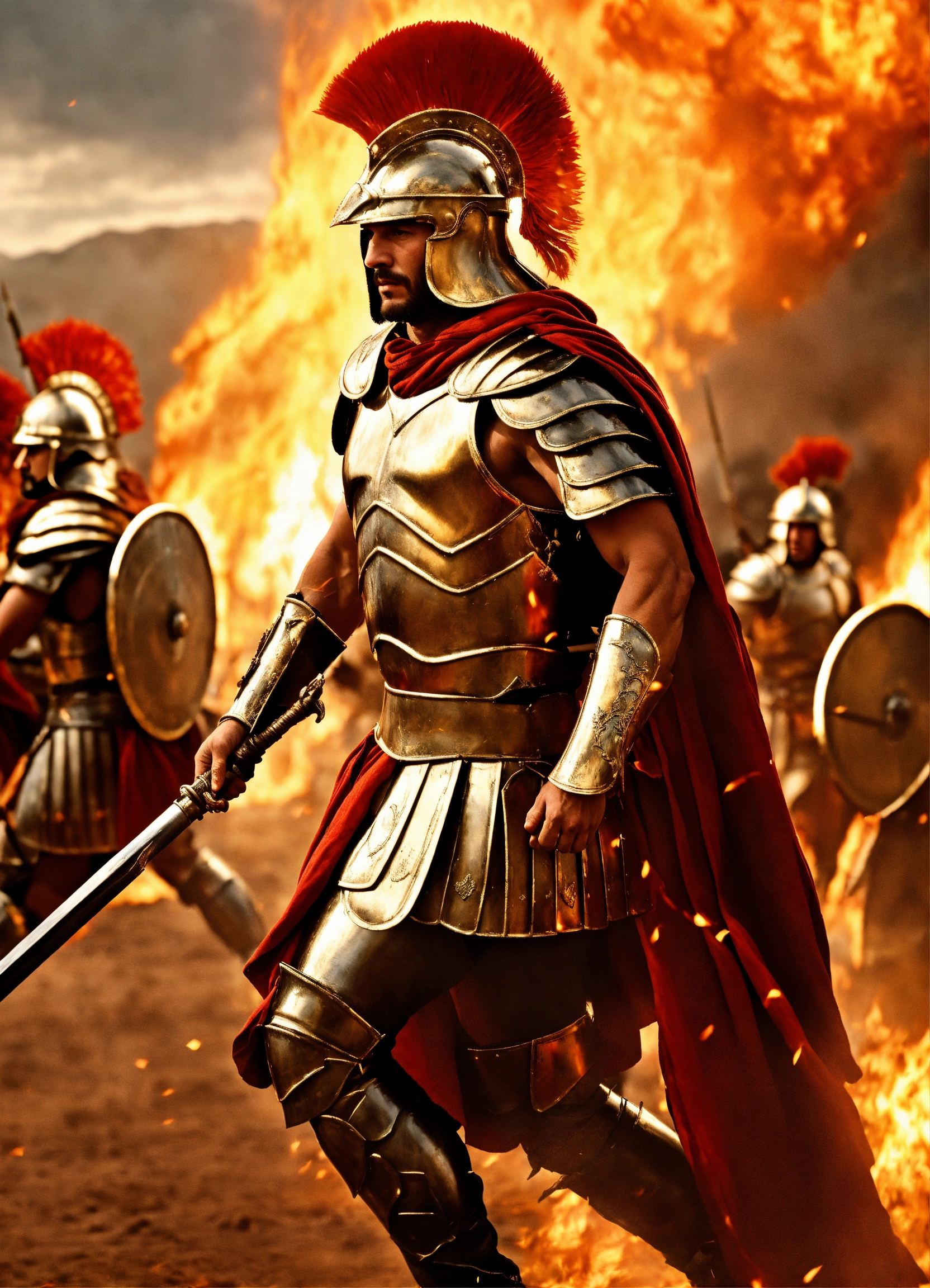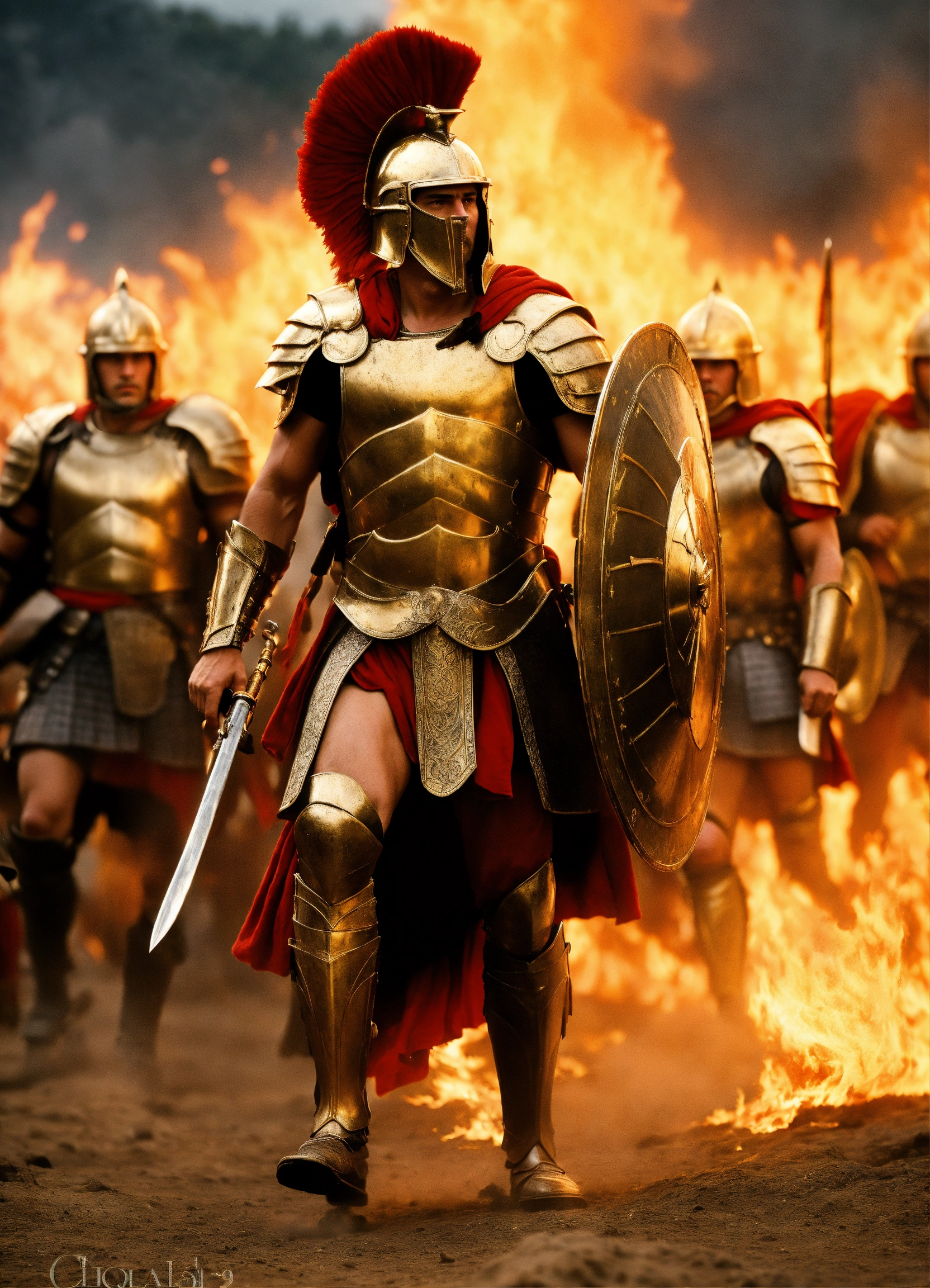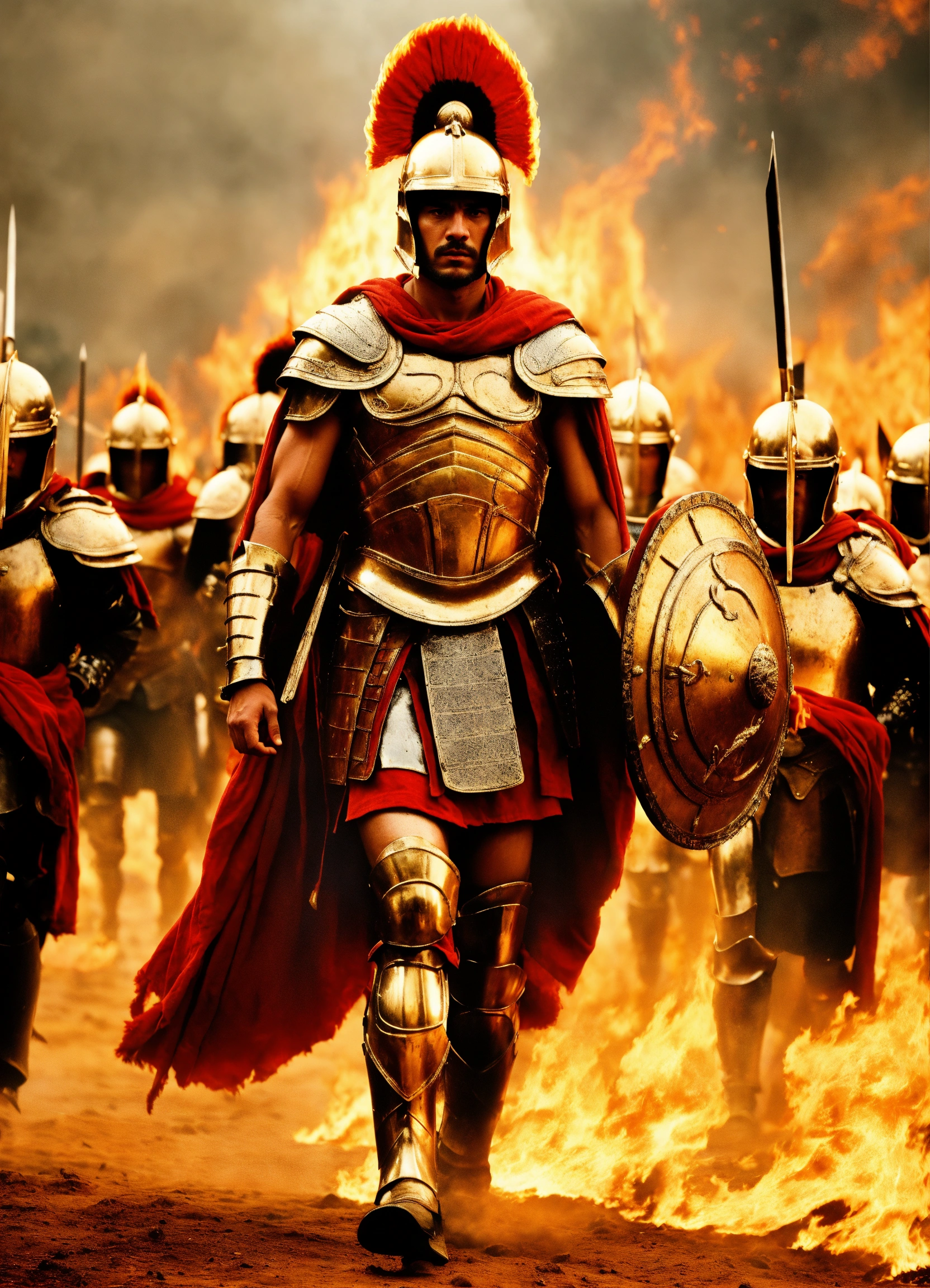 Aquiles, emerging from the achaean ranks with fiery armor, ancient greece, armor shining like fire, achaean battlefield, determined stride forward, achaean soldiers in formation behind him, close-up, hyper-realistic, photo realism, cinematography, --ar 916"