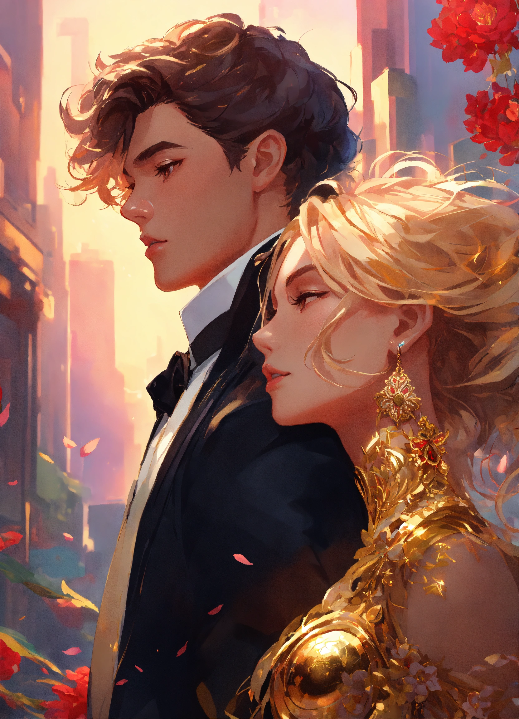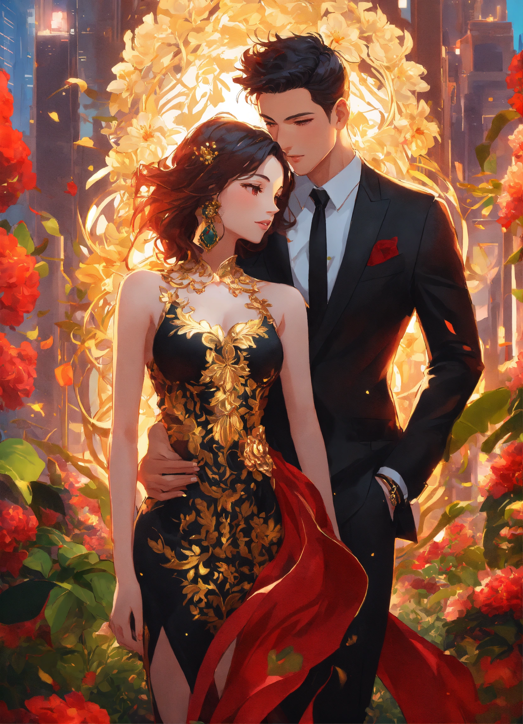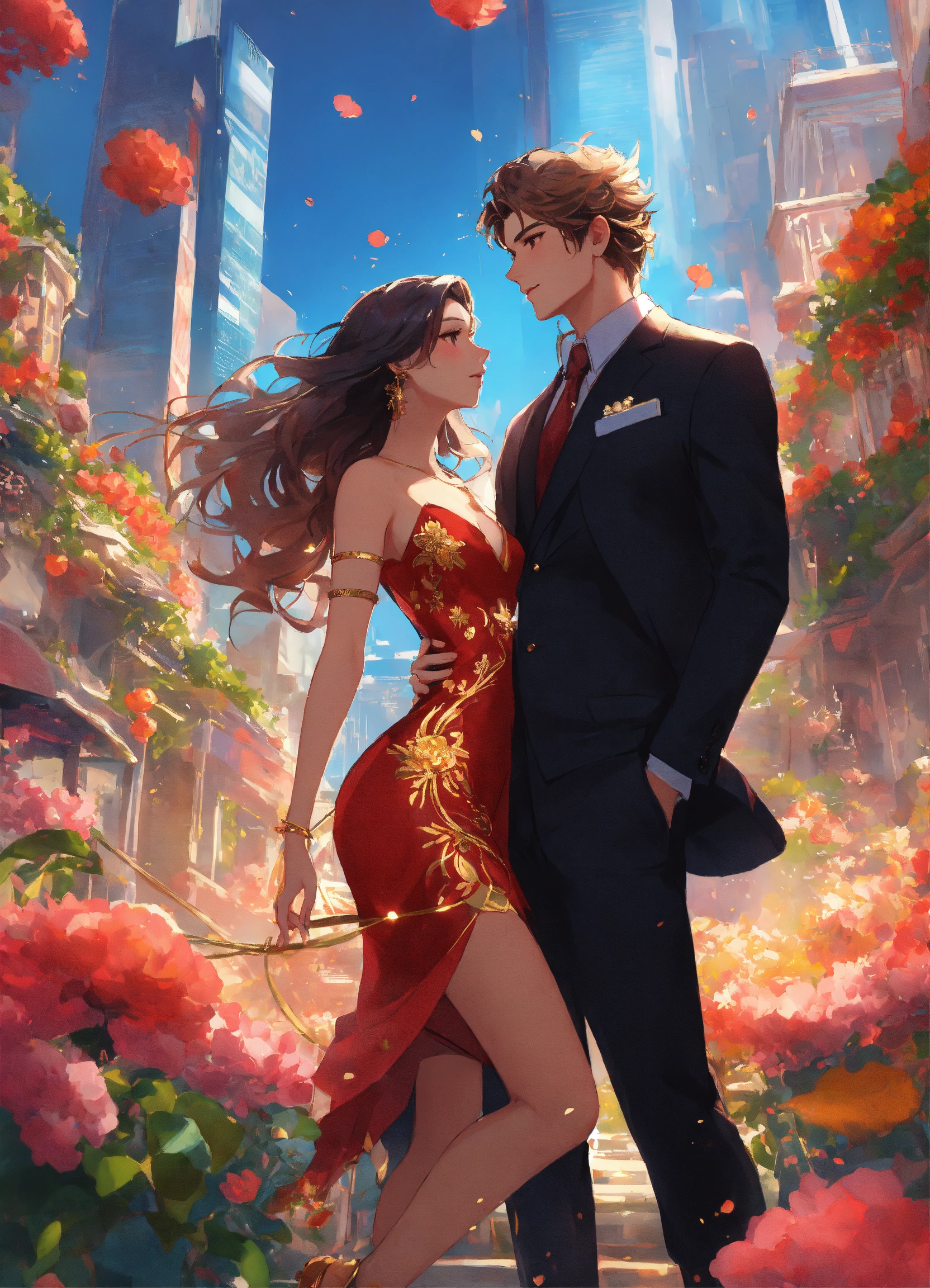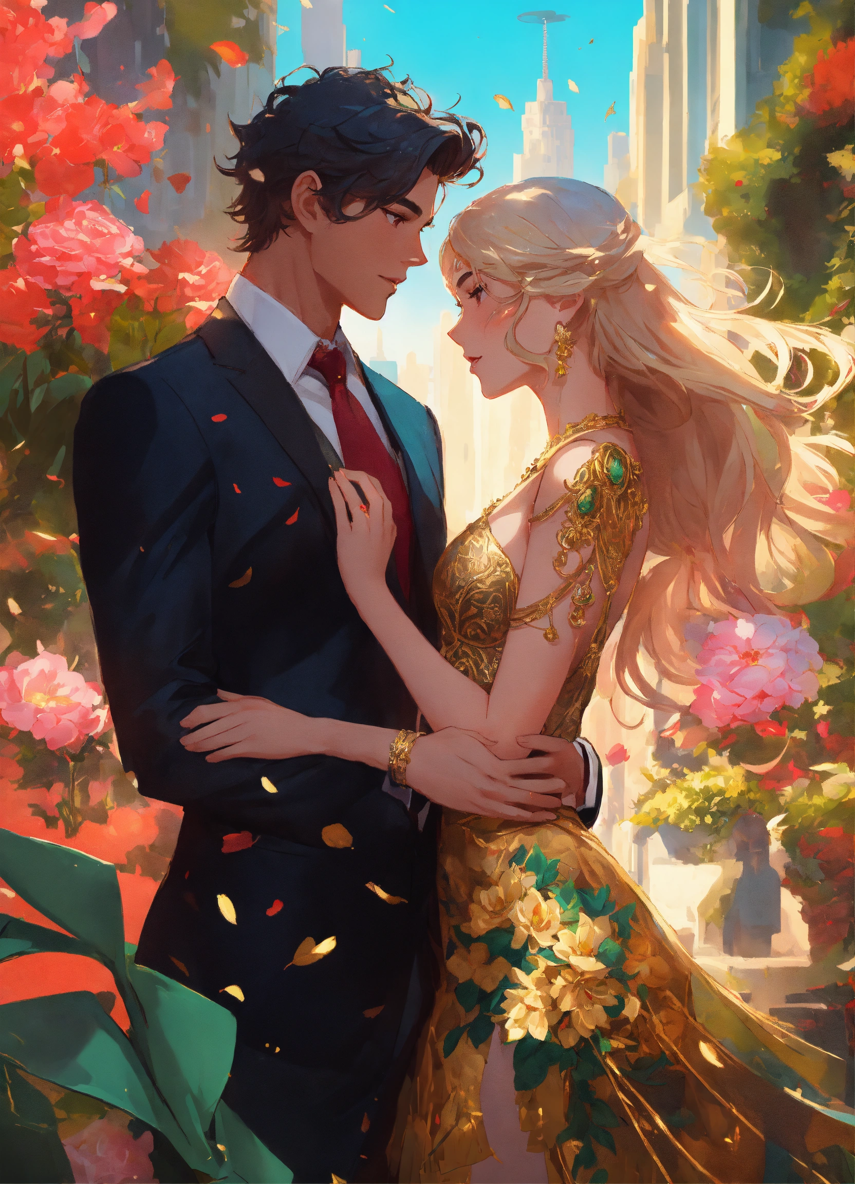 Illustration of beautiful city of towering skyscrapers, islands, vibrant colors, fair skin, the young man wears a intricate black suit with gold ornaments, has wavy black tousled hair, the golden haired woman wears a red intricate dress with gold adornments that shows legs, maximalist, 8k photo, animestyle, by artgerm, by rossdraws, trending on artstation, garden, windy, flowers, circular perspective, romantic, facing each other