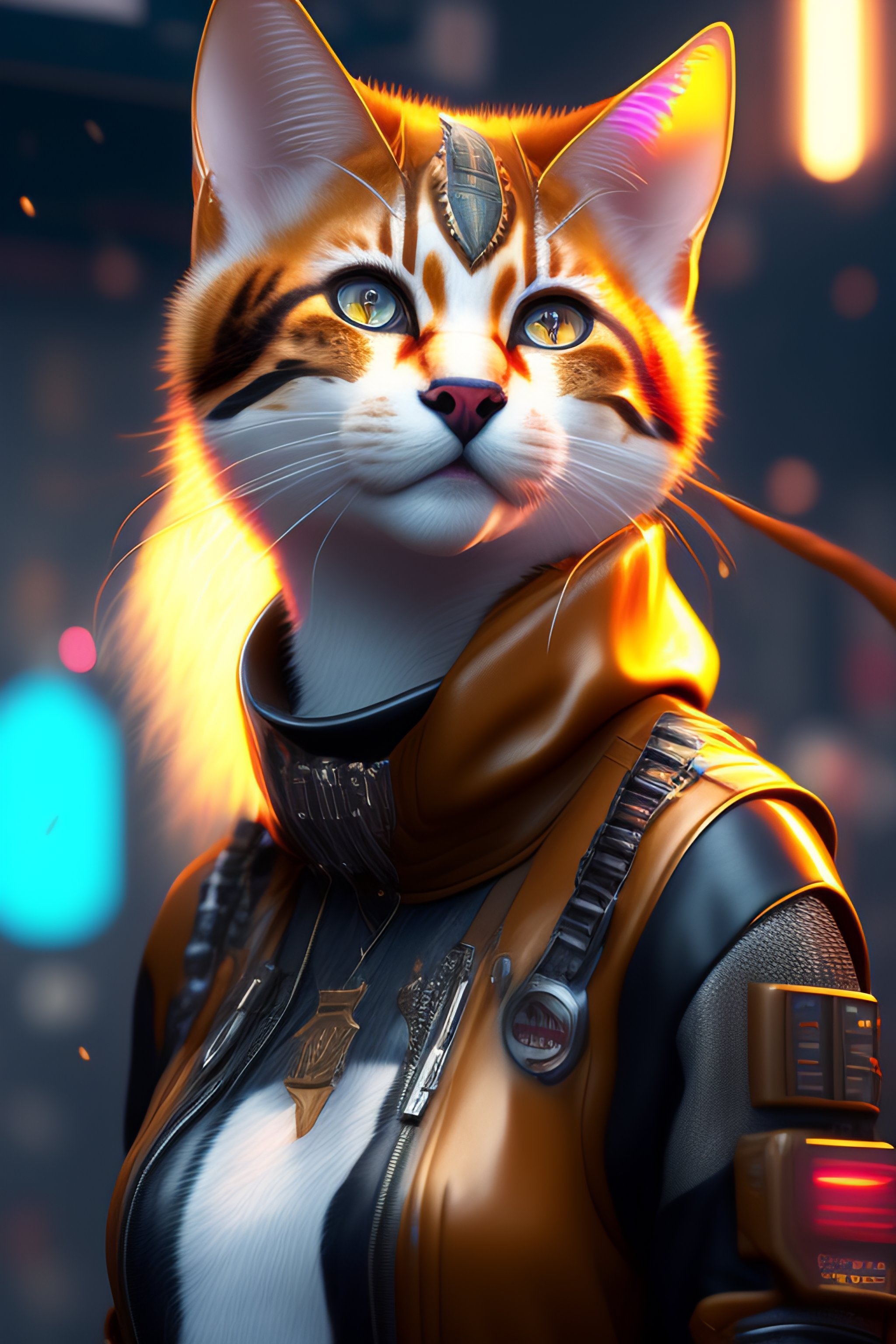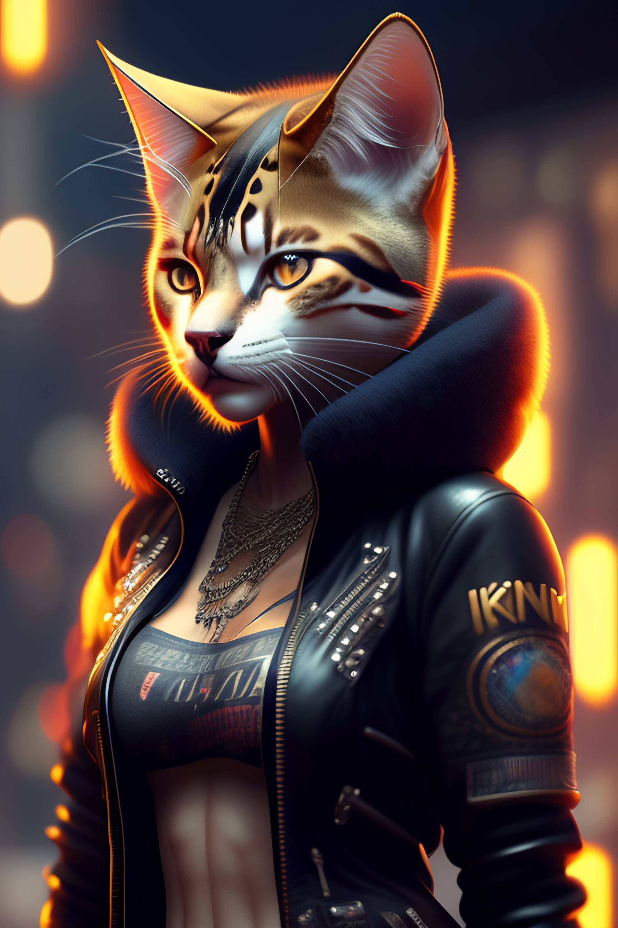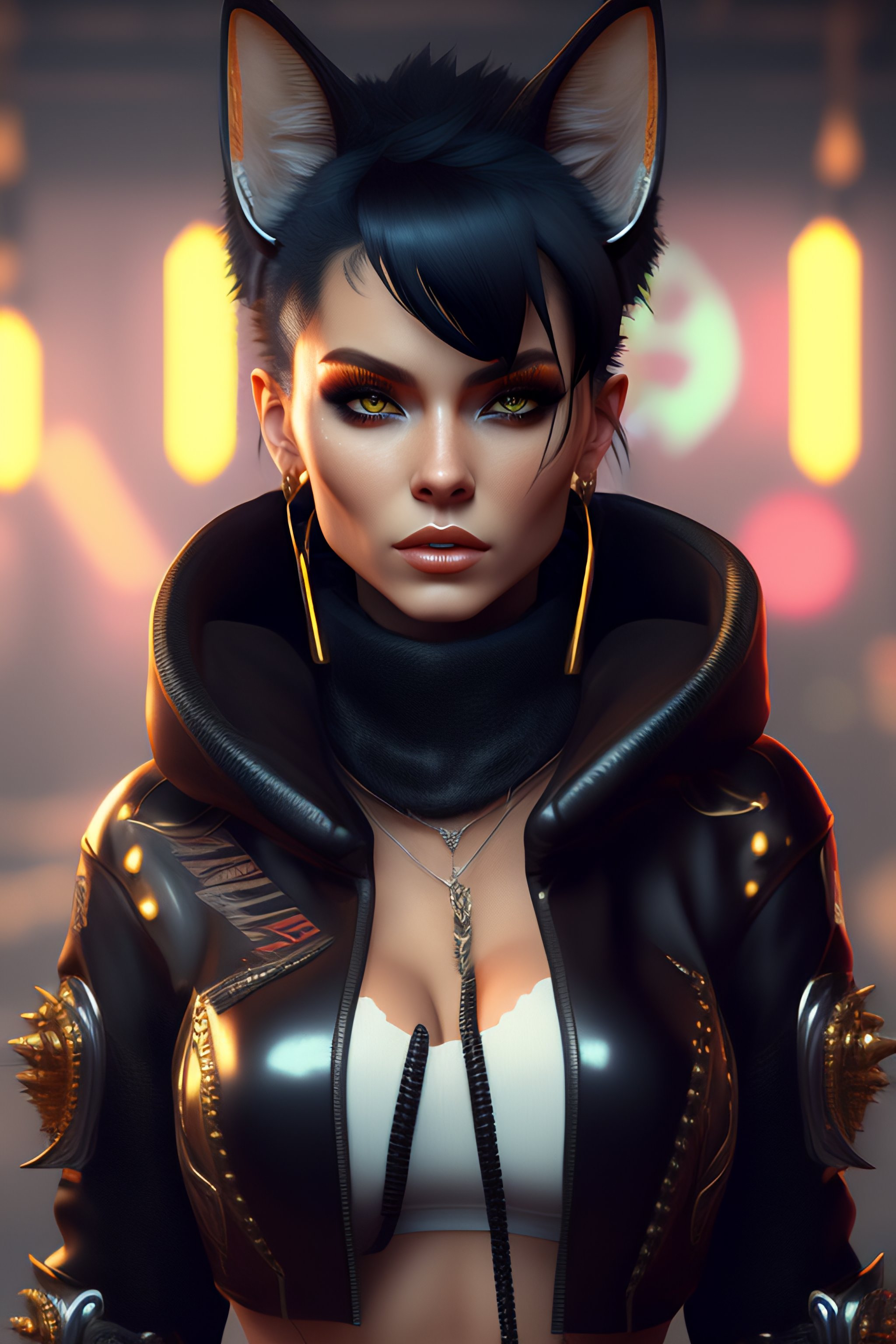 Full feline, covered in body fur, punk clothes with short hair girl, battle status, hyper detailed, digital art, cyberpunk style, cybercinematic lighting, studio quality, smooth render, unreal engine 5 rendered, octane rendered, art style by klimt and nixeu and ian sprigger and wlop and krenz cushart