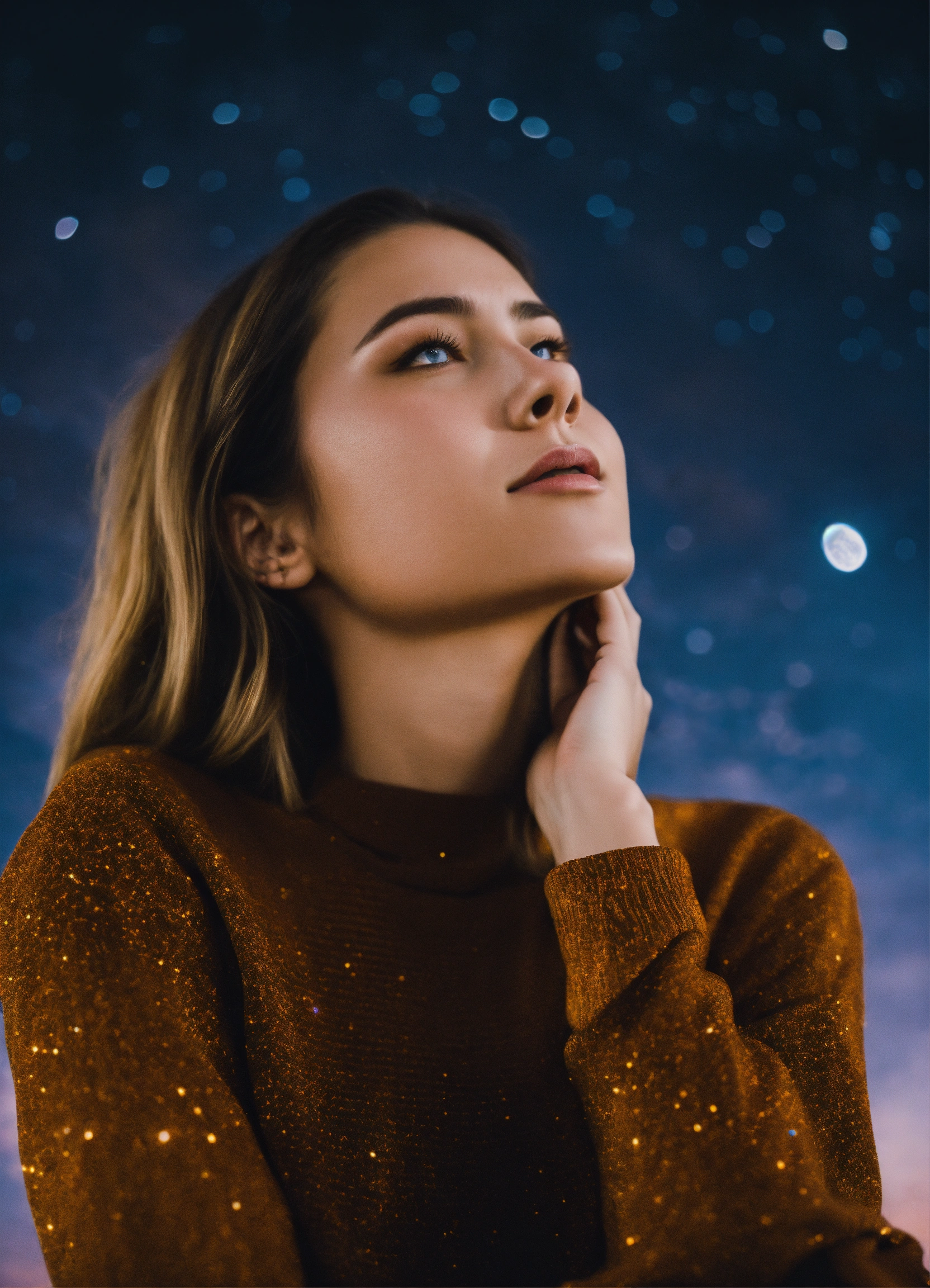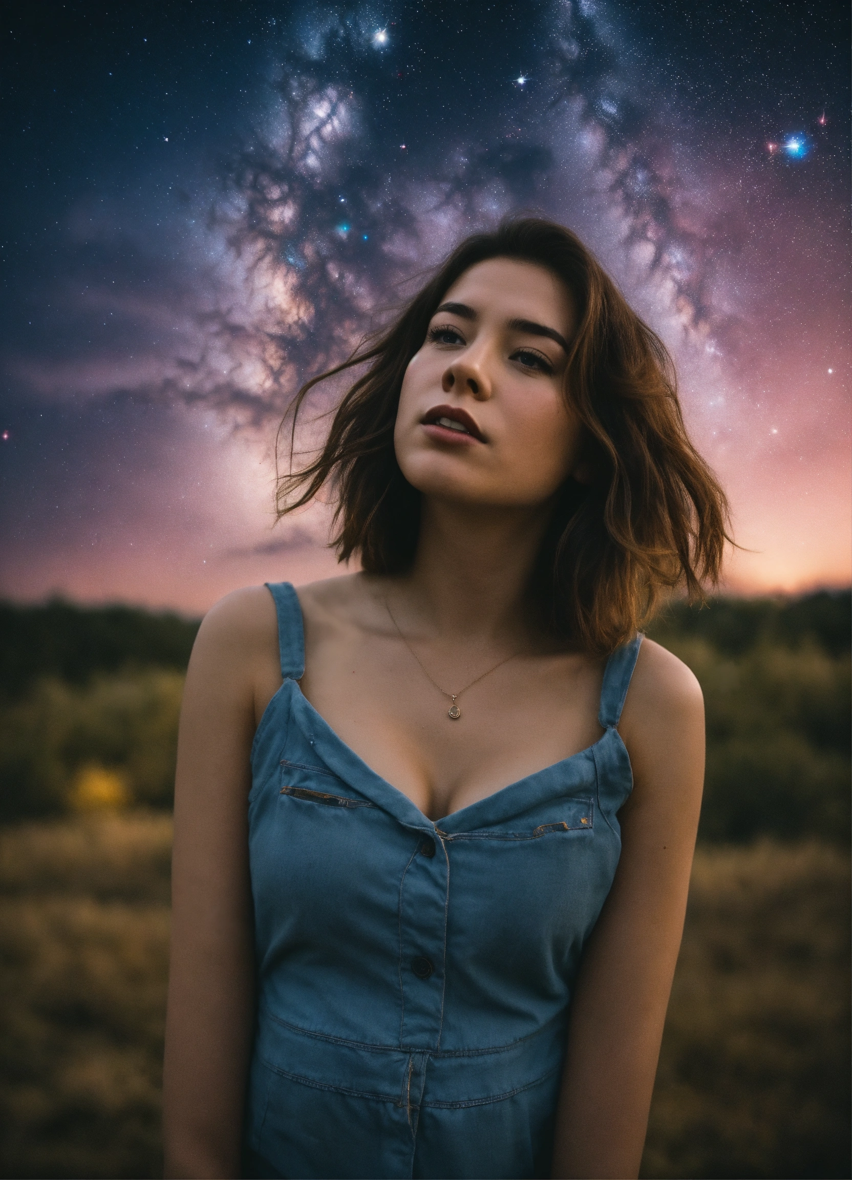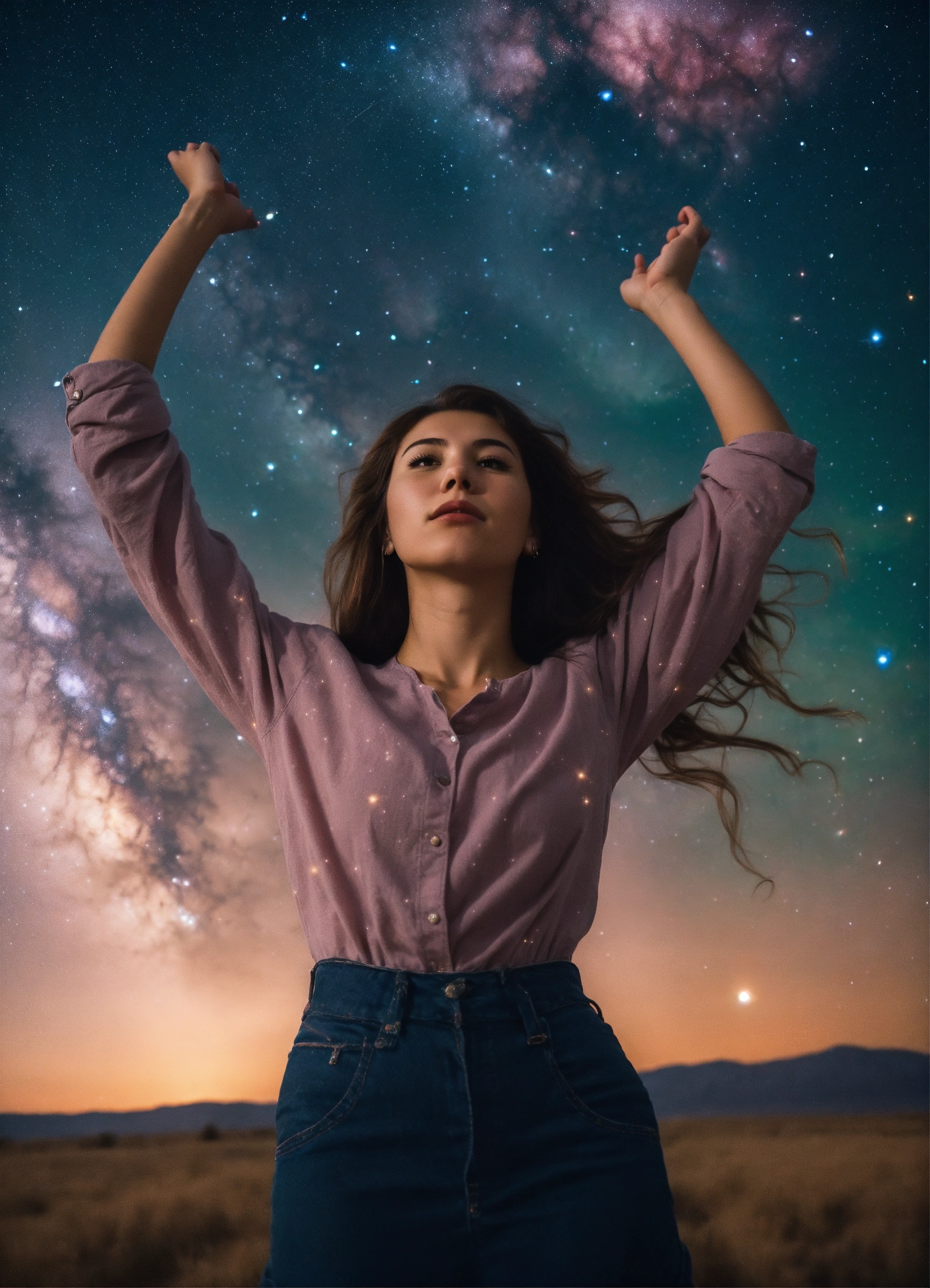 A real photo of a 25 year old girl, asking "why?" with her arms and facial expressions. in the sky we see the galaxy
