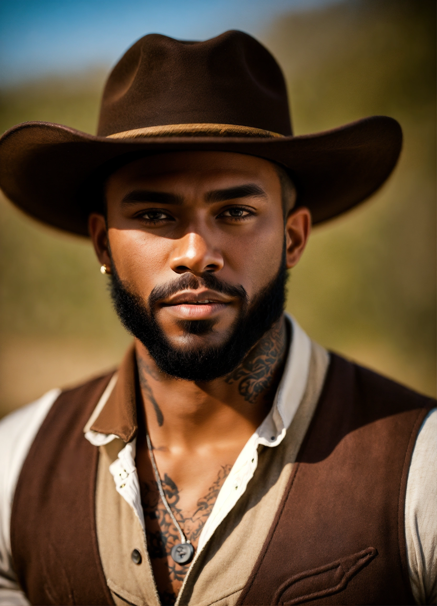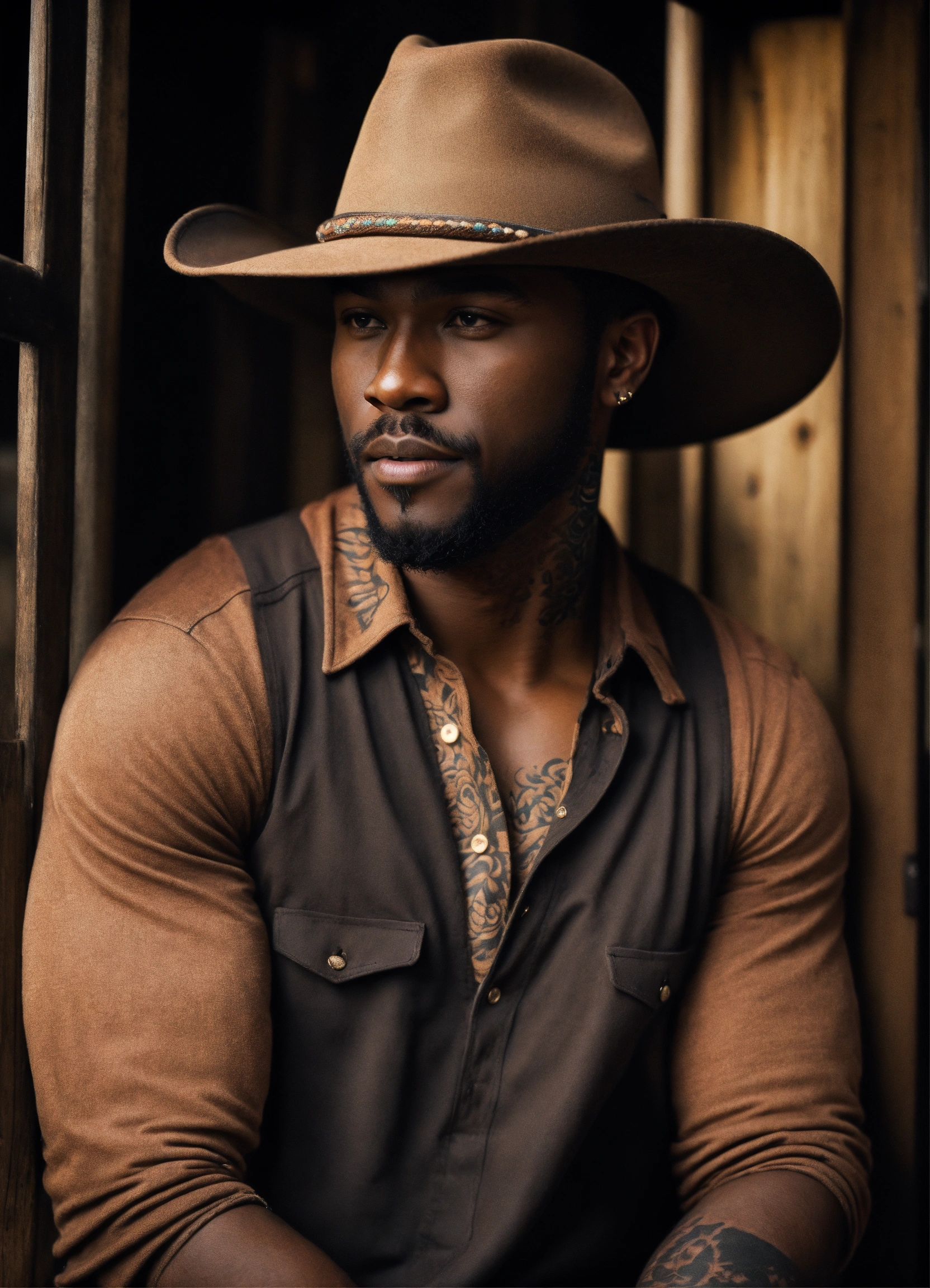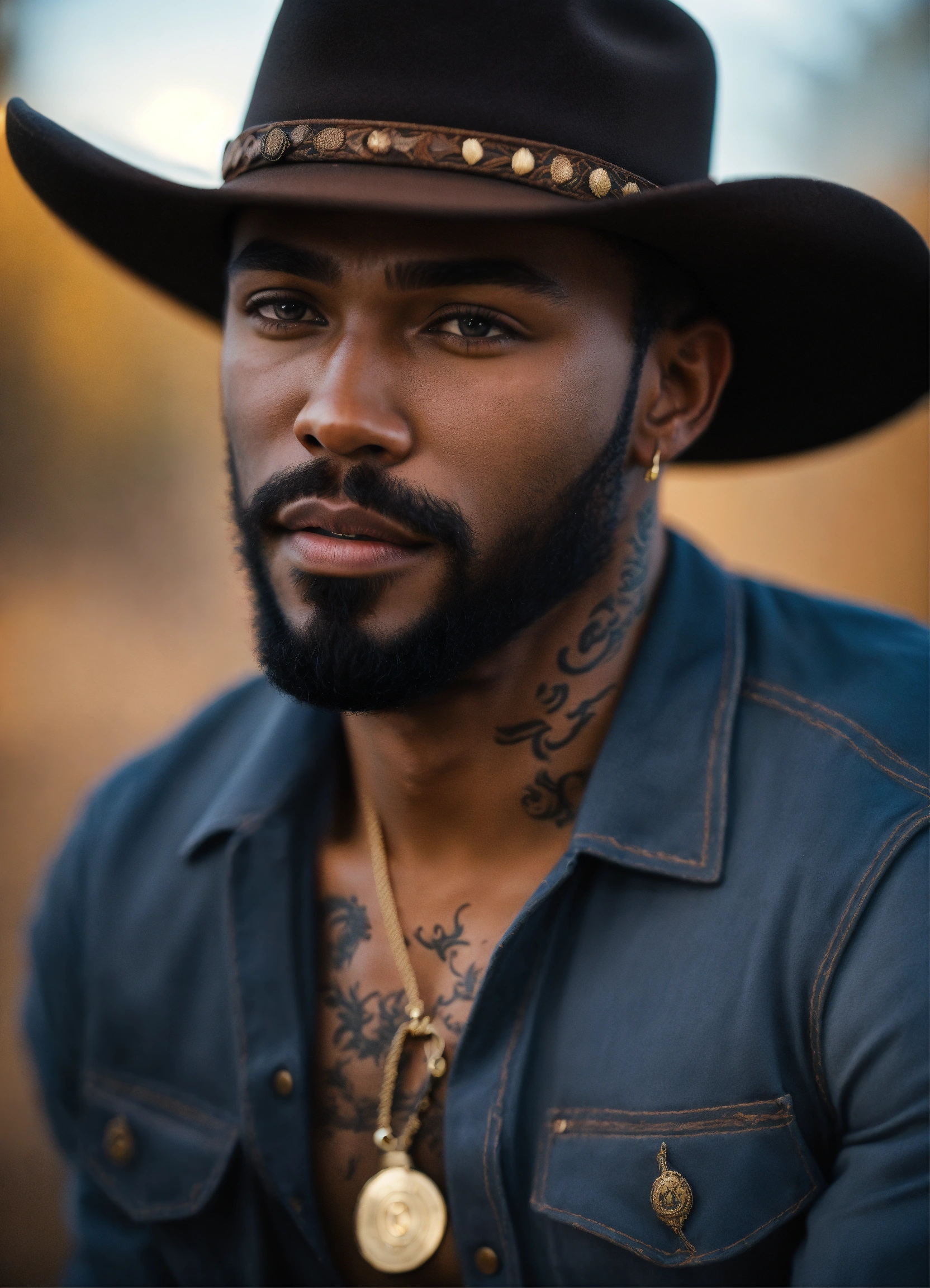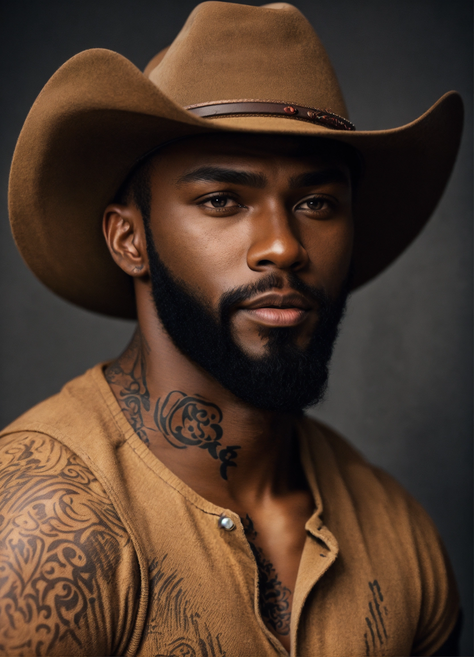 Handsome black male, cowboy, low beard, light eyes, dark skin, tattoos, stetson hat, brown thermal henley