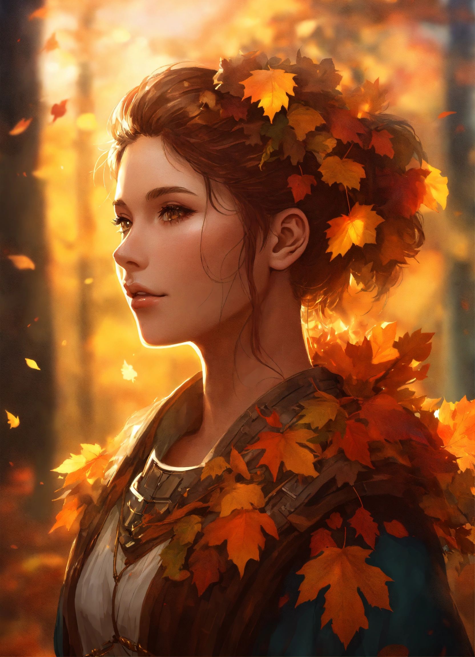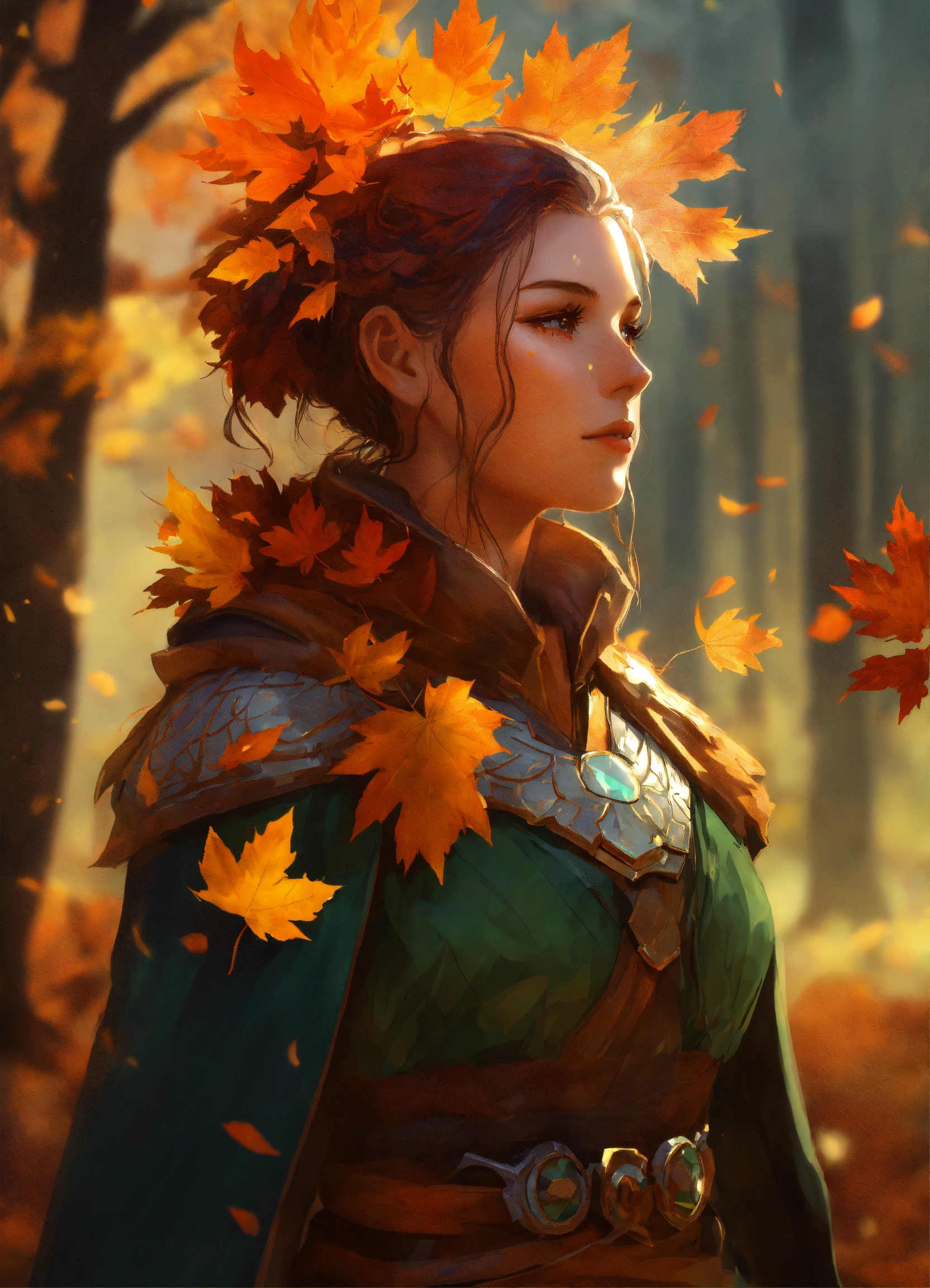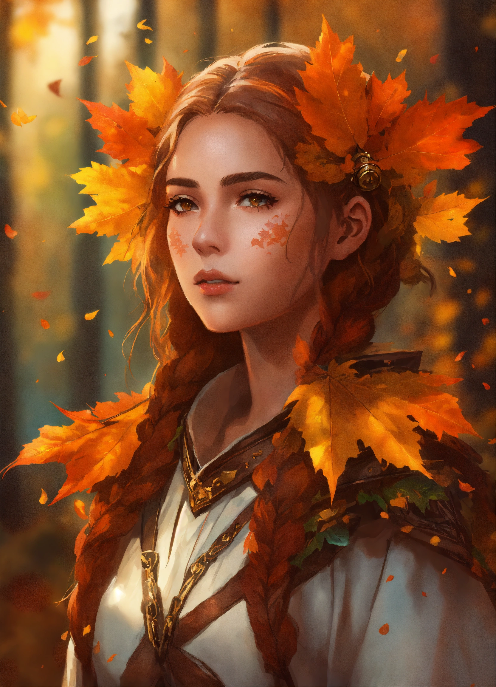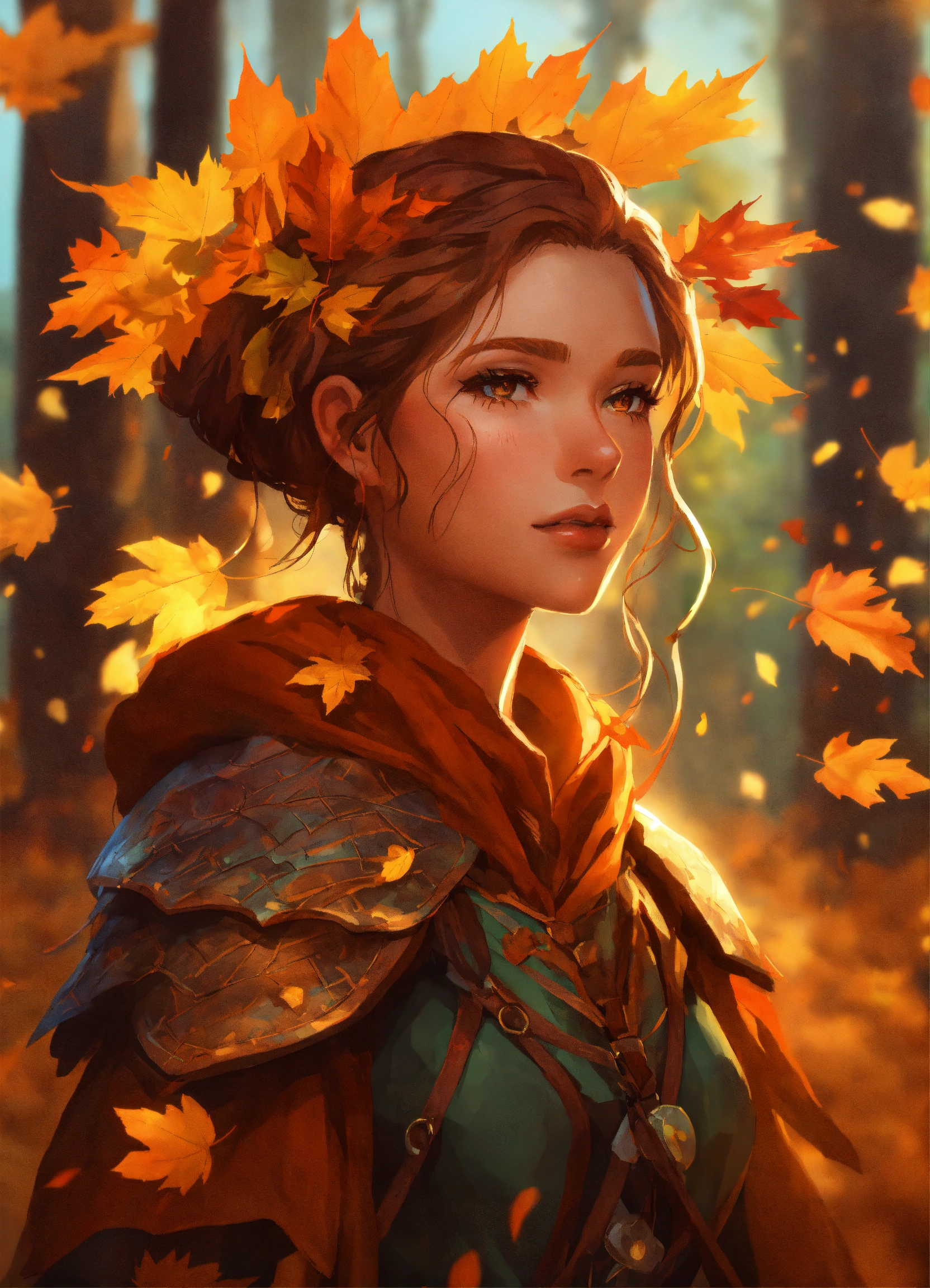 A girl with wooden shoulder pads and magical autumn glowing leaves on her shoulders, druid, concept art style