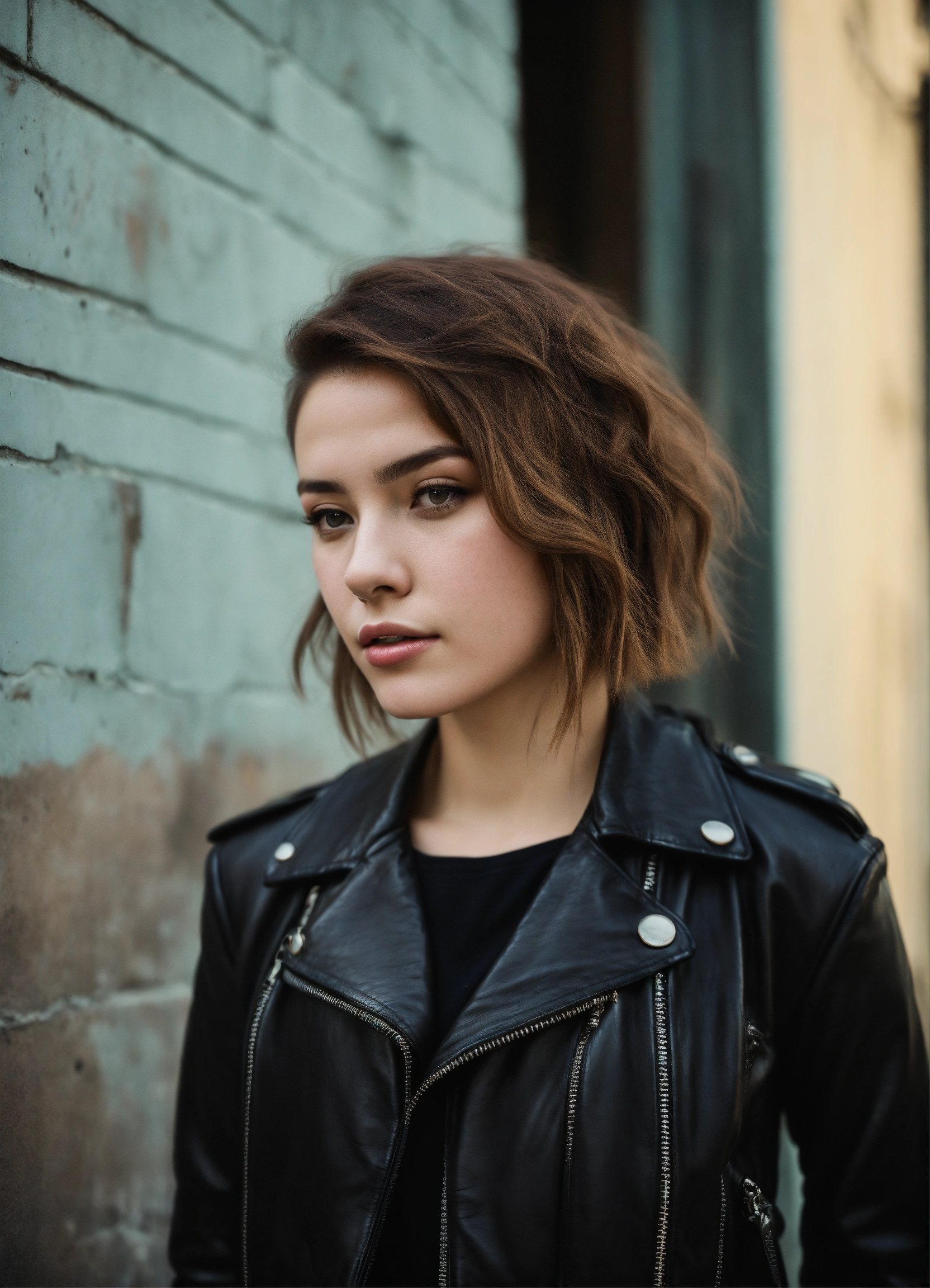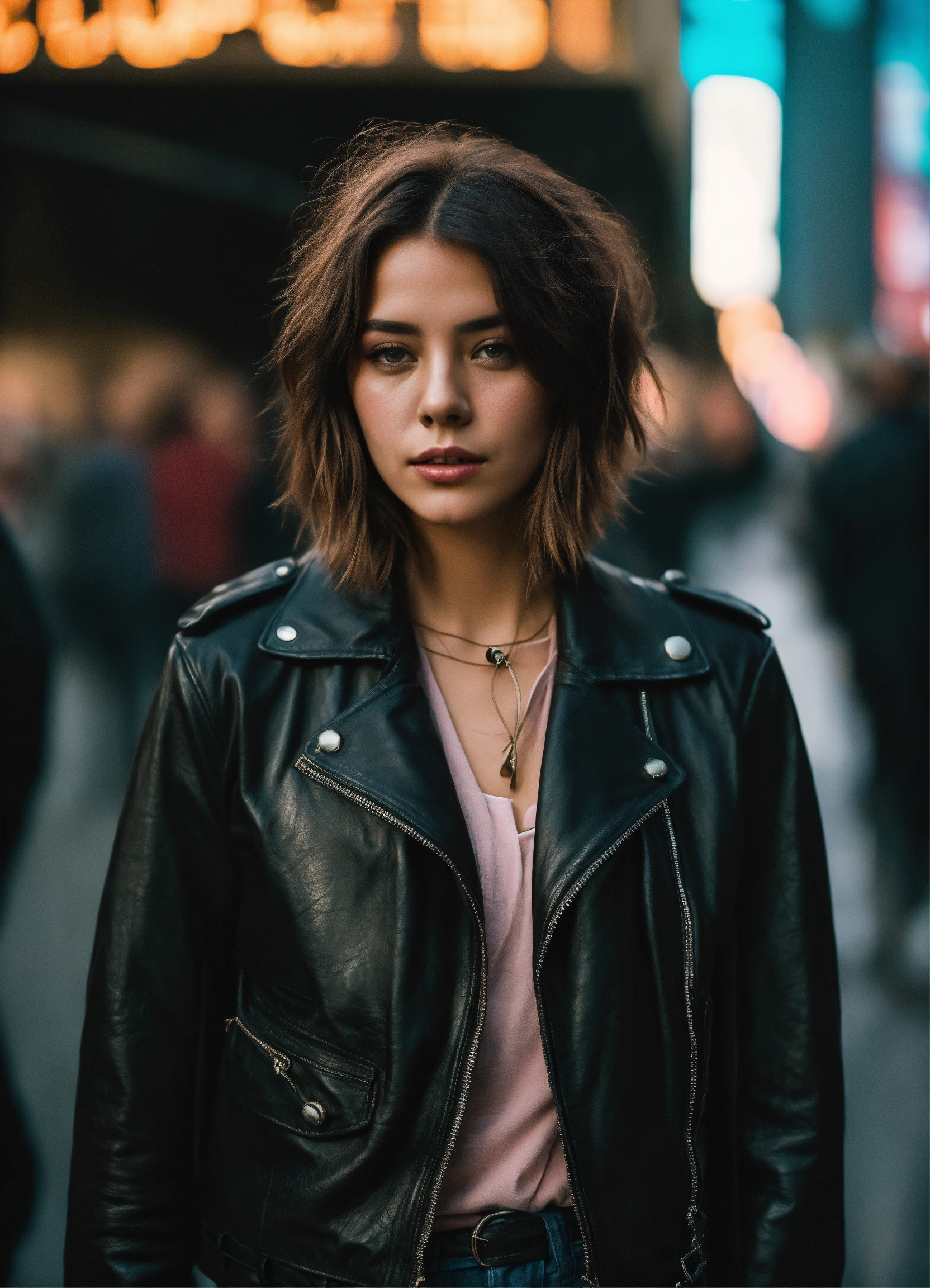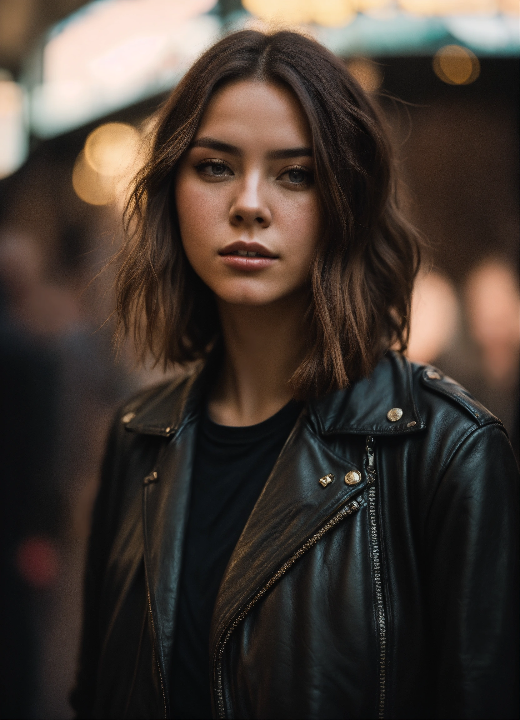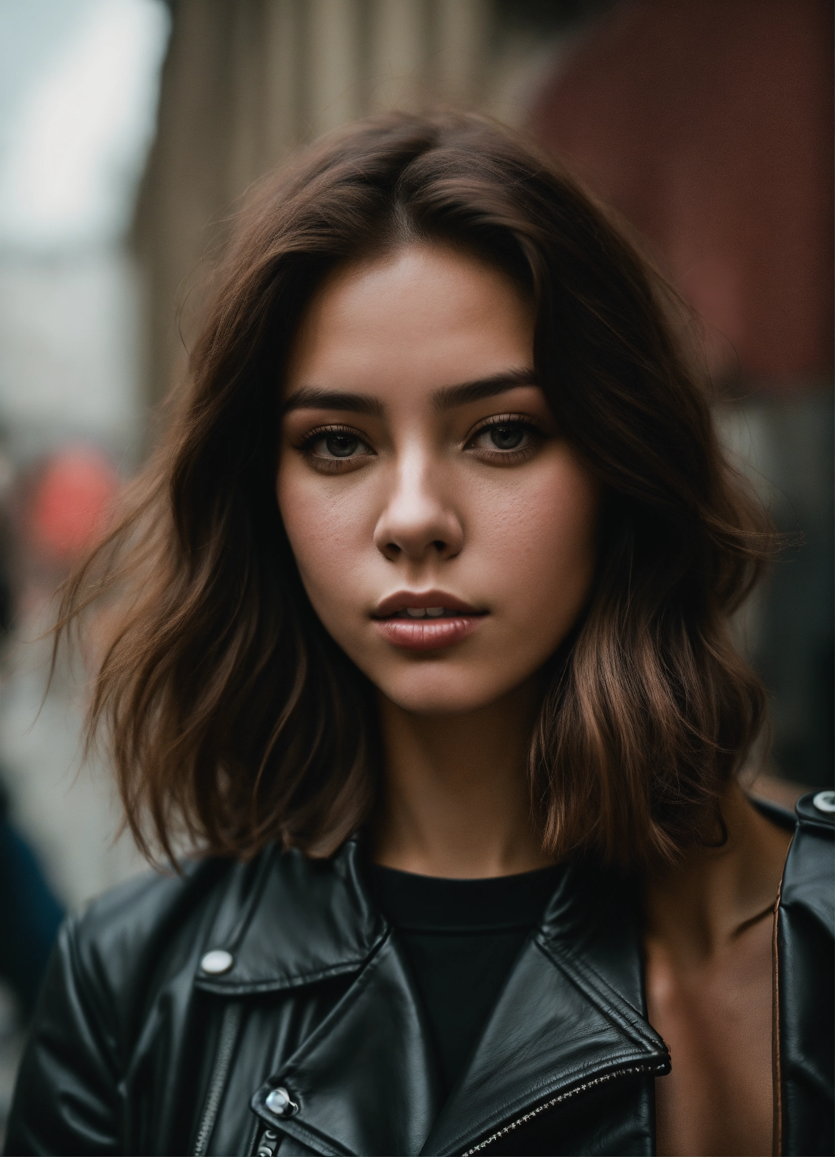Muted portrait photography of a young woman wearing a black leather jacket from the waist up titled "lost in the crowd", muted palette, soft colors, detailed, 8k