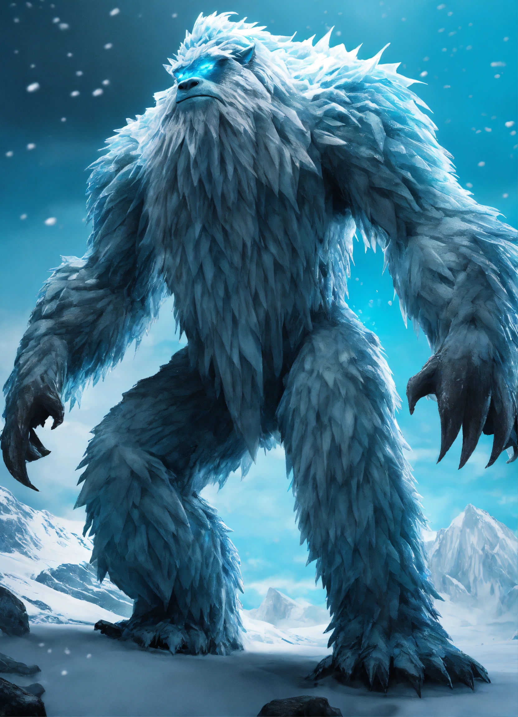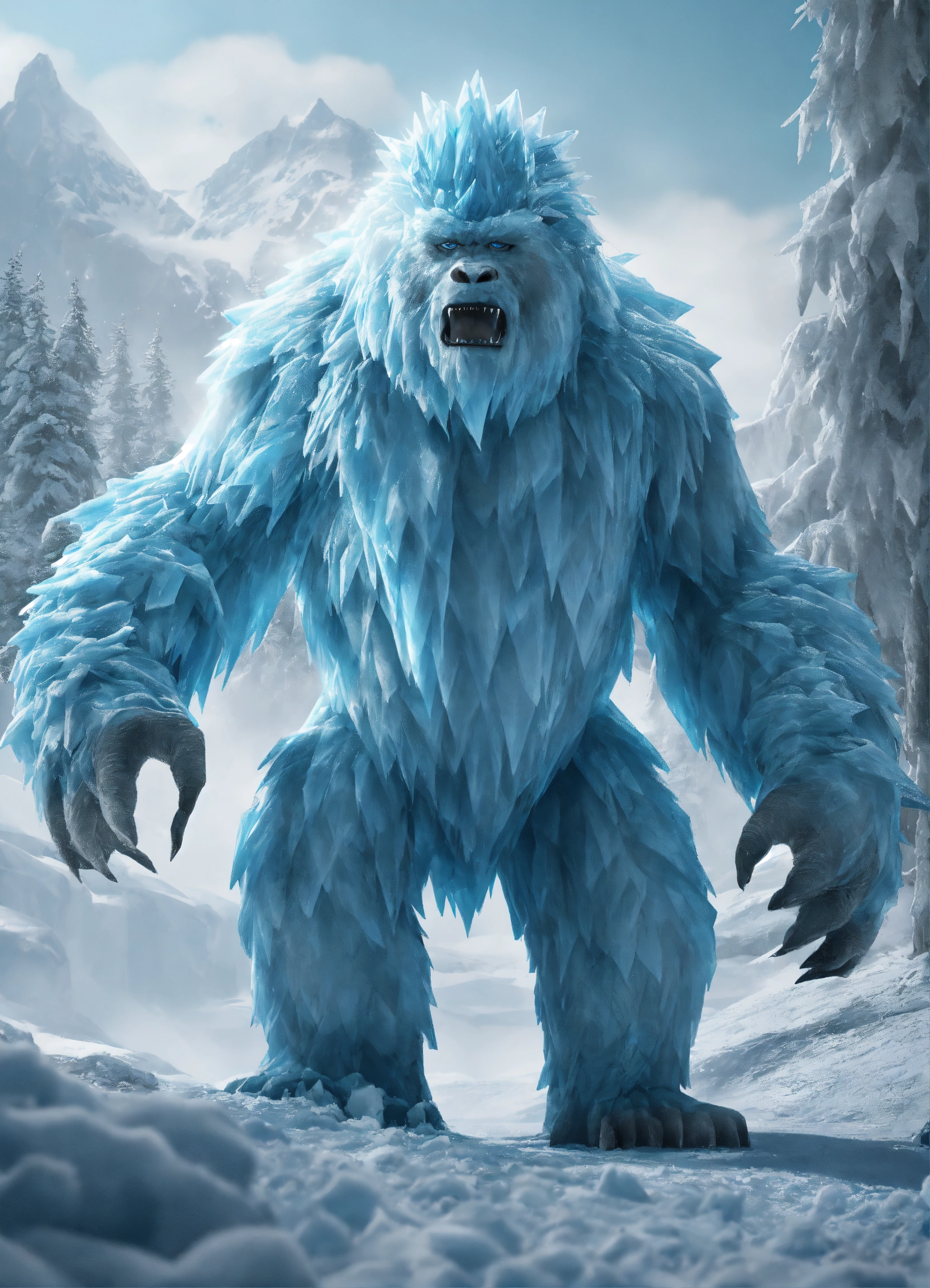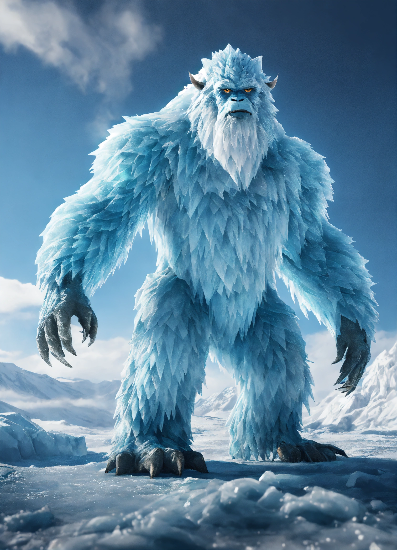 Glacial yeti description the glacial yeti is a towering ice creature that glistens with frost in 8k detail, watch as ice crystals form and shatter realistically as it moves through its frigid habitat, it is made from hops
