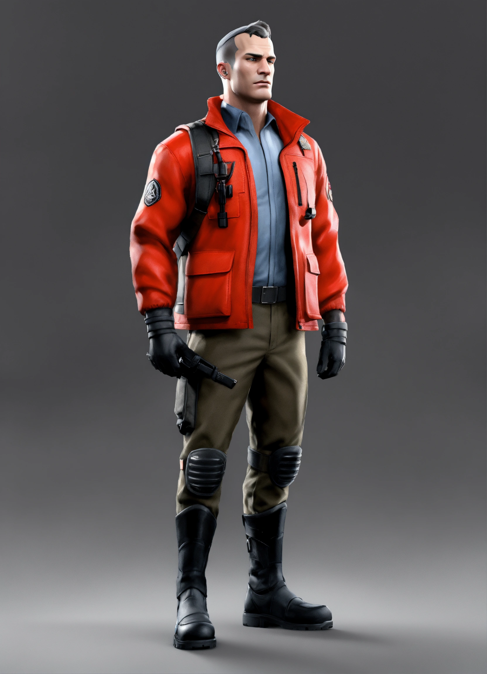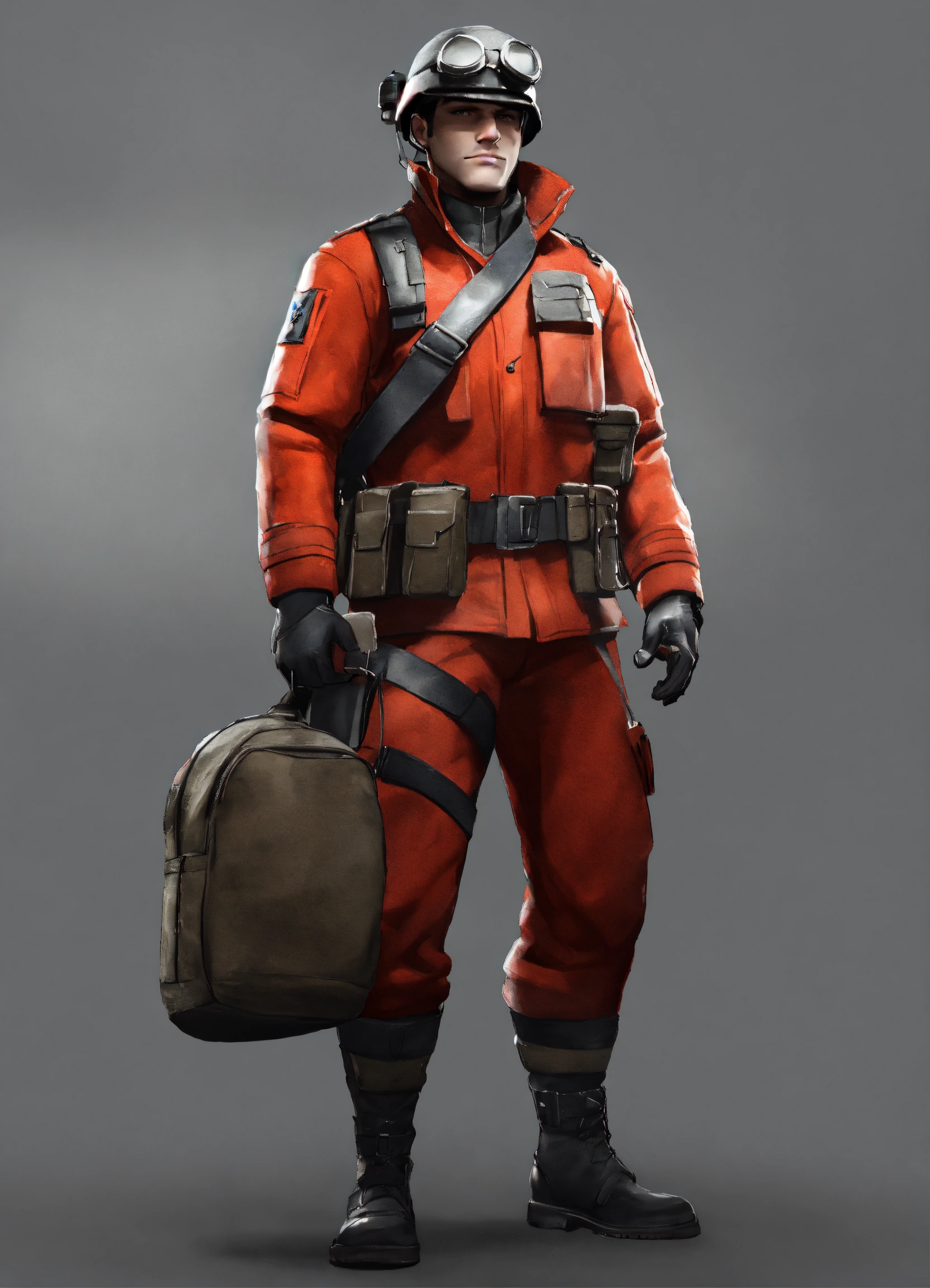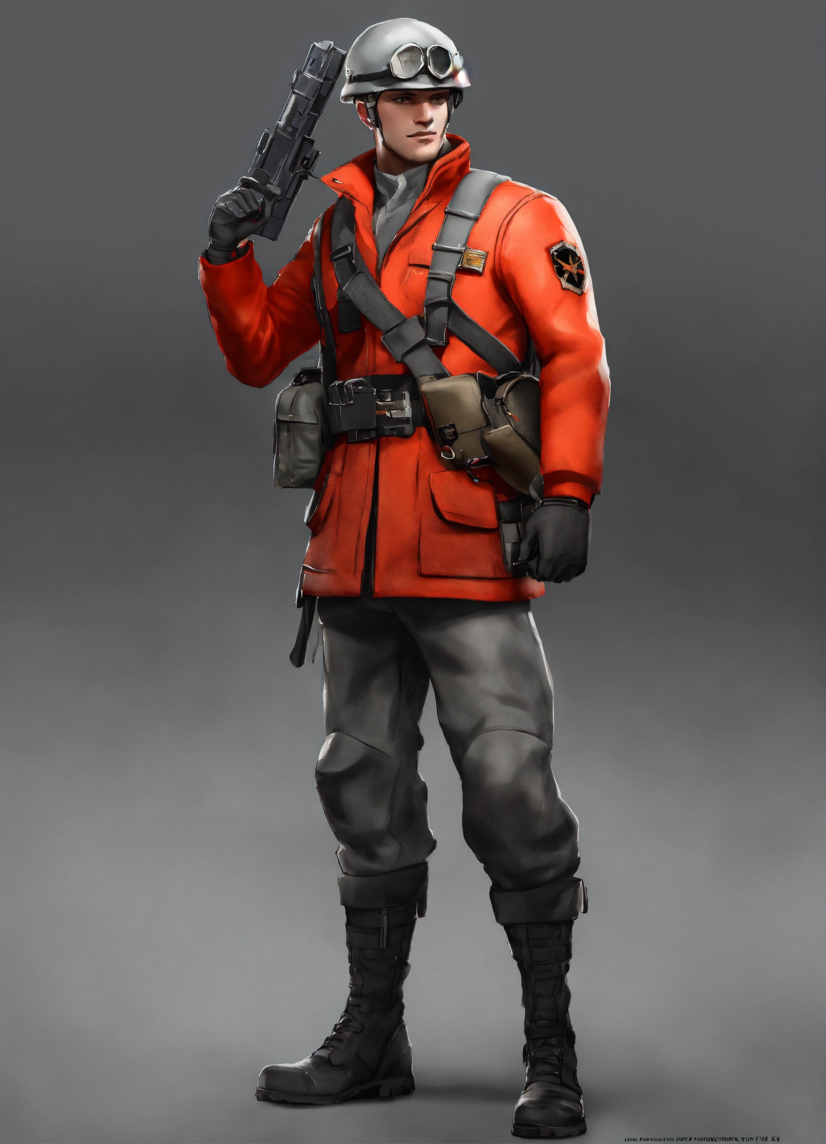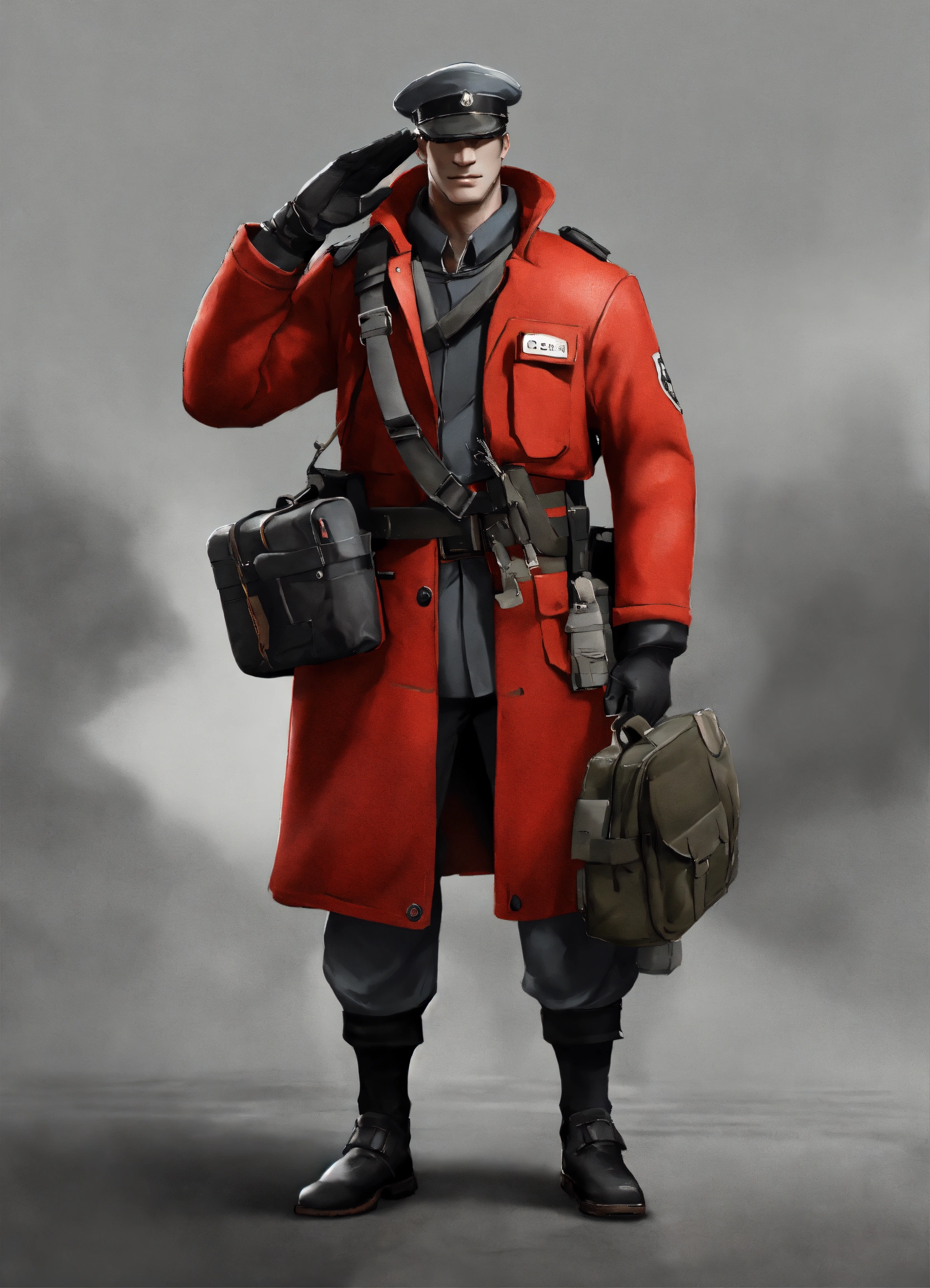 The soldier from team fortress 2 wearing a red jacket with a black strap and wearing a black belt with a bag and making a salute with his right hand, best quality, cloudy gray background, digital hd art, black and white, pencil sketch, ink sketch, beautiful drawing, highly detailed, concept art, ultra-realistic digital illustration, 3dart++, blender++, unreal 5++