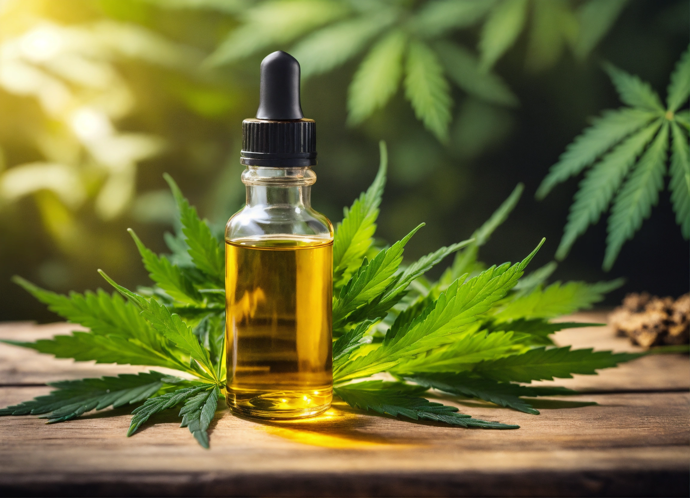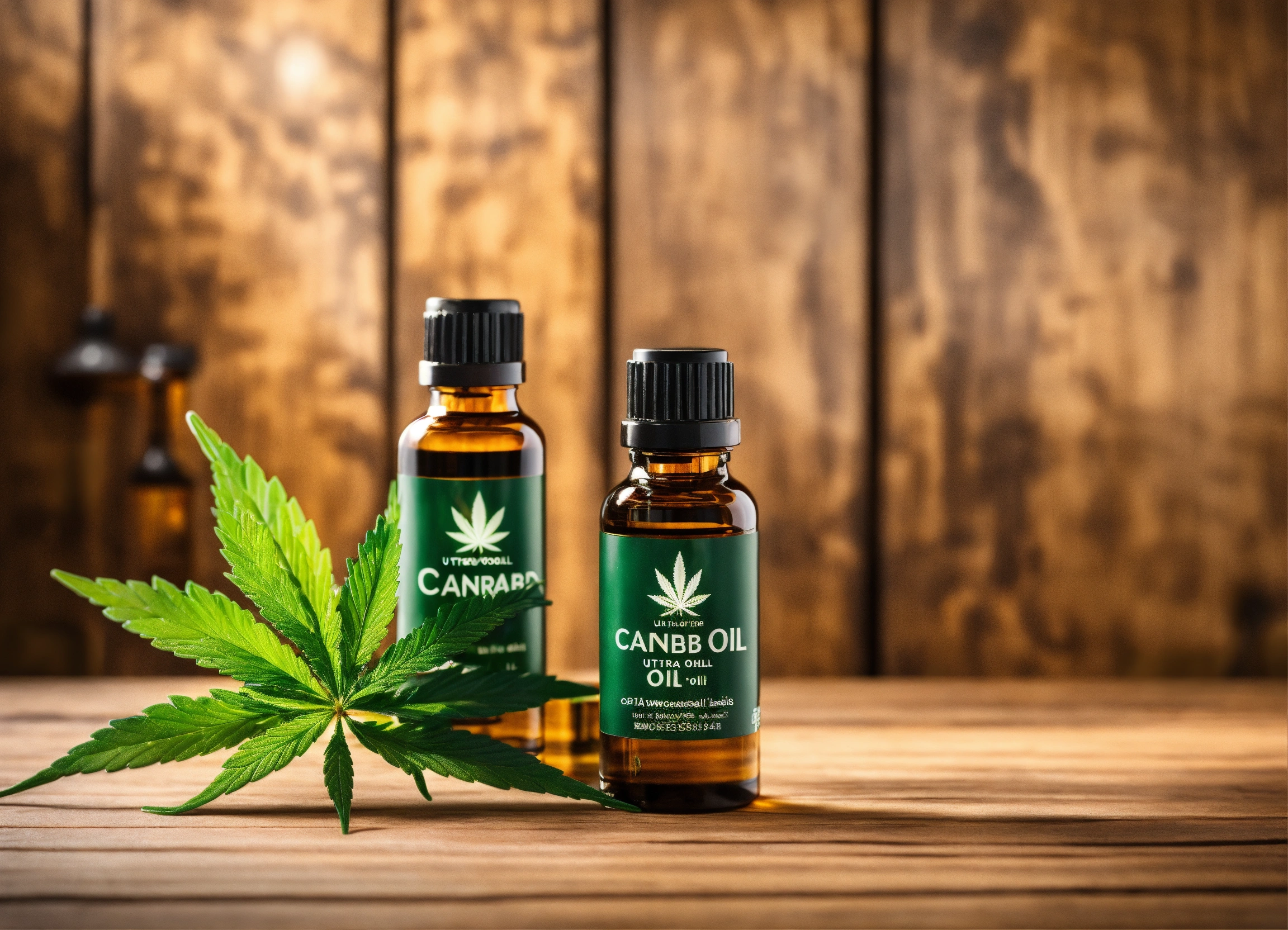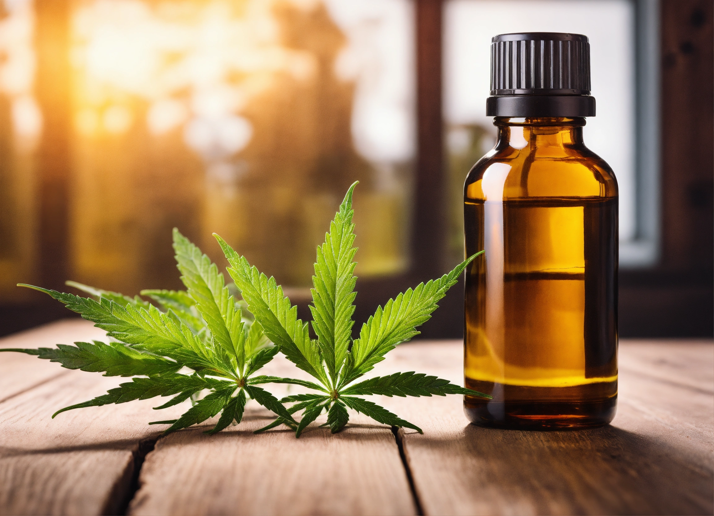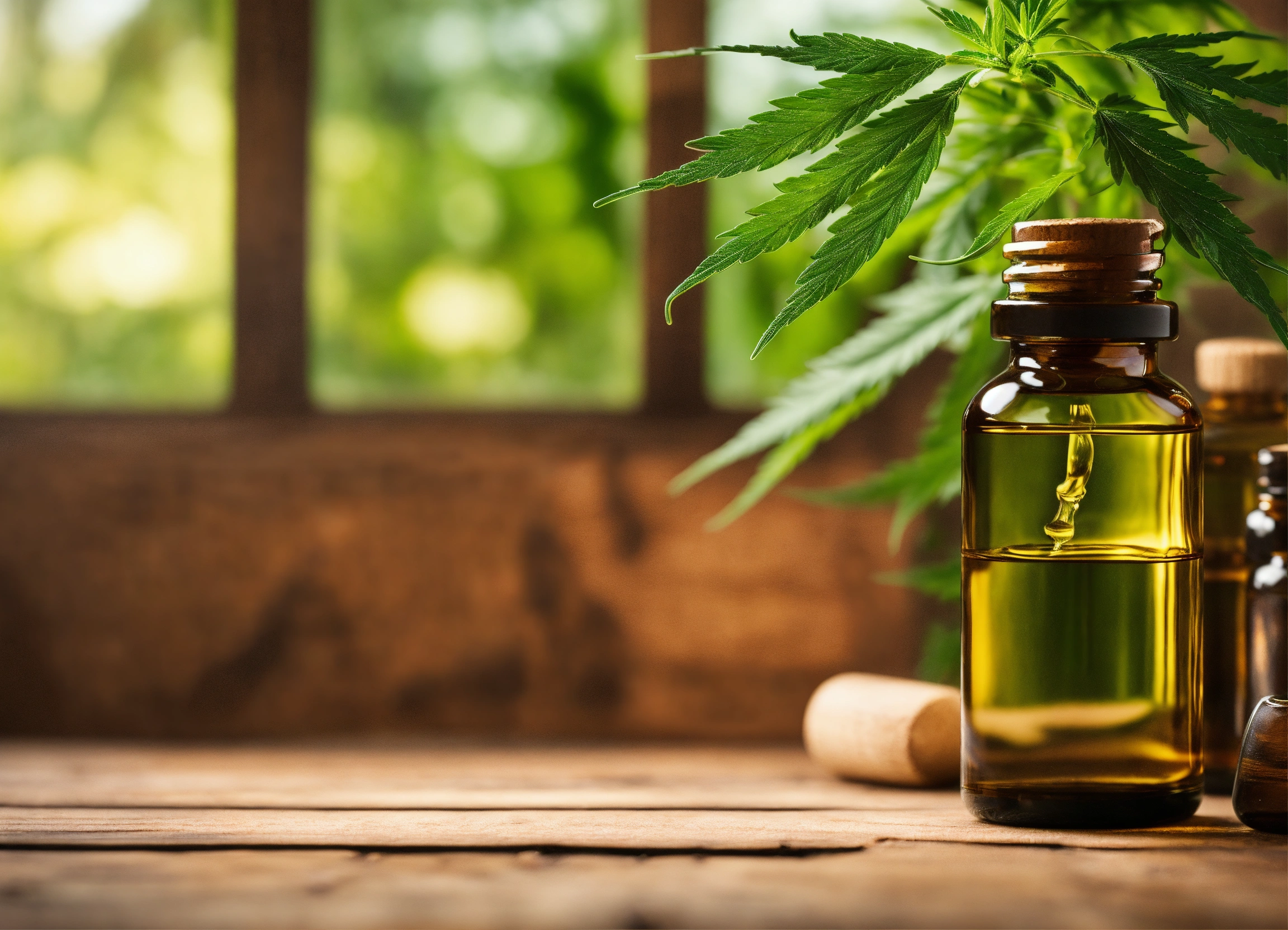 Create a ultra realistic photo of cannabis oil bottles standing on a wooden table, cannabis leaves are on the table in front of the oil. in the out of focus background you can see wood panels. a medium shot natural light, product photography, ultra realistic