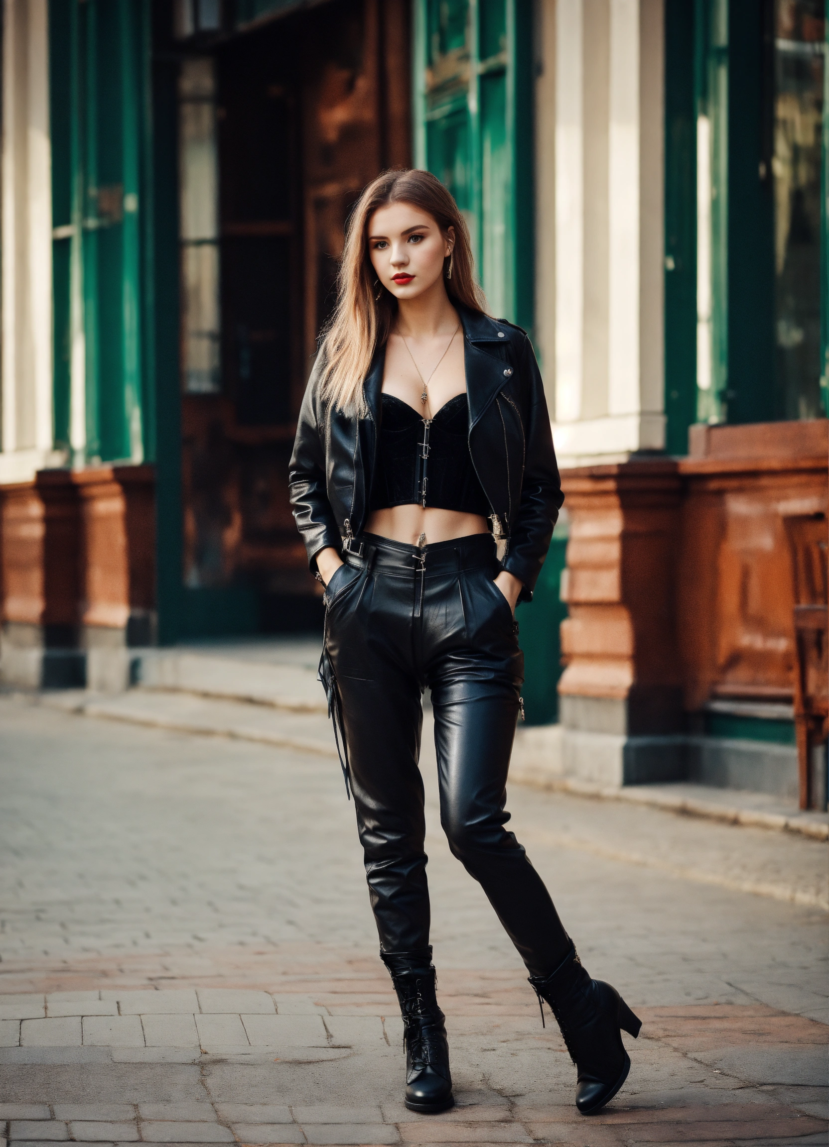 A 20 year old polish female fashion blogger wearing a black leather jacket and gloves and corset and pants, juwelry, urban enviroment full body walking