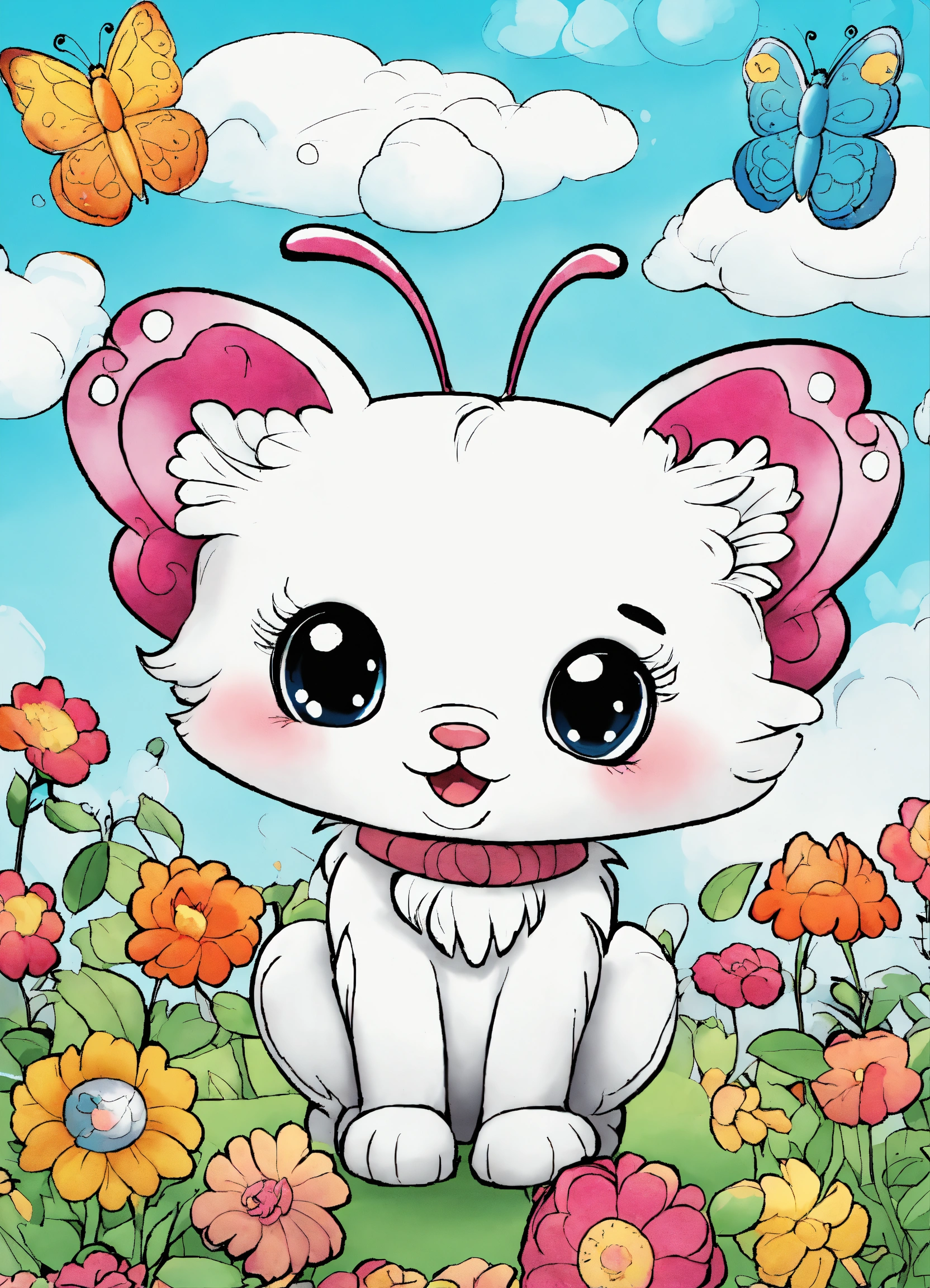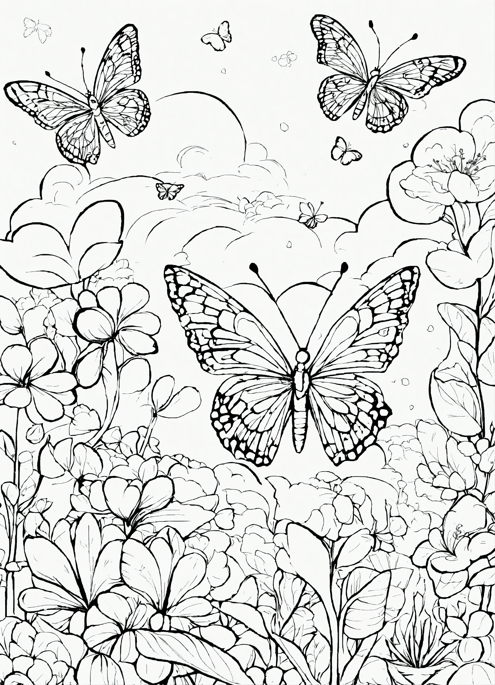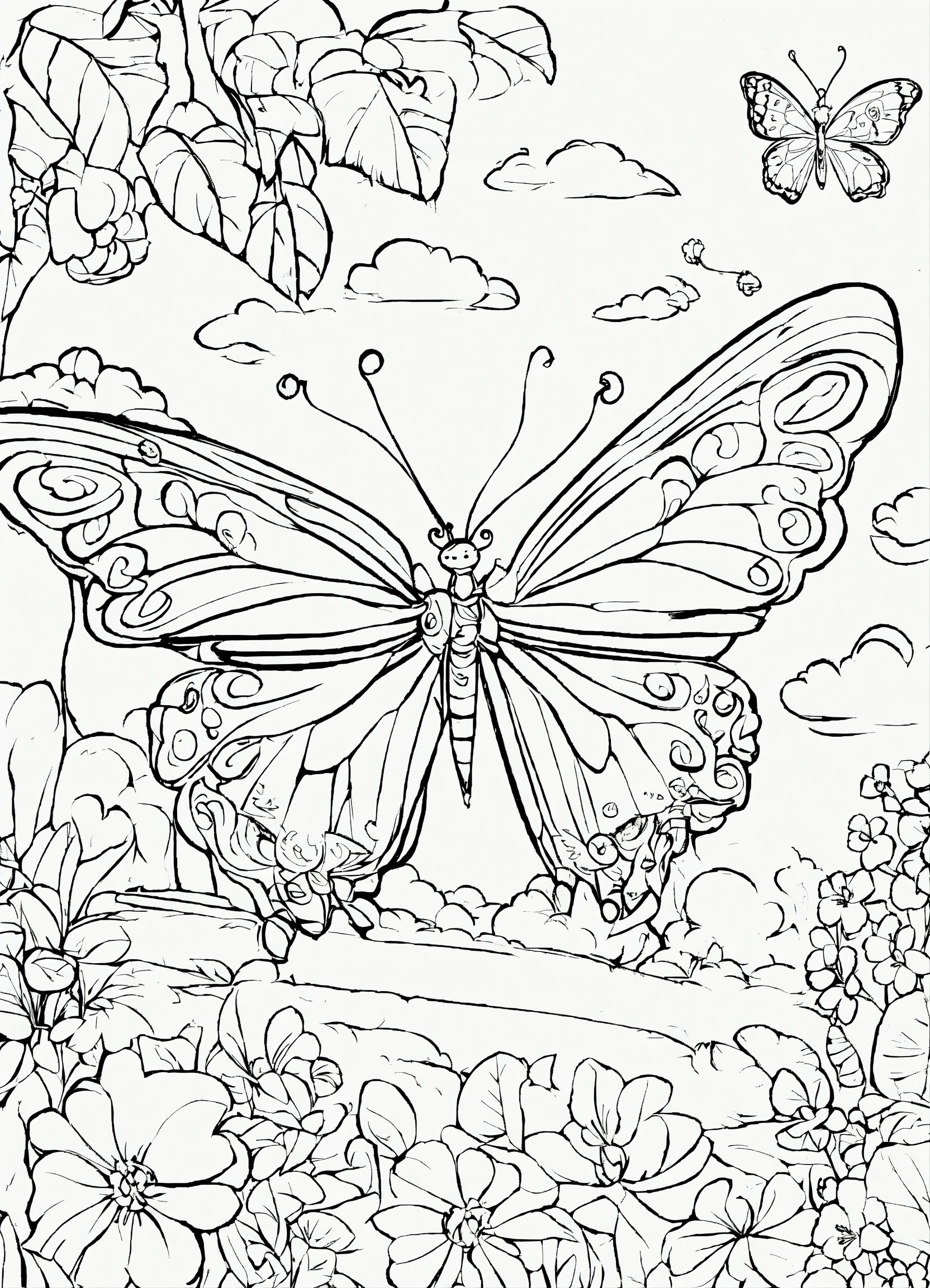 "cute coloring pages of cute cartoon butterfly animal, beautiful, childlike style, entirely white, white background, full body, sketch style, playful style, happy children, different poses and locations, playing, place items in the background, such as trees or flowers, clouds."
