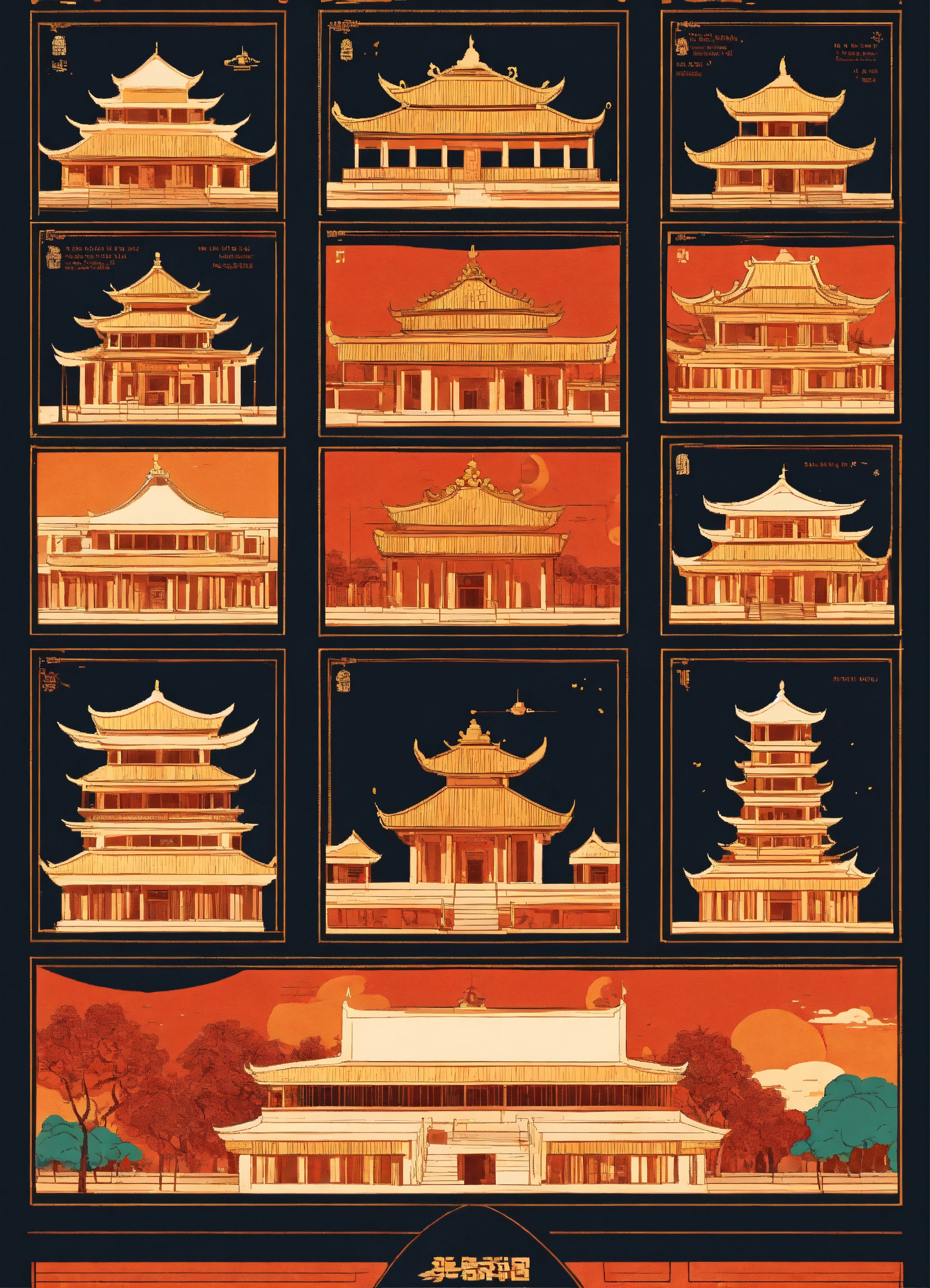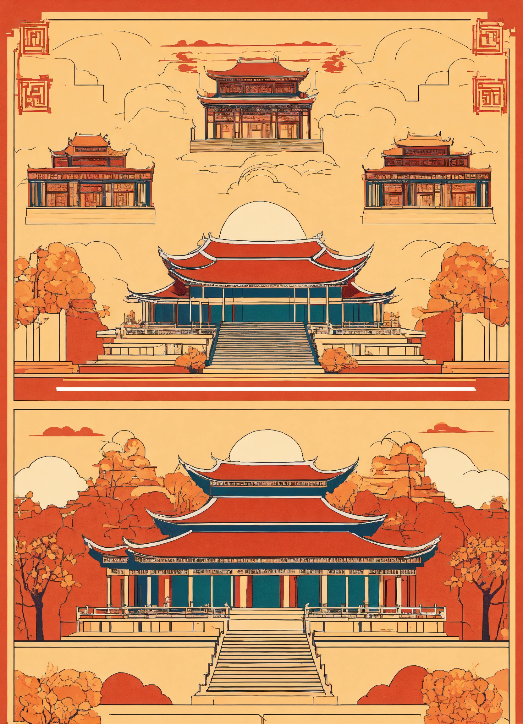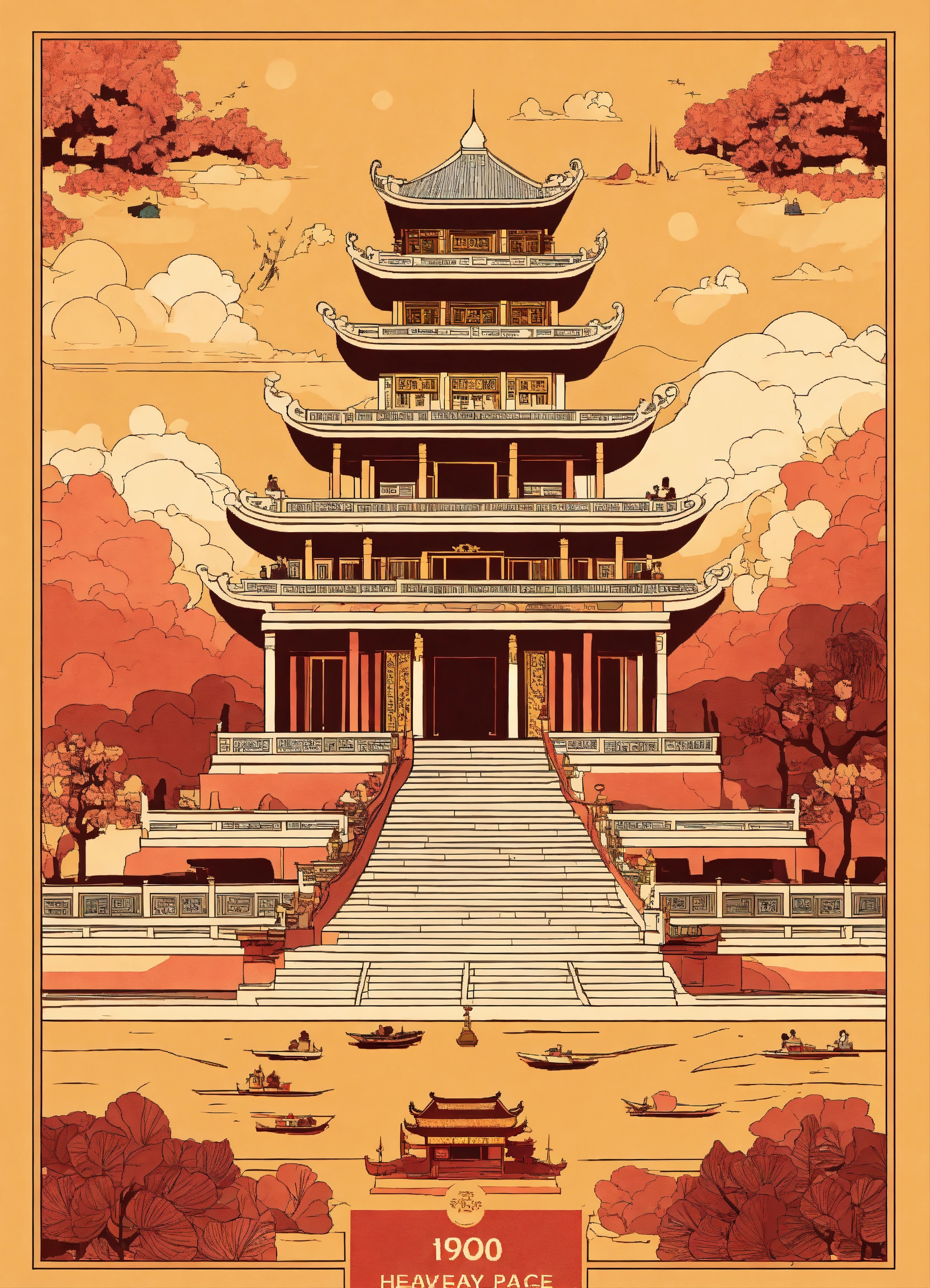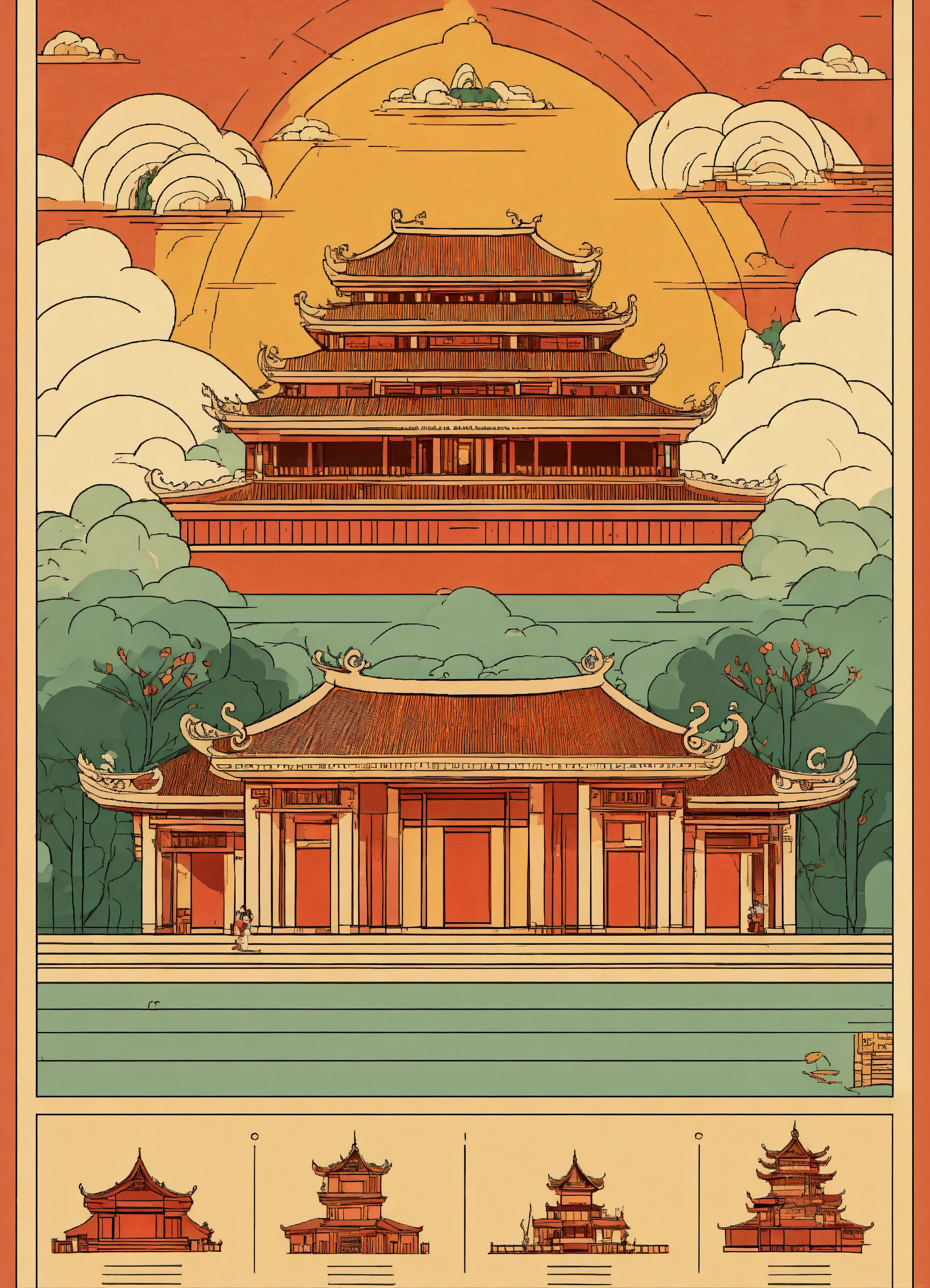 Beautiful award winning 1950s simple flat 2d thin line art editorial infographics of the ancient vietnamese heavenly palace