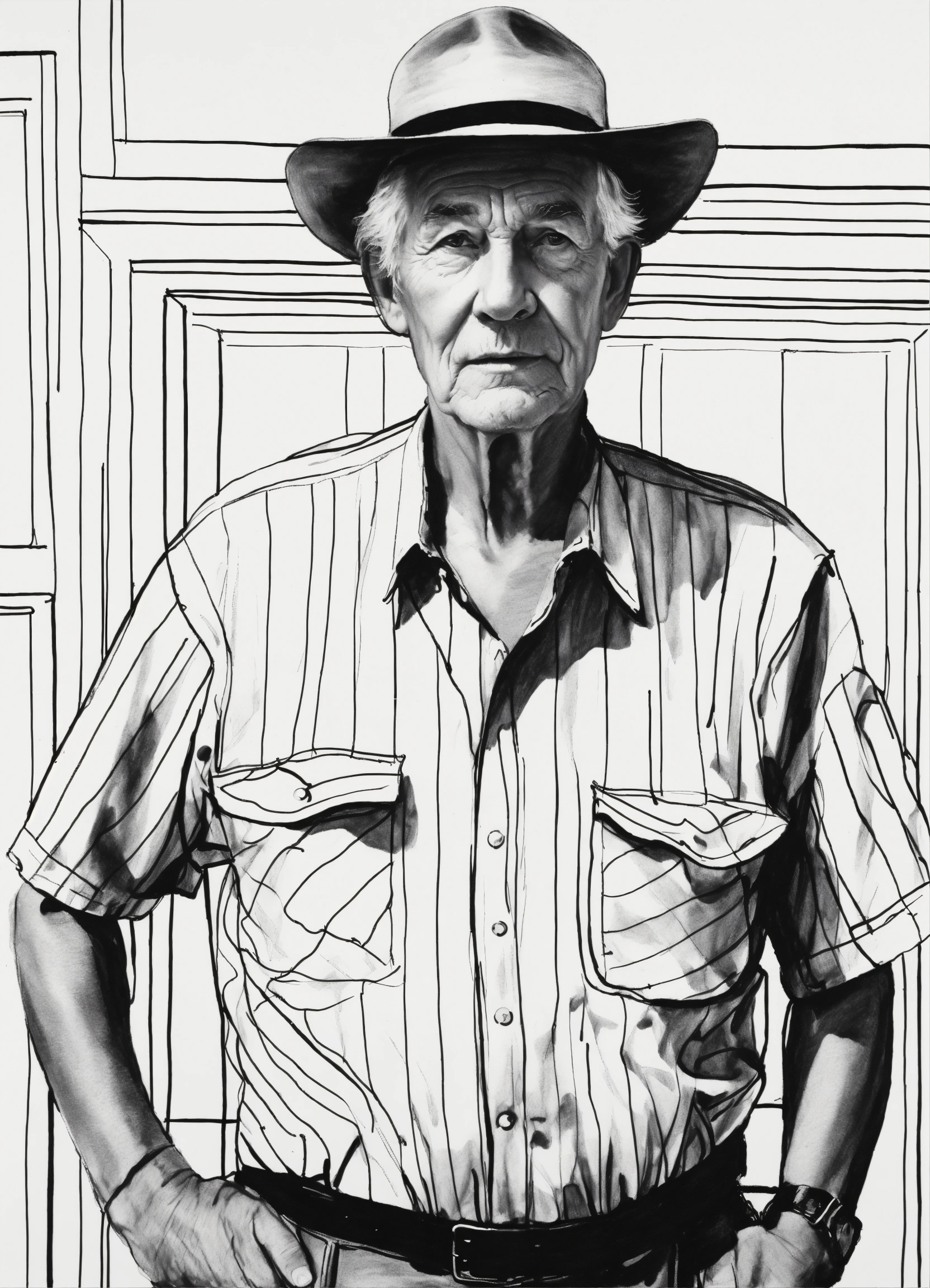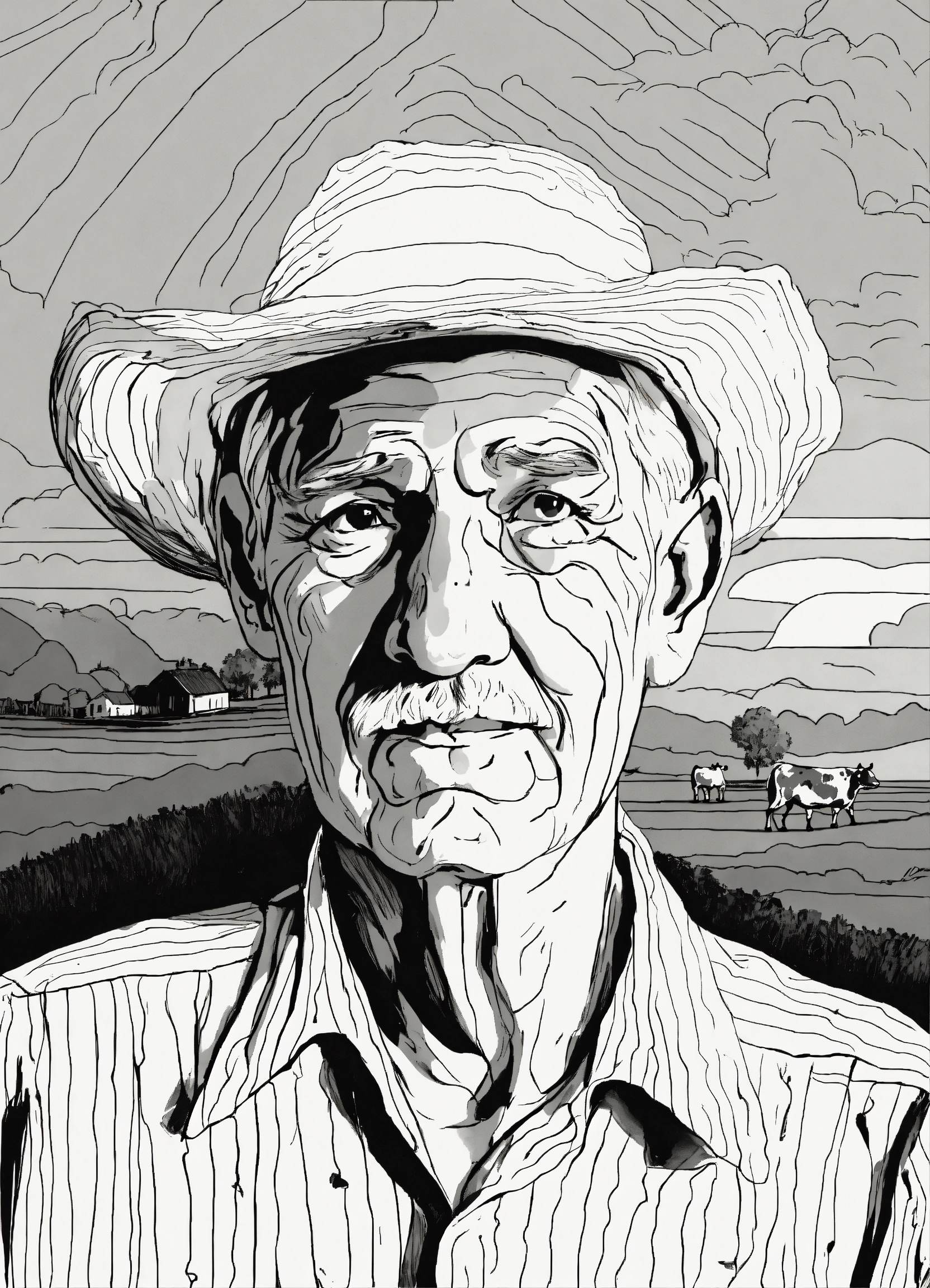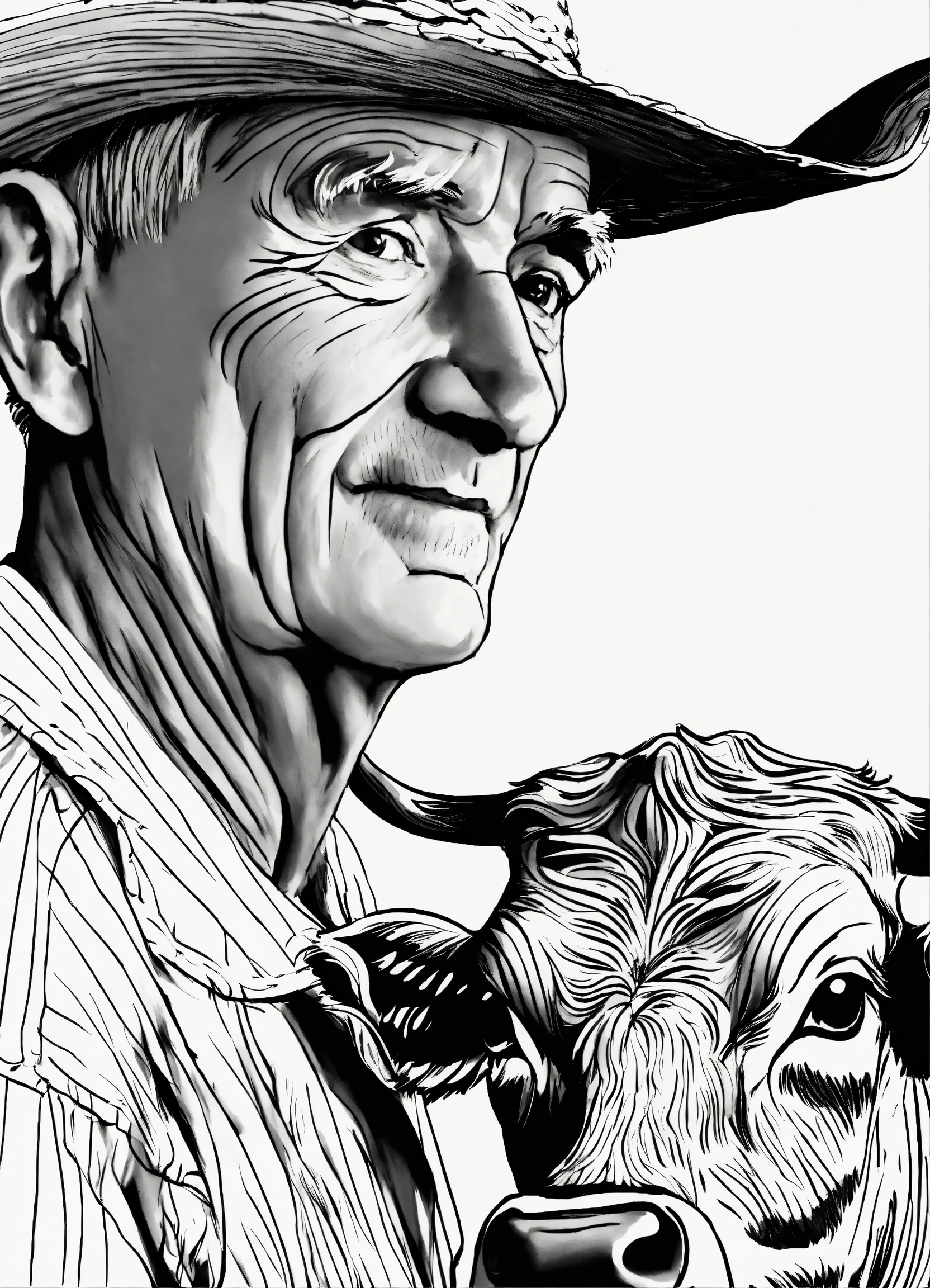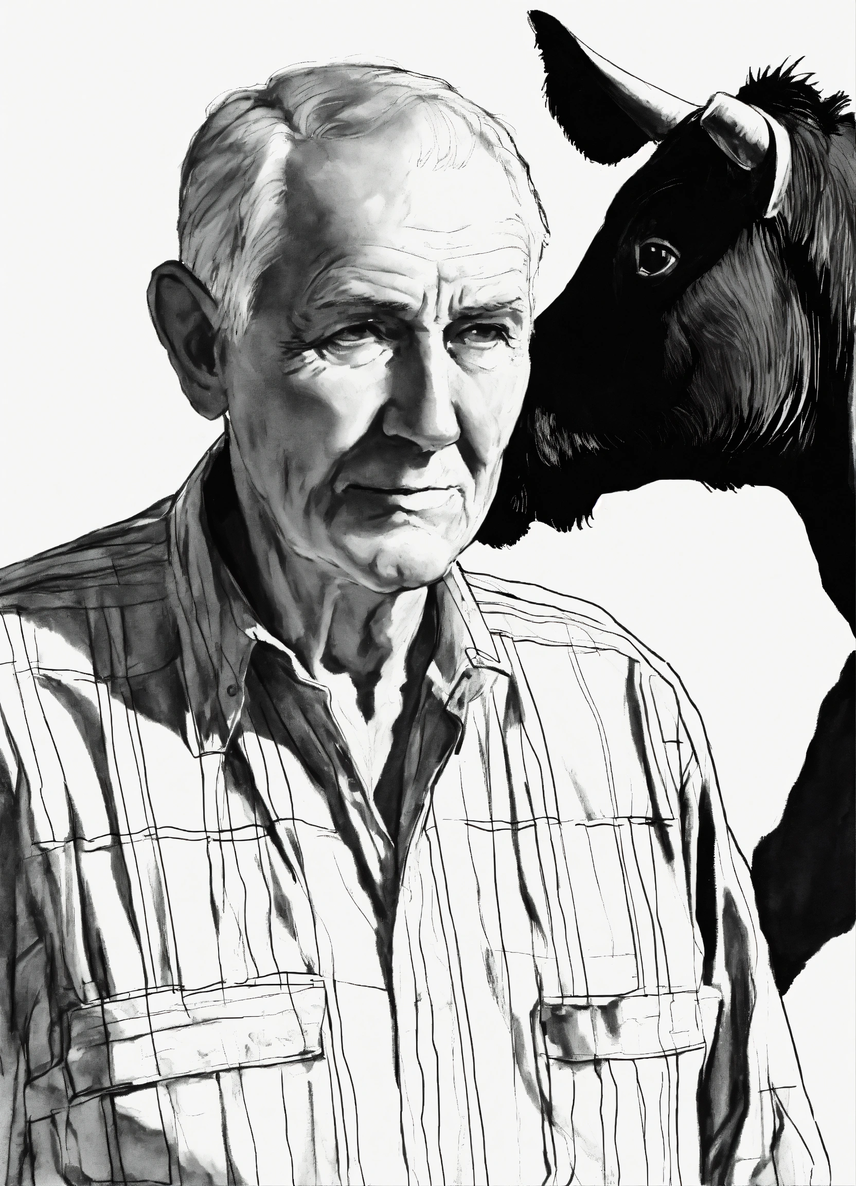 Black and white bold line drawing, older man, with cow, upper body, lines, shoulders, white background, kentucky