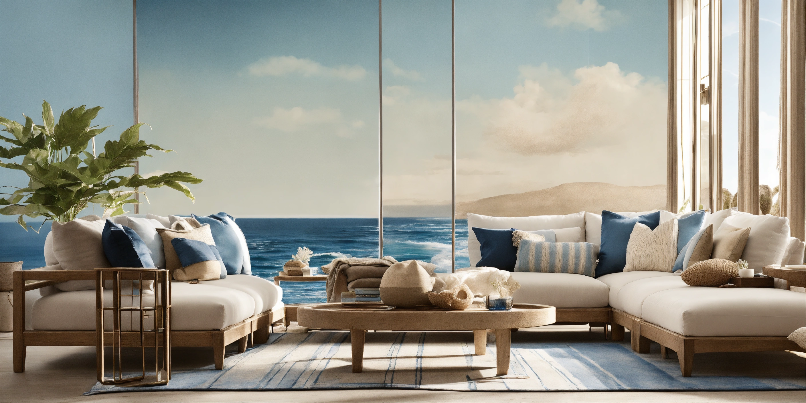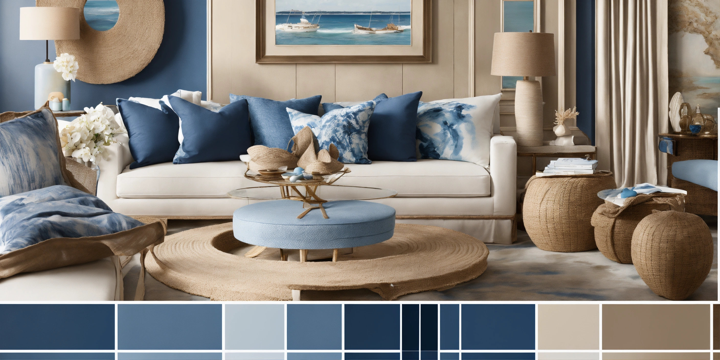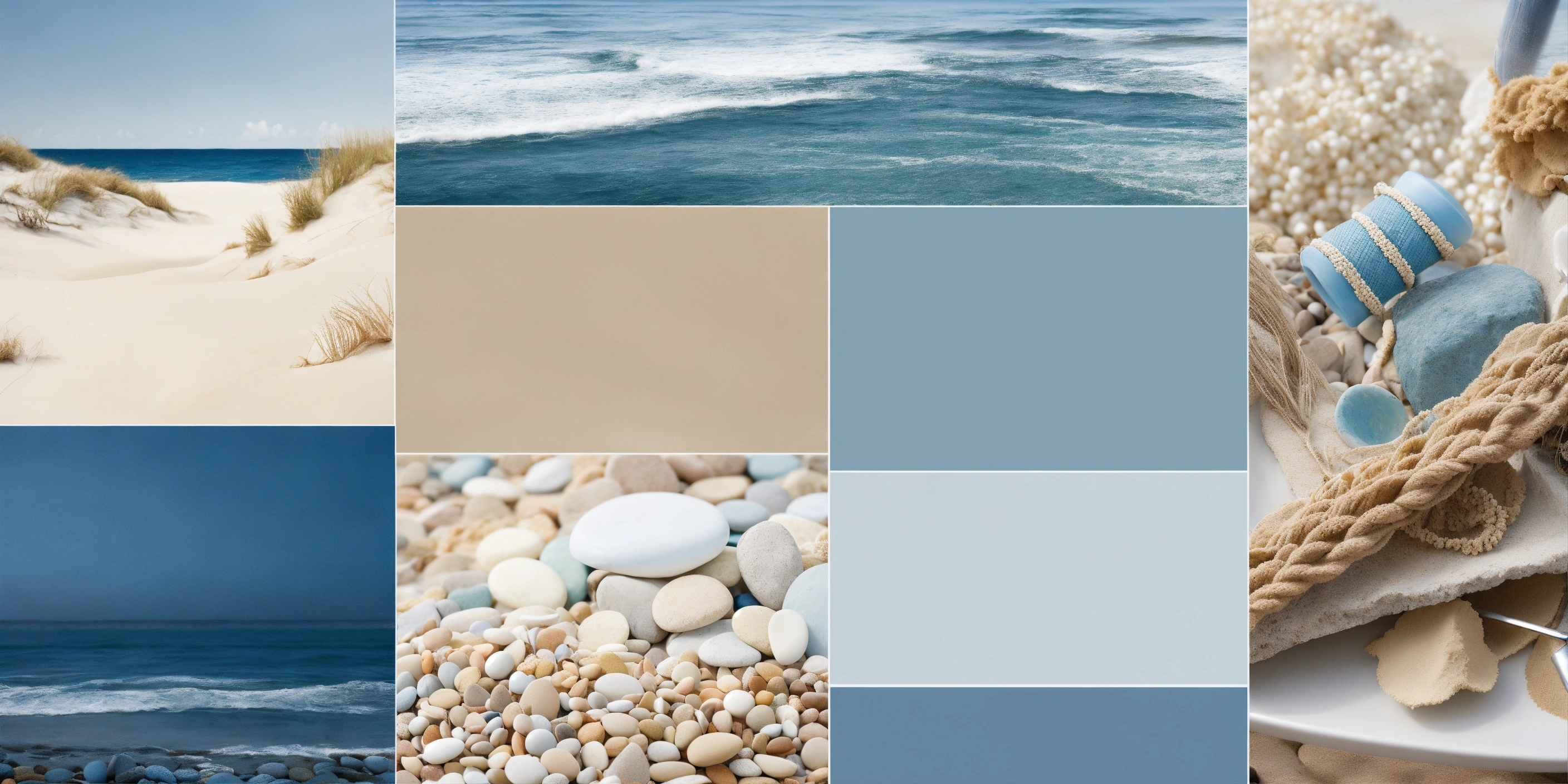 Hyper-realistic paint color palette luxury interior design board varying blues and whites and sandy neutrals and beach elements, fabric swatches, and maritime elements.