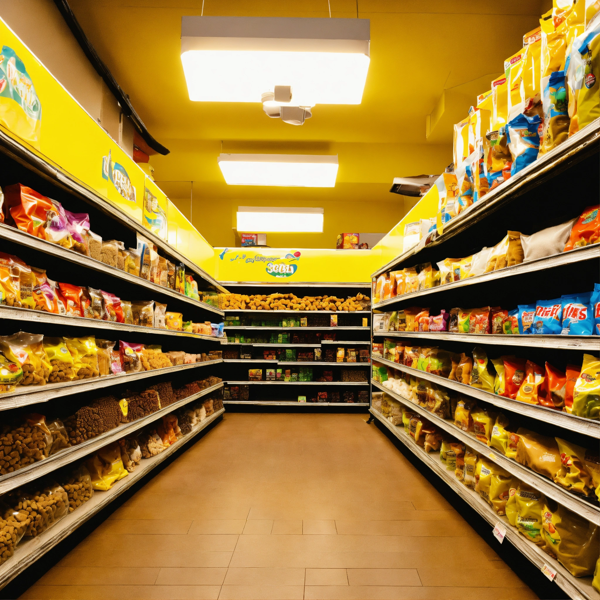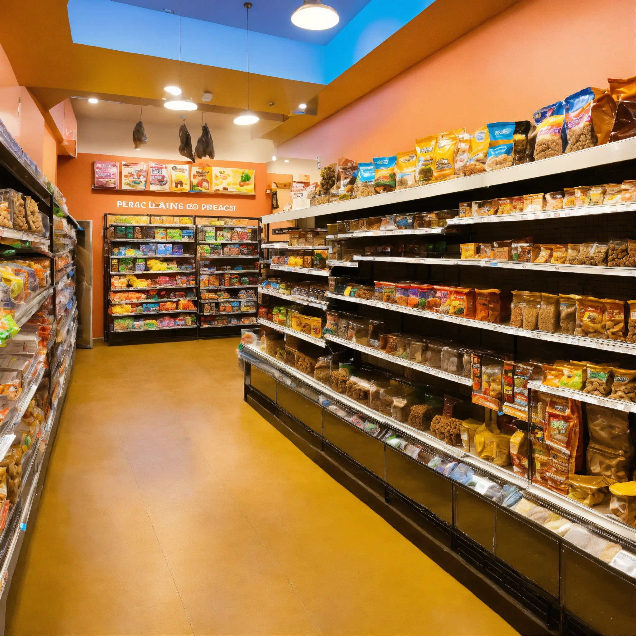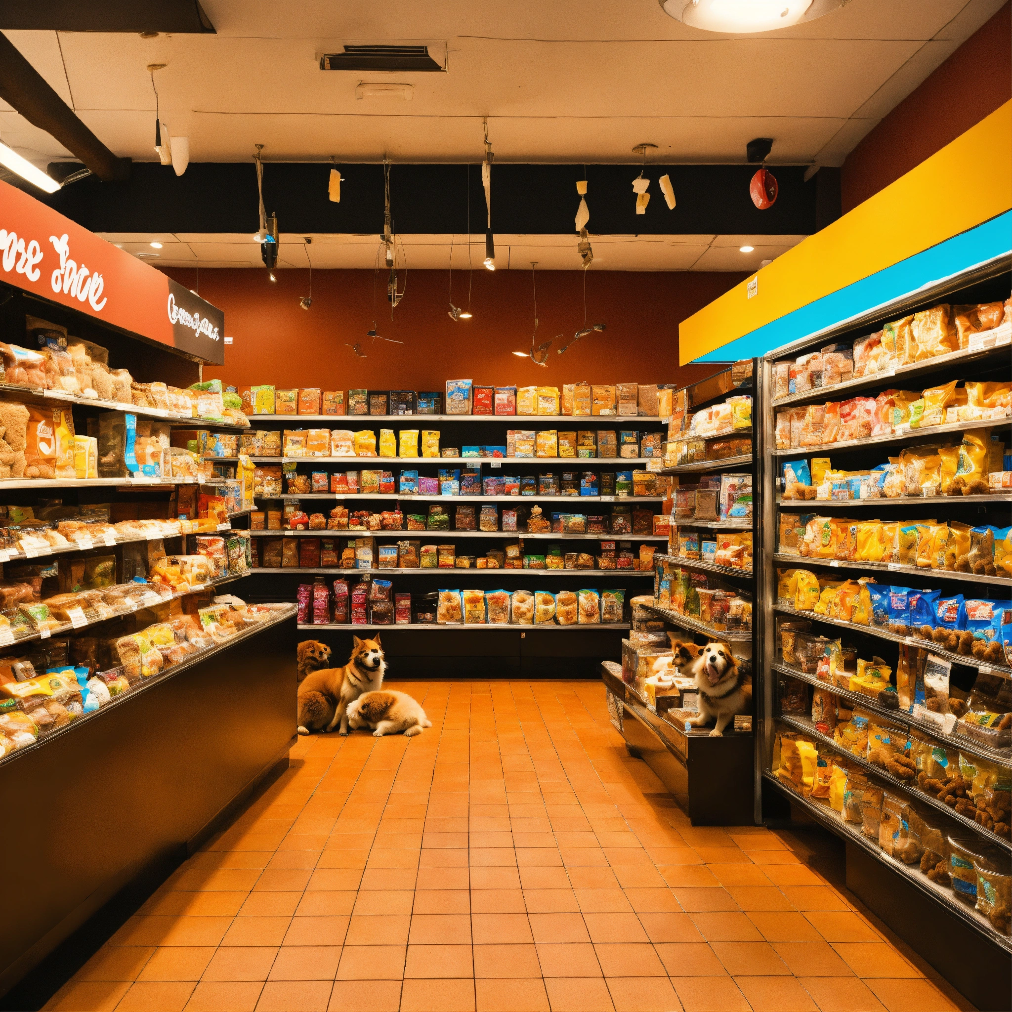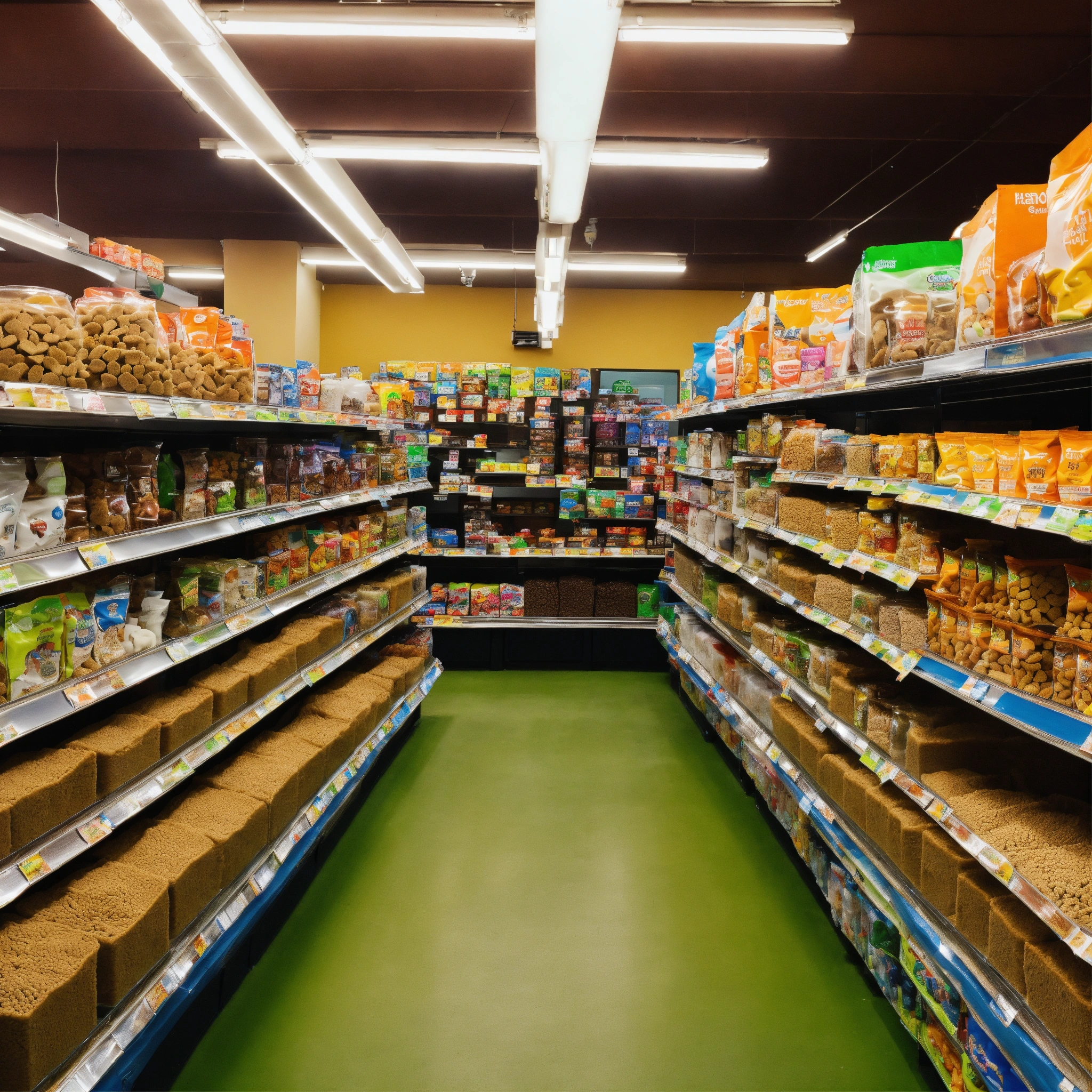 A photo of a pet store with a variety of pet food and treats. the store should be well-organized and clean, and the products should be displayed in an appealing way.