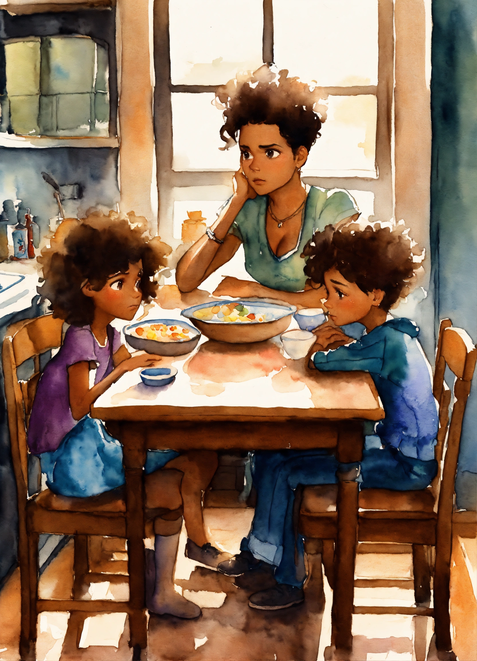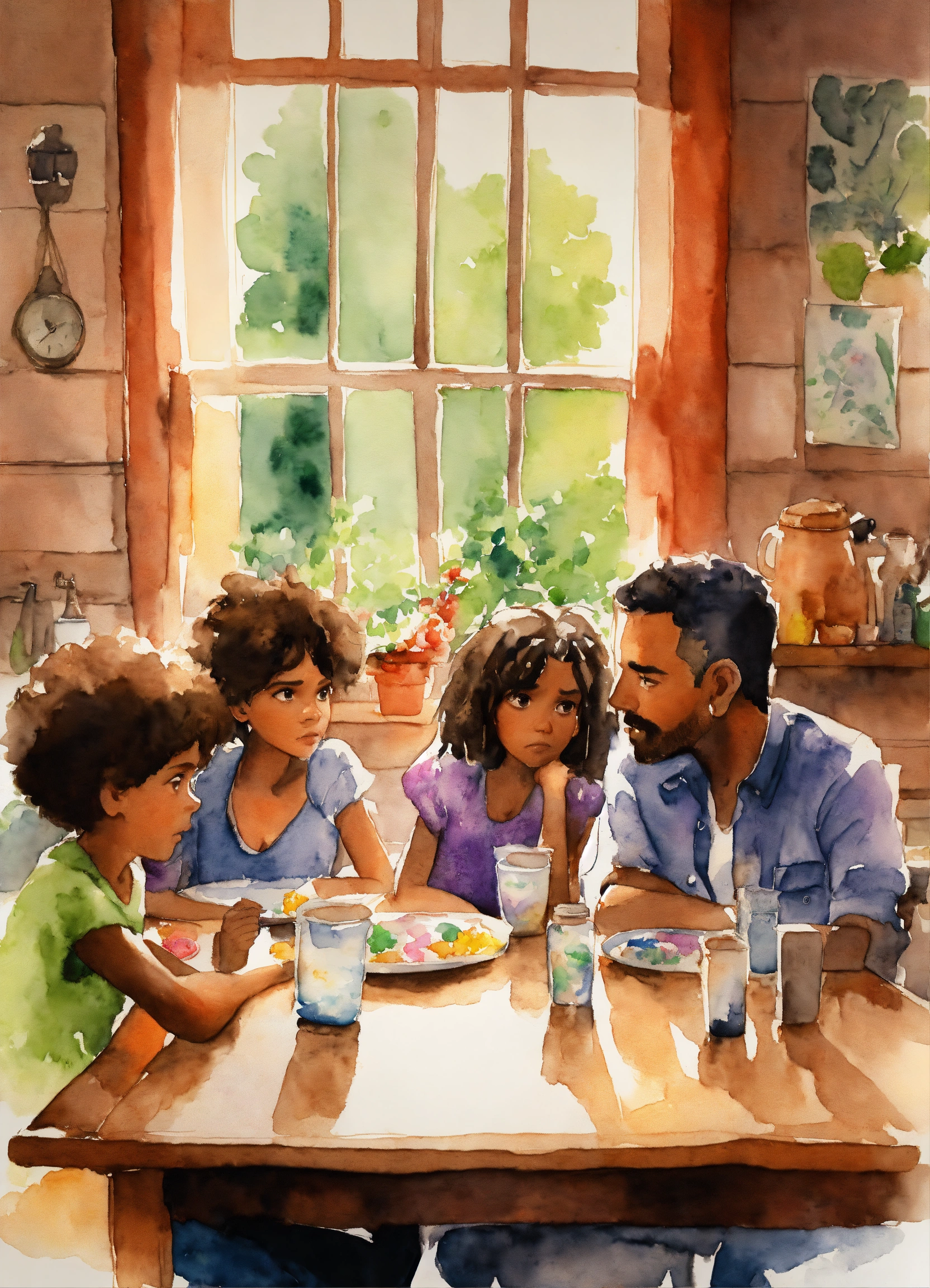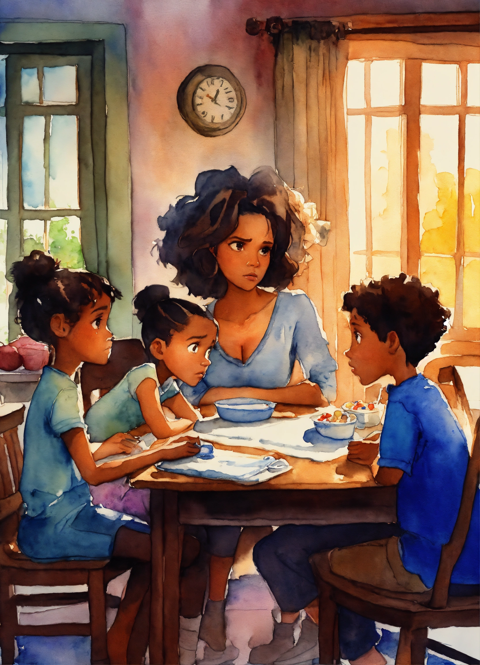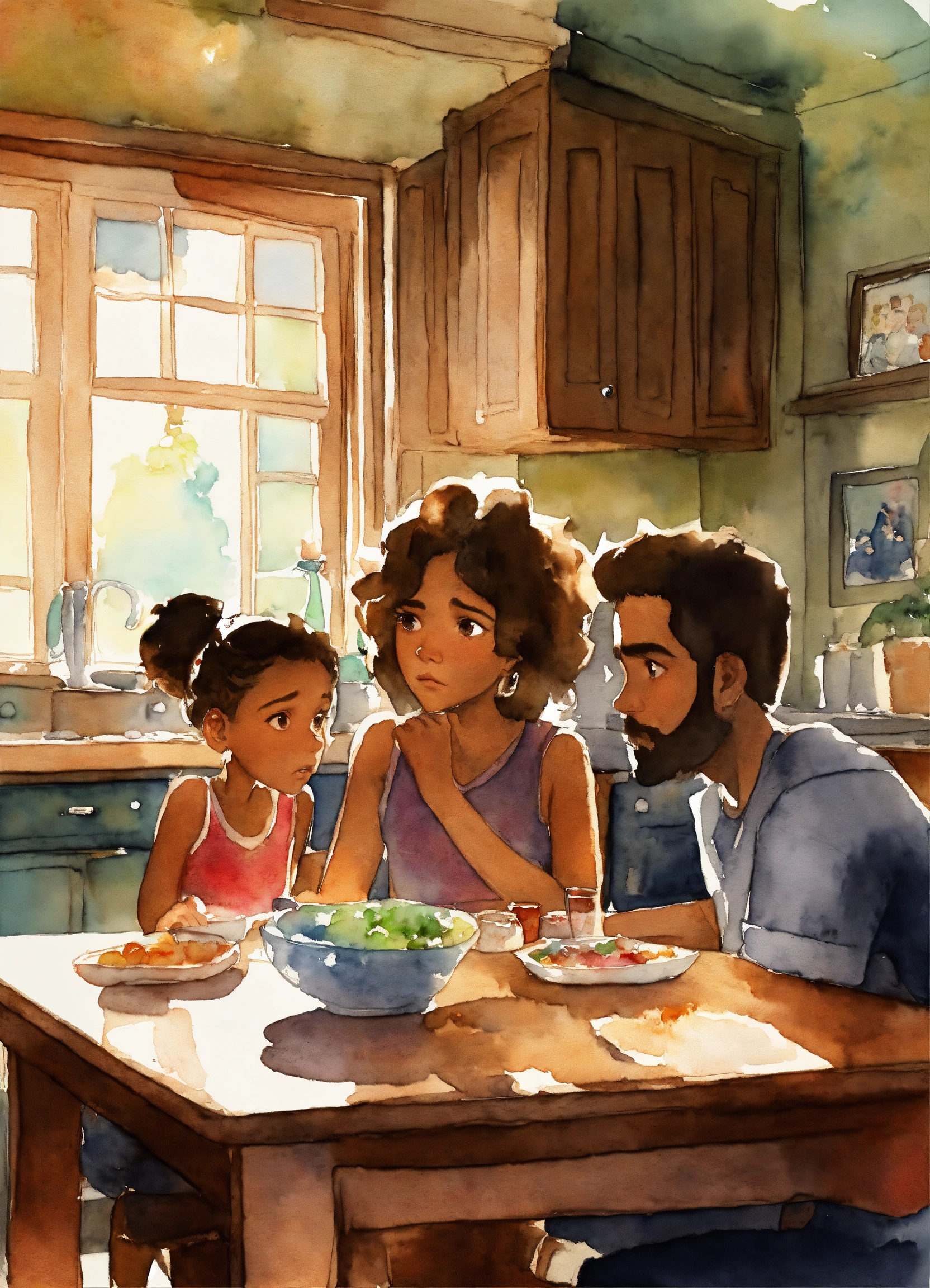 Watercolor pixar painting of 8 year old halle berry and her family gathered at the kitchen table, looking concerned their faces etched with worry, watercolor pixar style cartoon