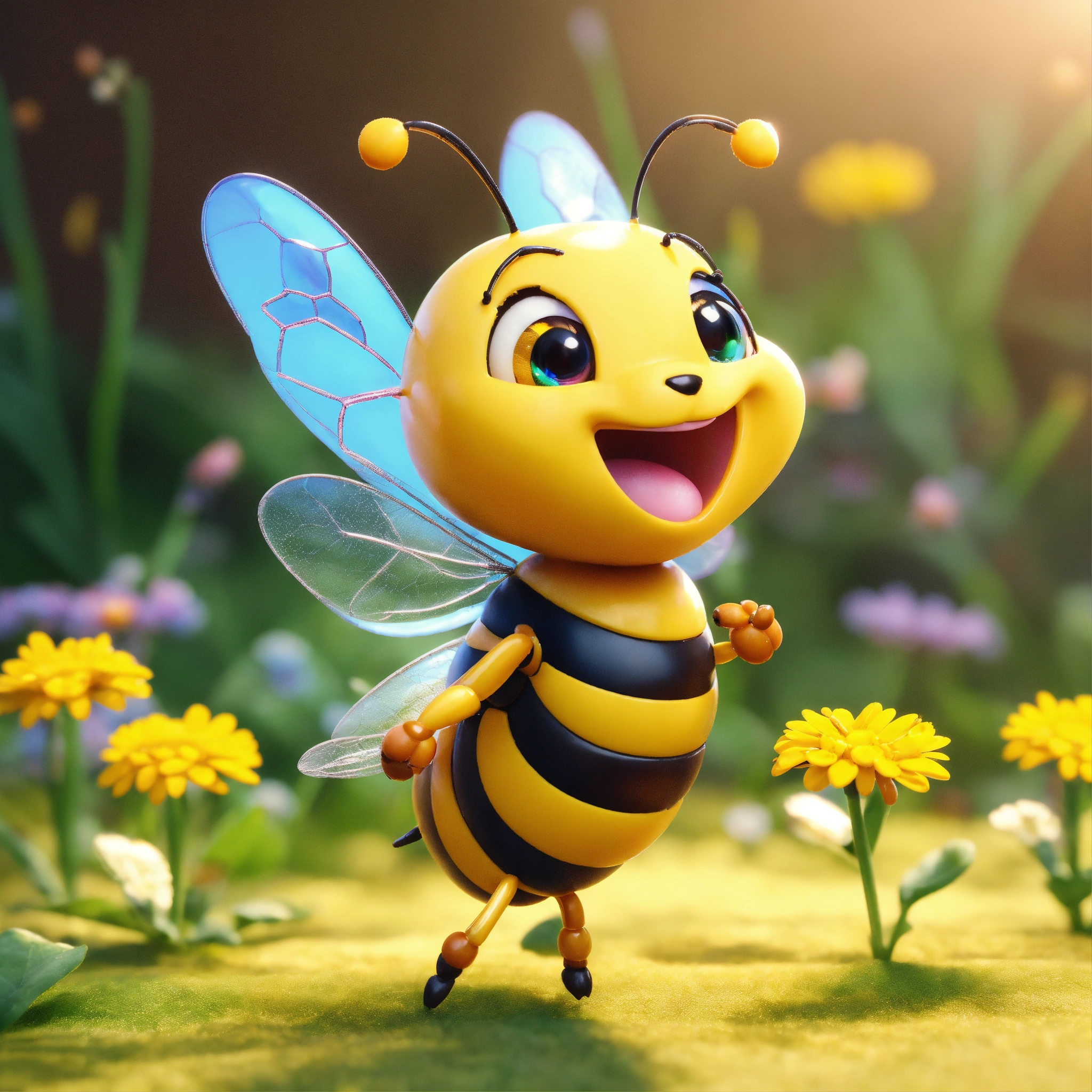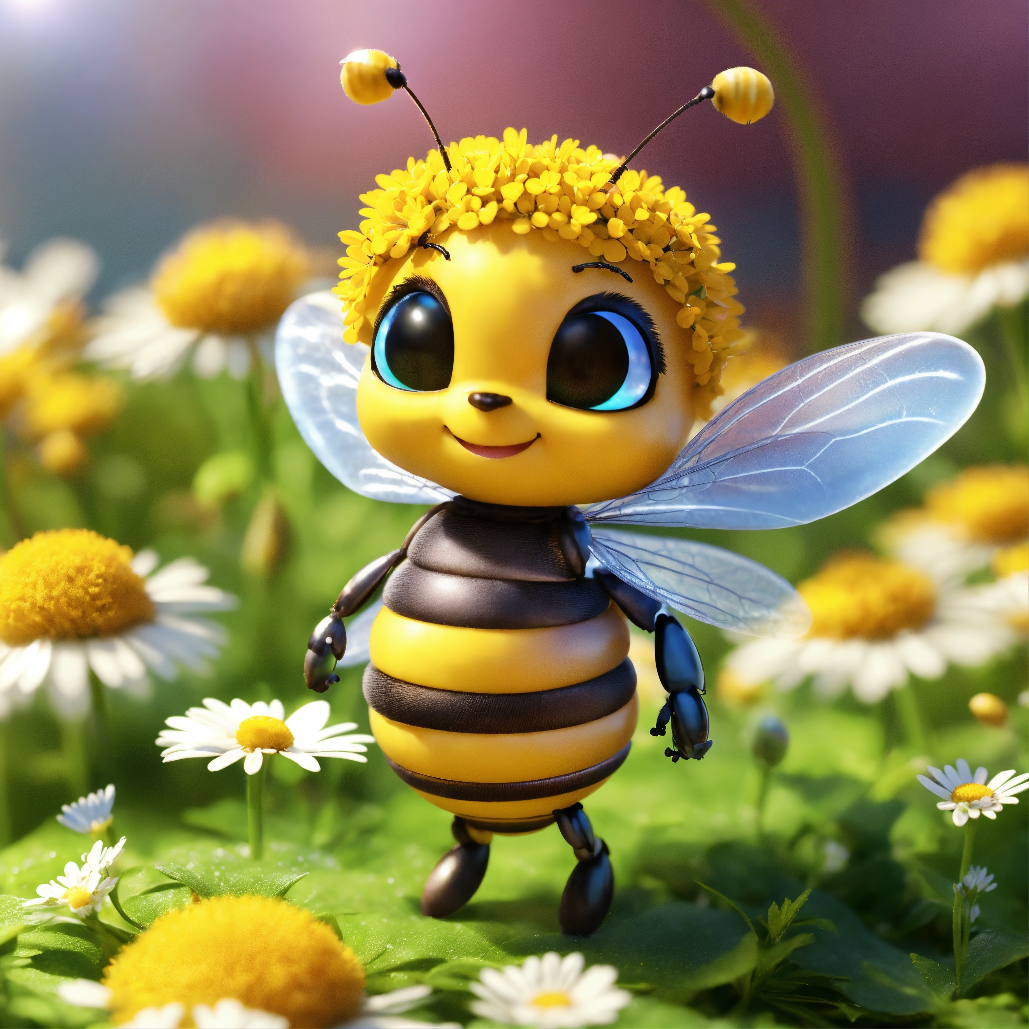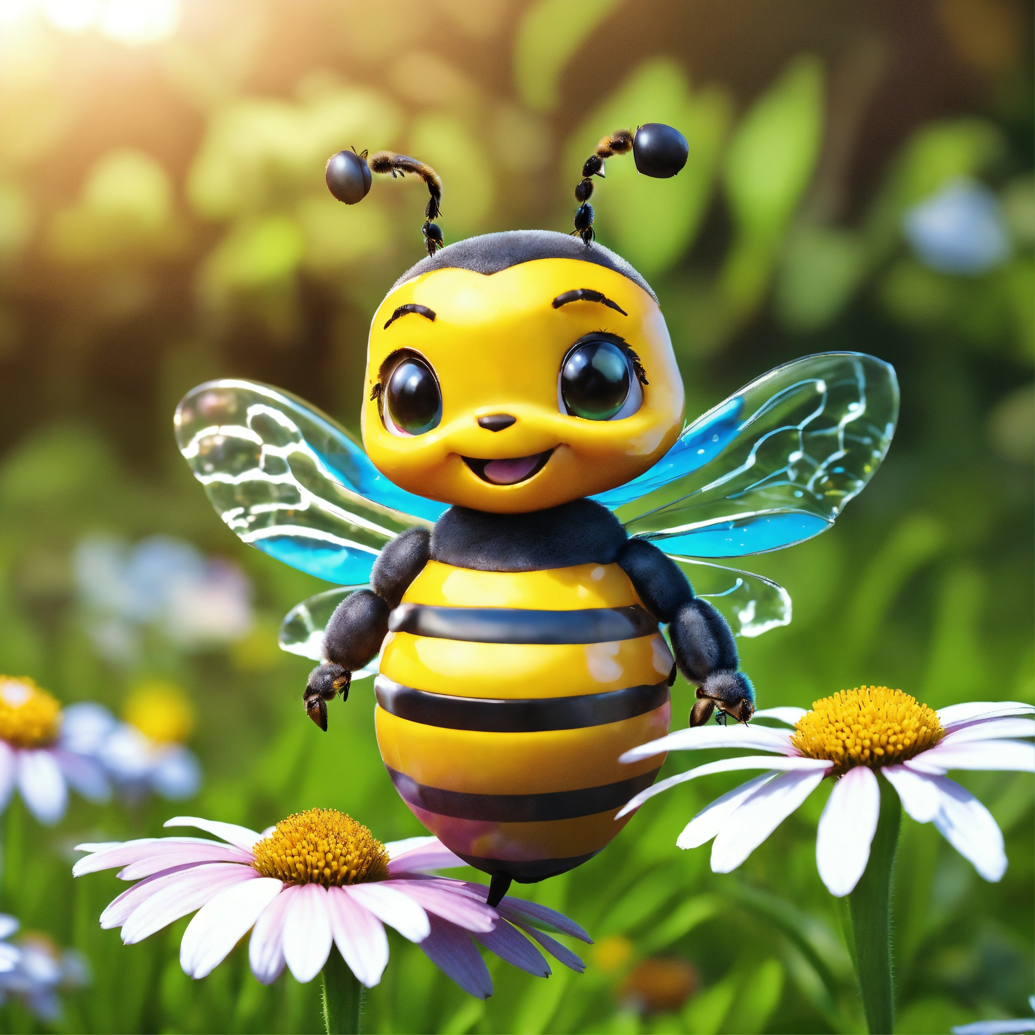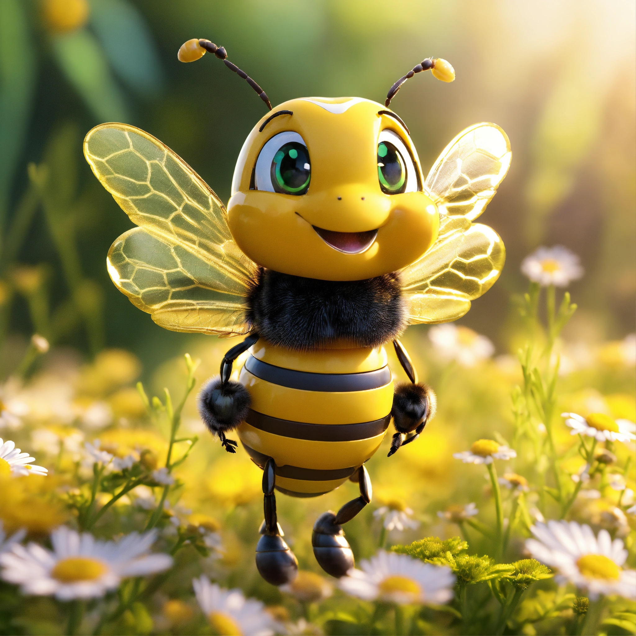4d photographic image of full body image of a cute little chibi bee realistic, buzzing around daisies, vivid colors octane render trending on artstation, artistic photography, photorealistic concept art, soft natural volumetric cinematic perfect light, uhd no background