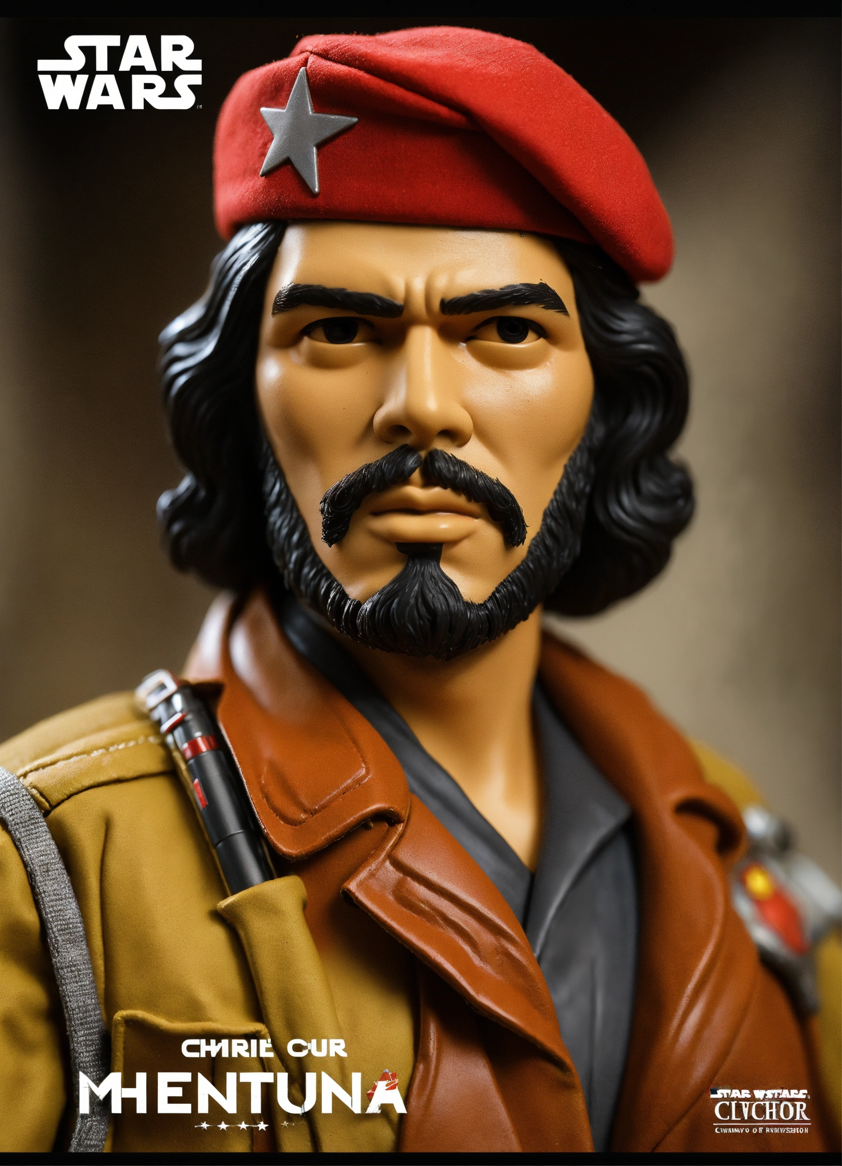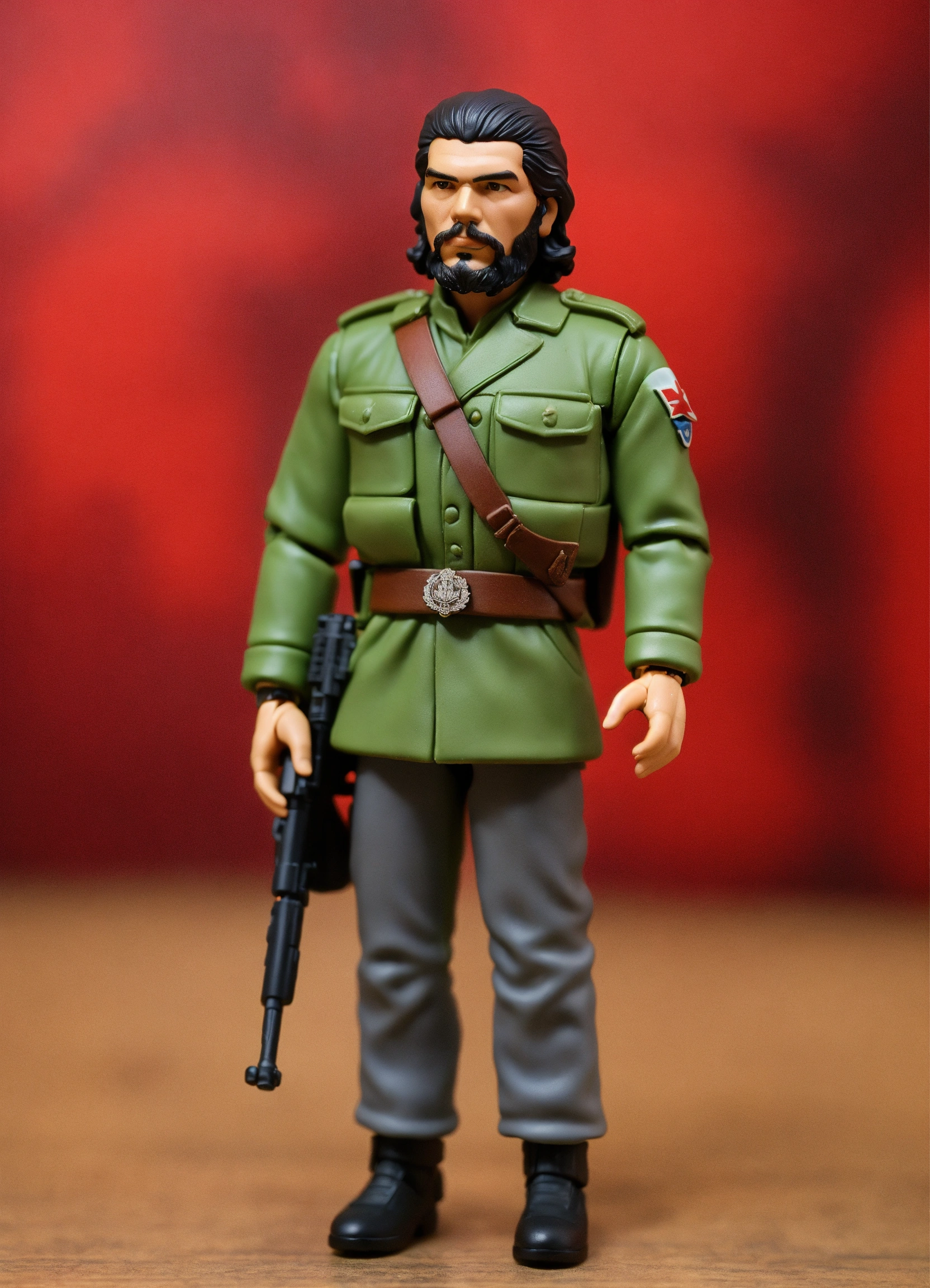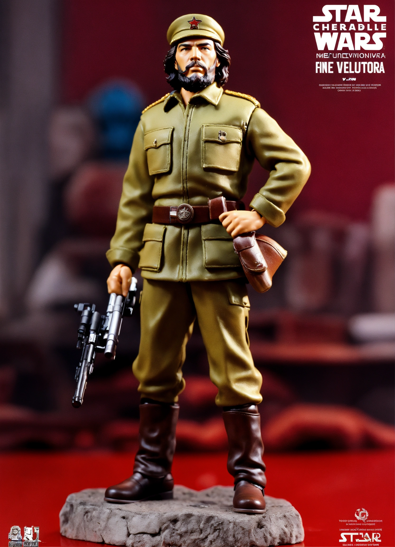 Design an action figure toy inspired by the collectible star wars toys, specifically, featuring the iconic che guevara. the toy should intricately capture che's essence and historical significance, incorporating fine details such as his iconic beret wit red star, beard, and determined gaze. emulate the high-quality craftsmanship and attention to detail seen in star wars 70's style collectibles to ensure that this action figure stands out as a premium collector's item. the primary goal is to create a meticulously designed and visually stunning toy that not only pays homage to che guevara but also conveys a powerful message of revolution and social change. this action figure should be a must-have item for collectors and a conversation starter for anyone interested in the historical and cultural impact of che guevara.