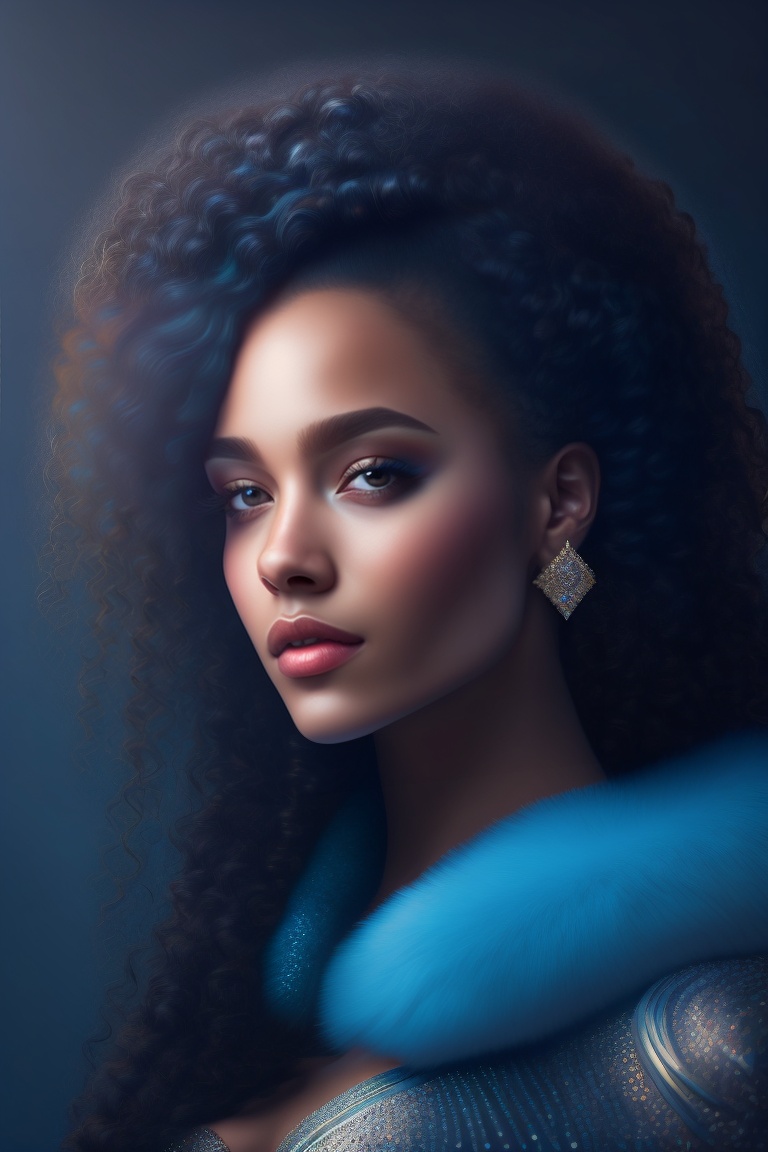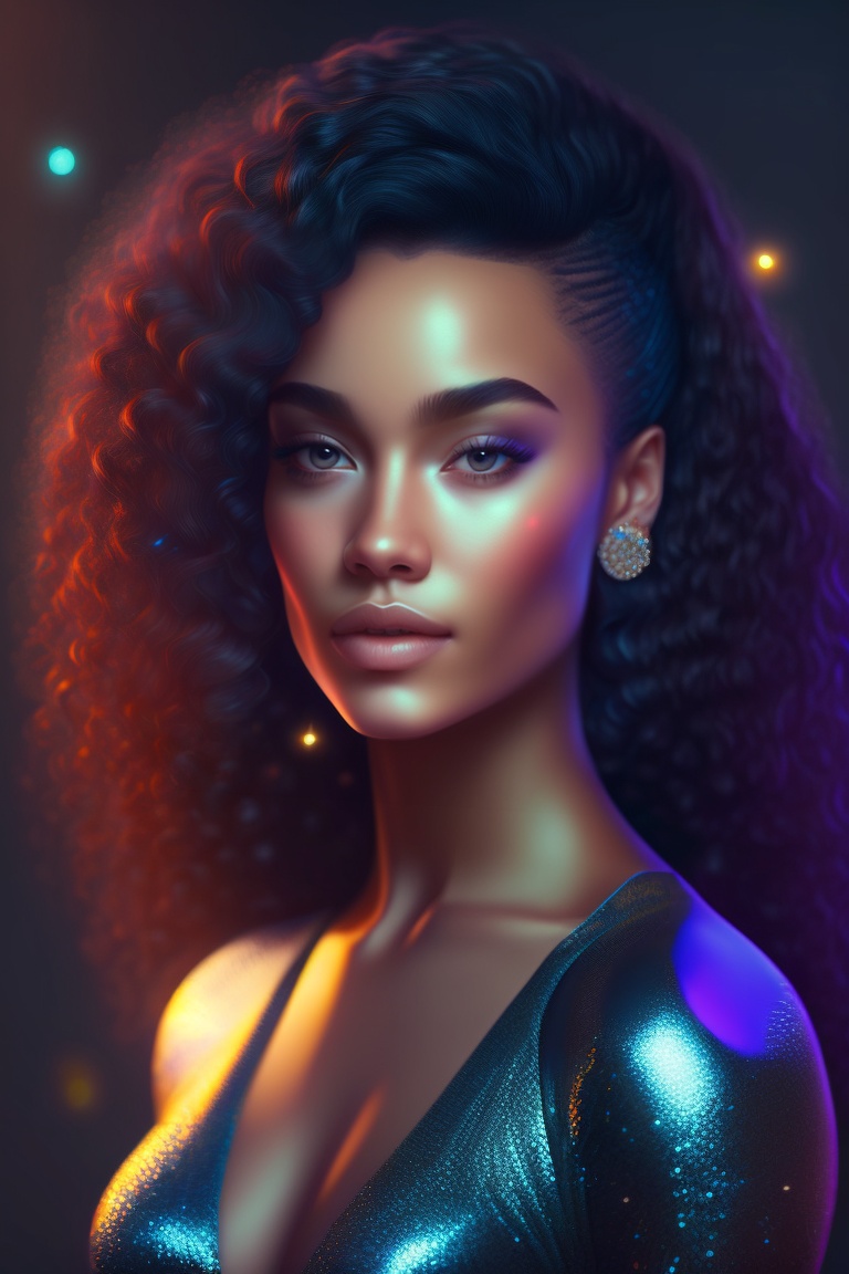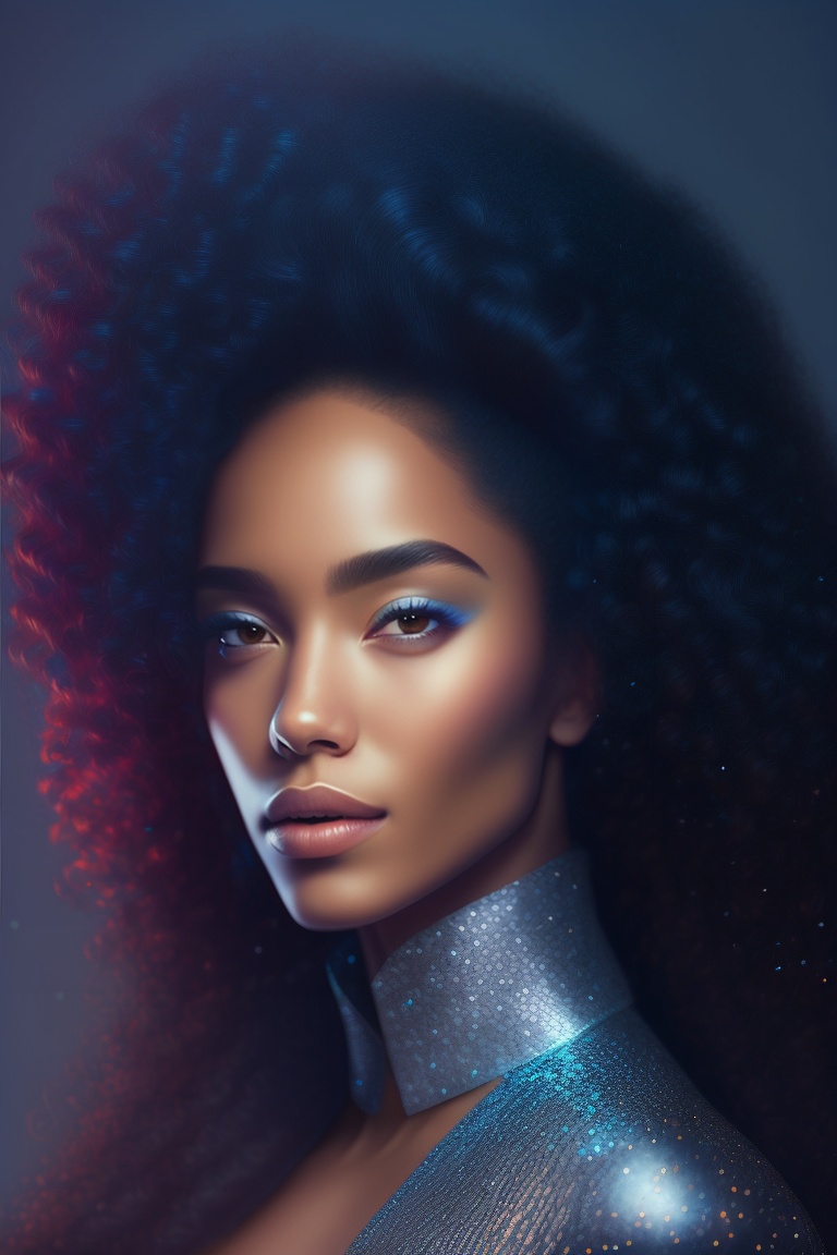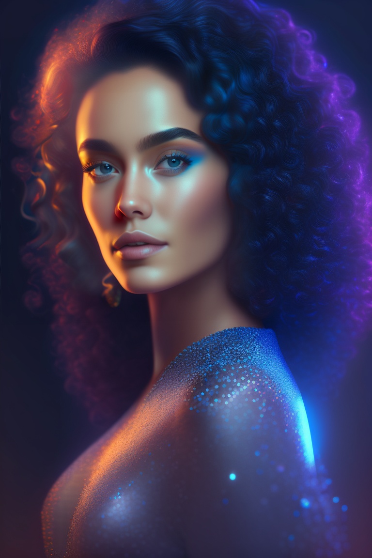 Portrait of a magnificent women, with some glitter in her dark long currly hair, ligth eyebrows and light skin. blue ambient light