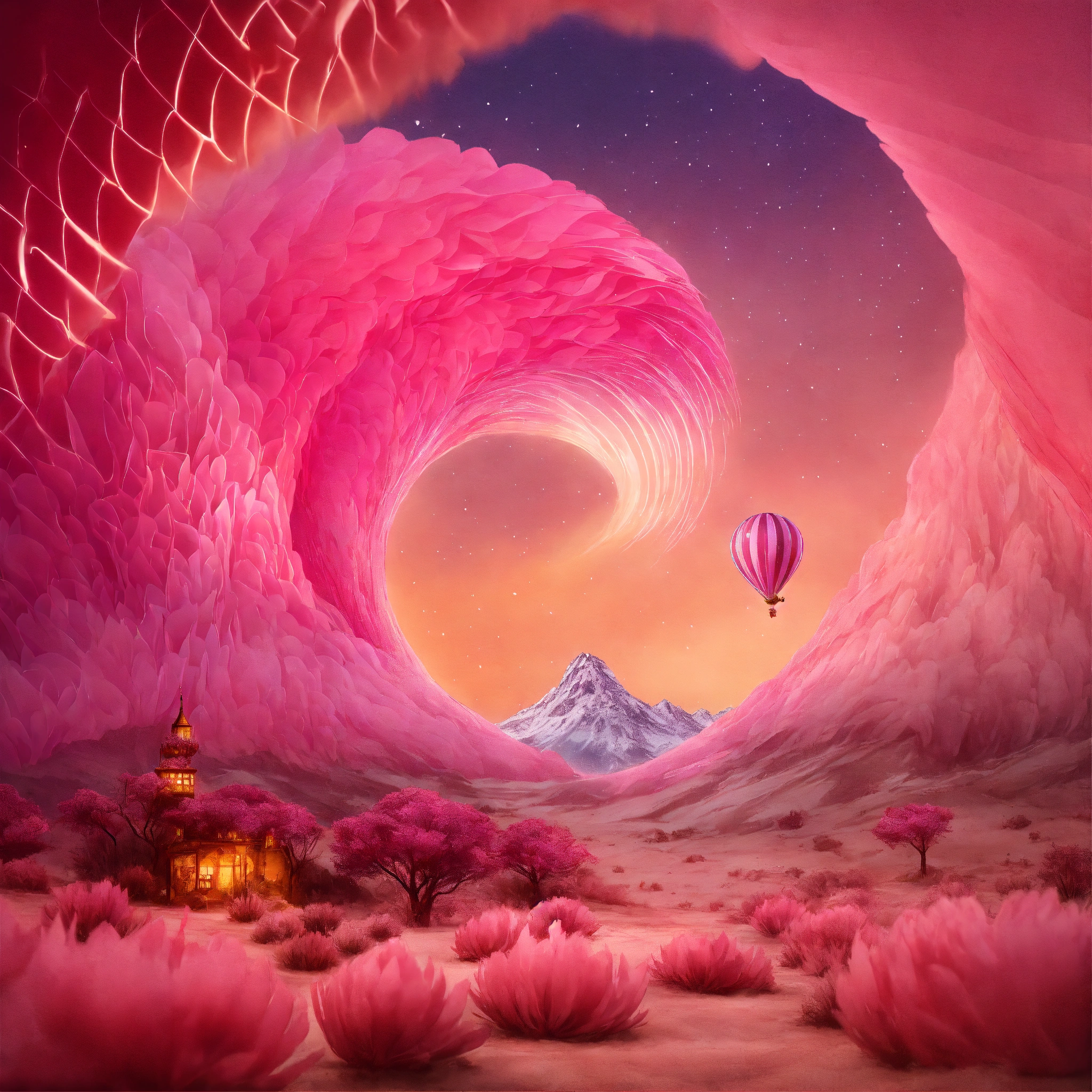 Image. illustrate a pink tornado with wings in a white desert. long exposure photography style, cartoon style, x-ray style, in the style of tim burton, lion king, the chronicles of narnia, beauty and the beast, and peter pan. with native american and sacred geometric patterns on the body. enchanting aura. the chronicles of narnia, wizard of oz, and alice in wonderland background with snow mountains, and fruit trees with pink leaves.