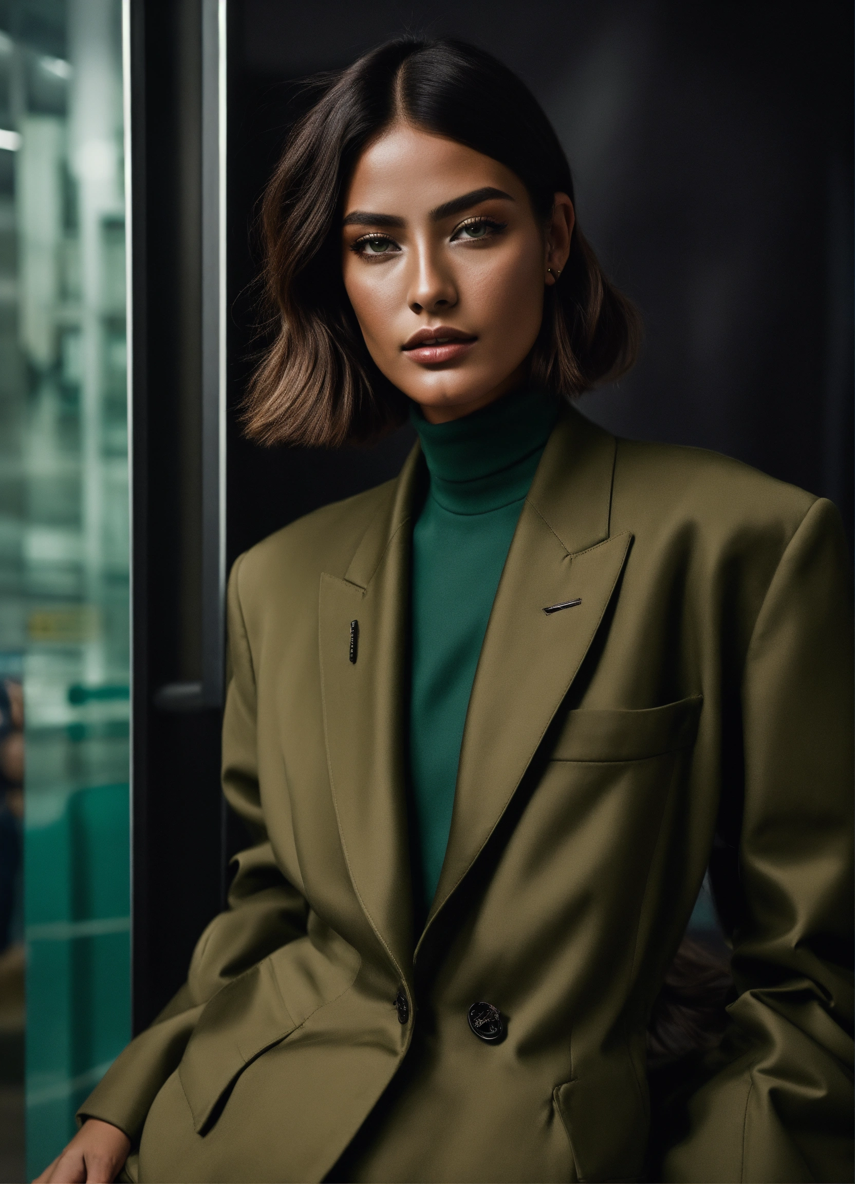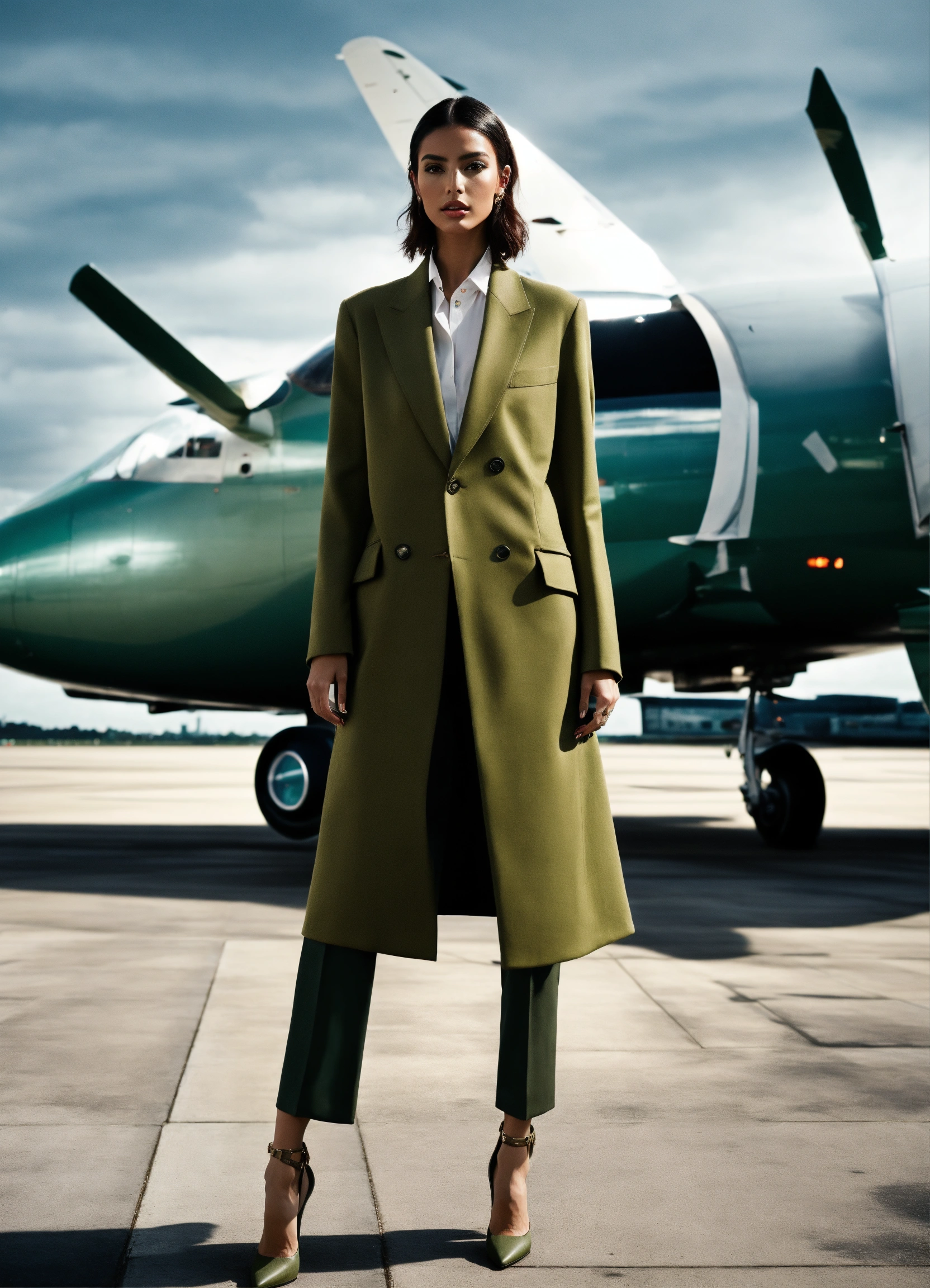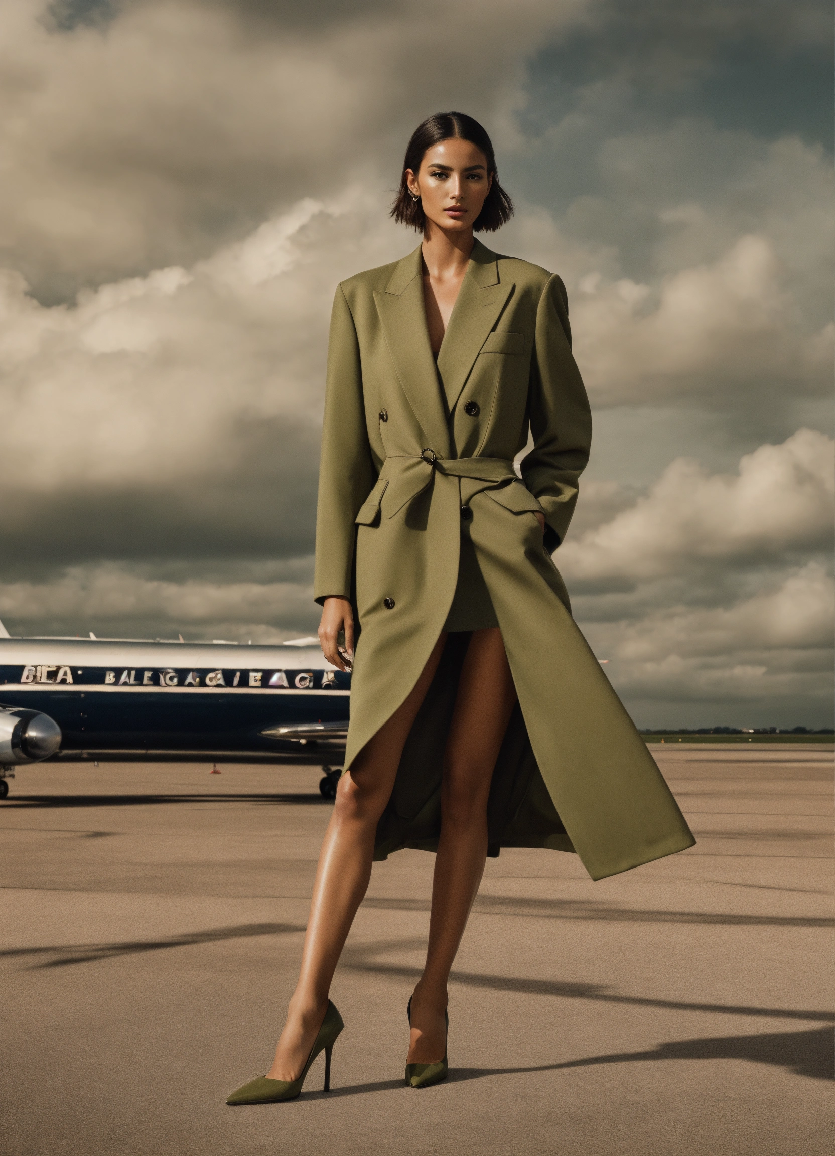 Create a visually stunning scene balenciaga photoshoot featuring a tanned brazillian supermodel in oversized olive green blazer, stilettos, iso 400, surrealistic, 8k, full frame, airport inspired background in grey, darker aestethic