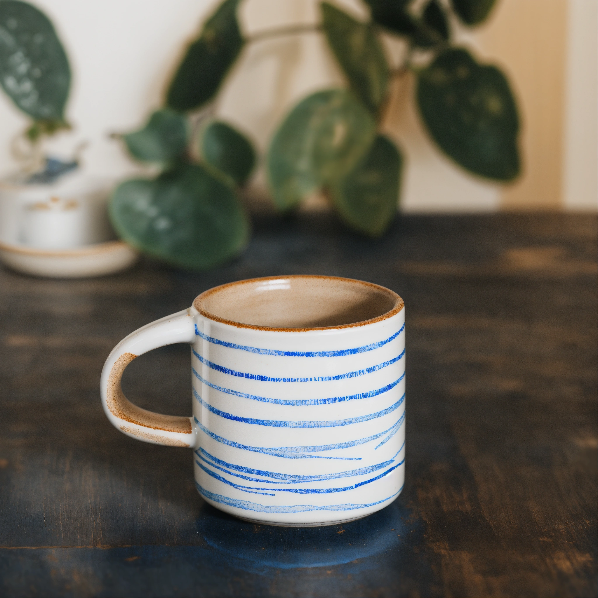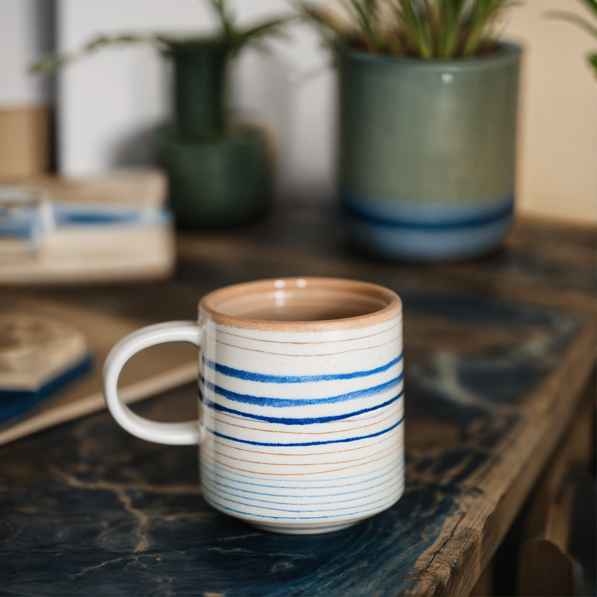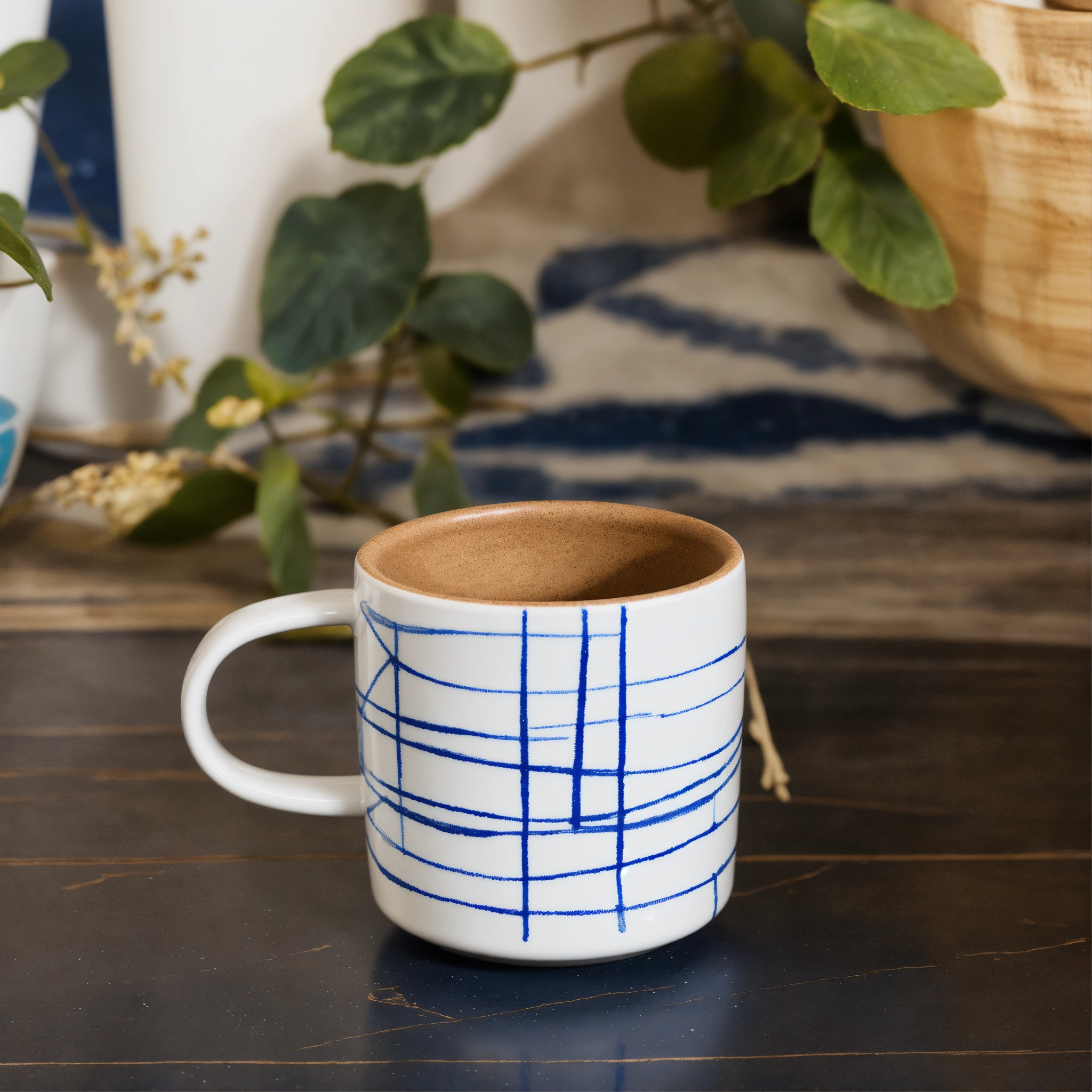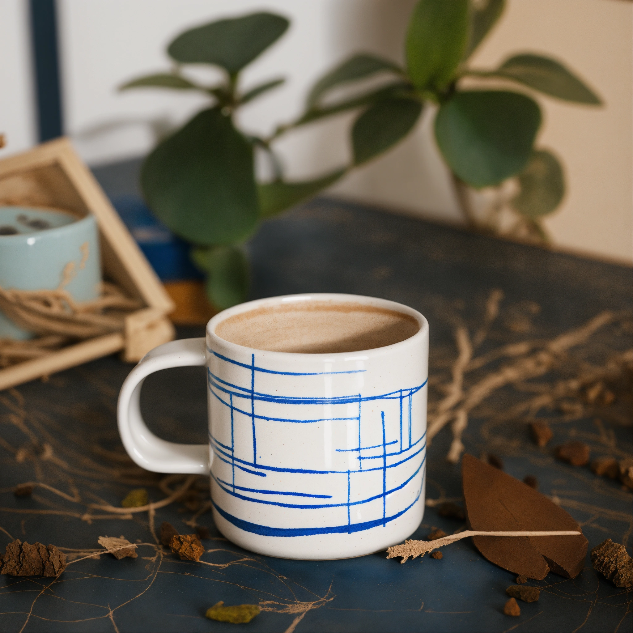 A minimalist stoneware mug in a straight short wide cylinder shape, white base with geometric blue hand drawn crayon lines, product photoshoot style on blue background with natural stones and wooden elements