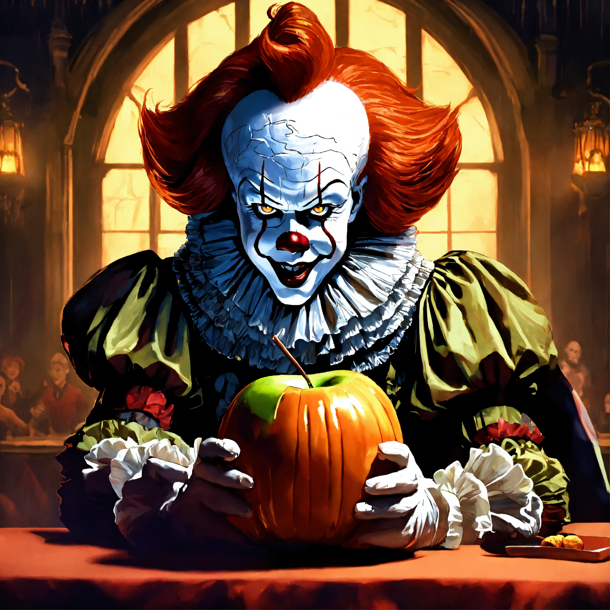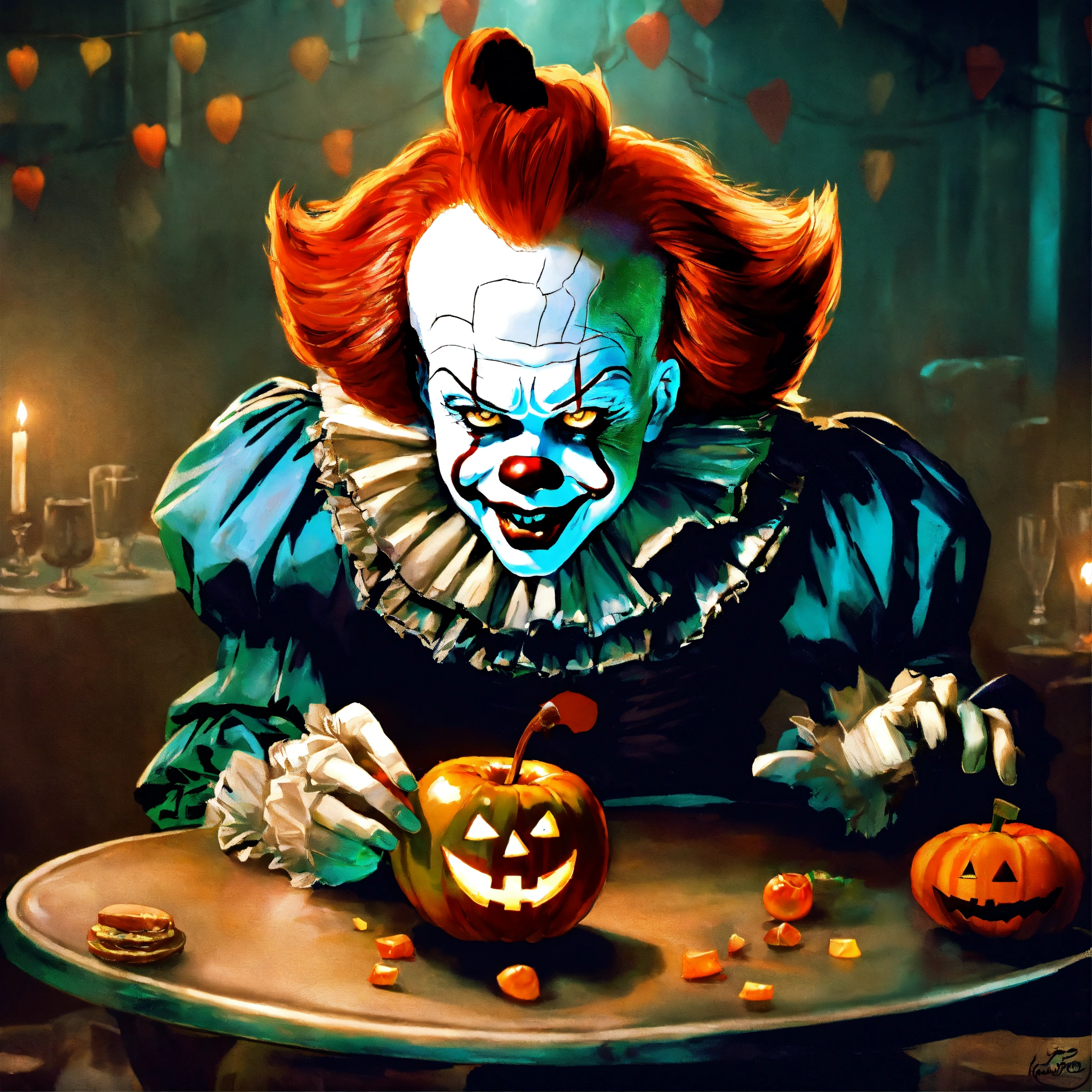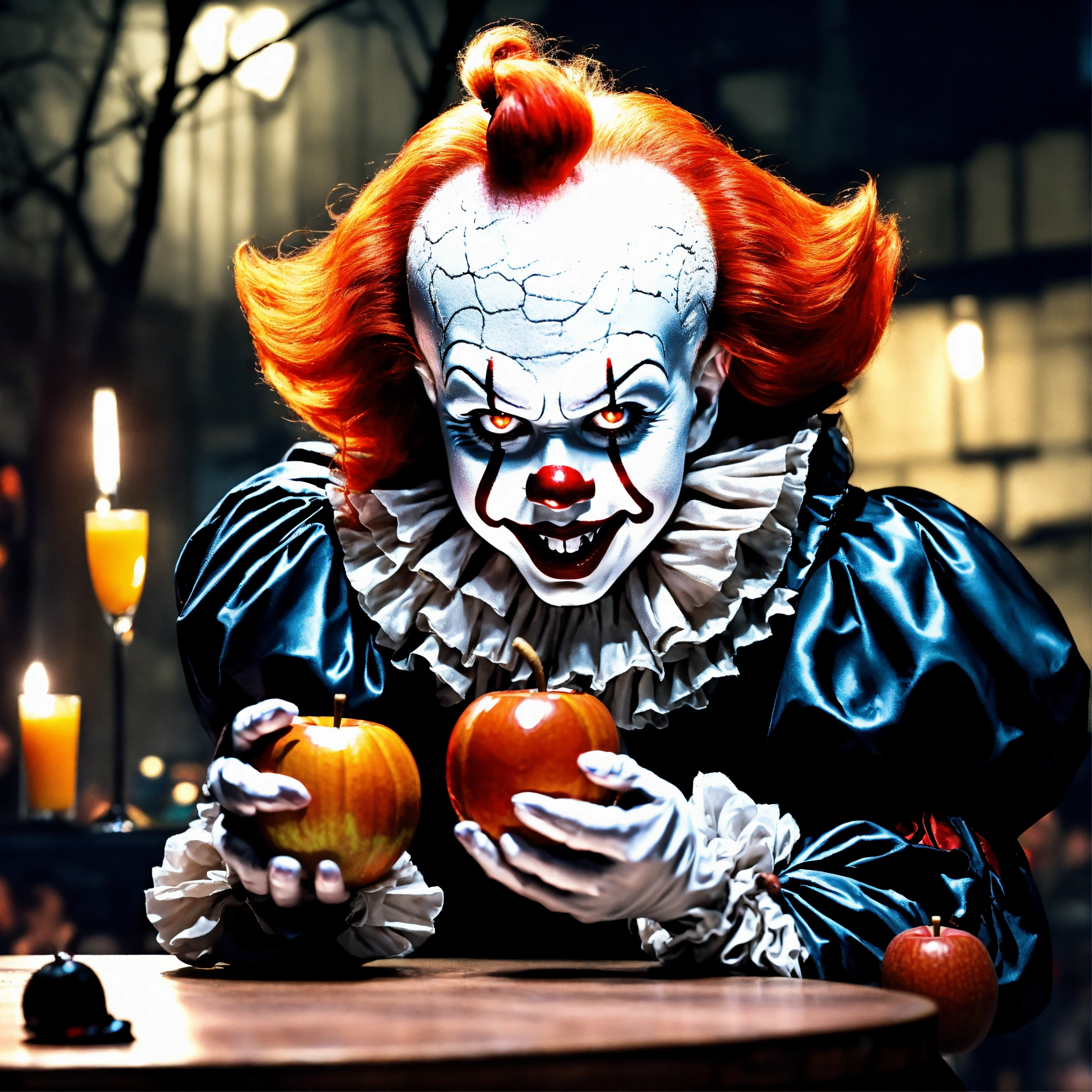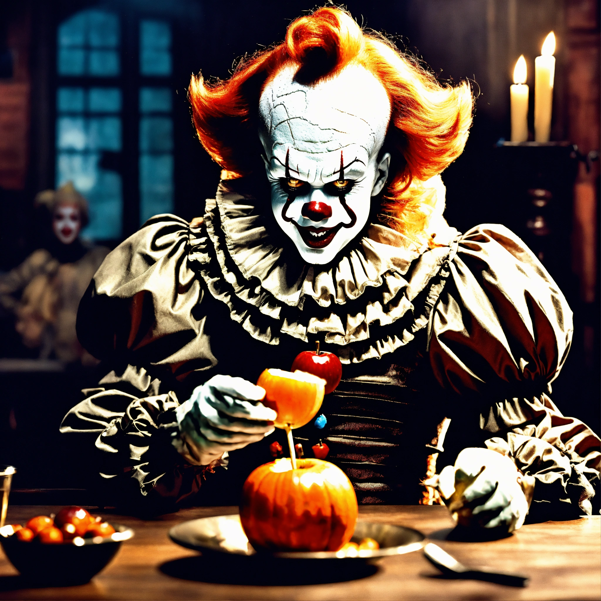 Pennywise holding a caramel apple in his hands sitting at a table at a halloween party in gotham city