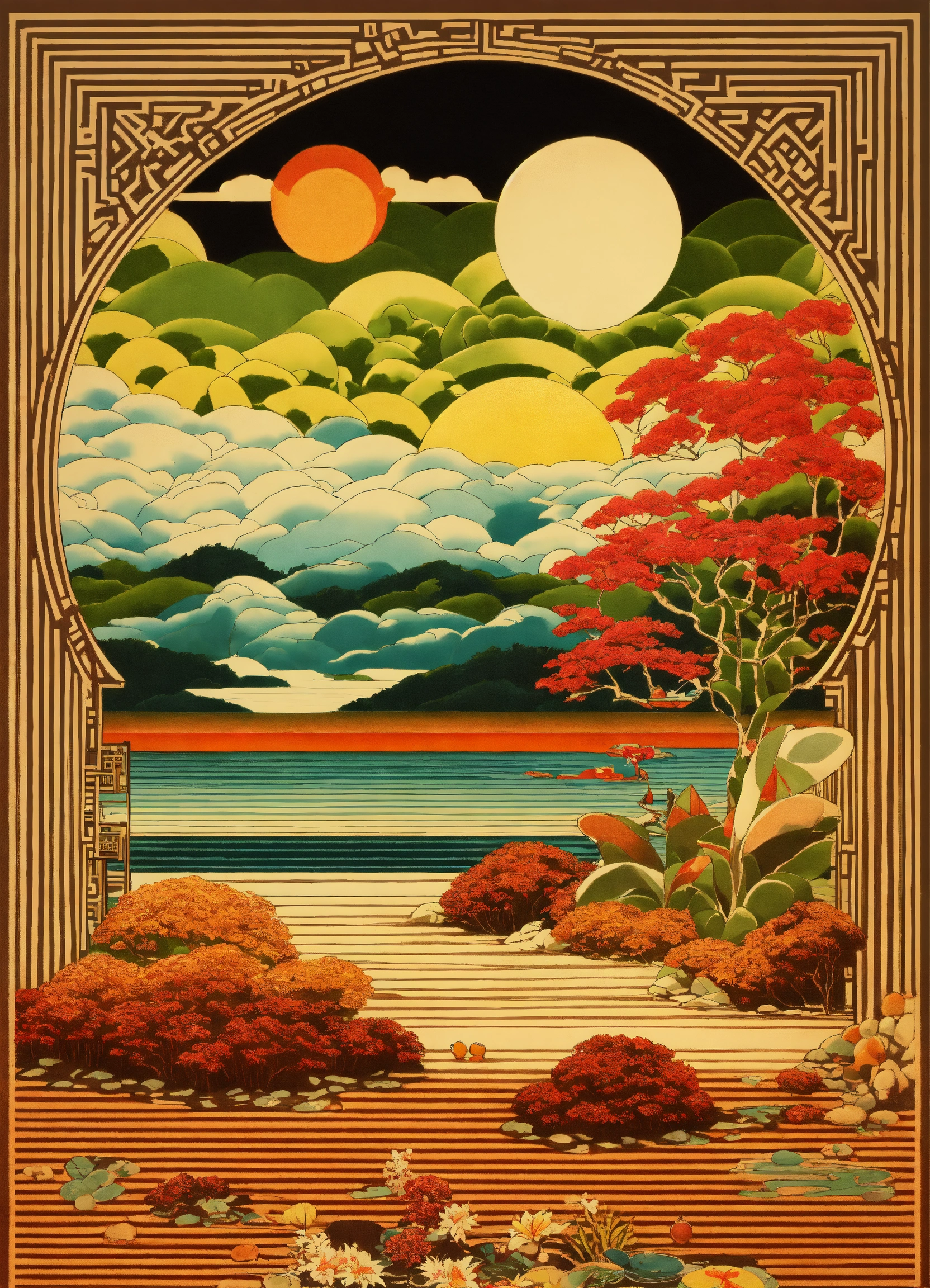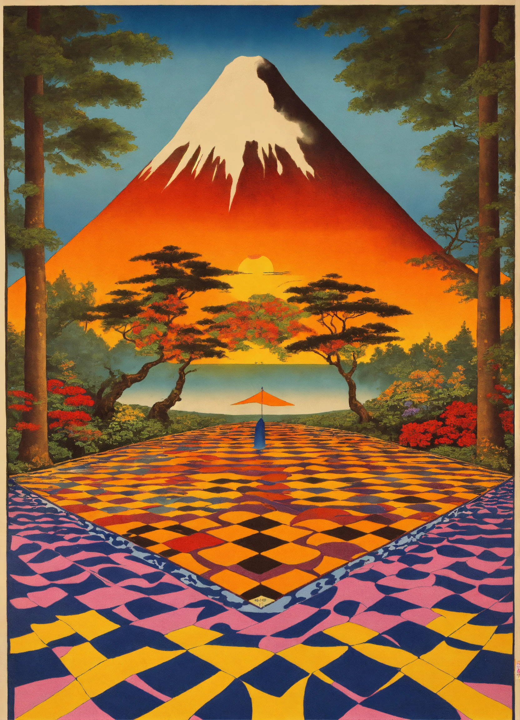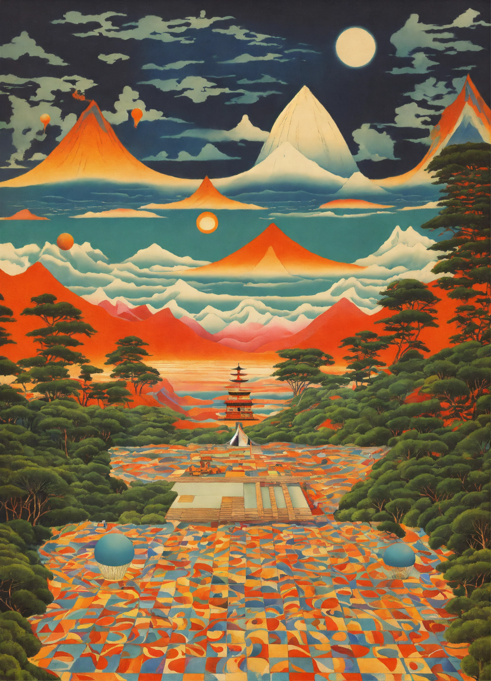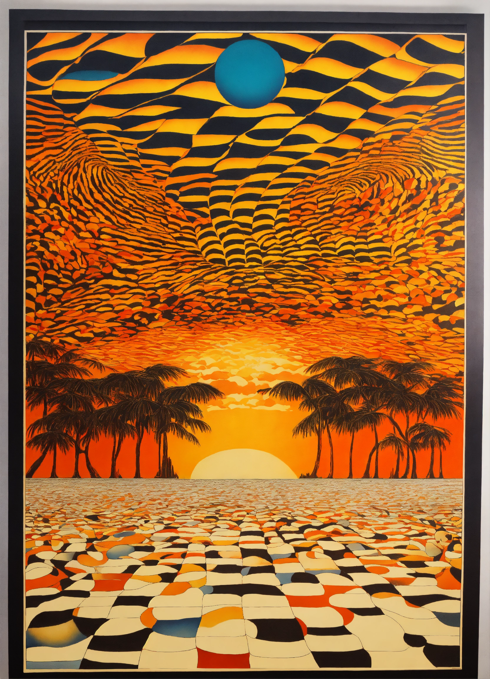 Japanese vintage poster, psychedelic aborigine, tropical paradise, gigsun melting checkerboard tiles, abstract cosmos merging into zen garden meets dream dimension by maurits cornelis escher
