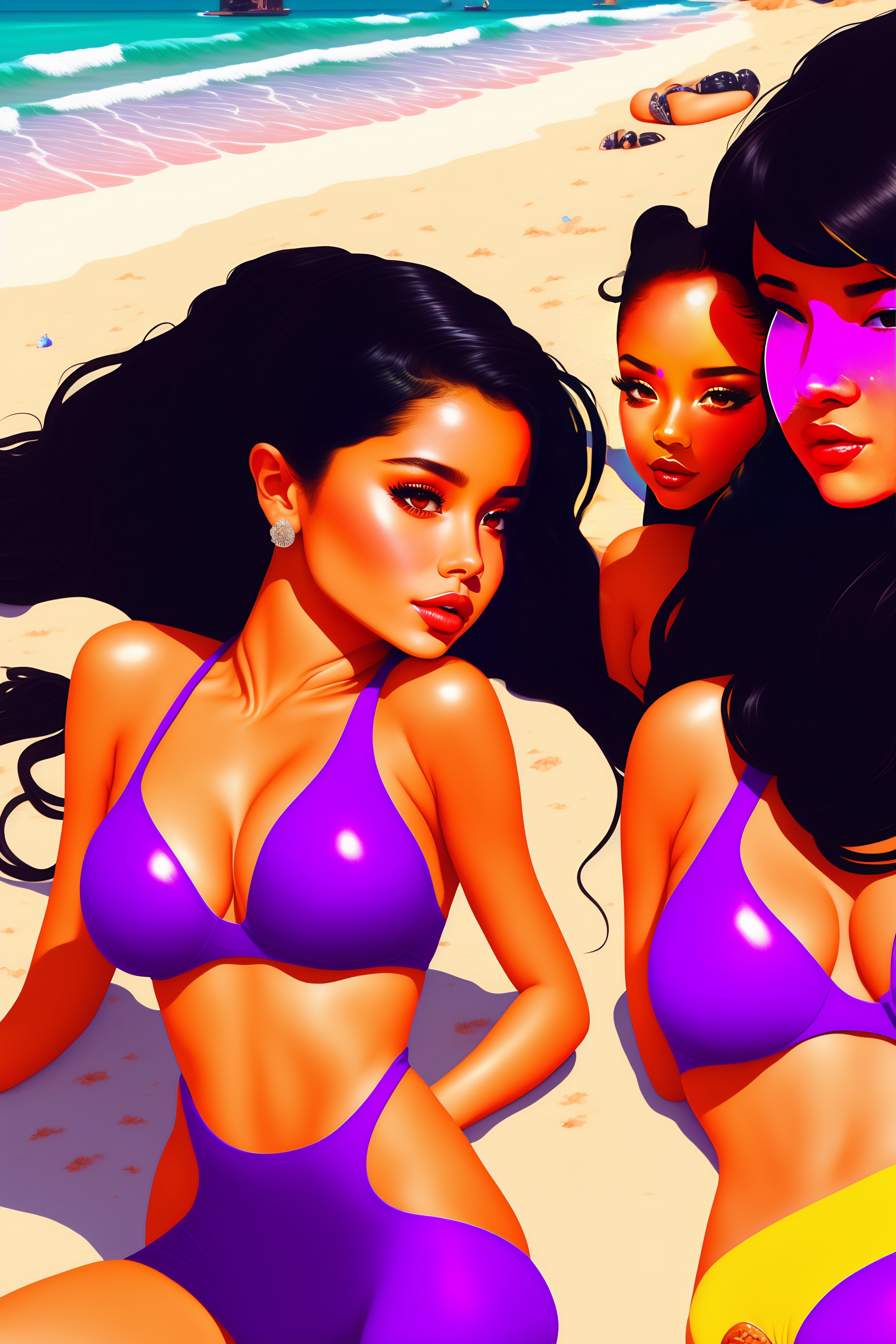 Ariana grande, selena gomez and jenna ortega with bikini lying down, beach background, style of laurie greasley, studio ghibli, akira toriyama, james gilleard, genshin impact, trending pixiv fanbox, acrylic palette knife, 4k, vibrant colors, devinart, trending on artstation, low details
