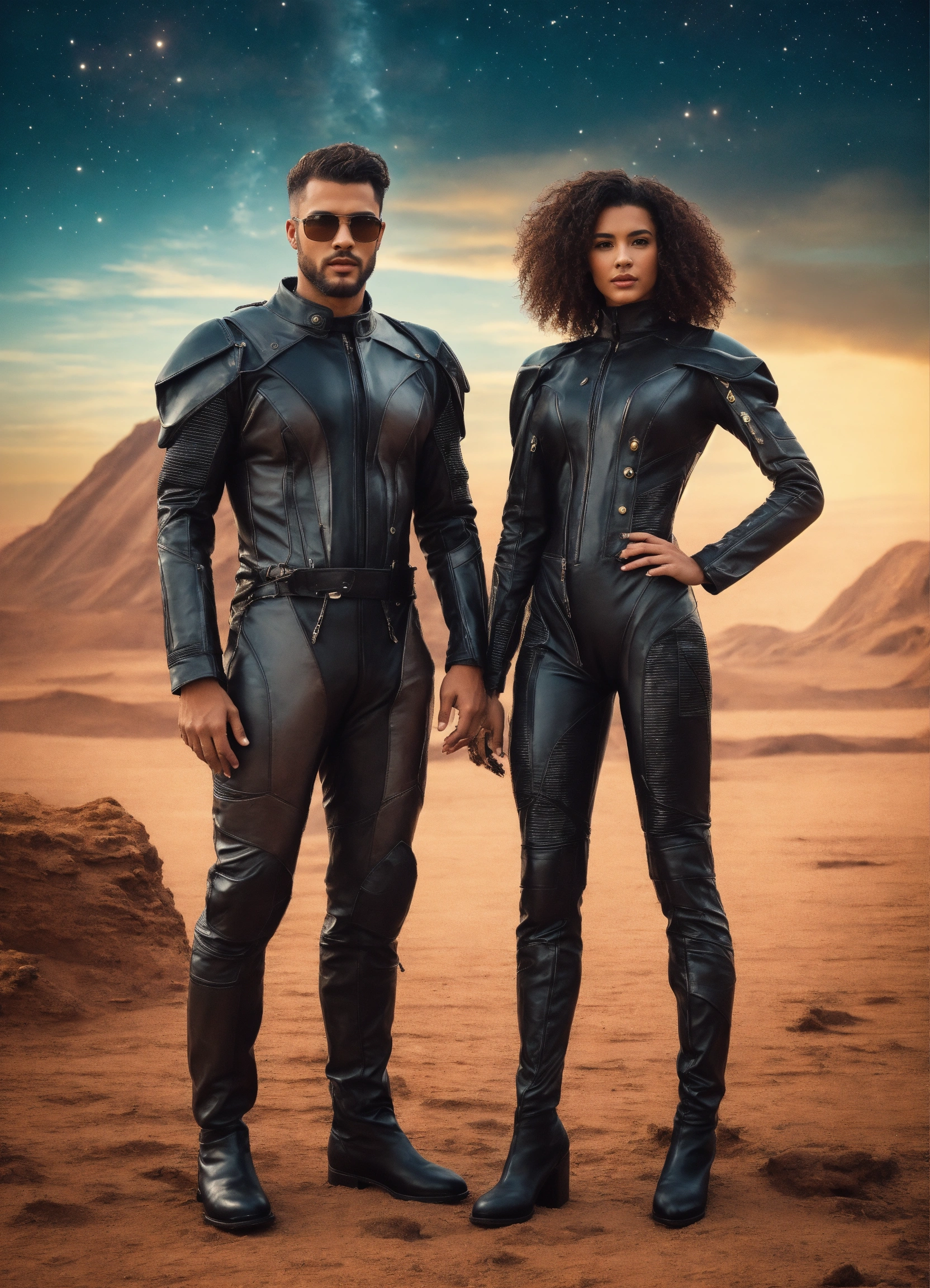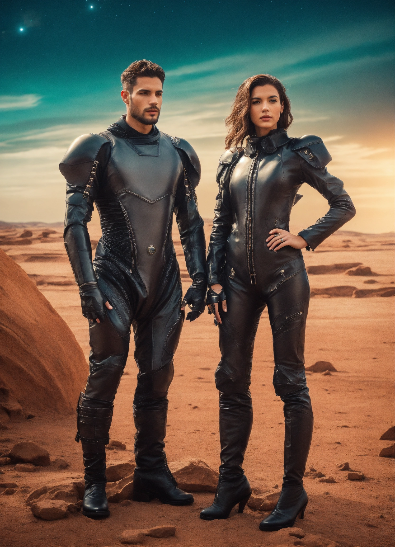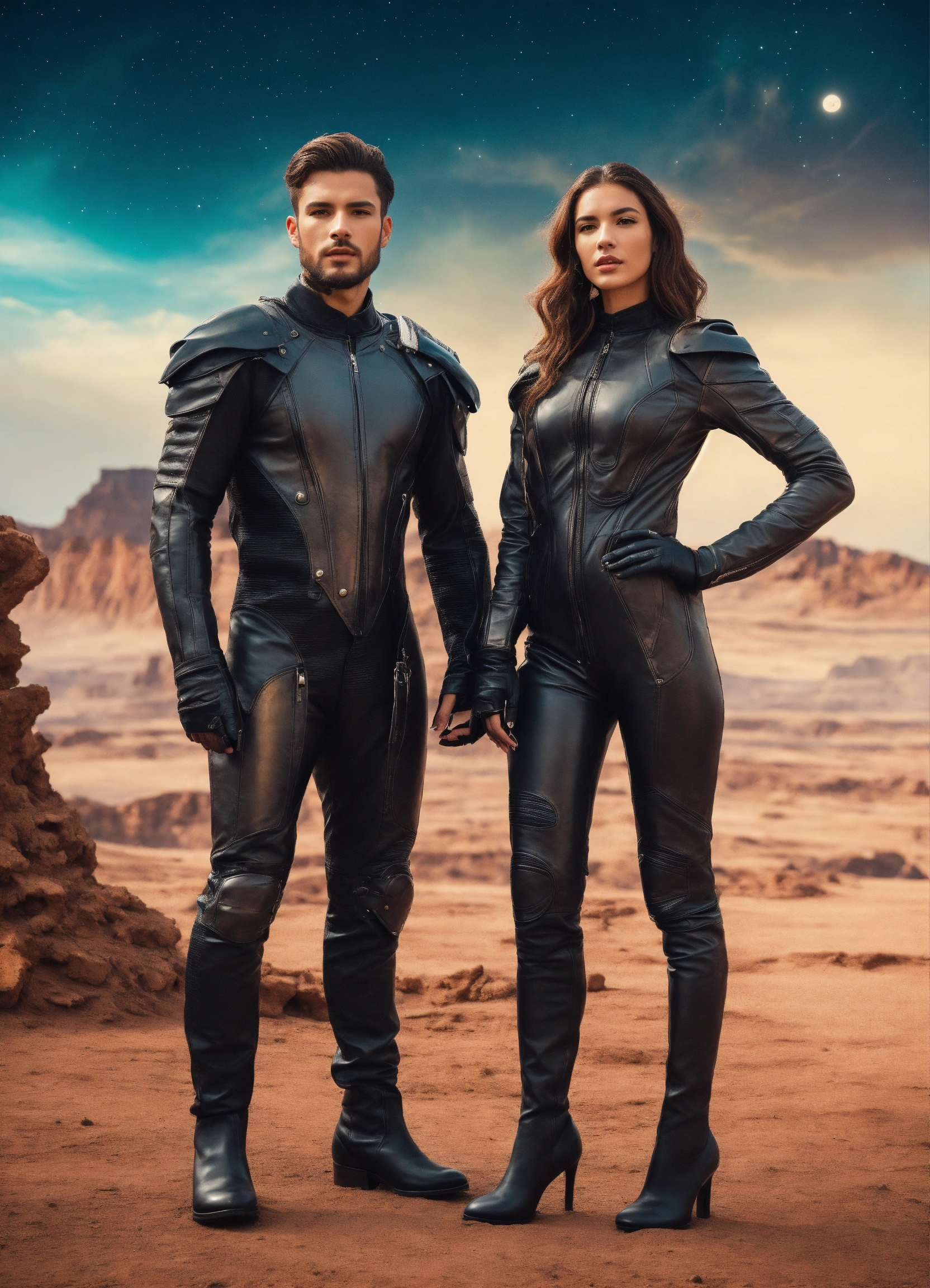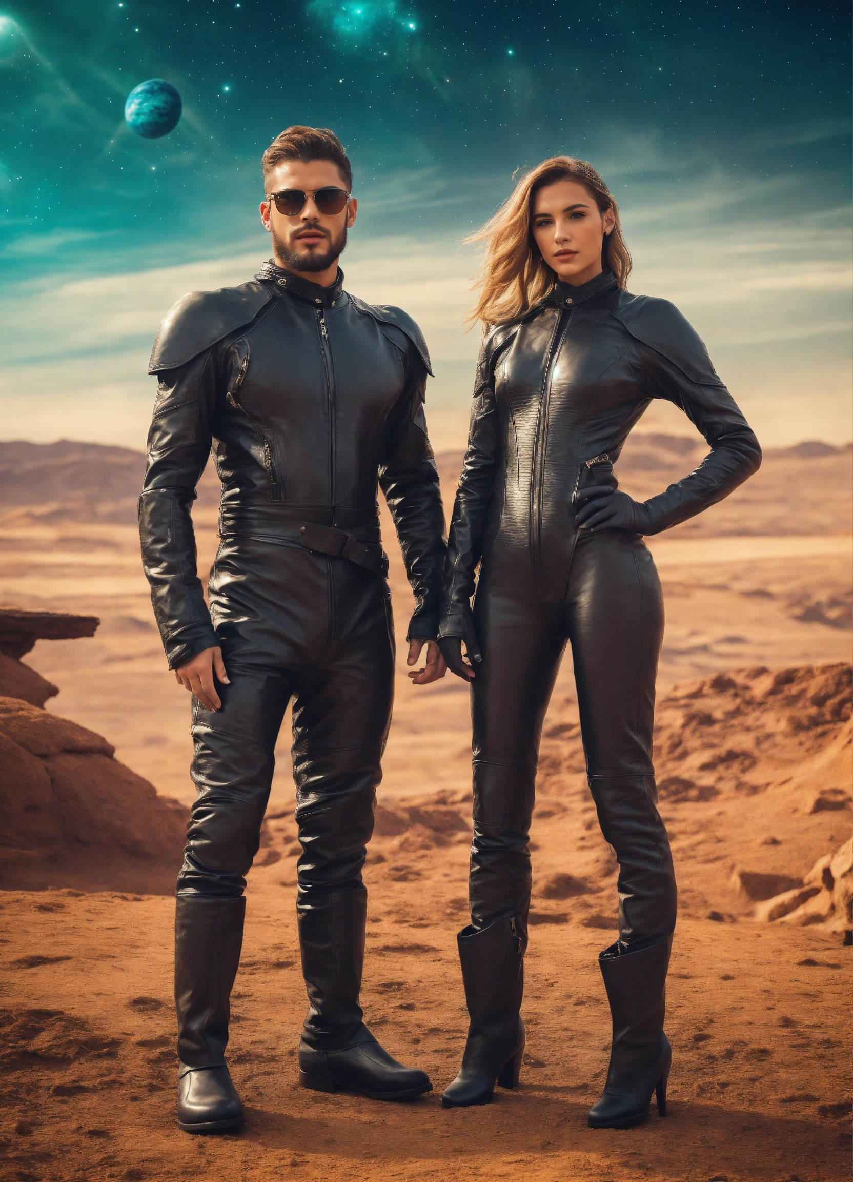A very beautiful couple, a man and a woman, in leather suits of the future, in full growth, on an alien planet