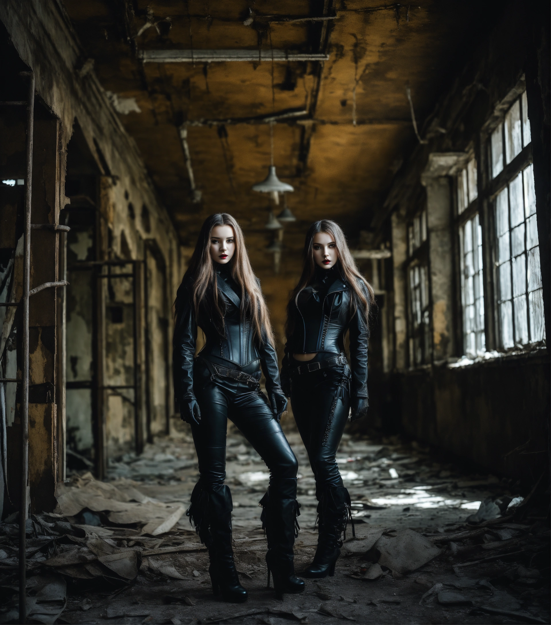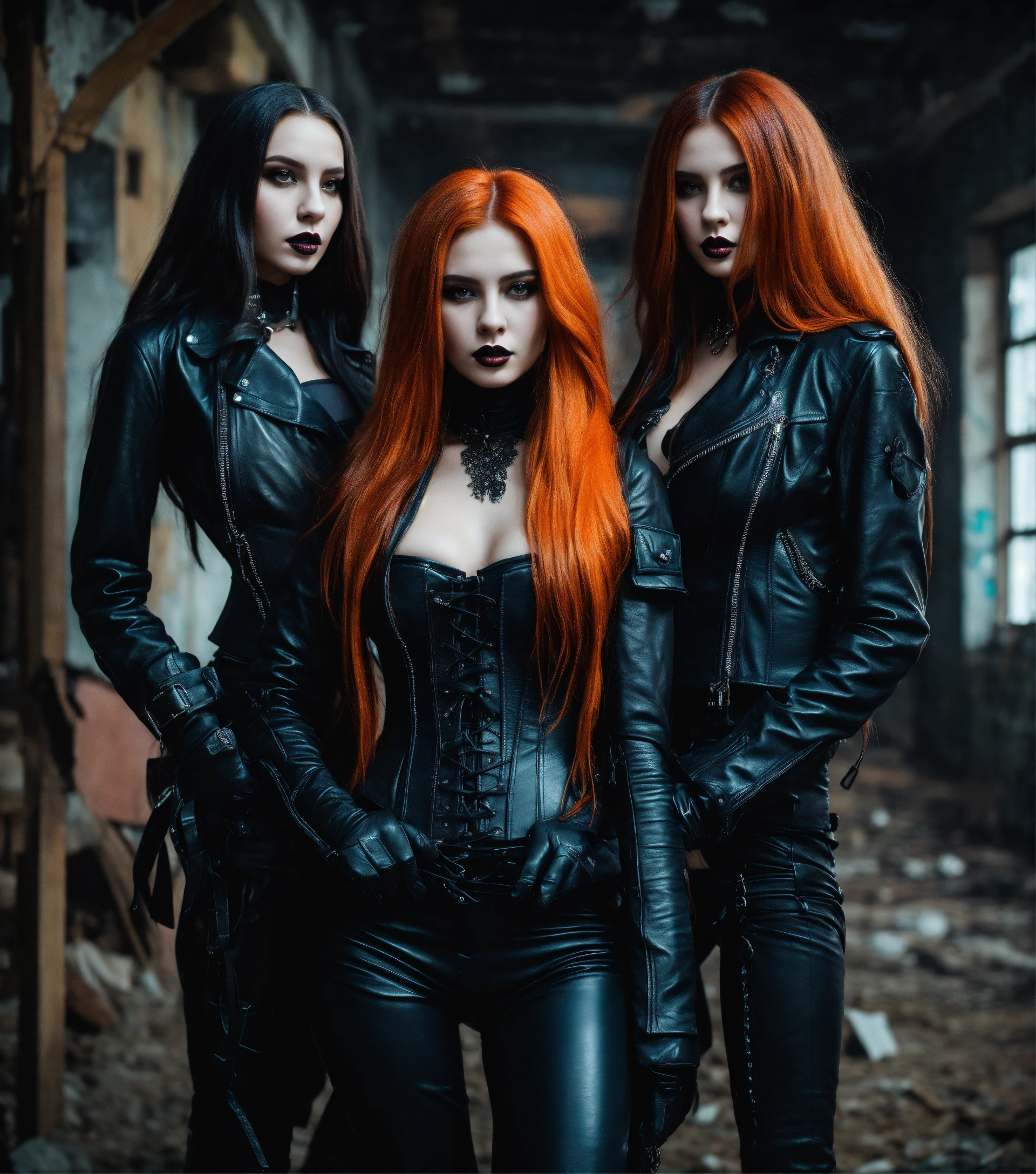 Three stunning young russian goth women with very long hair posing in in a dark abandoned bulding wearing a black leather corset and black leather gloves, leather jackets and pants, hyper-realistic, photographic portrait