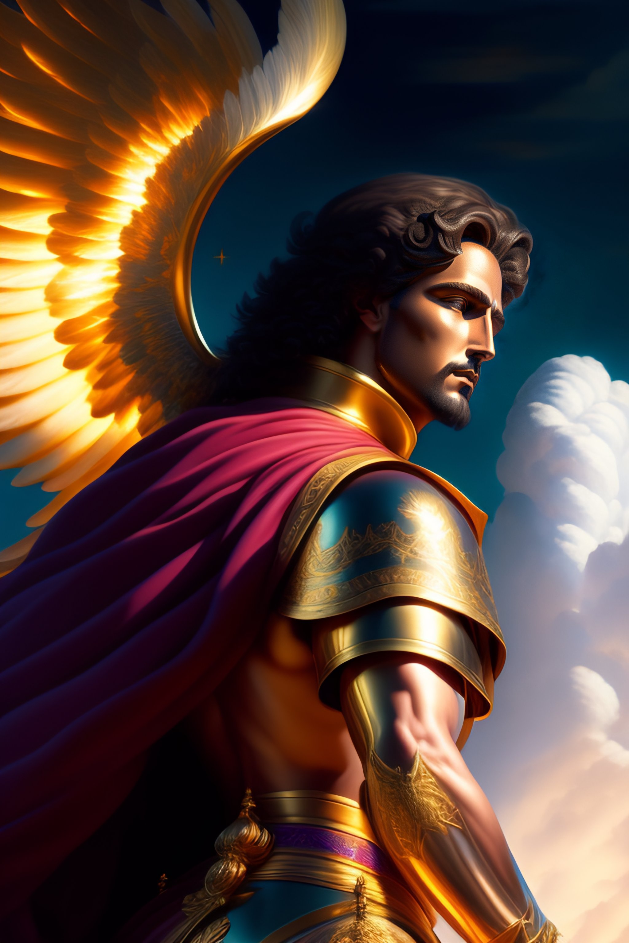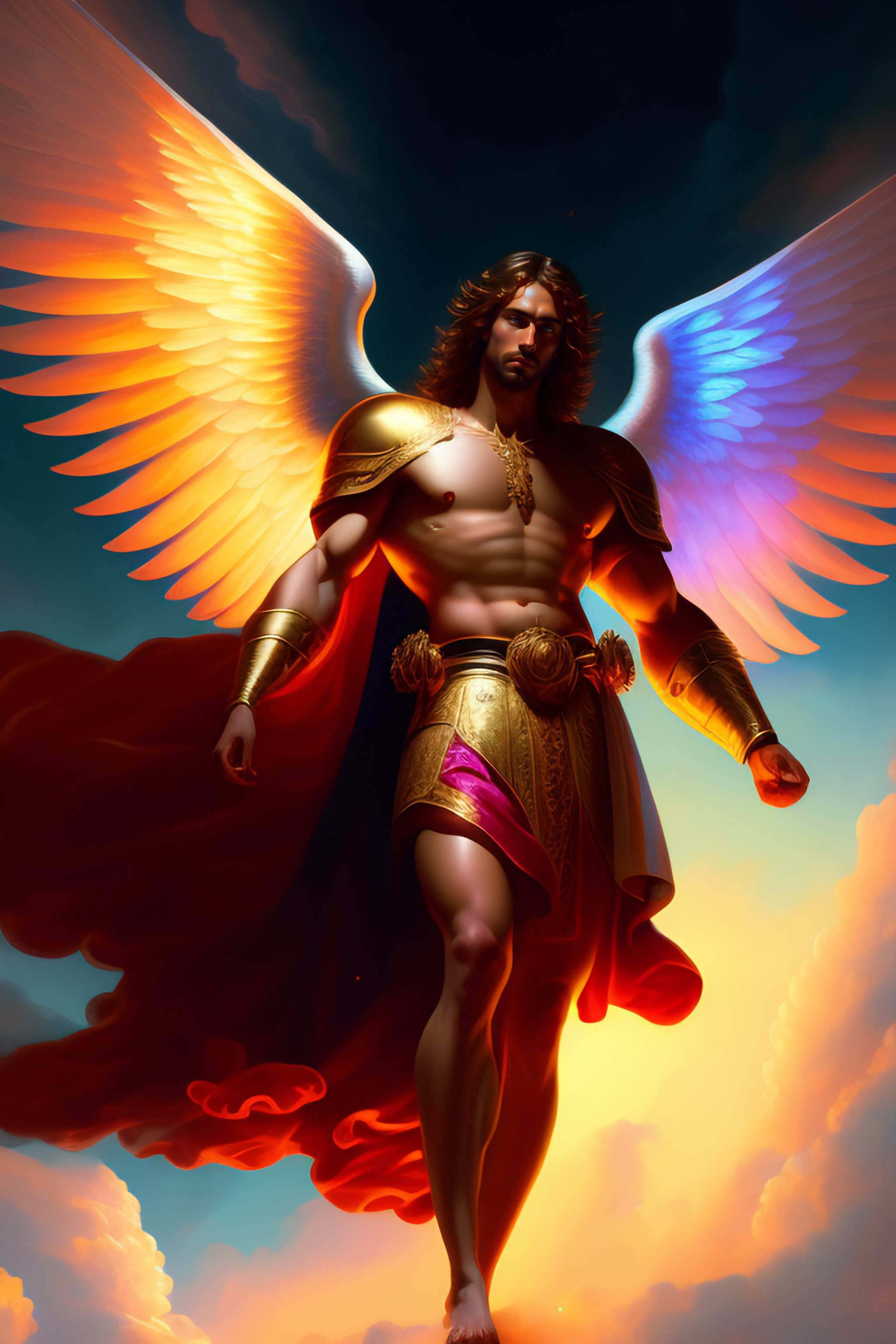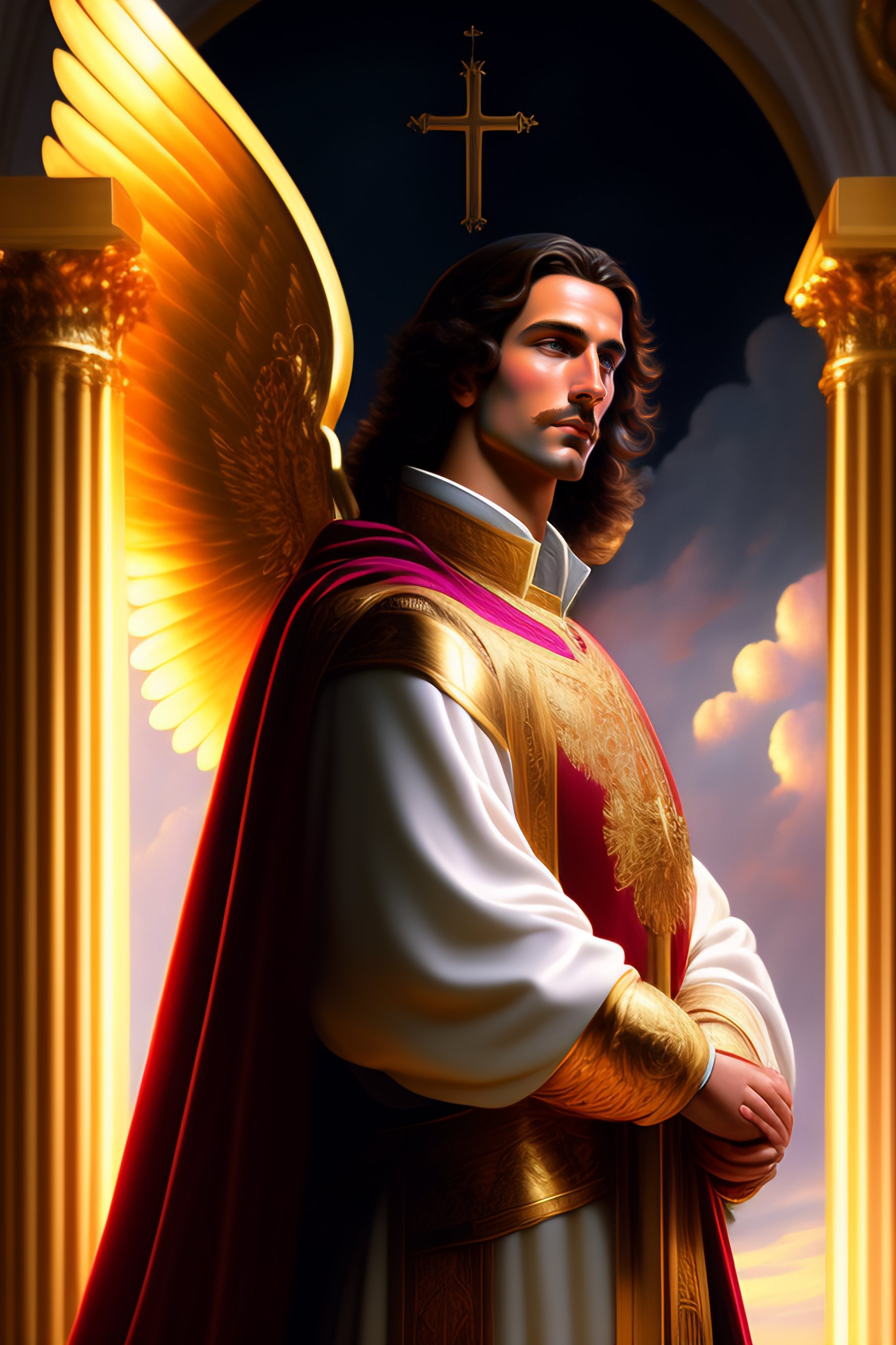 St miguel archangel, according to the bible, masterpiece, best quality, ultra detailed, anime illustration, dynamic angle, cinematic lighting, religious art, baroque, realistic, catholic style, 16k, full body, perfect hands, feet perfect, full image, ((full body)), highly detailed, digital painting, concept art, illustration, clouds background, radiance, clouds