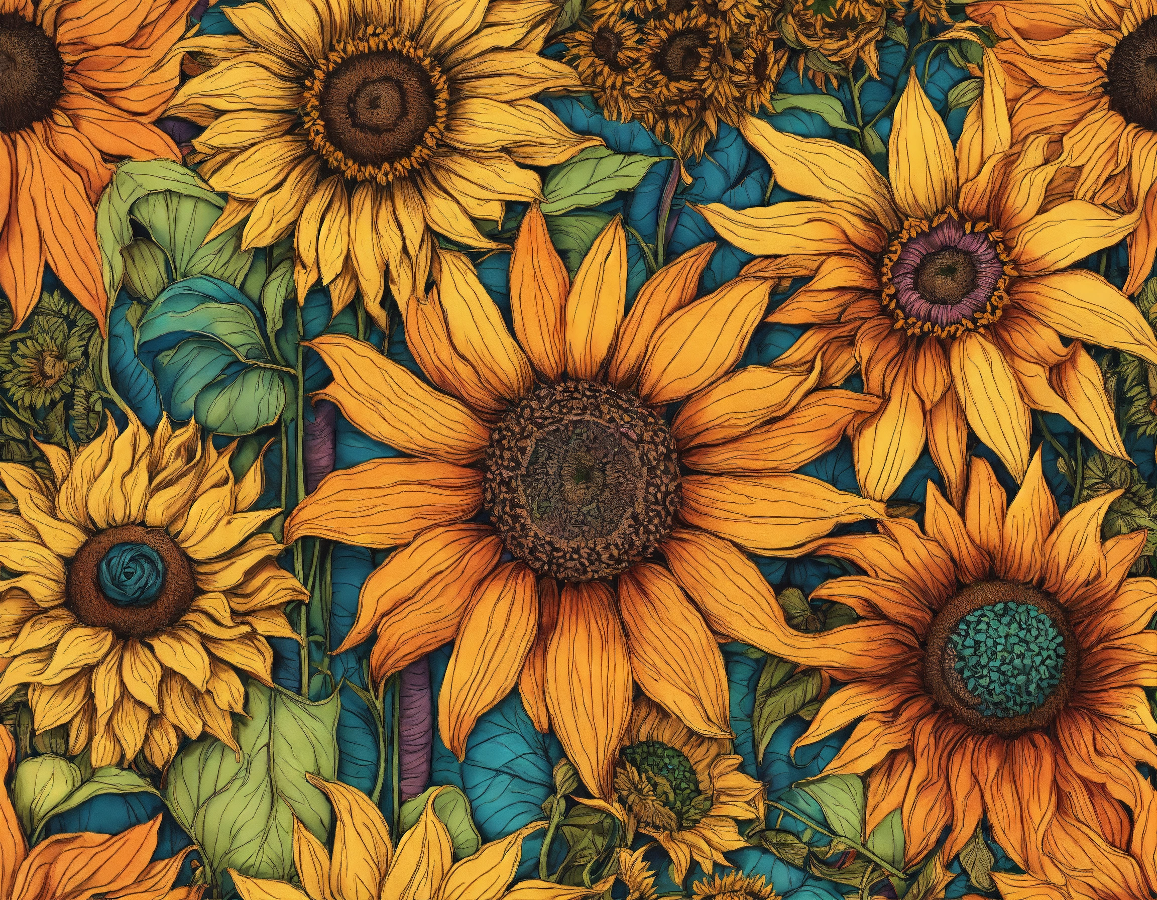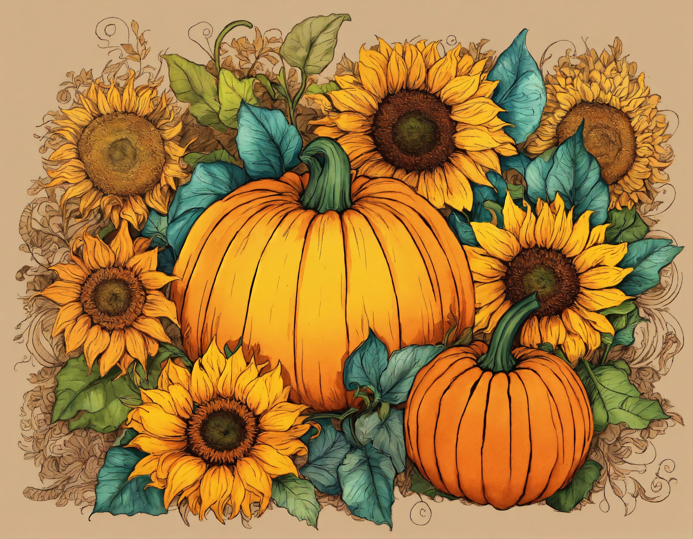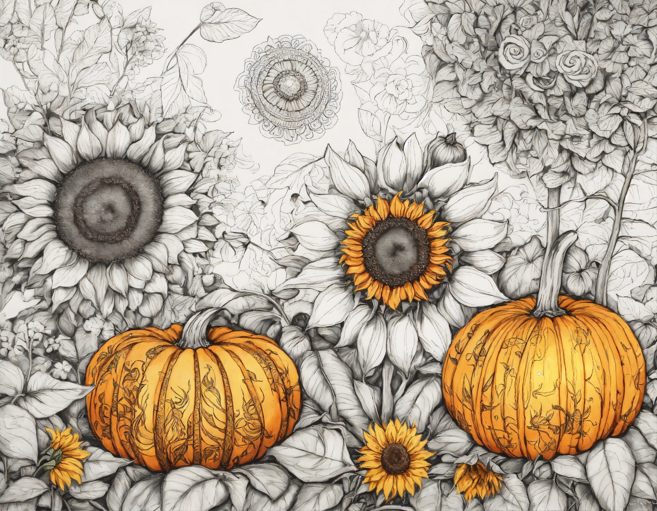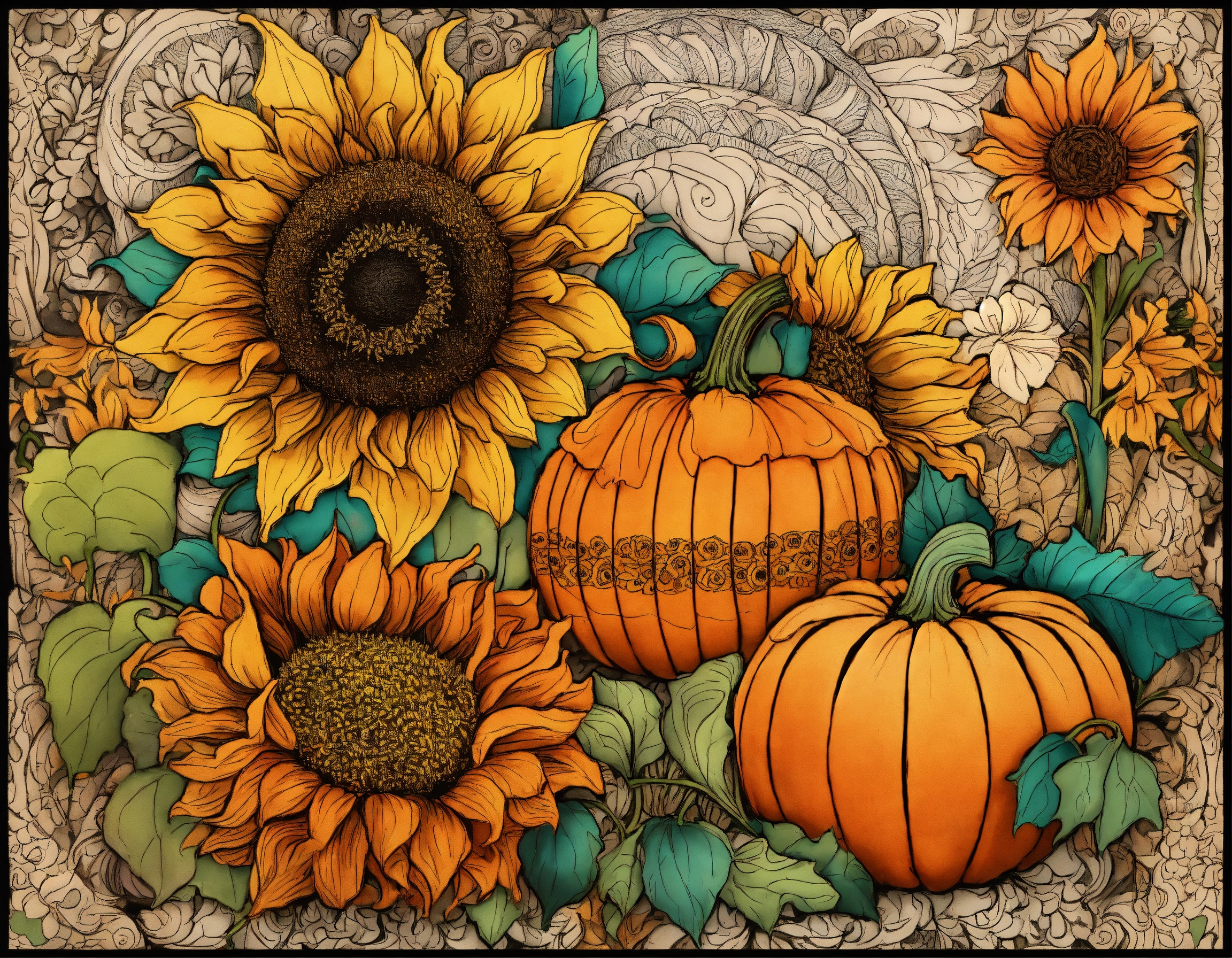 Beautiful ornate pumpkins and sunflowers, classic zentangle style line art designs, detailed; vibrant drawing in color