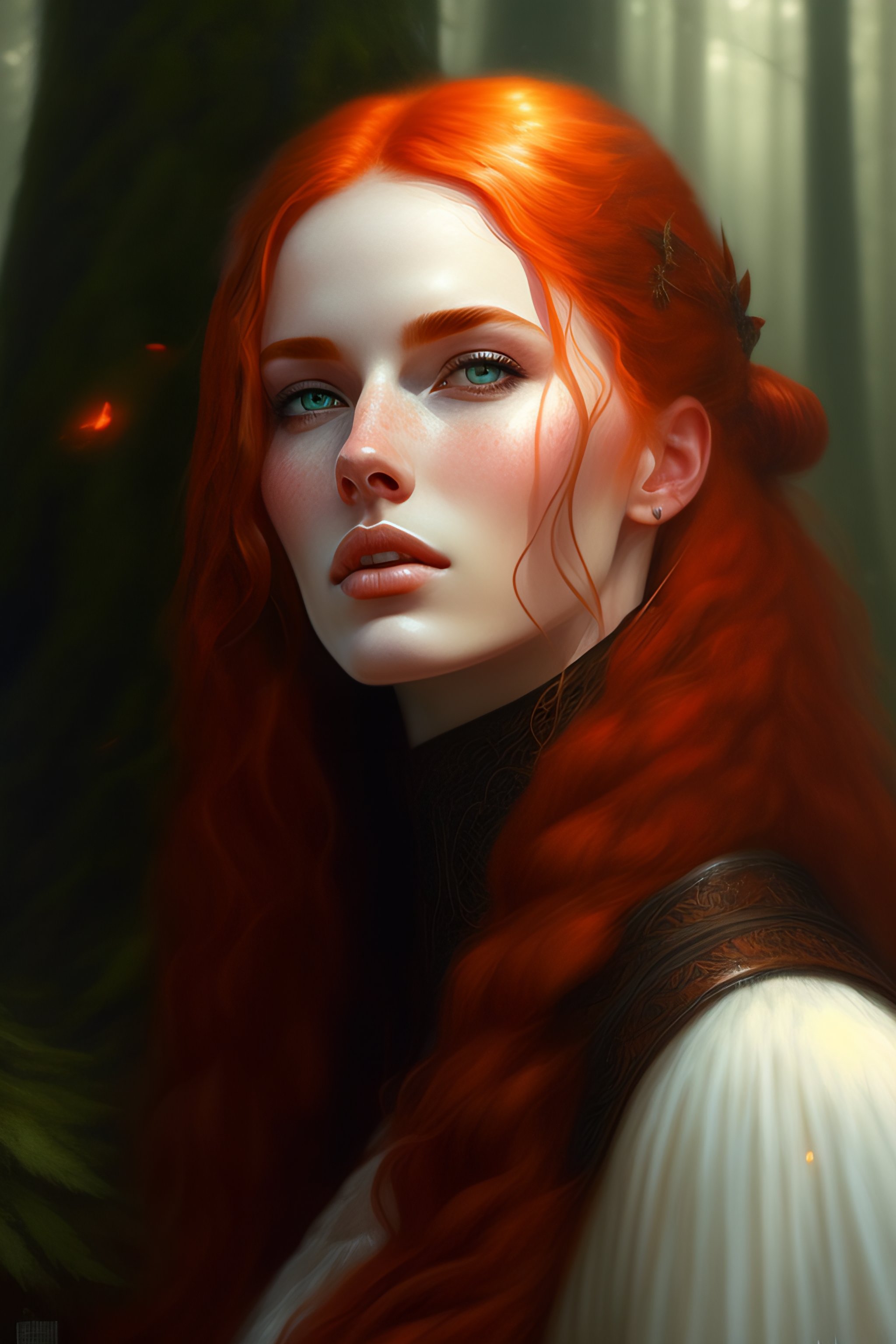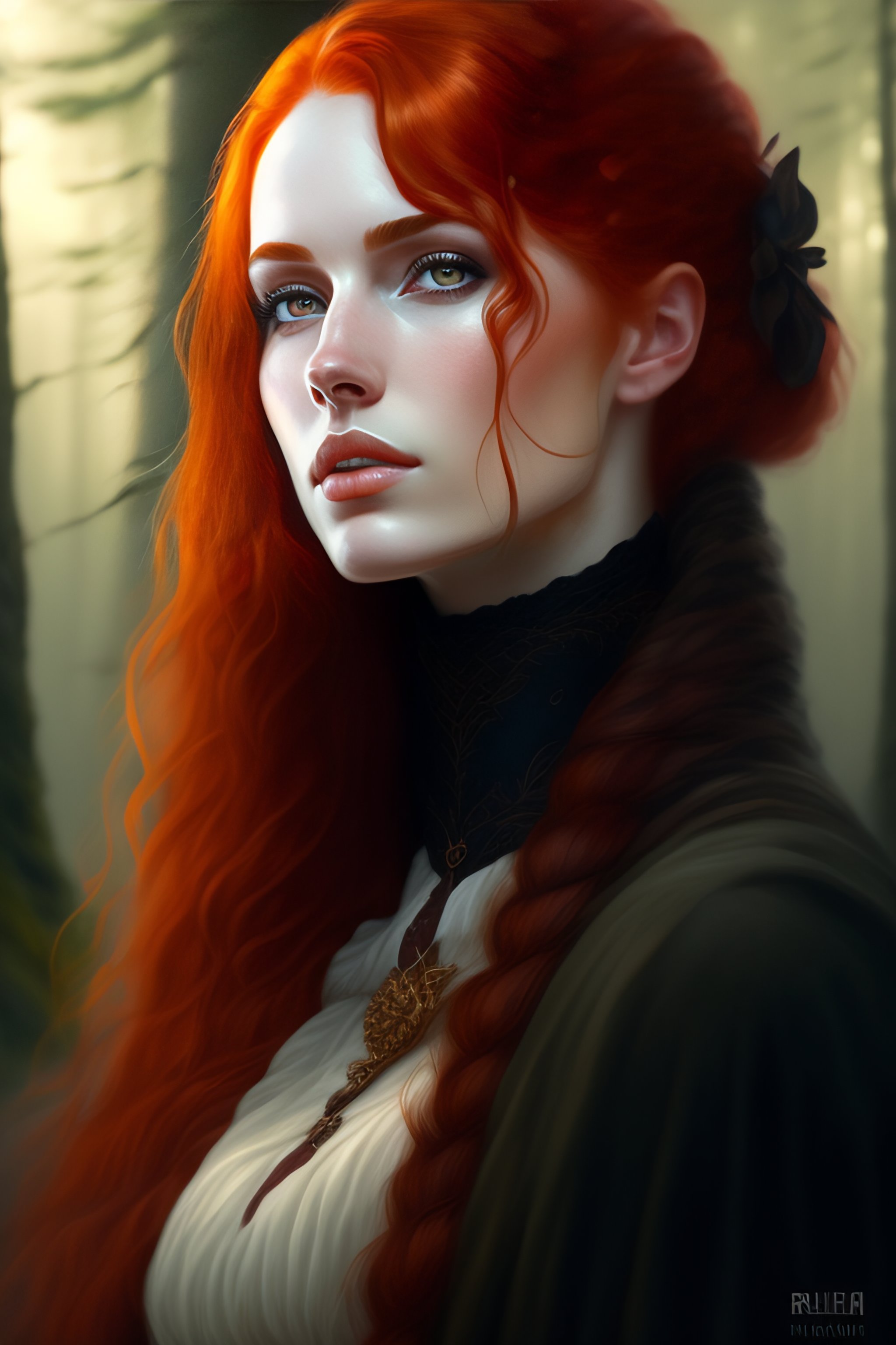 Realistic detailed waist portrait of a beautiful red hair girl, pale skin, choker, black medieval clothes, wild hair, violent, sad, in the dark forest by greg rutkowski, in the style of wlop, stanley artgerm, very coherent