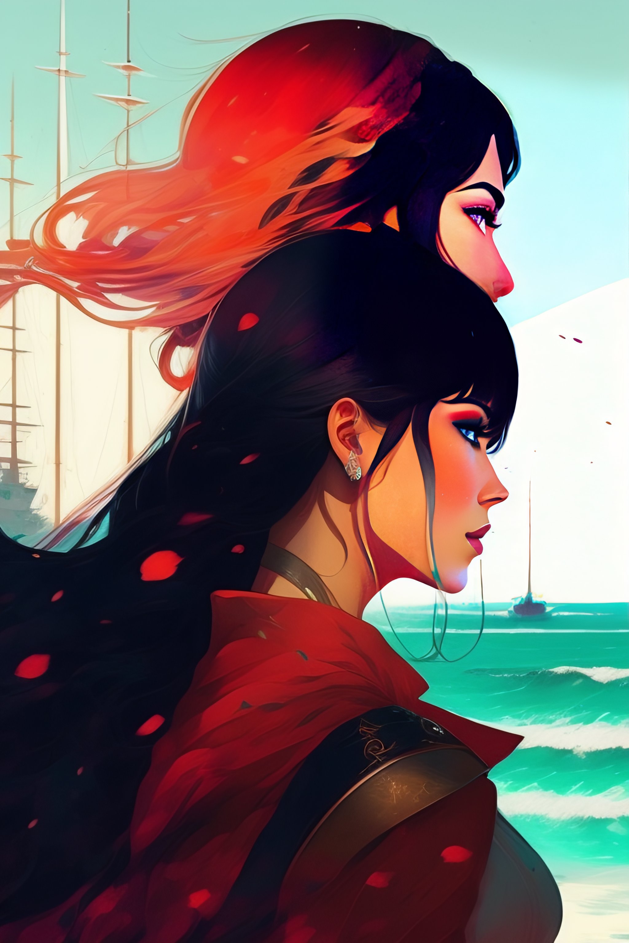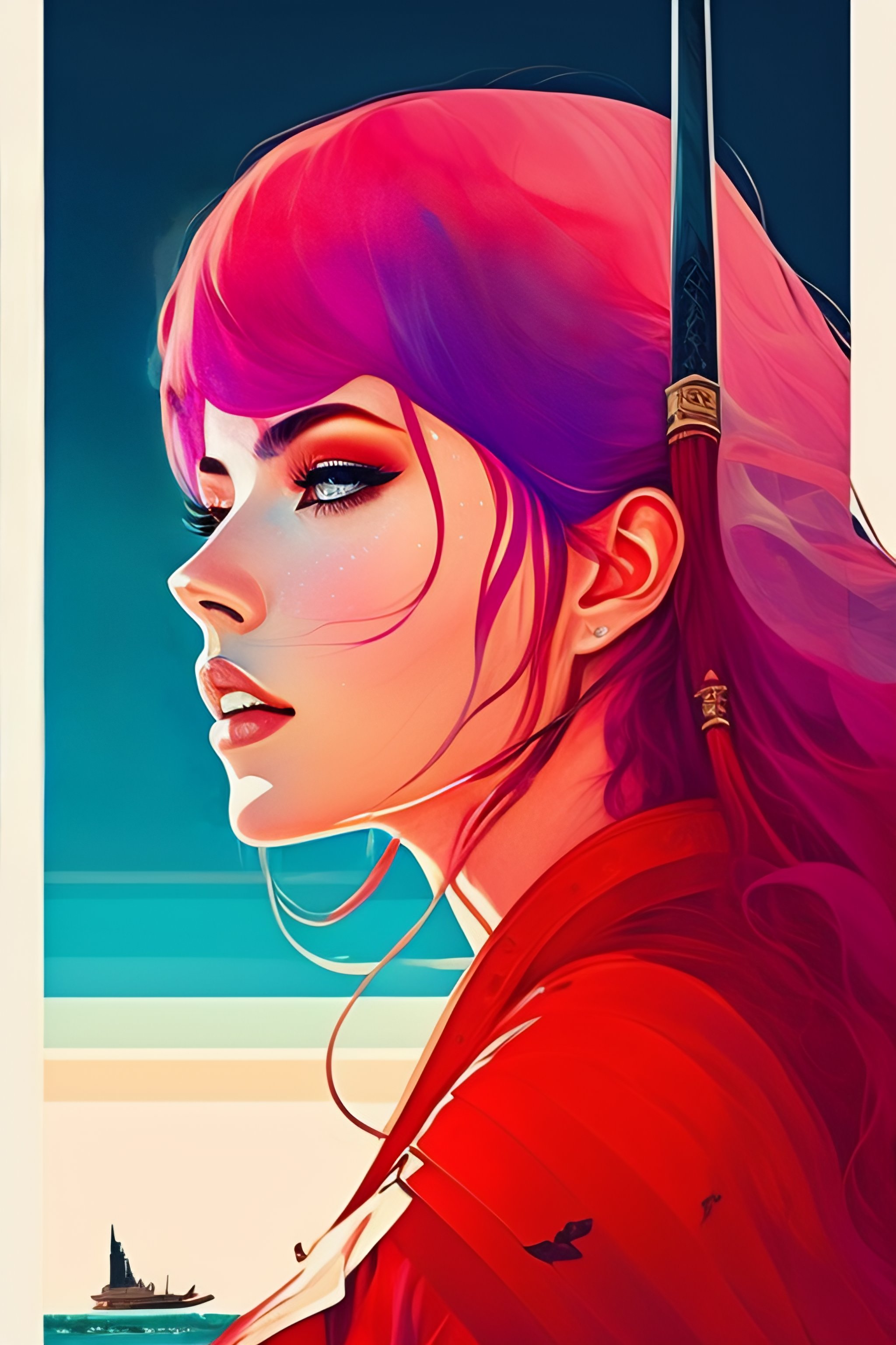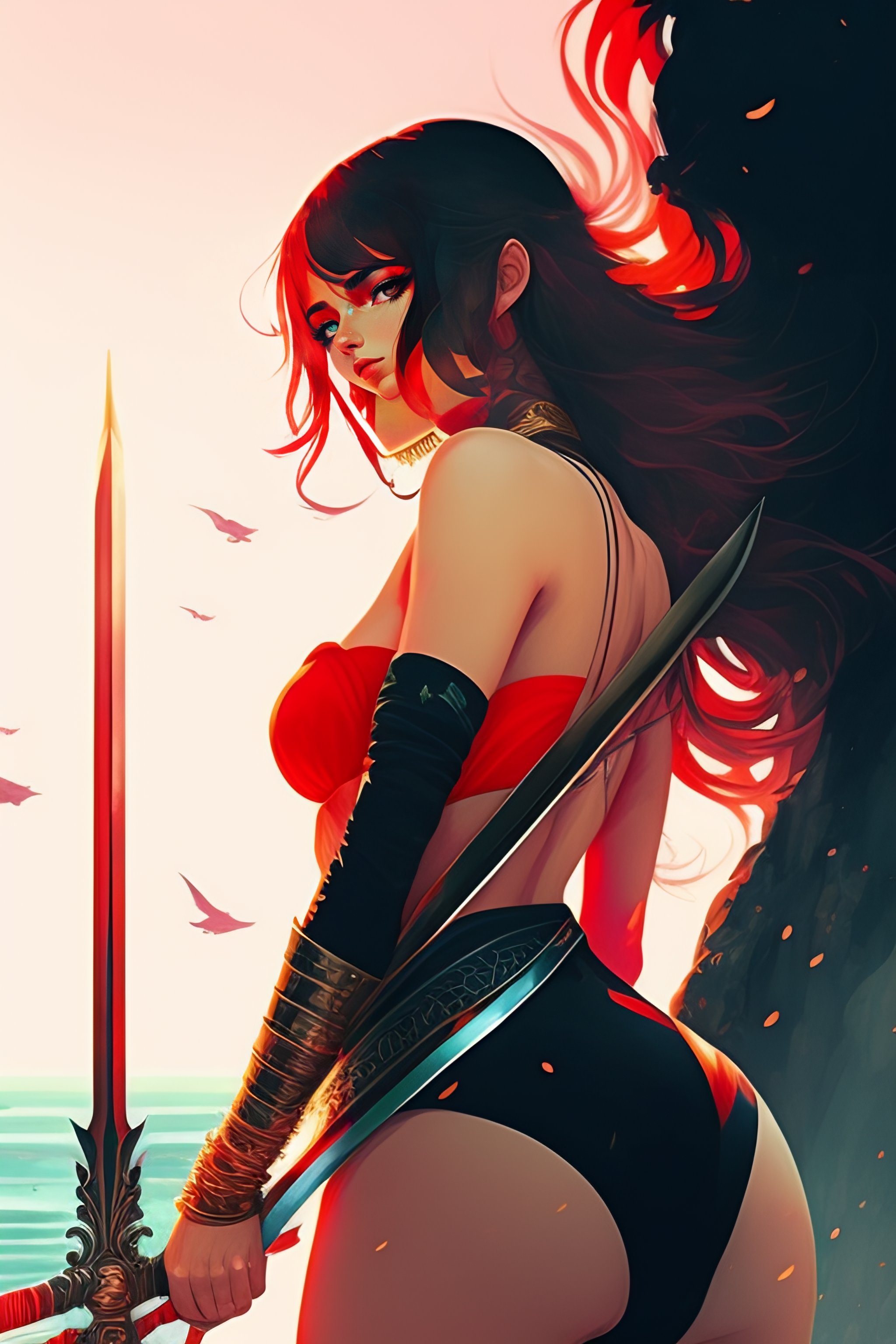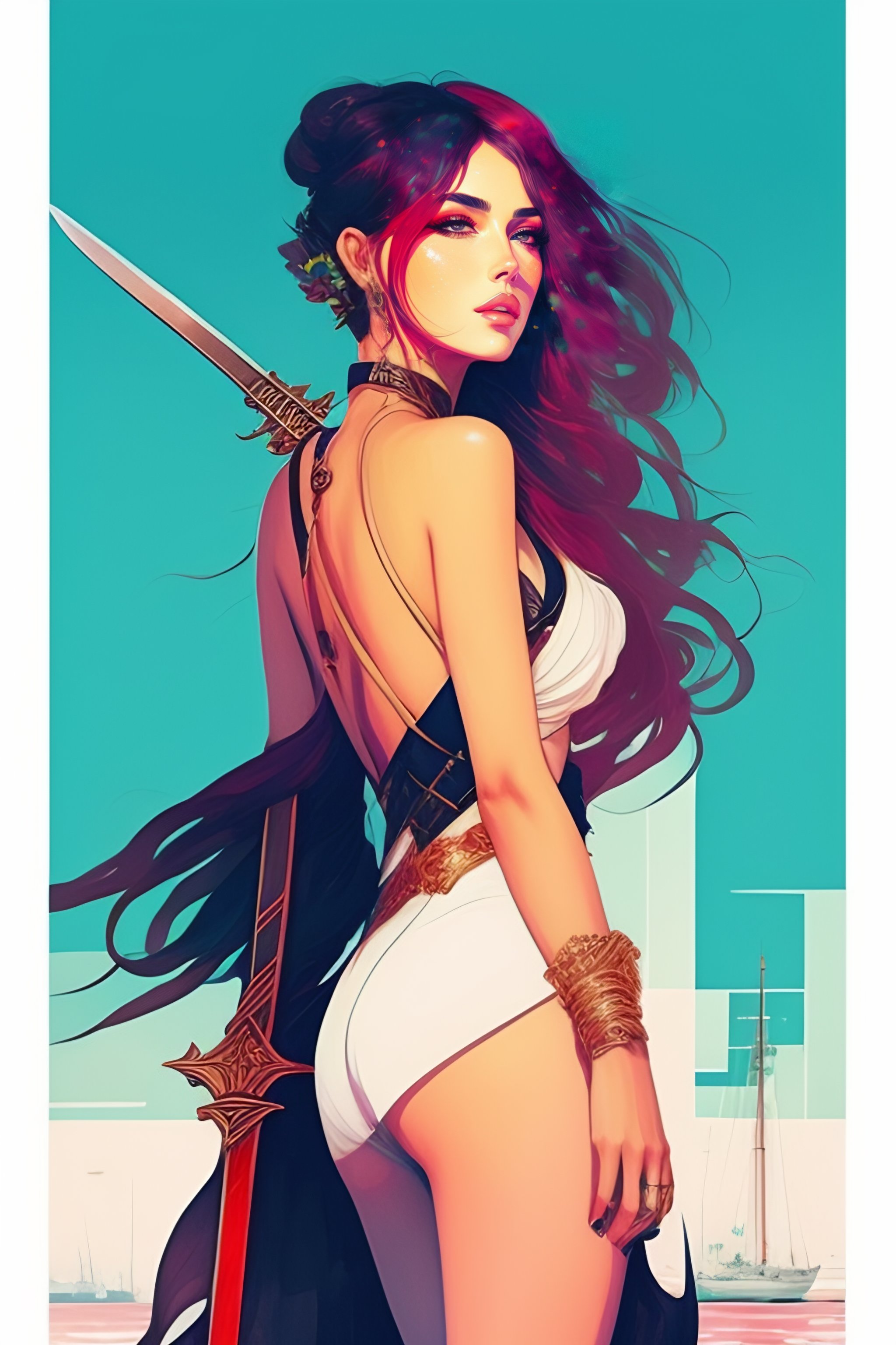 Portrait of a woman standing and looking over her shoulder with a greatsword on her back at a busy harbor view from the back art by conrad roset cinematic lighting