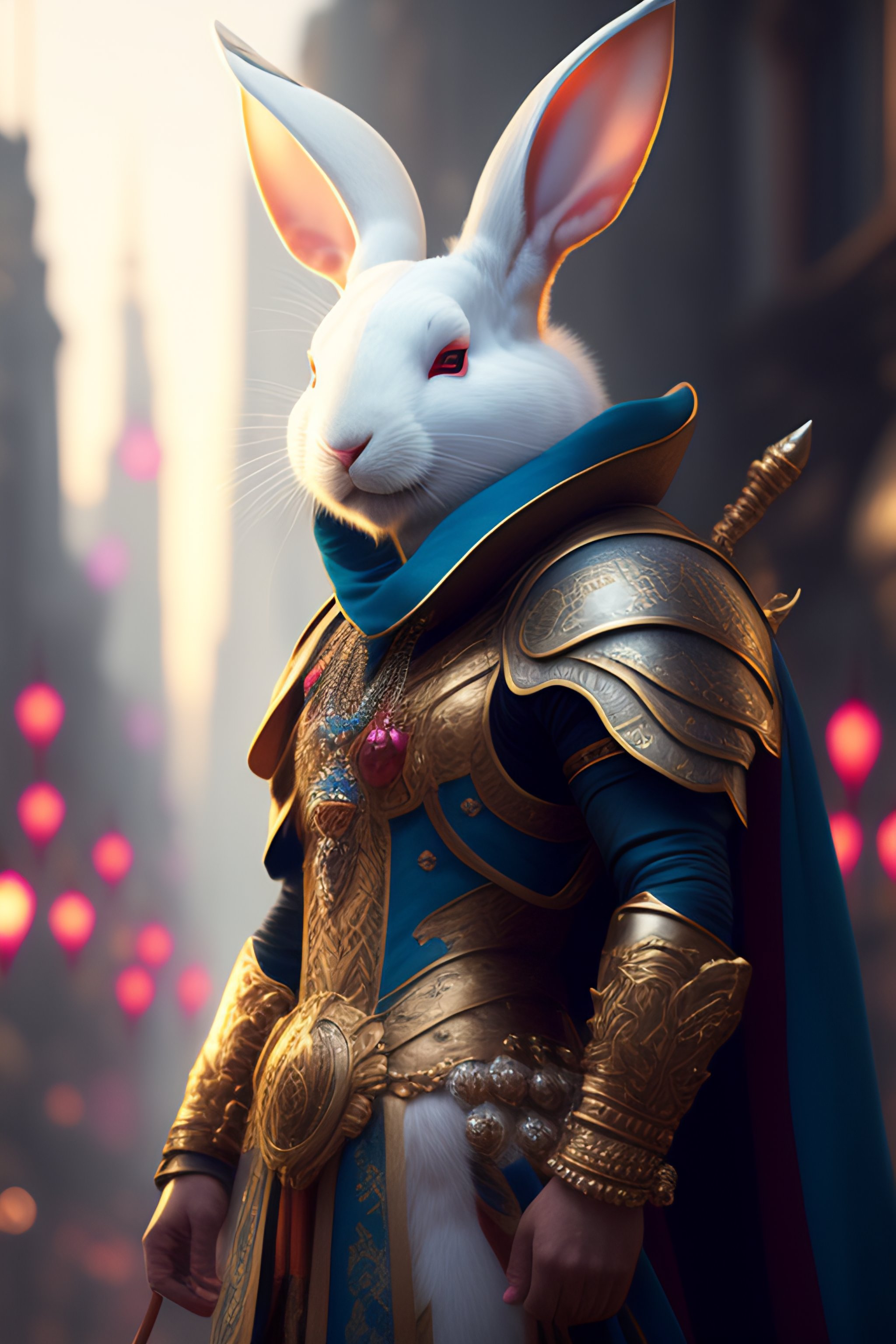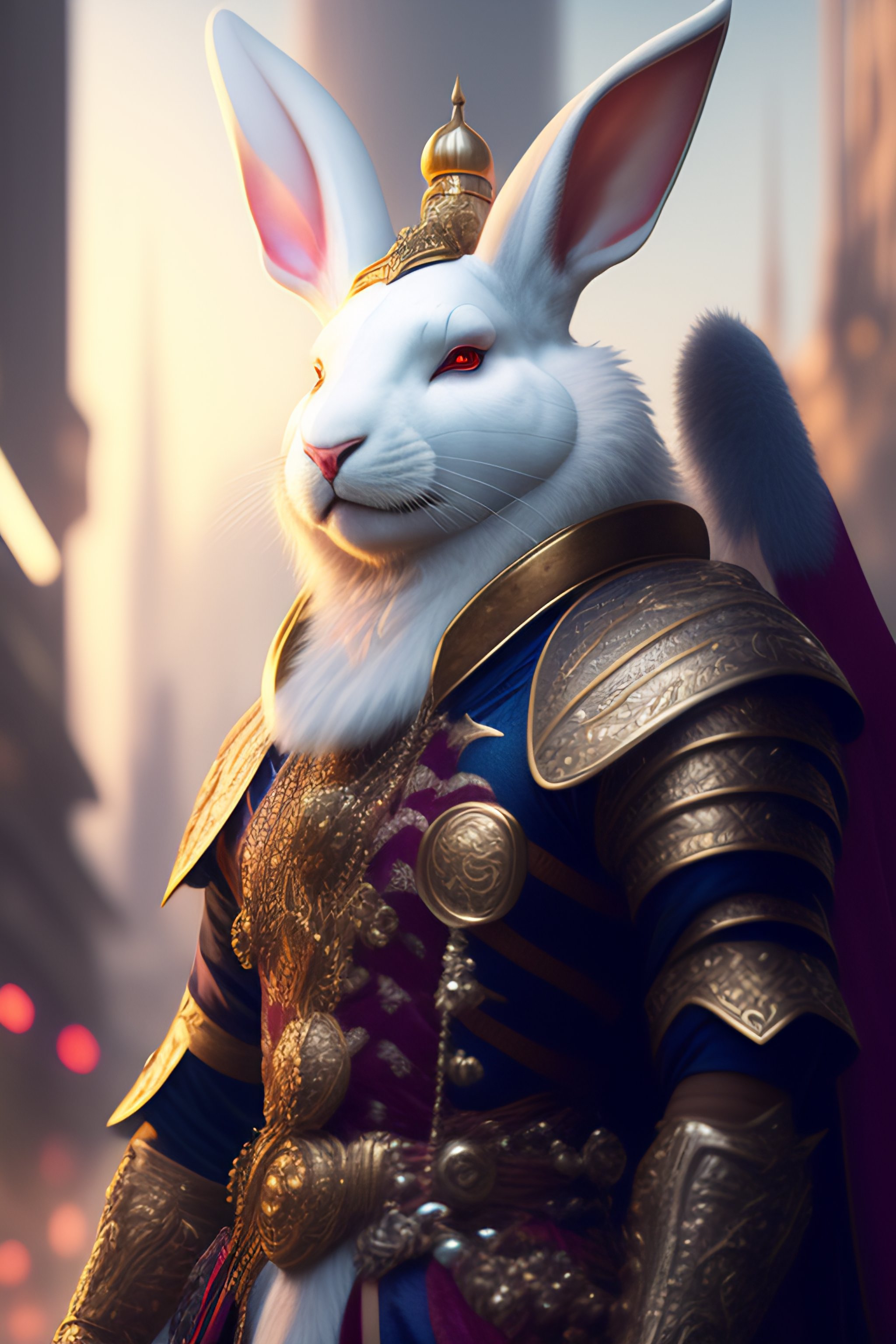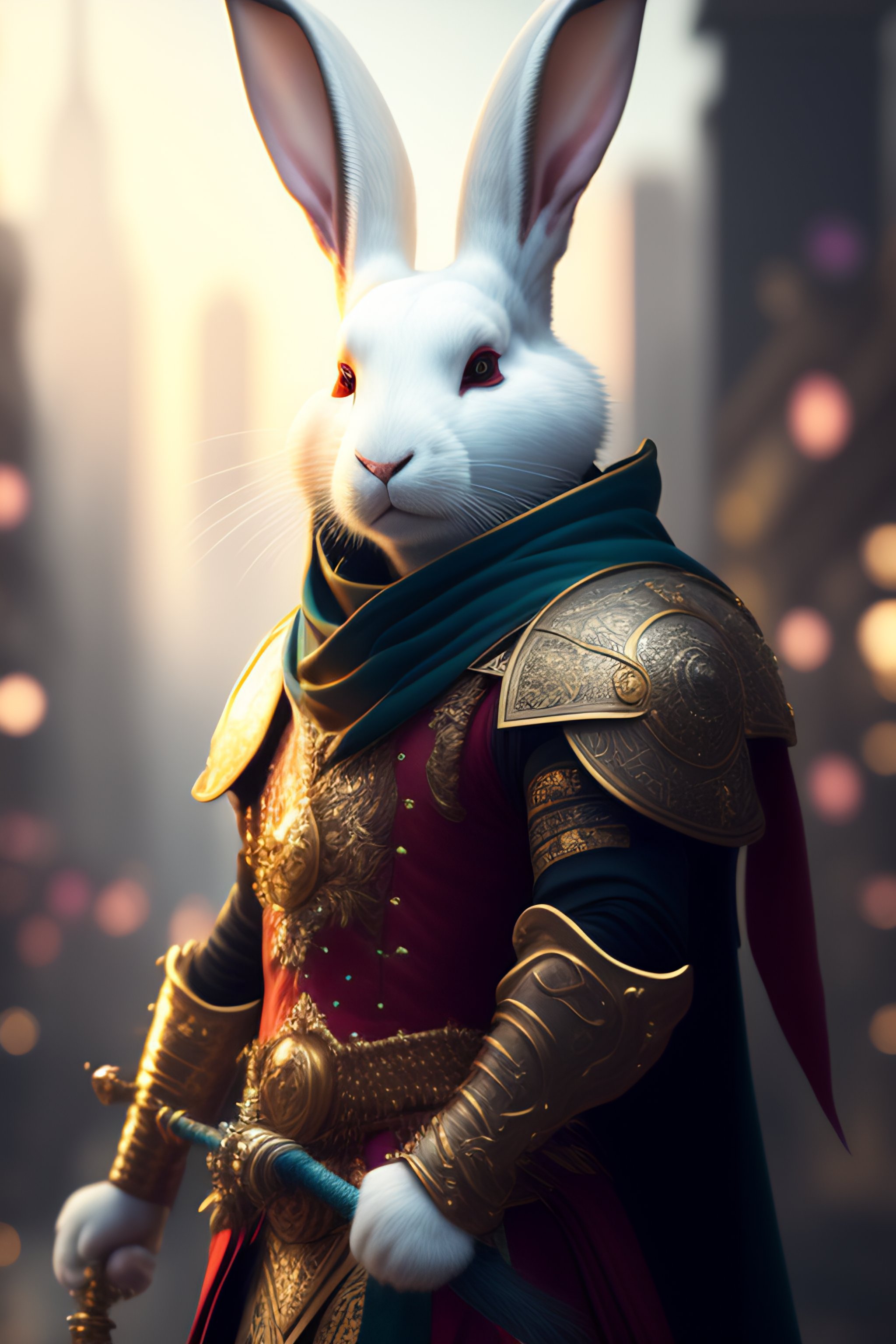 An anthropomorphic cool white rabbit, with a male wizard face, dressed as a punked warrior, with weapons, a city background, fine art, award-winning, intricate, elegant, sharp focus, cinematic lighting, highly detailed, digital painting, 8 k concept art, art by guweiz and z. w. gu, masterpiece, trending on artstation, 8 k
