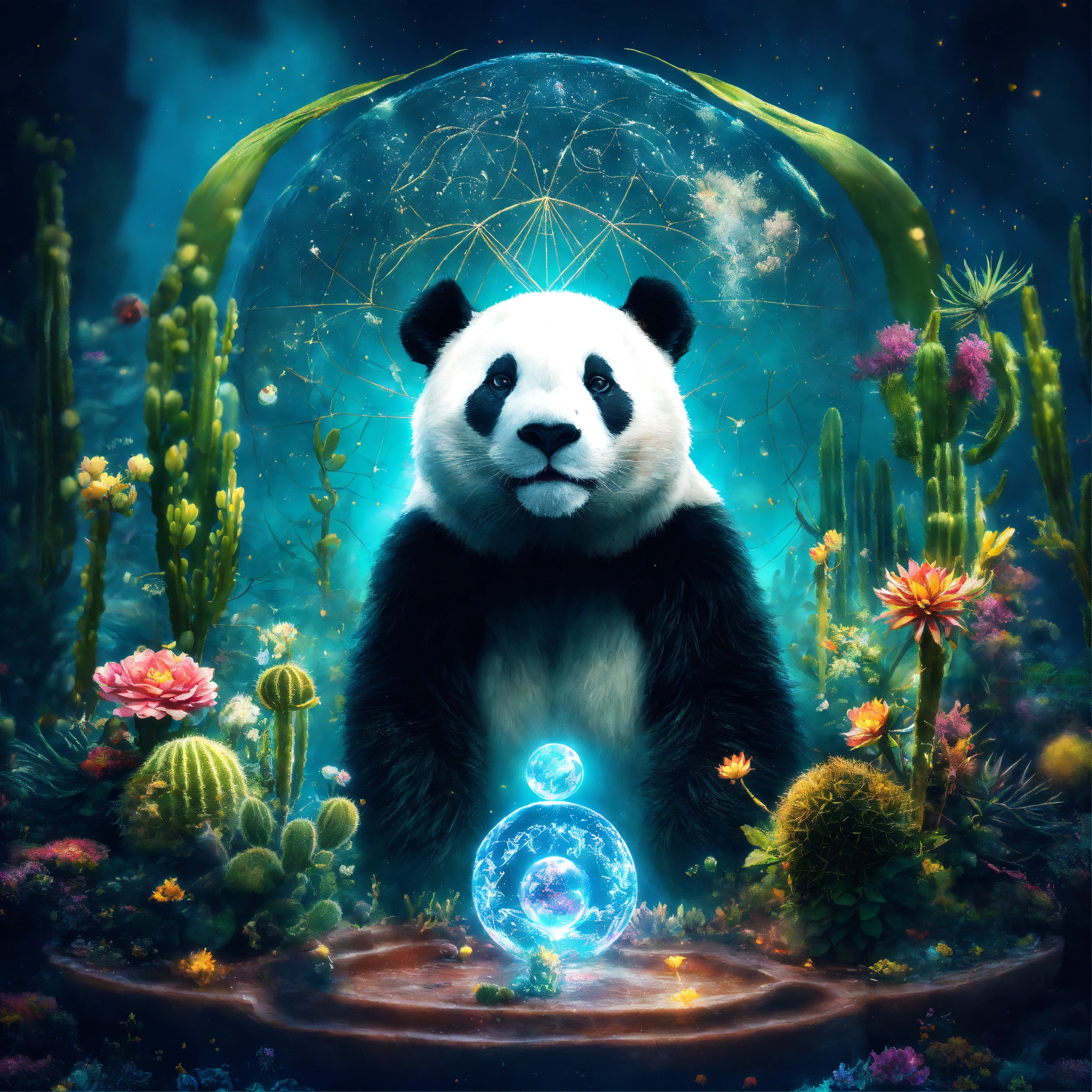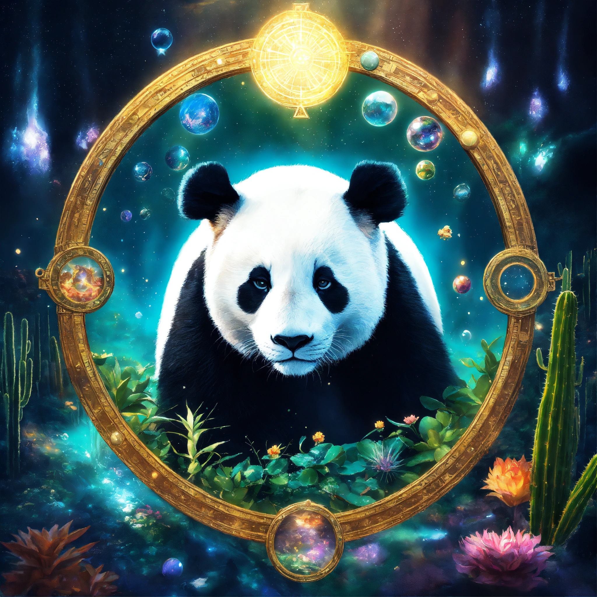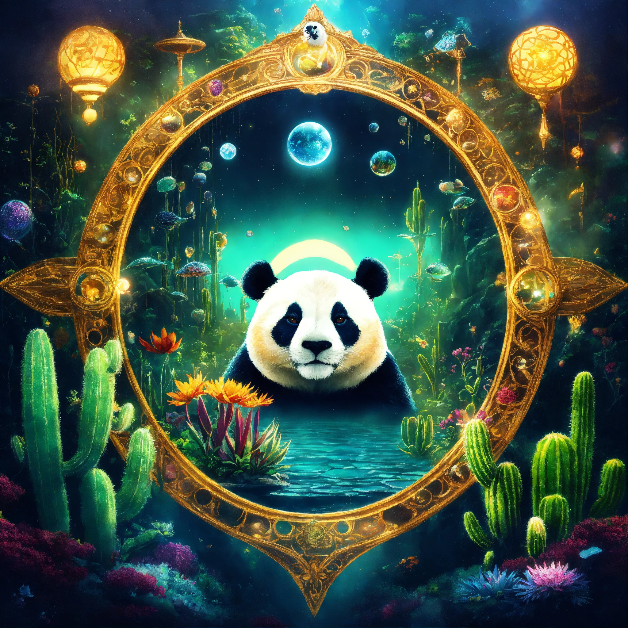 Underwater long exposure photography, a giant white panda flying in the cosmos in the daytime with orbs and cactus and portals, x-ray style, in the style of tim burton, harry potter, game of thrones, lion king, the chronicles of narnia, beauty and the beast, and peter pan. with sacred geometric patterns on the body. enchanting aura. the chronicles of narnia, wizard of oz, and alice in wonderland, harry potter background