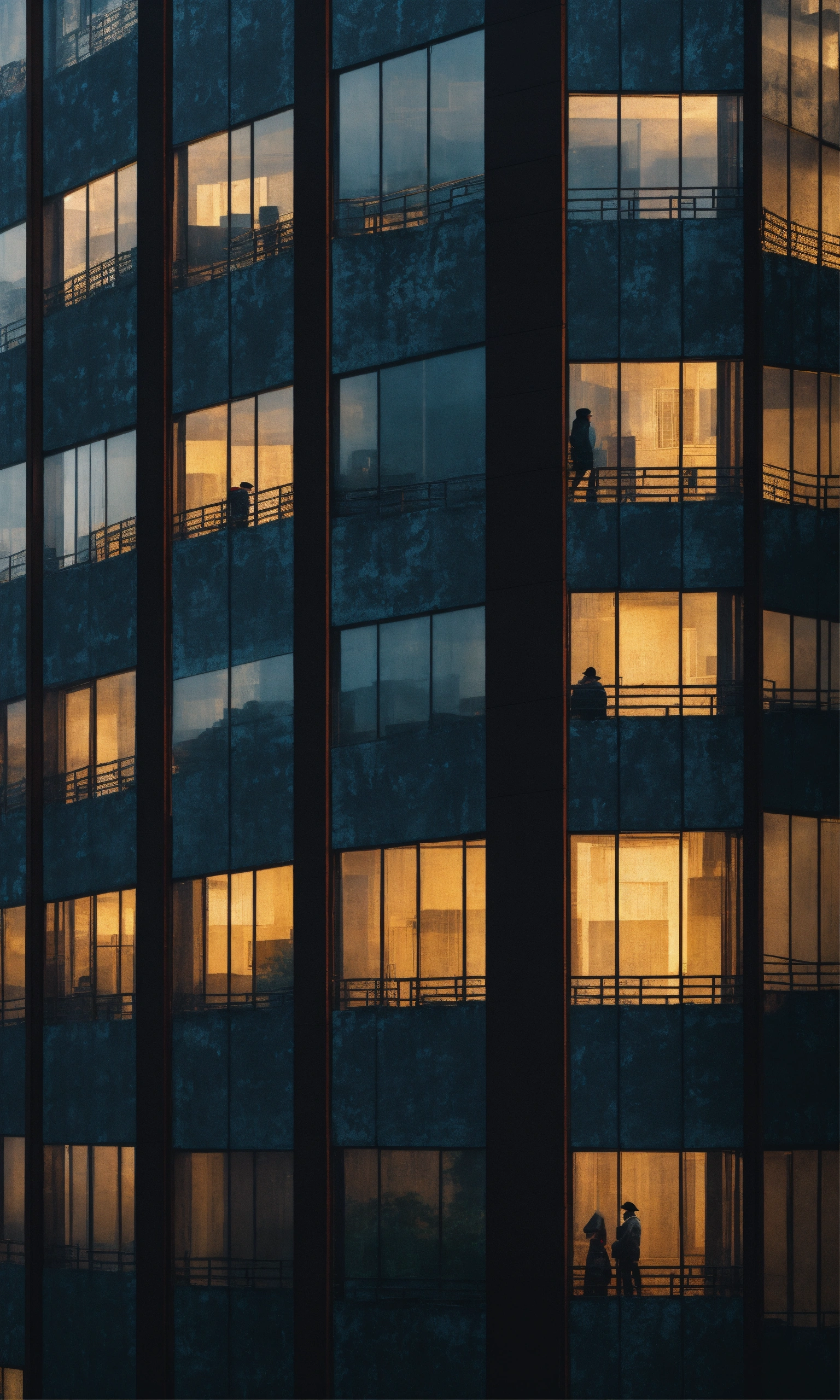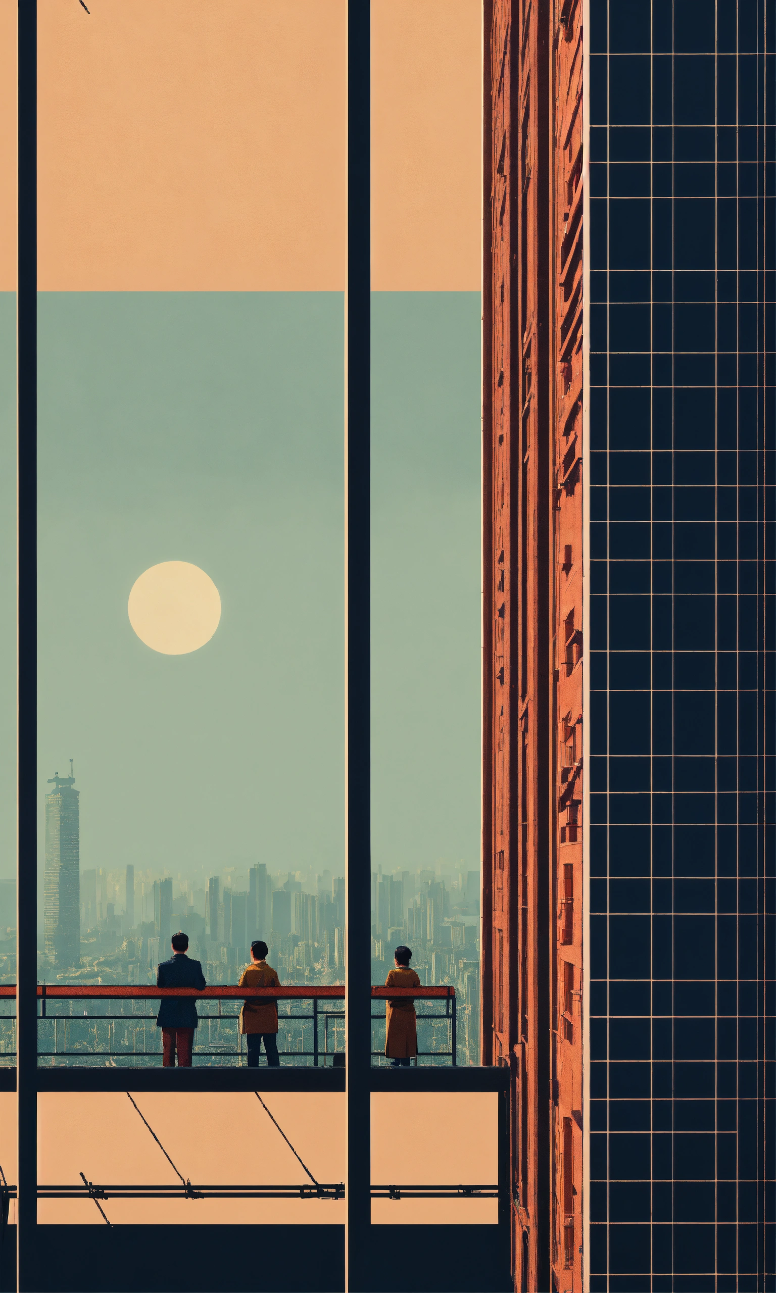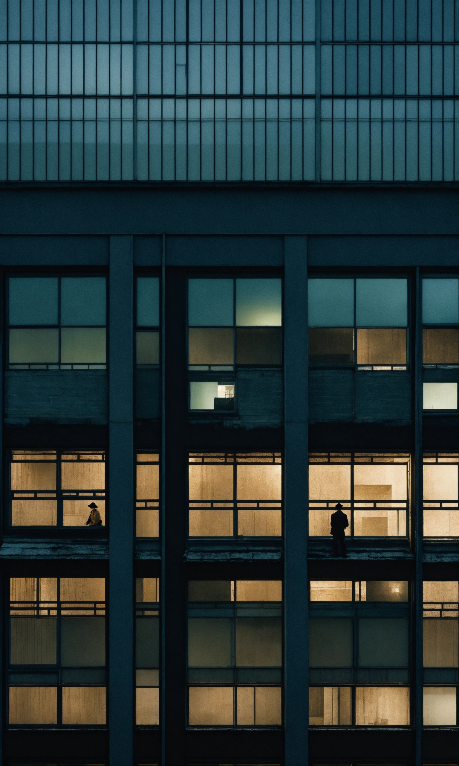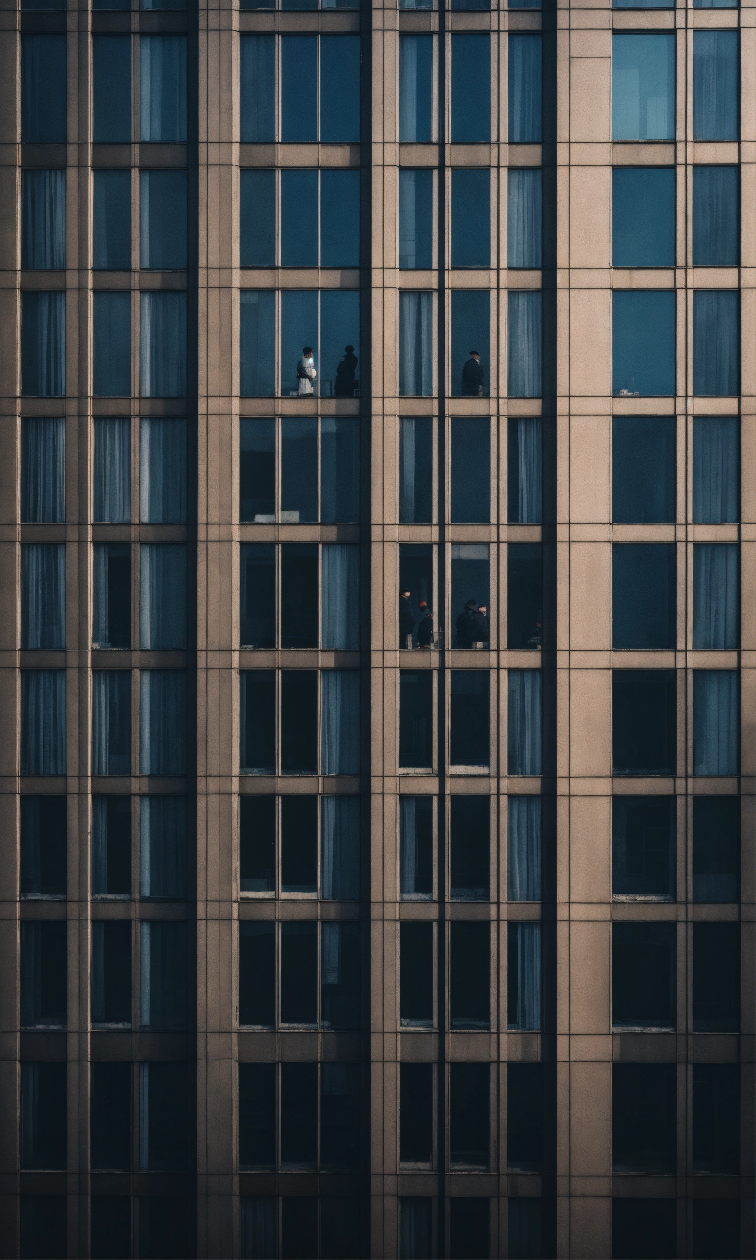 Some people look over tall building windows, in the style of dark hues, rural china, coded patterns, sparse and simple, uhd image, urbancore, sovietwave, negative space, award-winning design