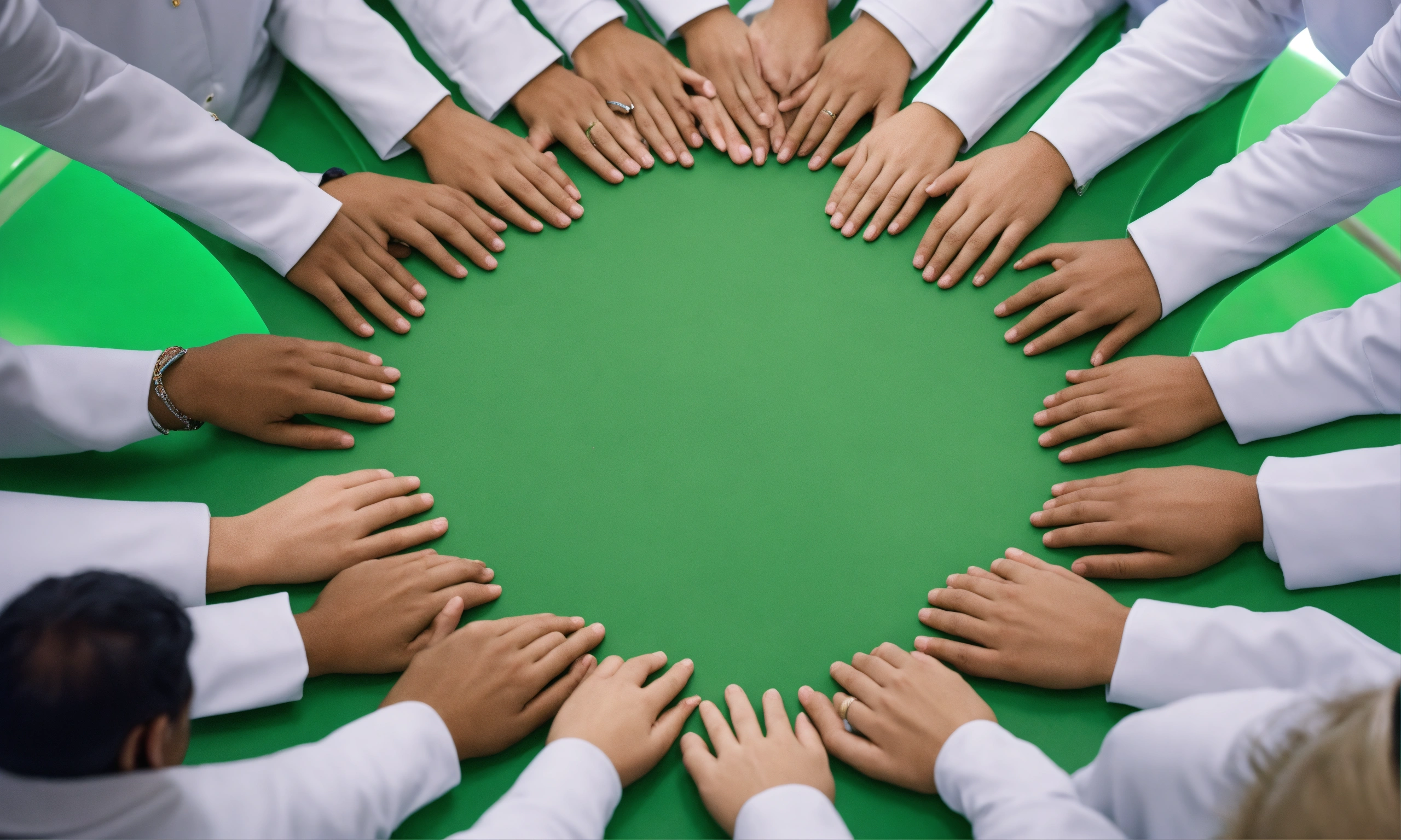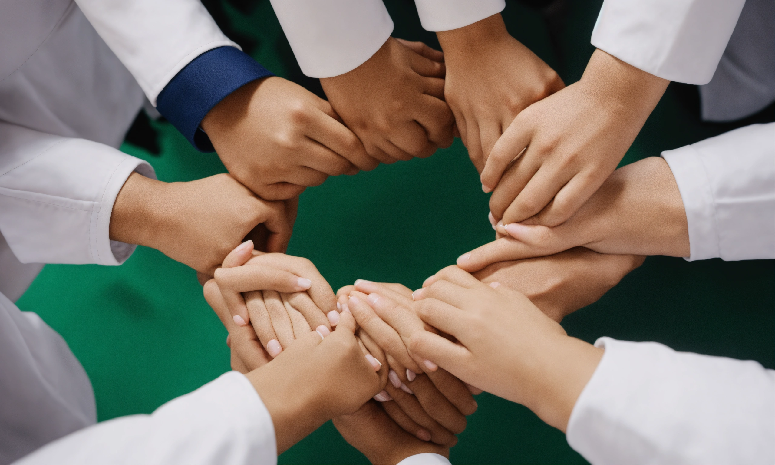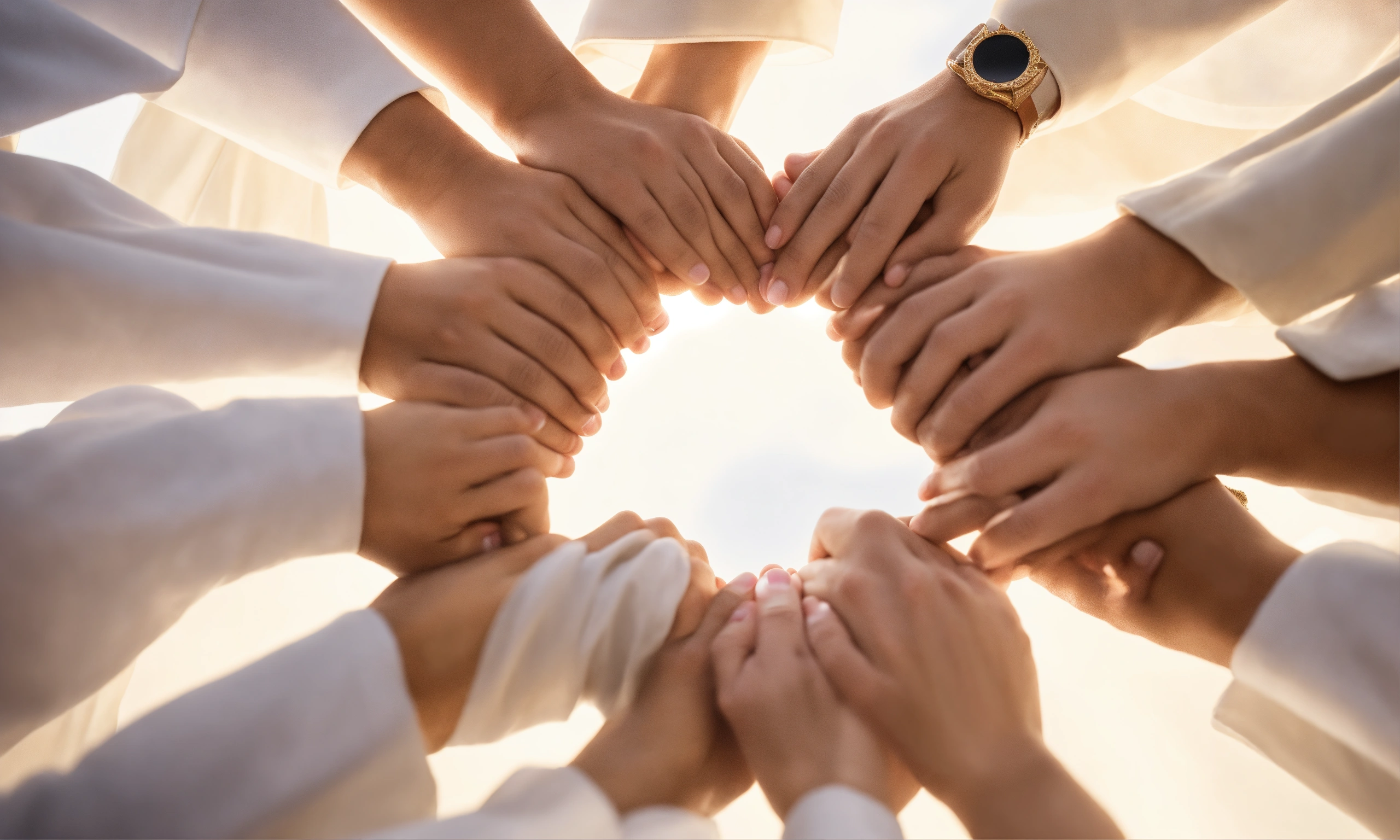 Close up of only 5 employees hands holding each other, circle shape, top view, saudi white costume, photo-realistic, 8k, high definition