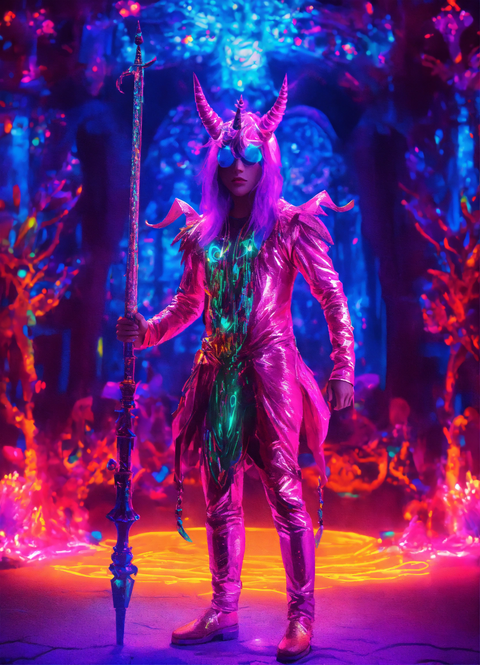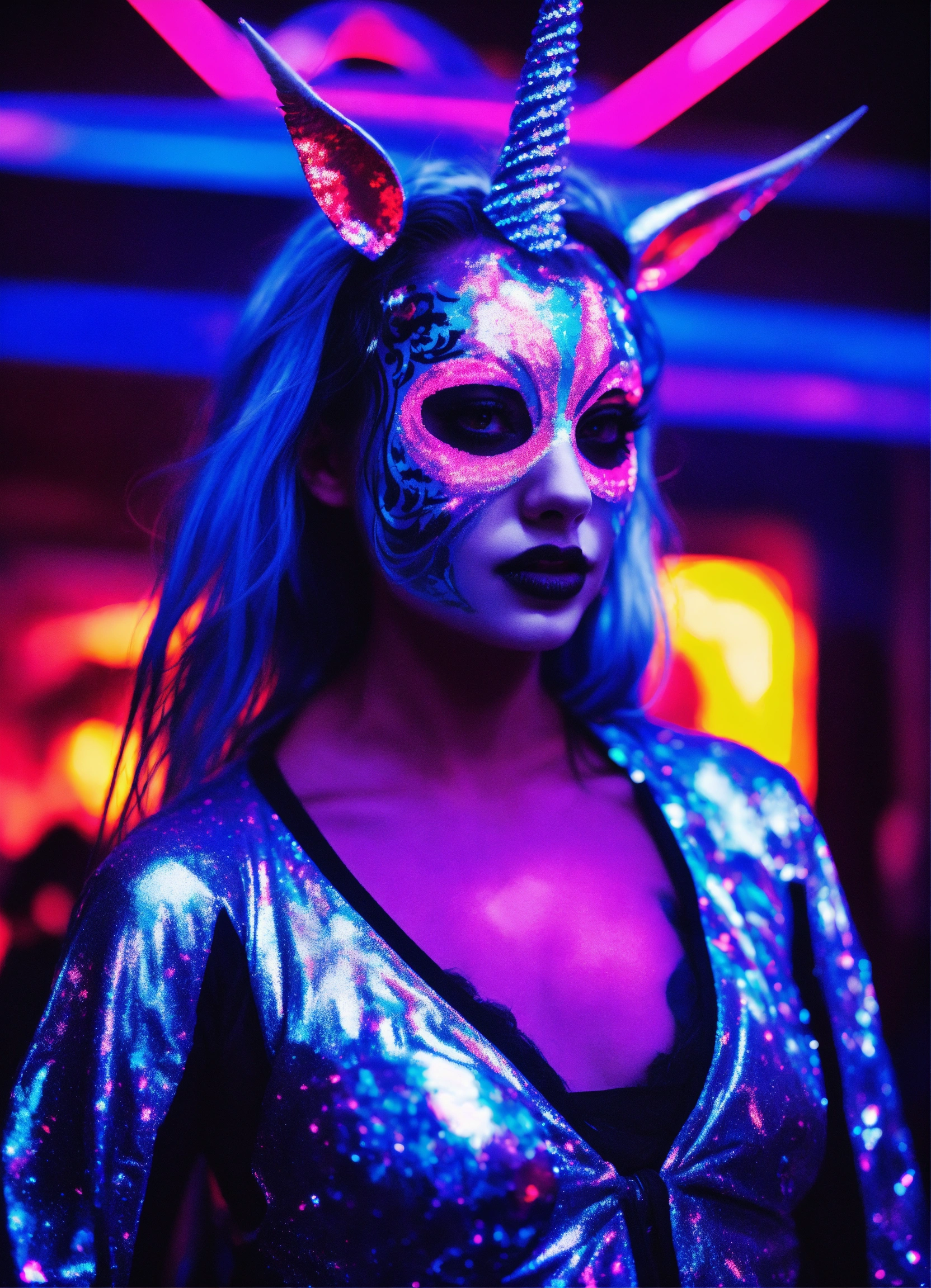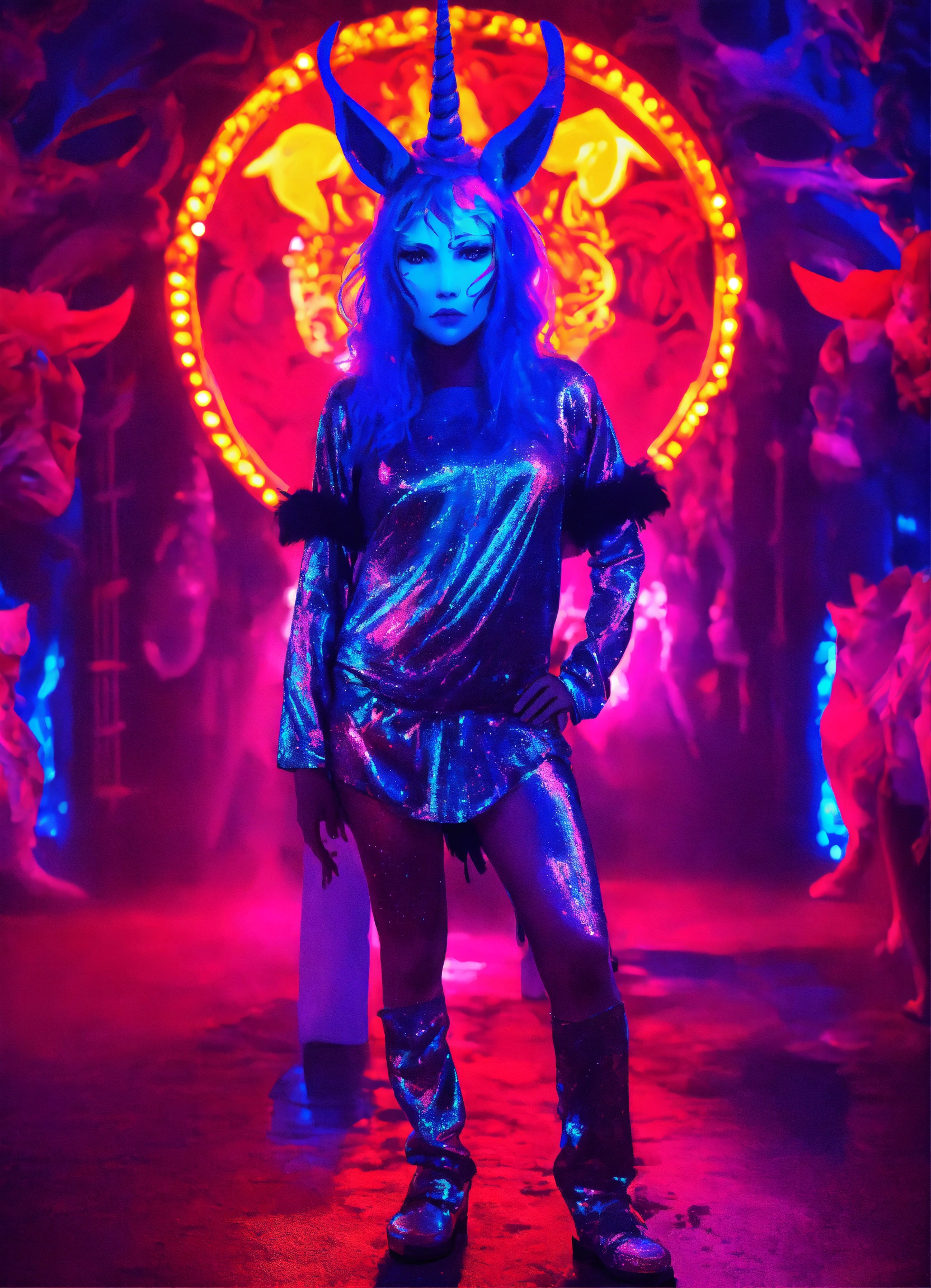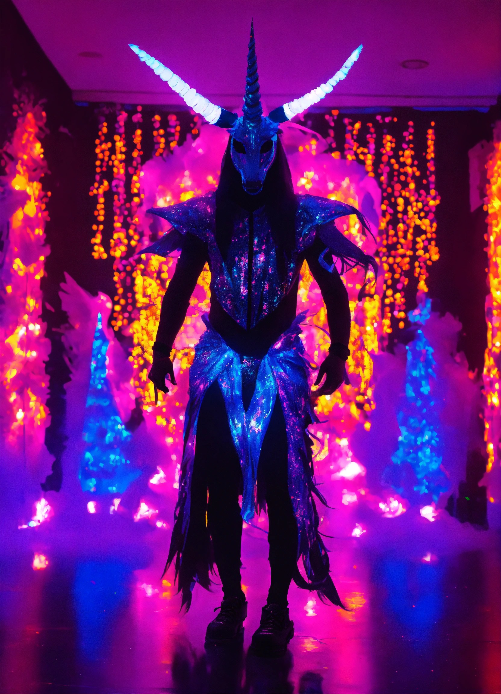 Full body the grudge in a shimmering unicorn costume in a blacklight dmt demon psytrance rave