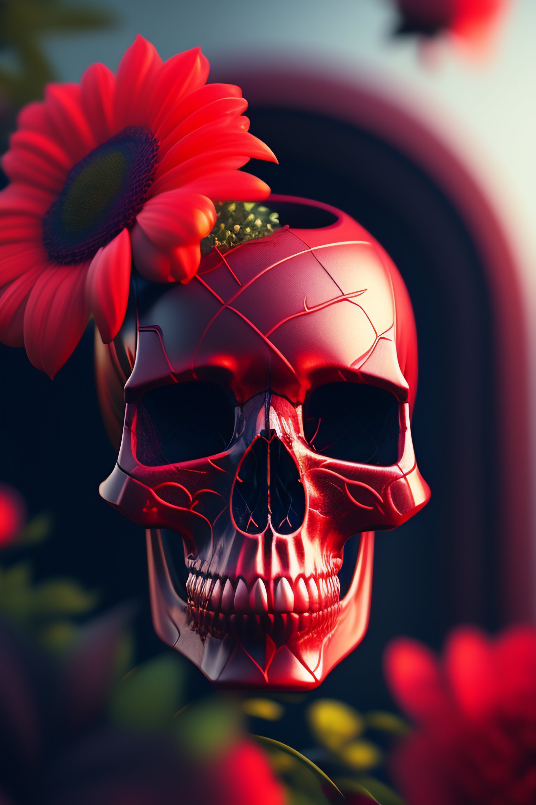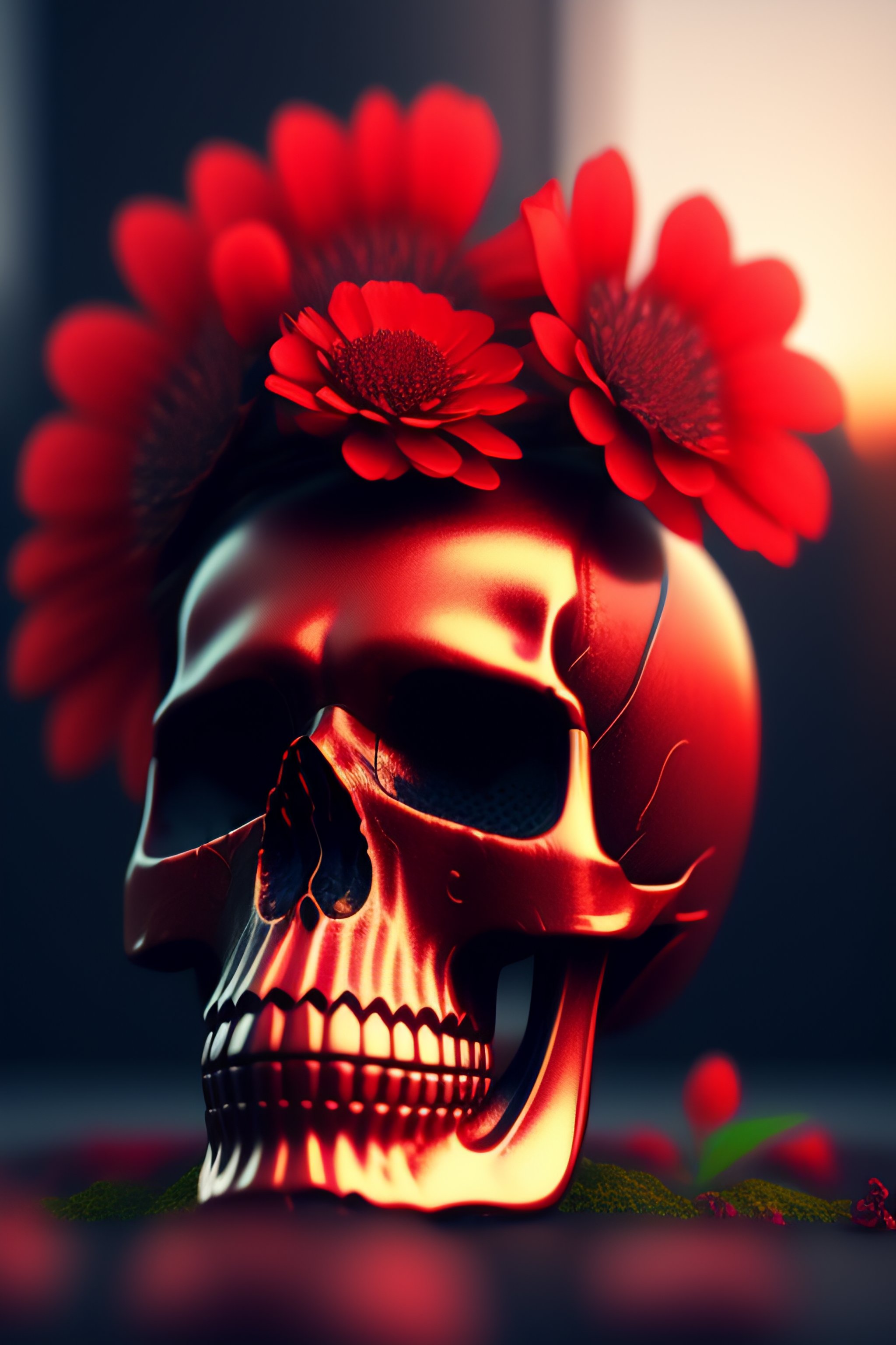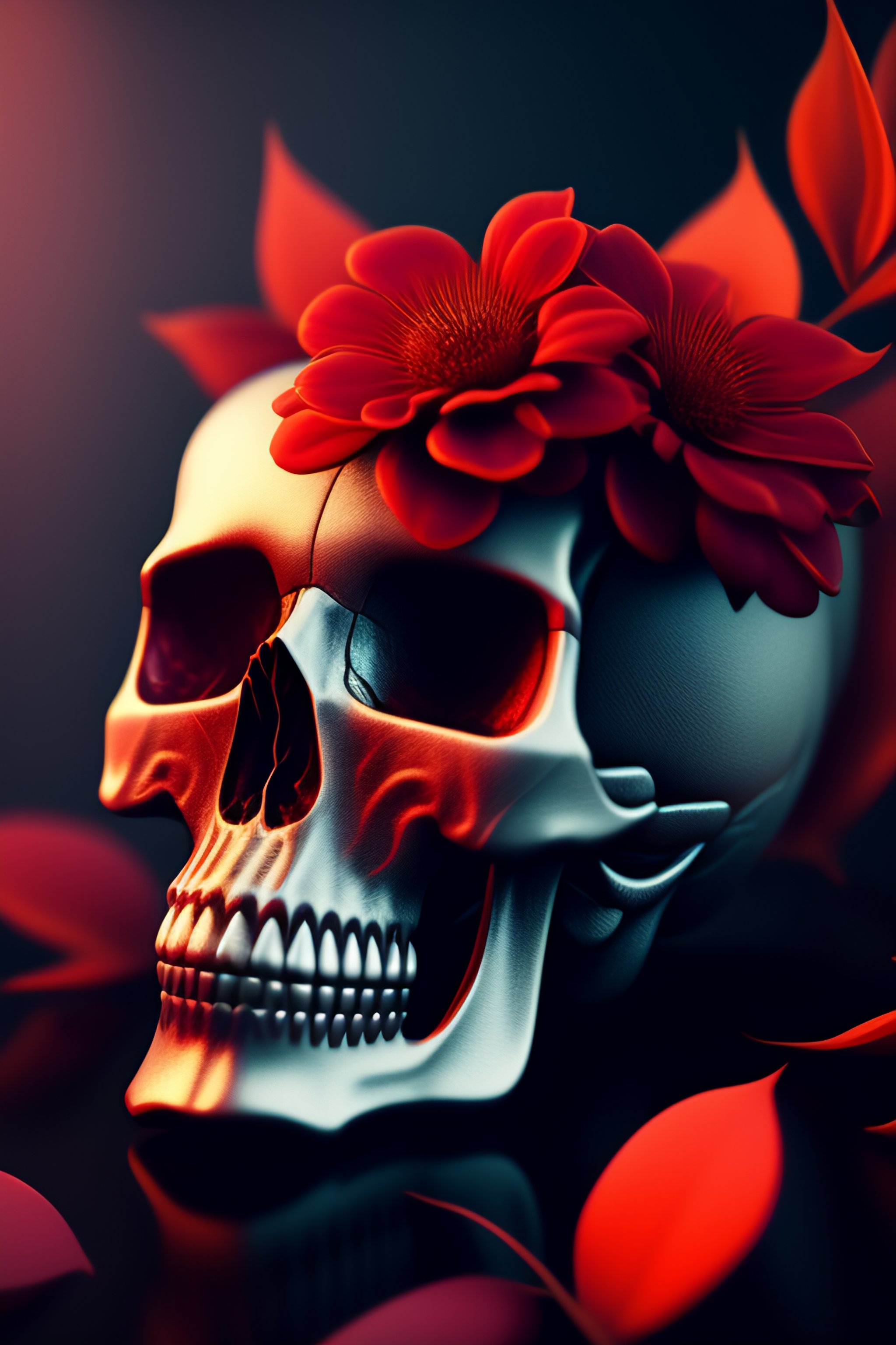 Skull, demon, flowers, dynamic composition, vertical composition, red leaves realistic, high detailed, hyper realism, 4k, 8k, octane render