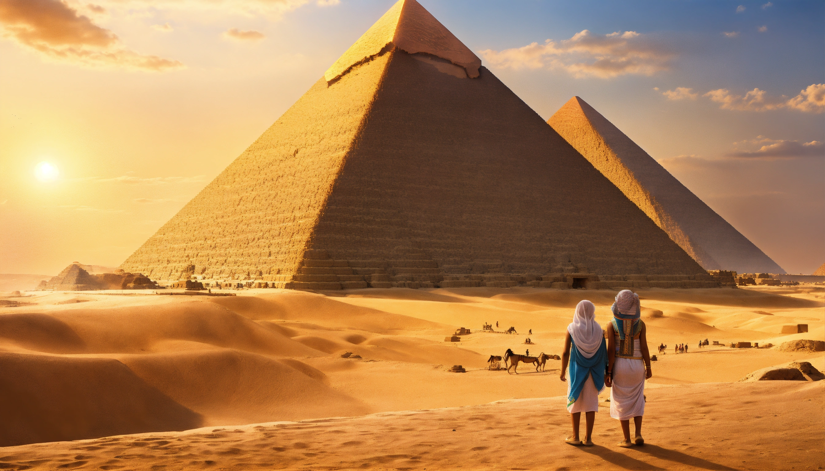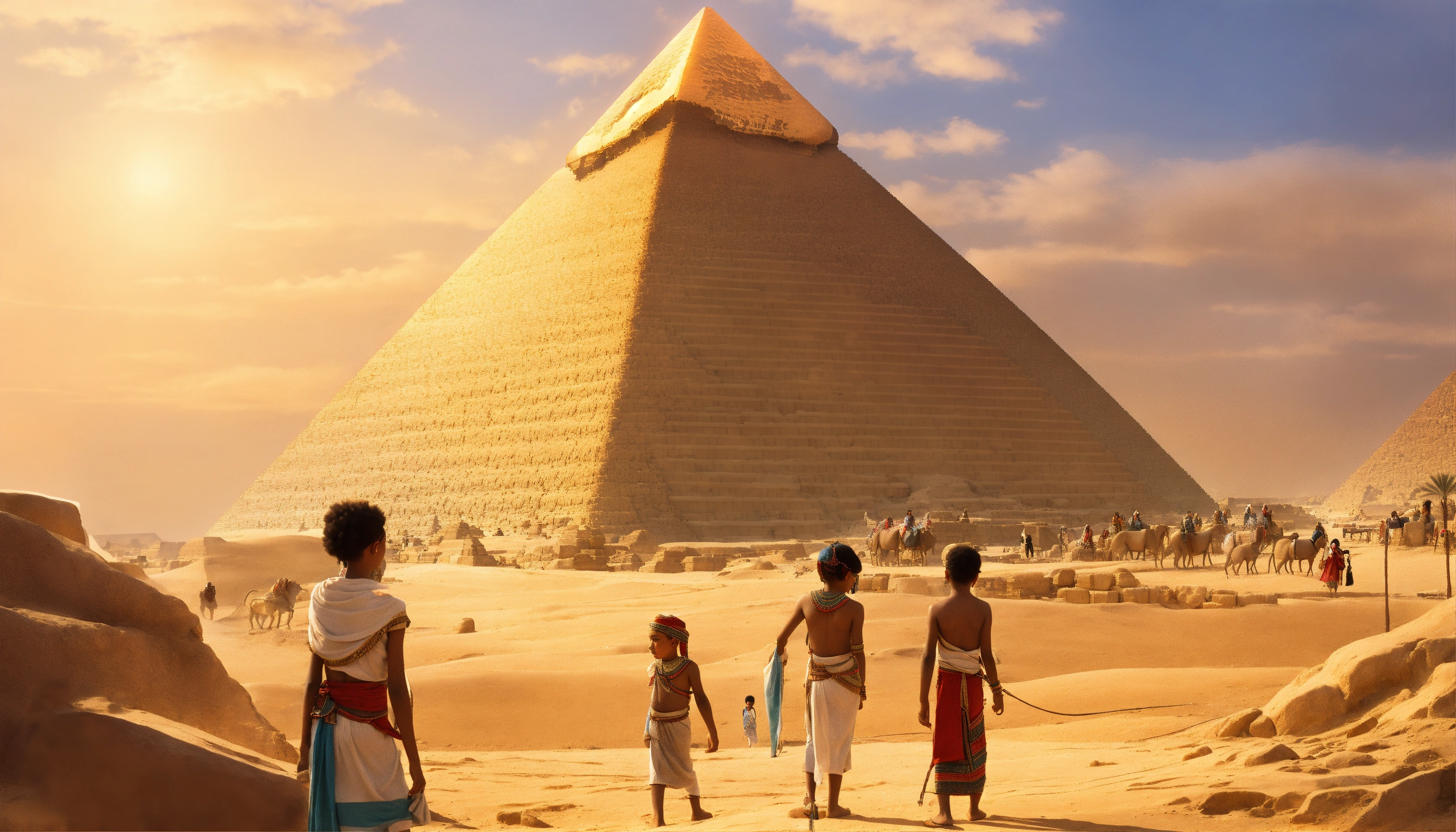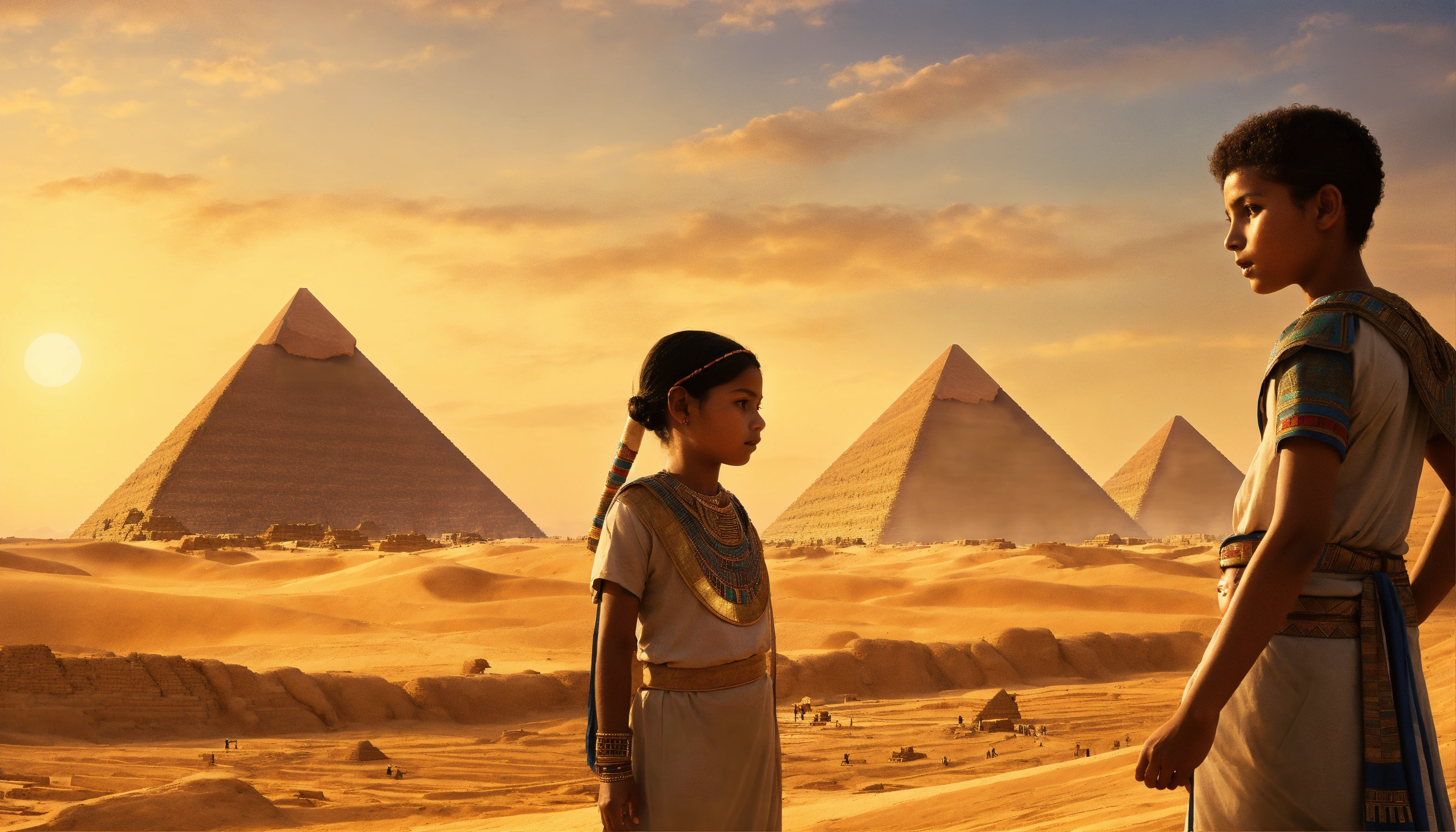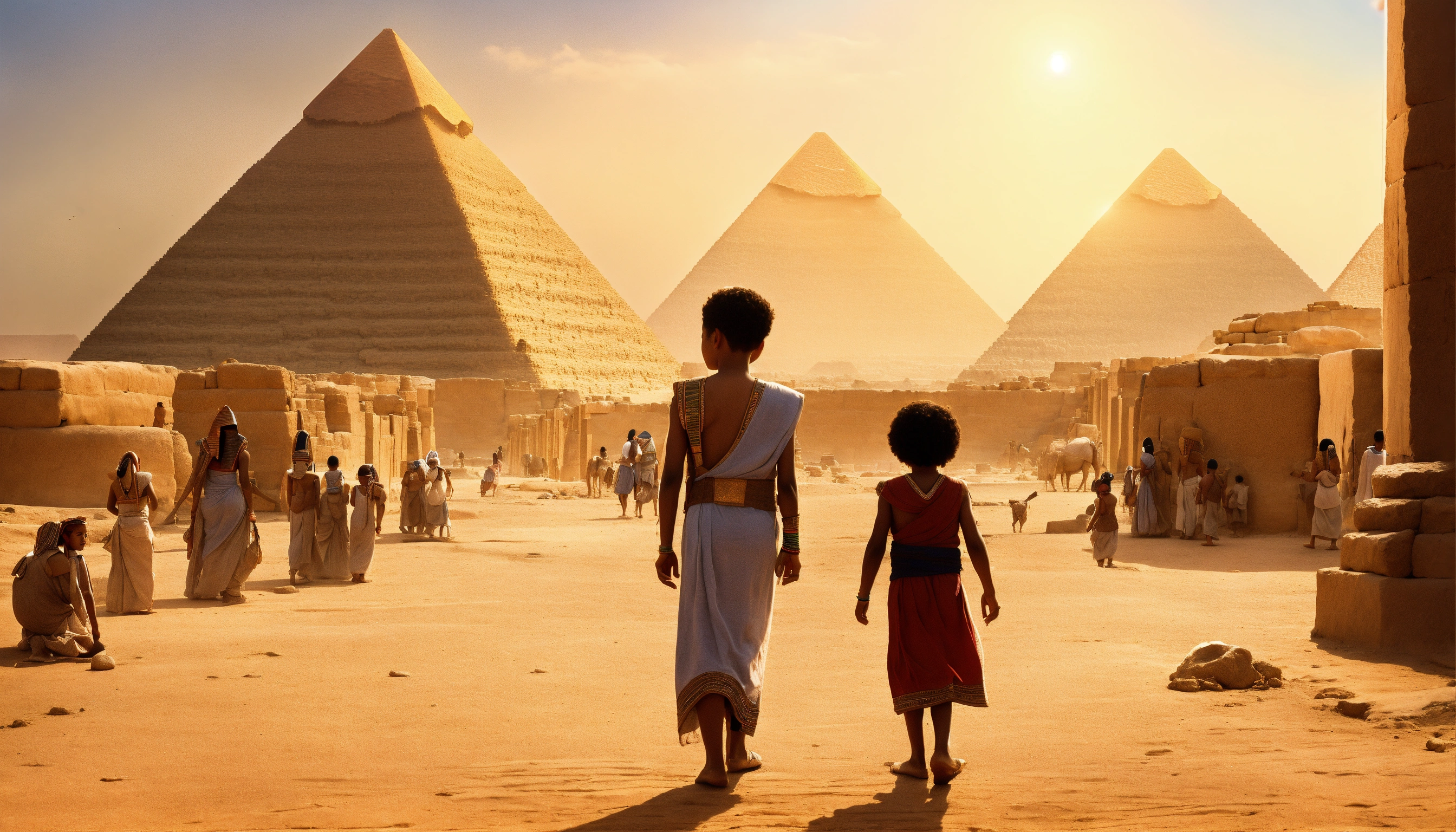Two inquisitive children - the girl tuule taira and her brother prokopa vincenza find themselves in the bustling streets of ancient egypt, people in traditional egyptian attire go about their daily activities, the great pyramids loom in the distance