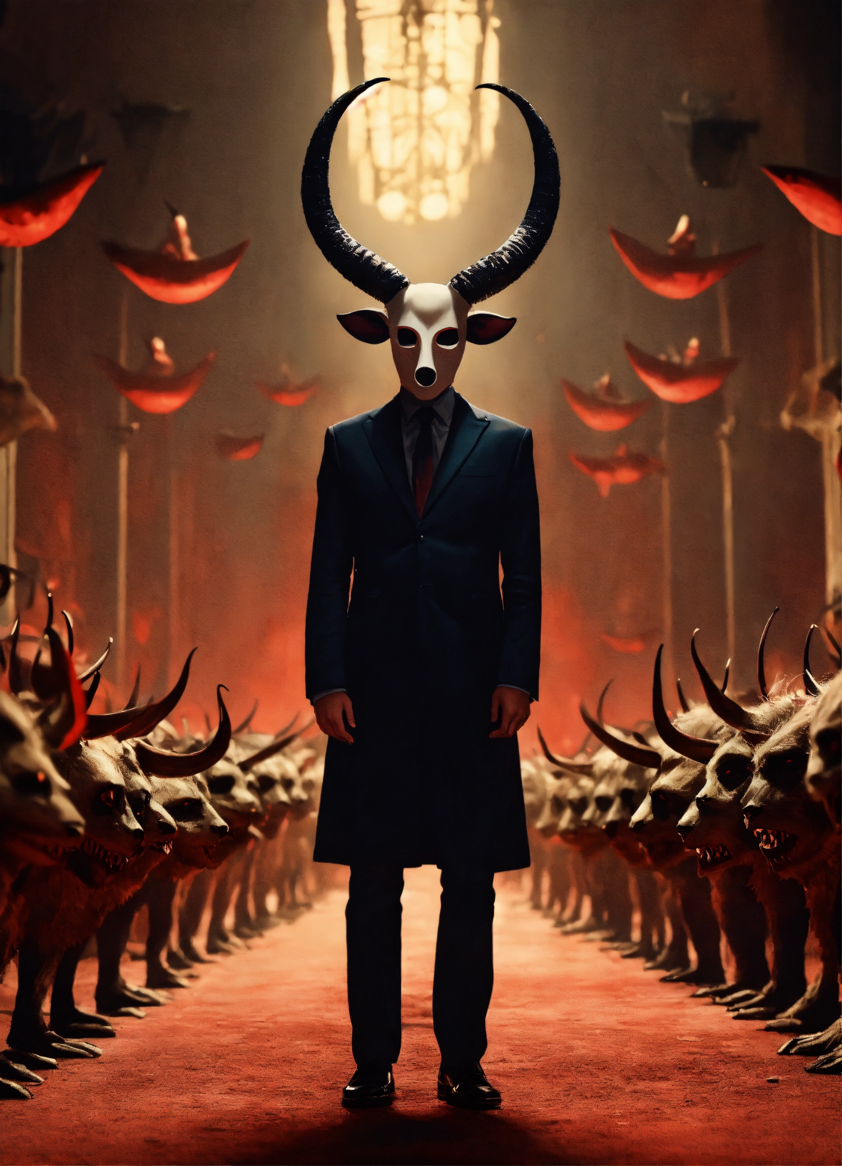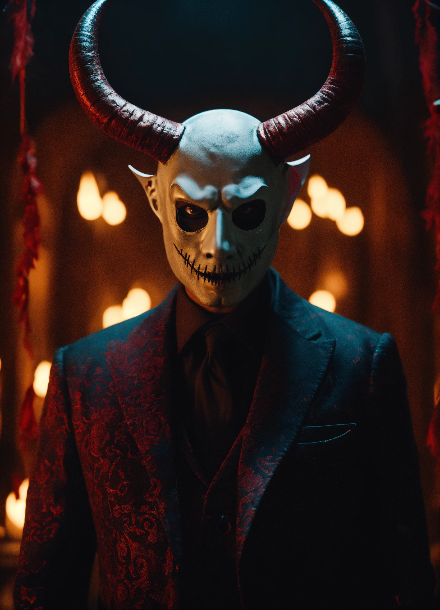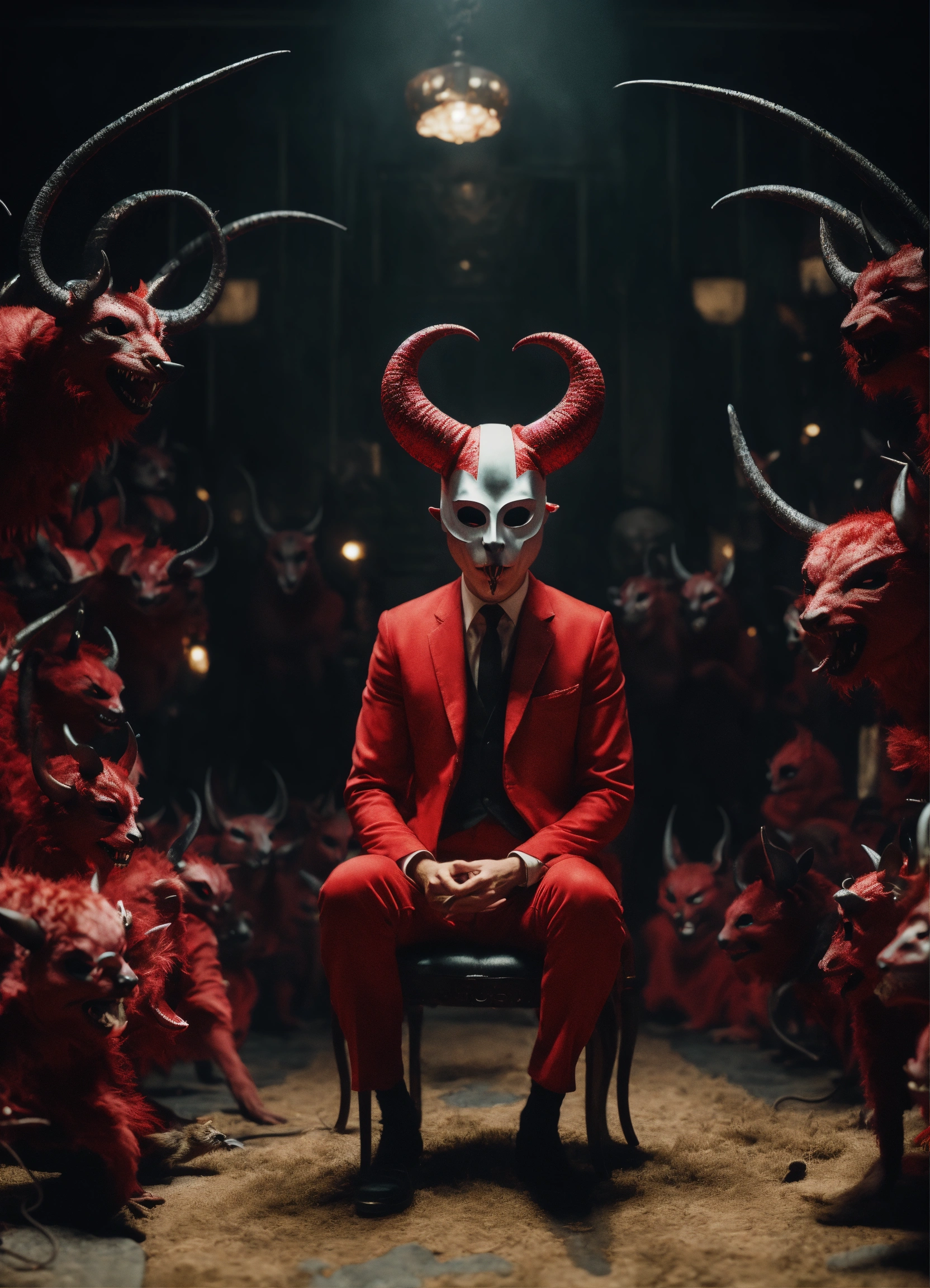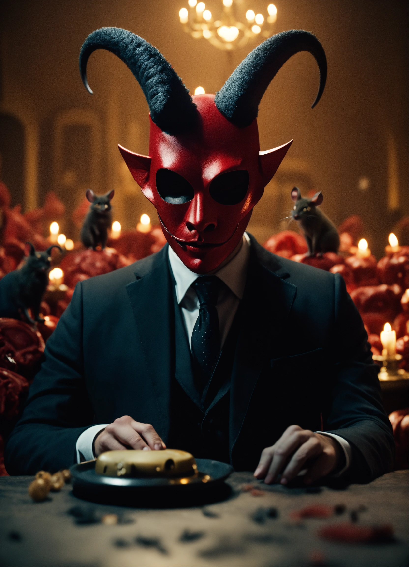 Award - winning cinematic still of the devil with a mouse mask, behind him all his demons. tim burton style. 8k