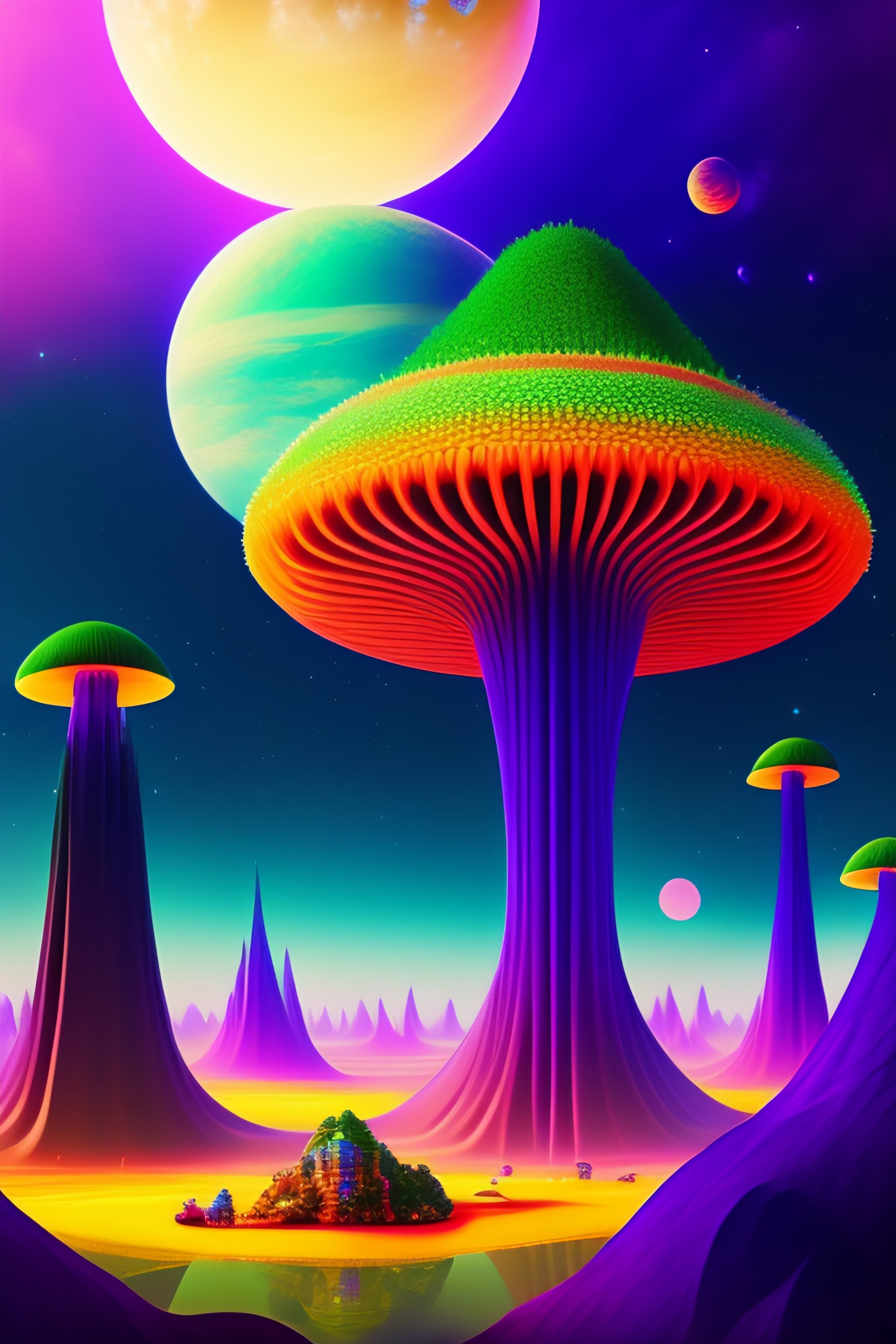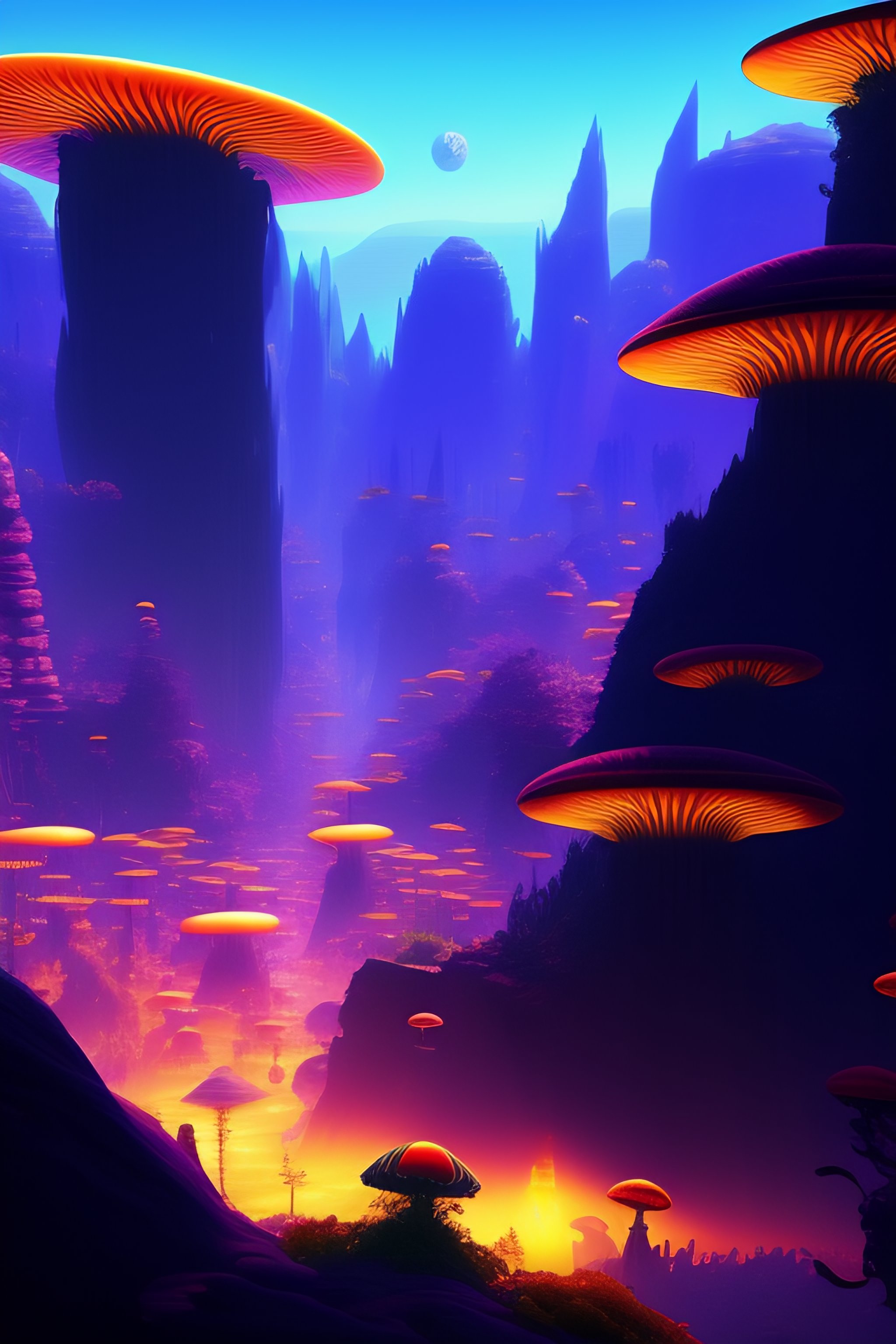 Epic alien world with a jungle made out of psychedelic mushrooms and futuristic aliens