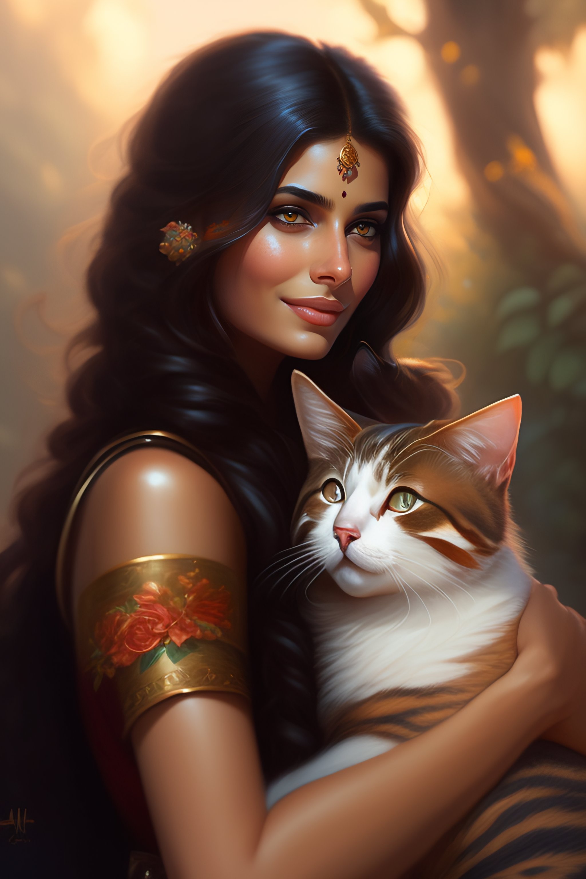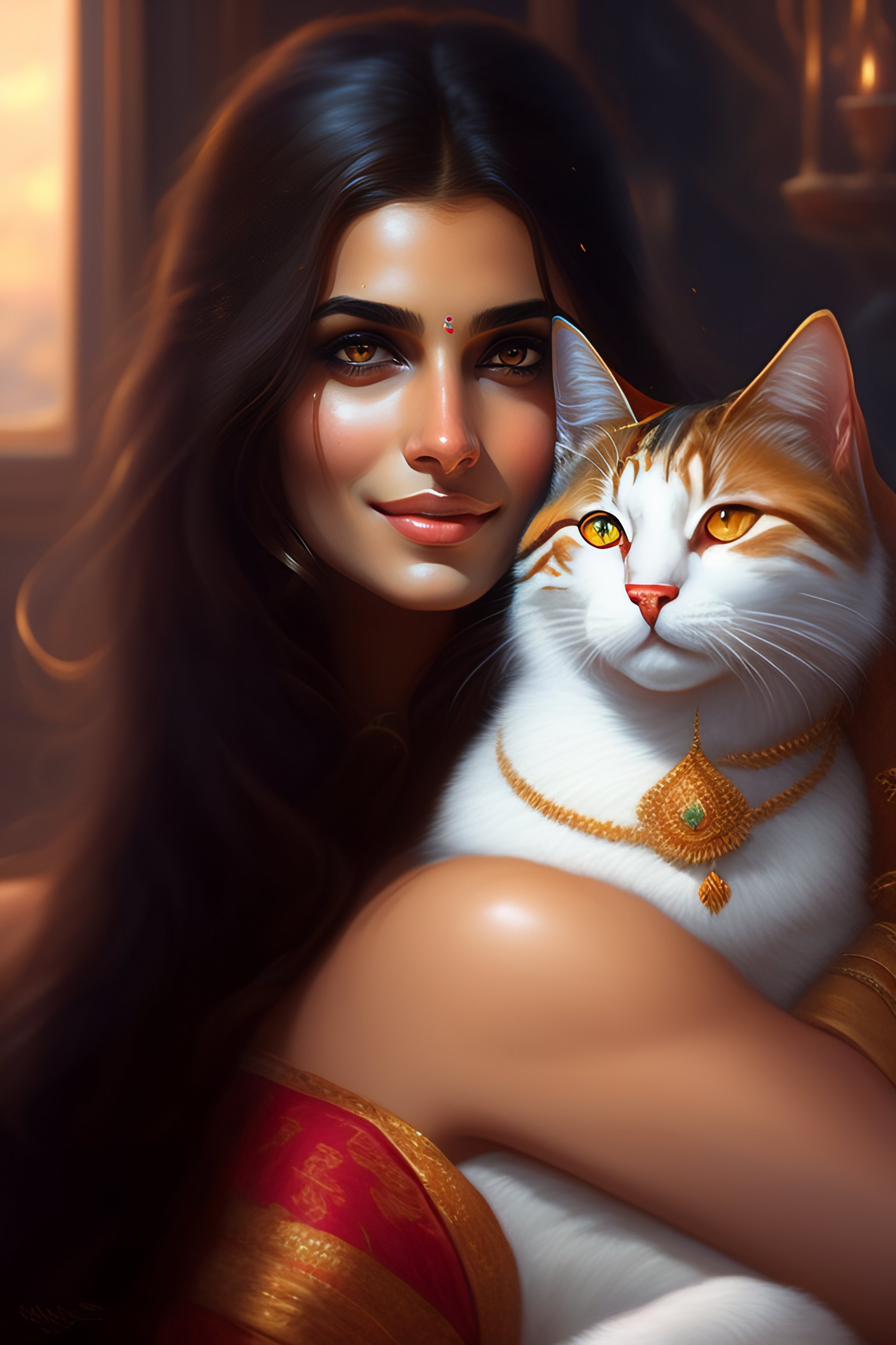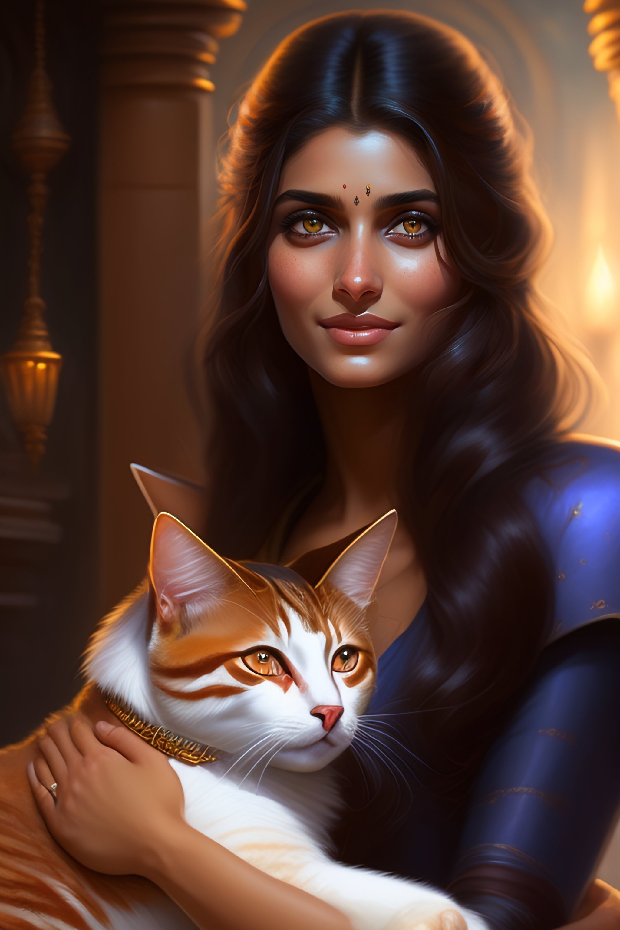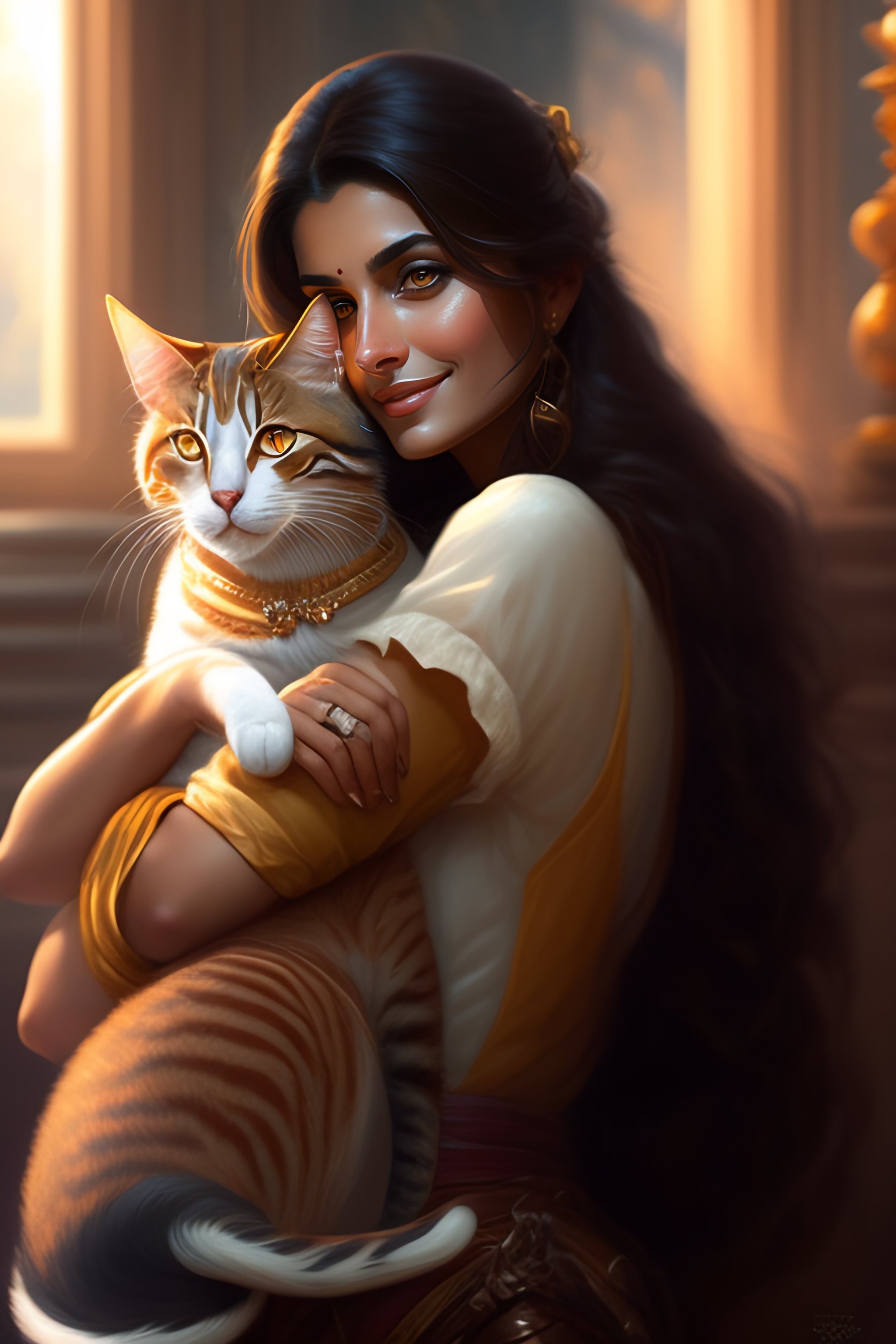 A detailed portrait of a cute calm brunette woman aishwarya ray, indian actress hugging a tabby cat illustrator, by justin gerard and greg rutkowski, digital art, realistic painting, dnd, character design, trending on artstation