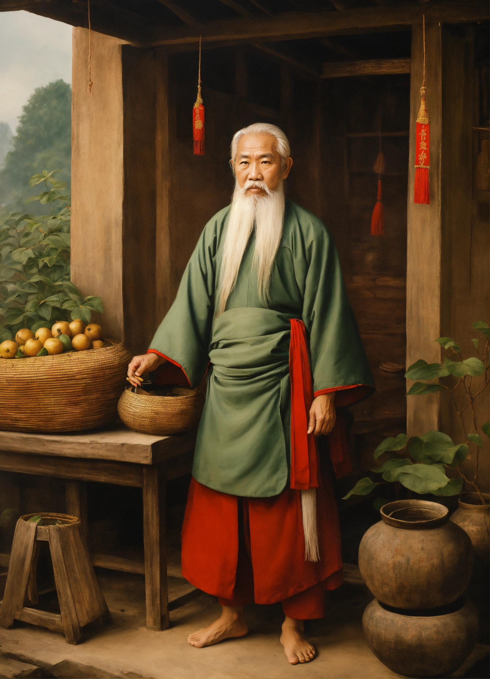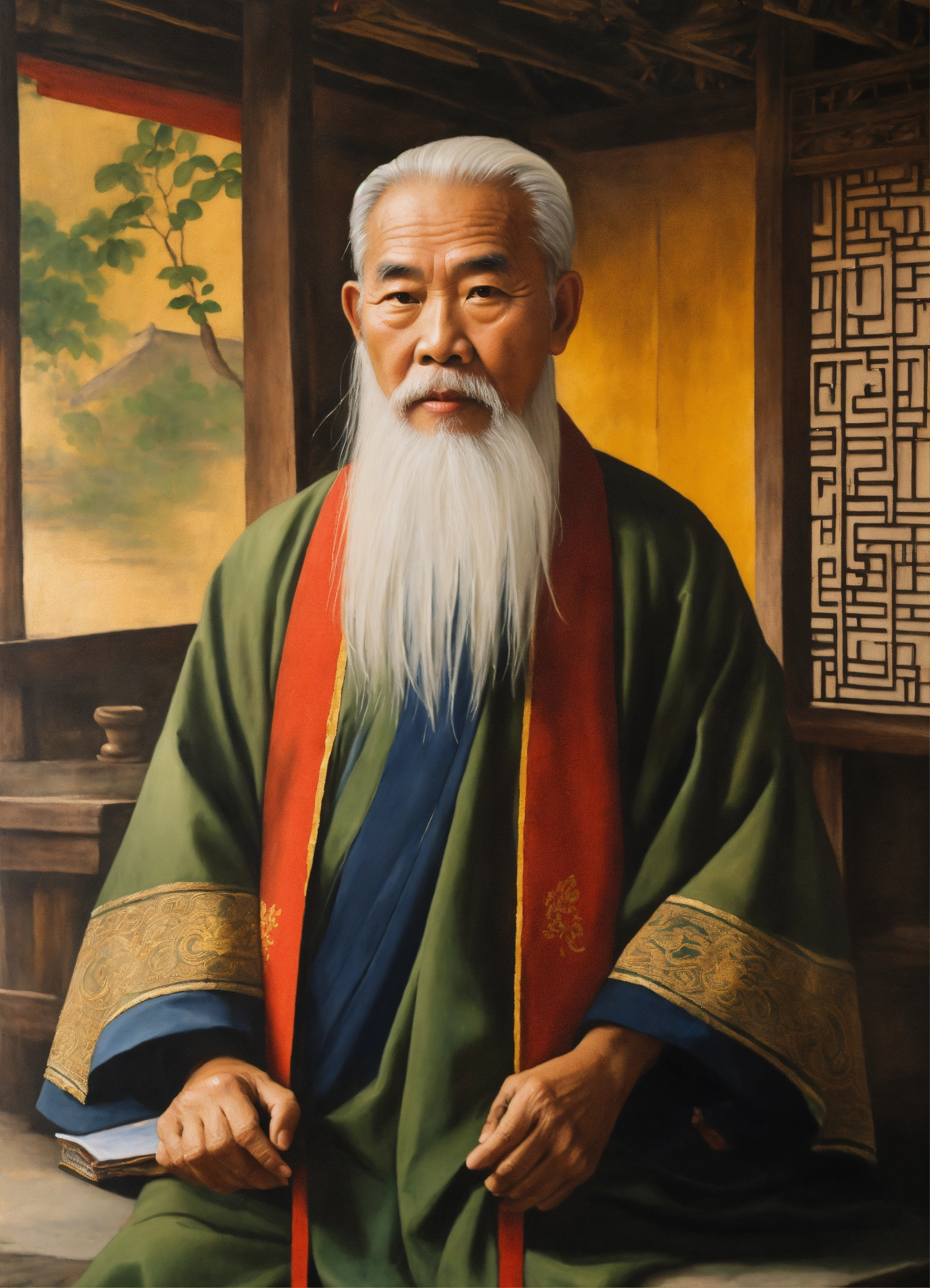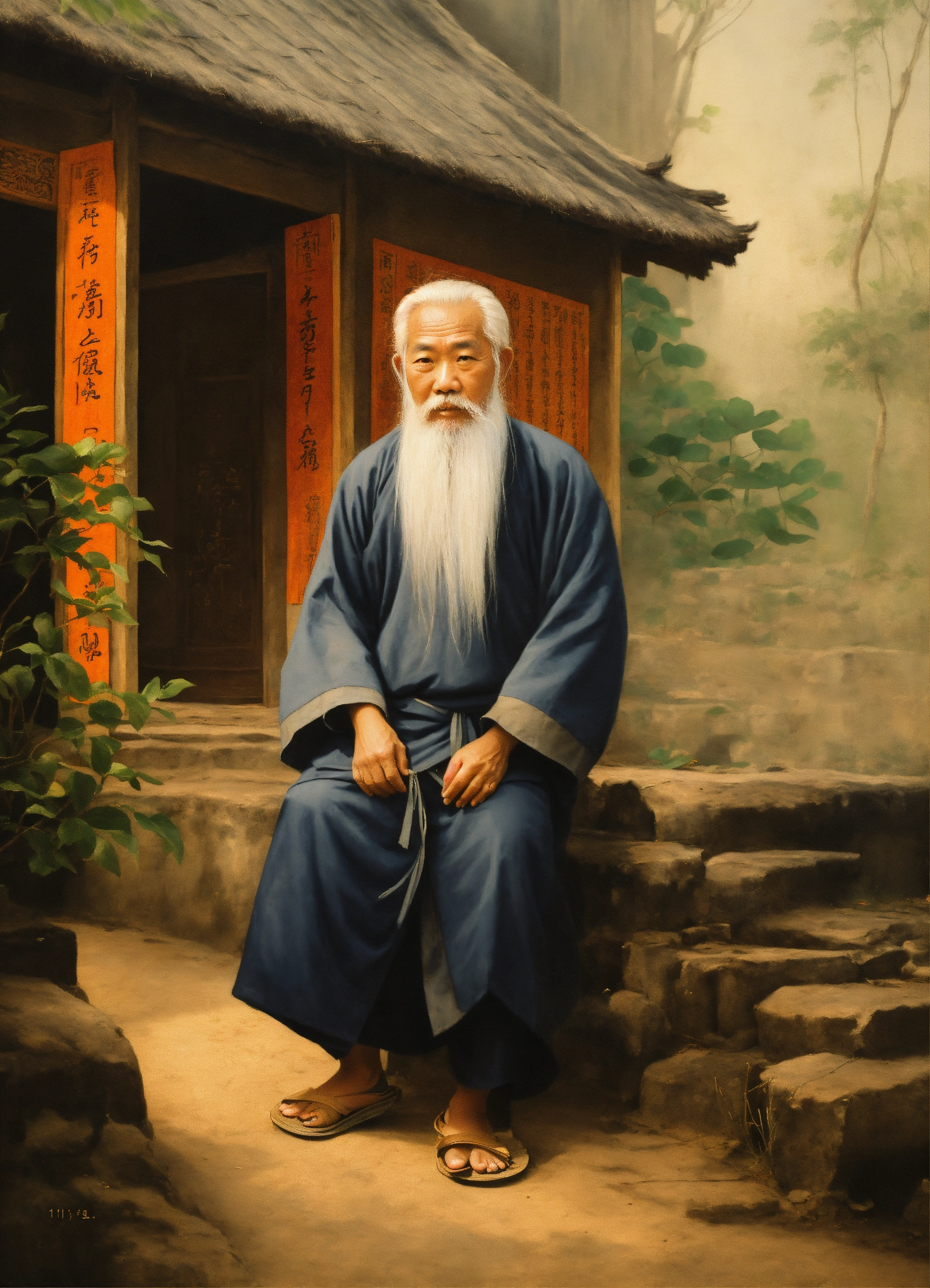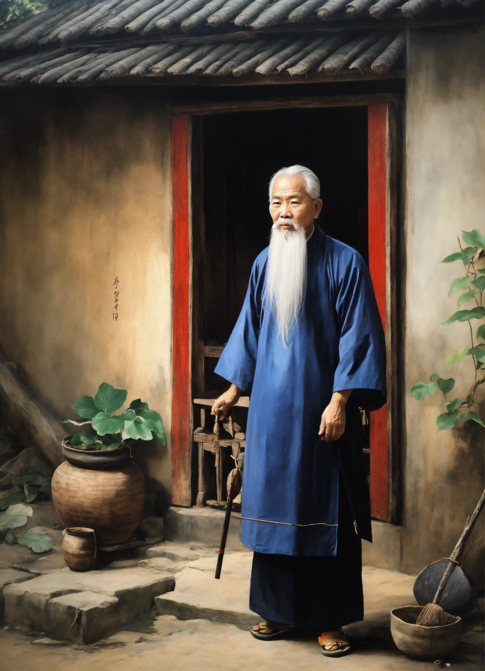 The painting depicts the image of chu van an, a master of the vietnamese people, dressed in the attire of a teacher. he is portrayed as a 60-year-old vietnamese educator from the 11th century, with long, white hair and a long beard, standing inside an old, thatched house.