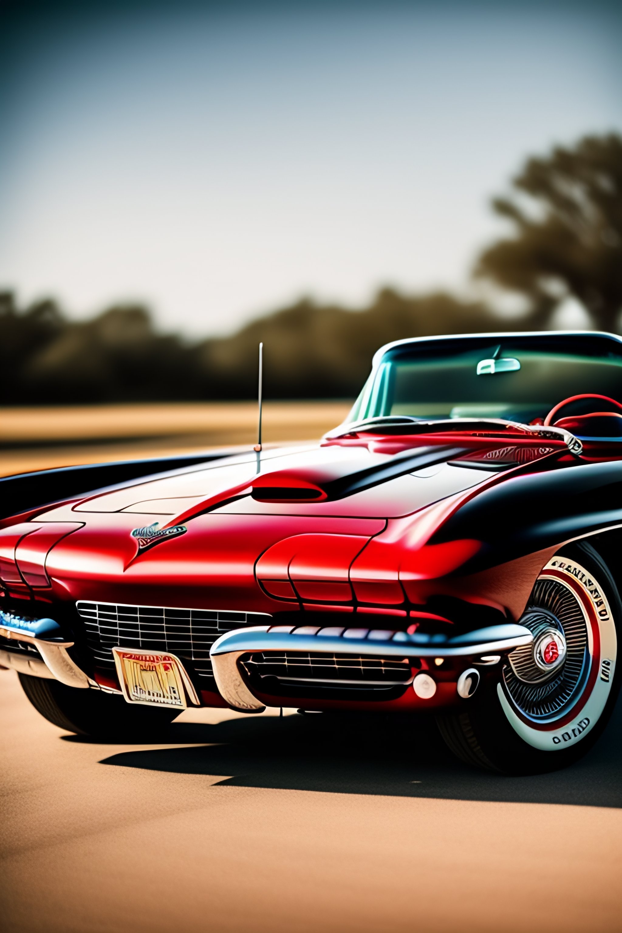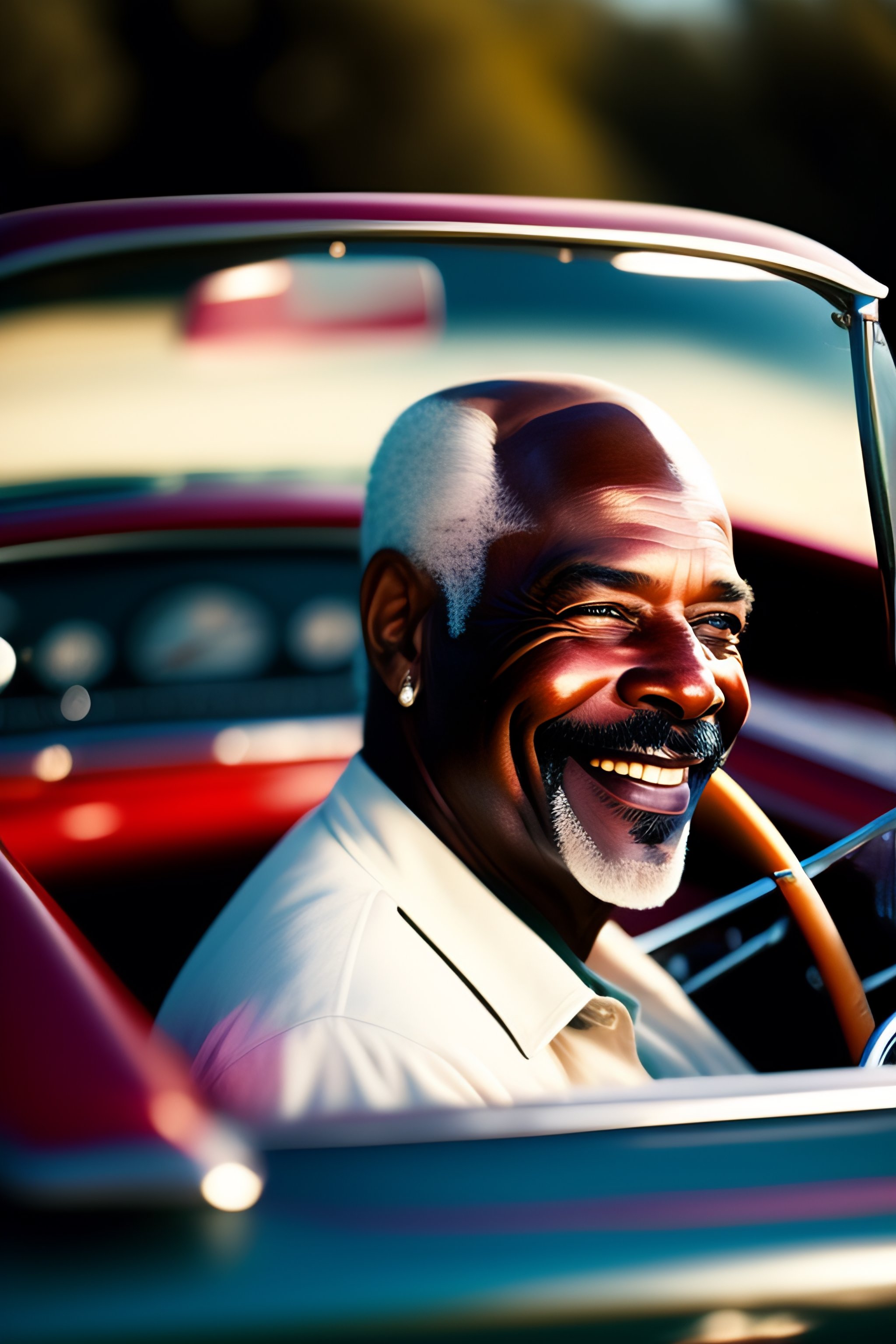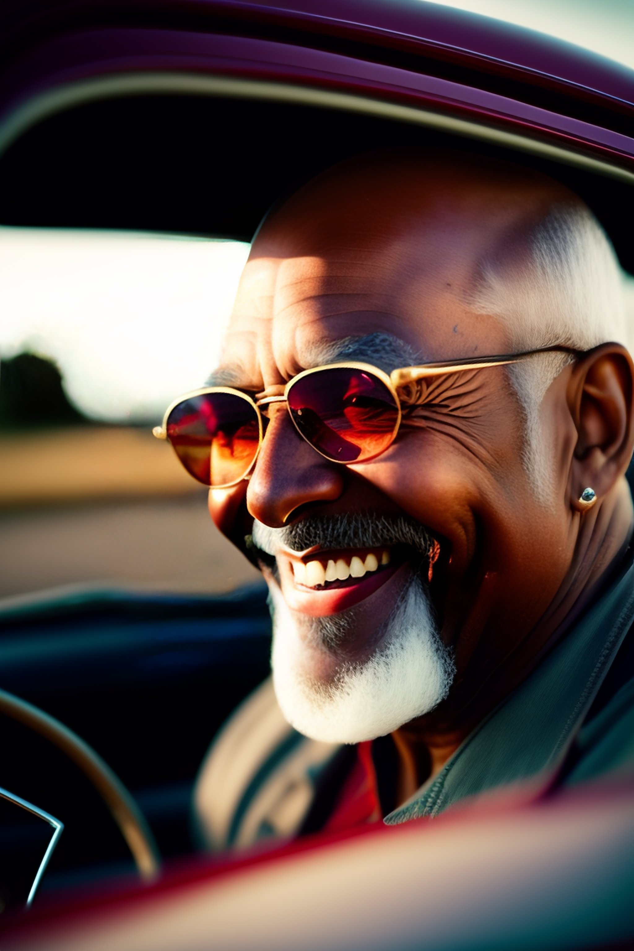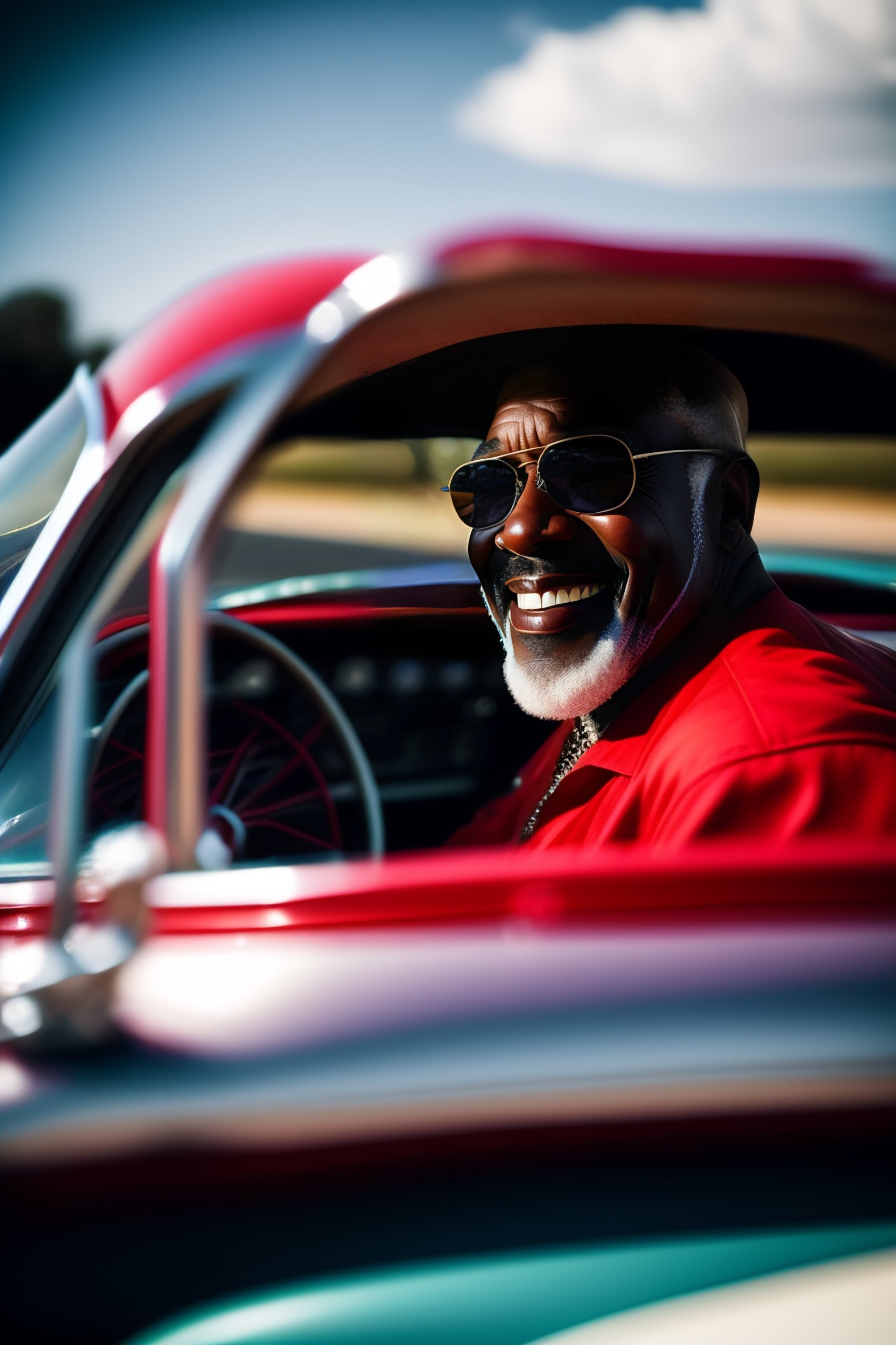 Old bald black man with a grey beard, driving a red 1960 chevrolet corvette convertible, smiling, aviators on, texas, daytime atmosphere, photorealism, highly detailed, realistic, hr, film photo leica
