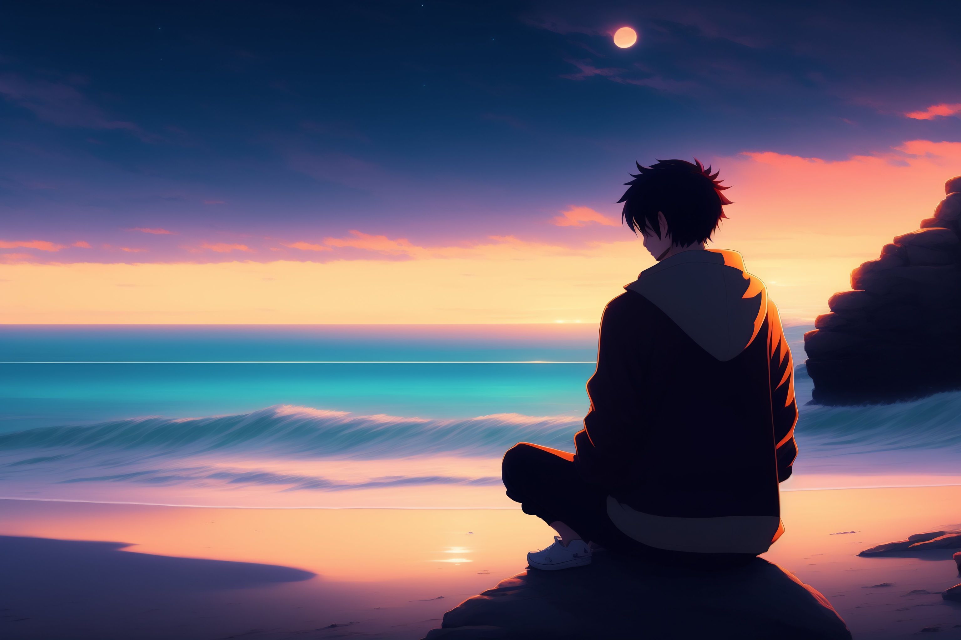 Beautiful anime painting of back of a man from a far with dark hair, sitting on a beach, nighttime, by makoto shinkai, kimi no na wa, artstation, atmospheric, high detail, landscape