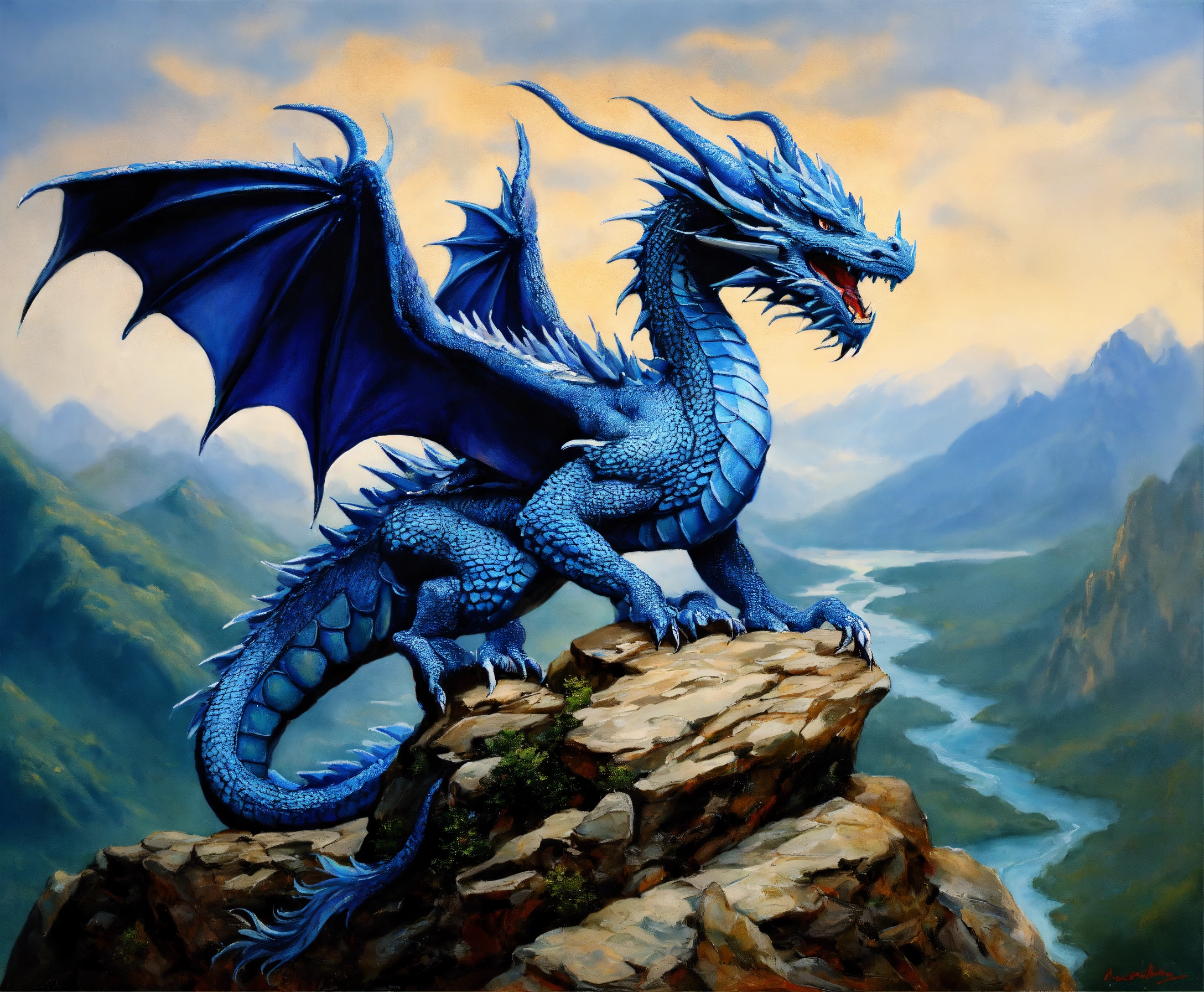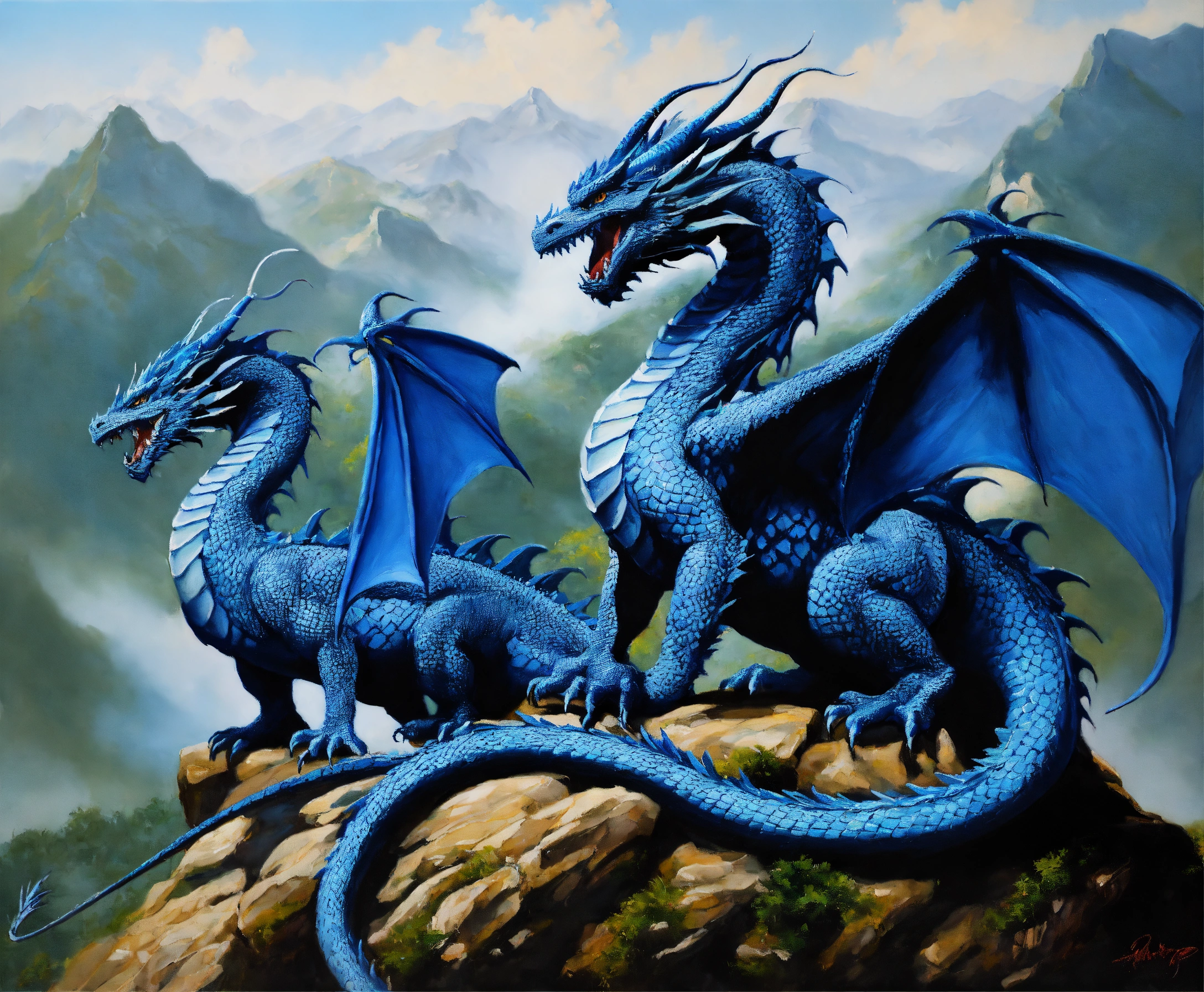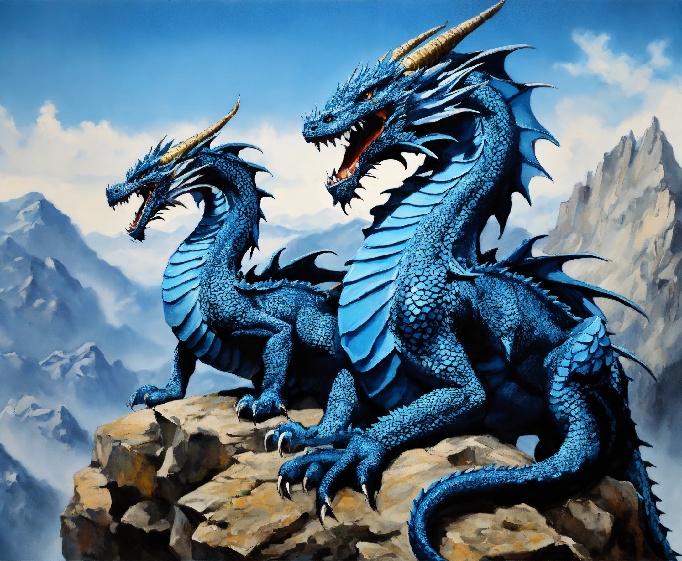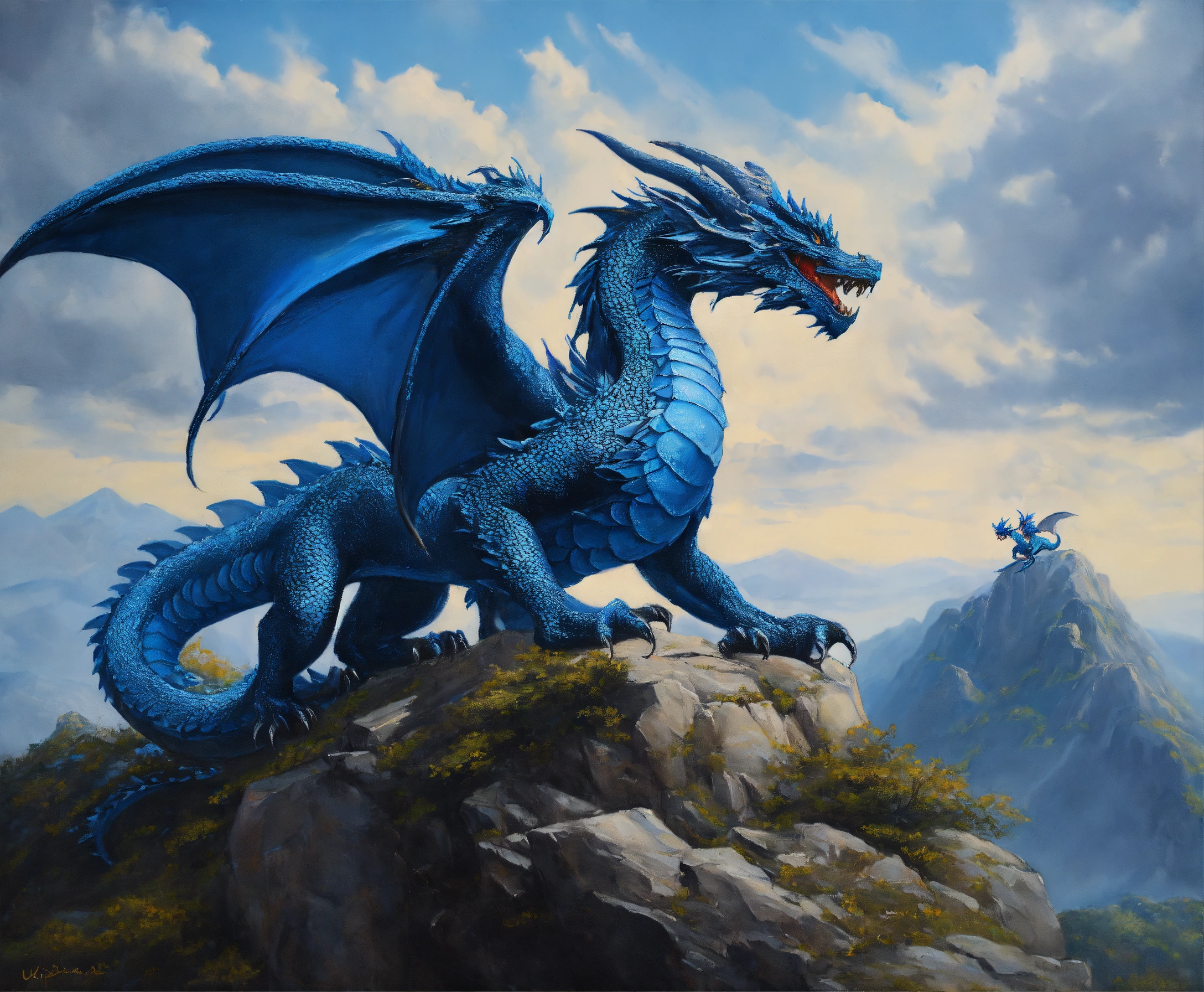 Oil painting of two blue dragons, one dragon is much bigger than the other one, on top of a high mountain, ultra detailled, ultra realistic