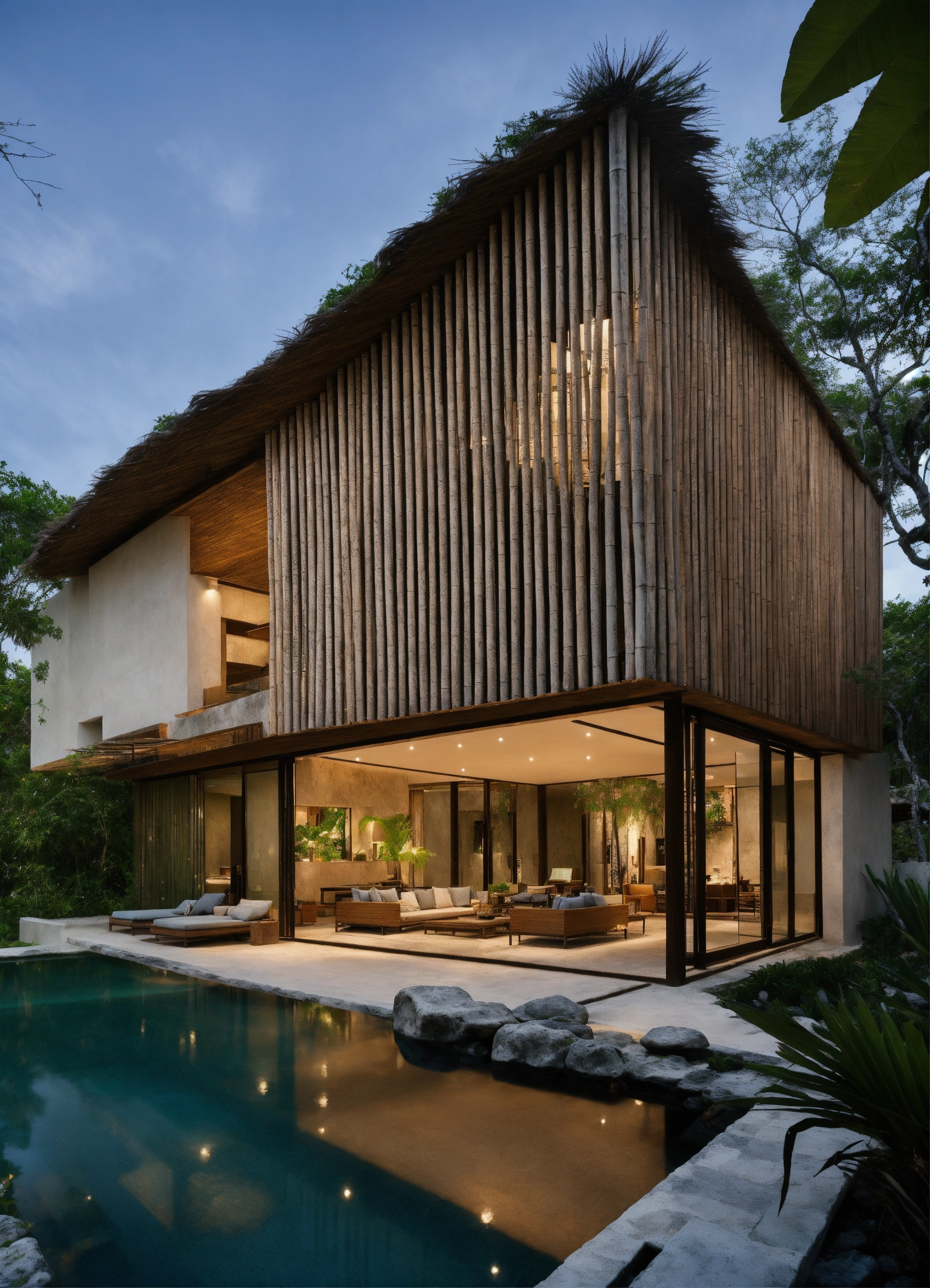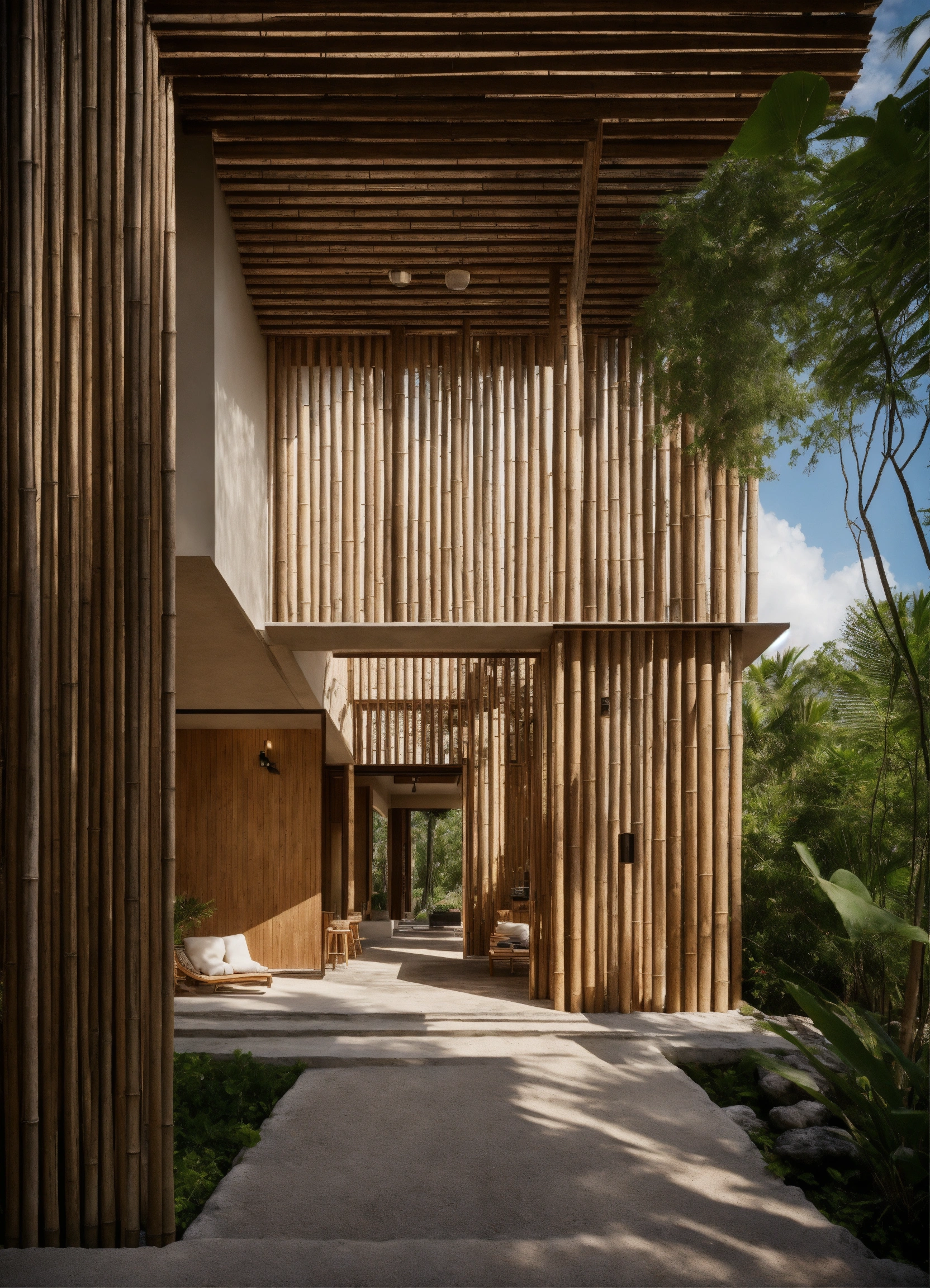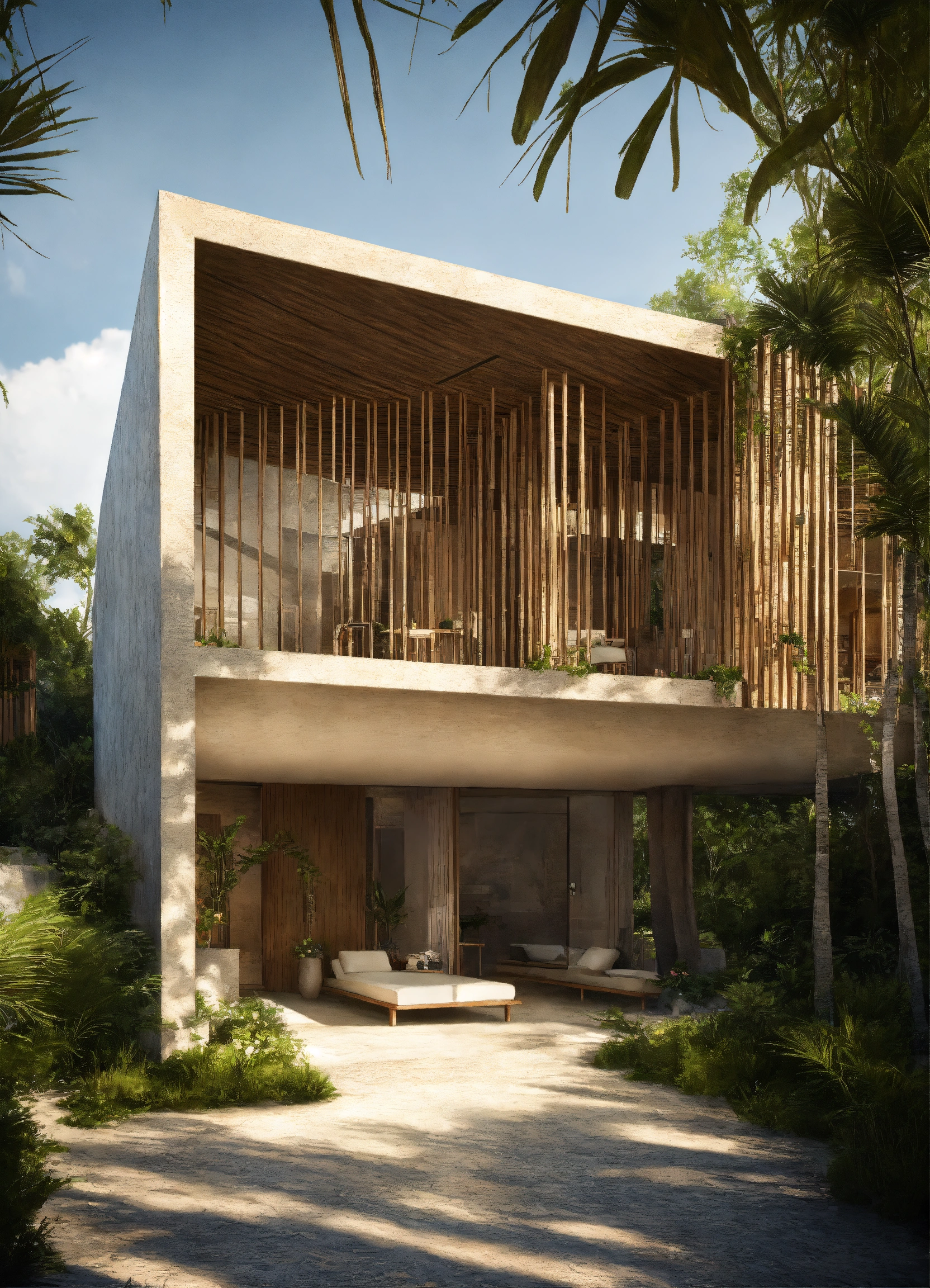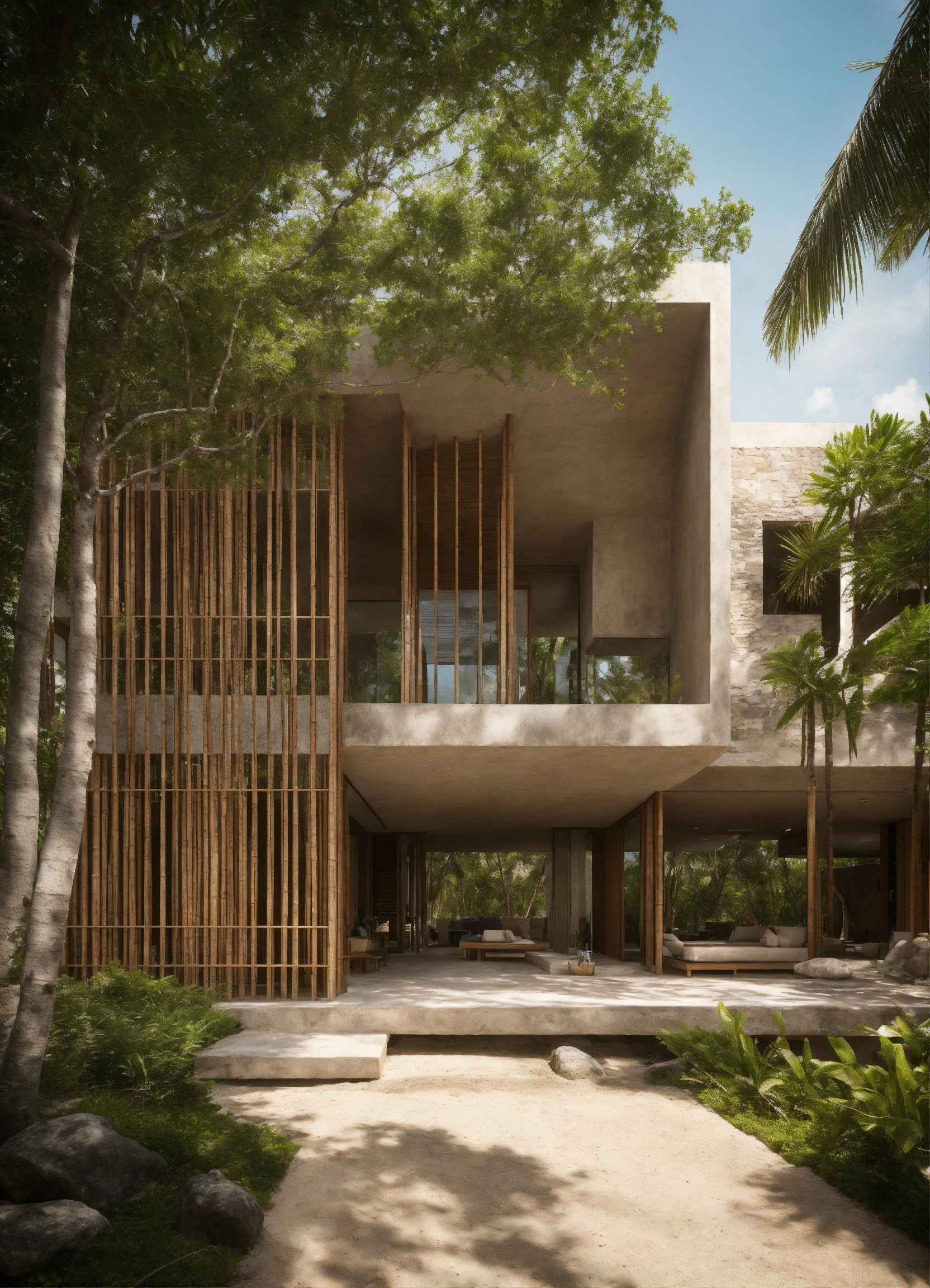Envision an tadao ando and le corbusier concepts design, environmentally-conscious villa nestled within the bustling modern architecture of tulum, quintana roo. as you approach from the entrance, the street view reveals a facade adorned with a vertical bamboo lattice, gracefully contrasting with the stone finish. large overhangs hint at the interior's coolness, and the surrounding trees whisper tales of nature's embrace.